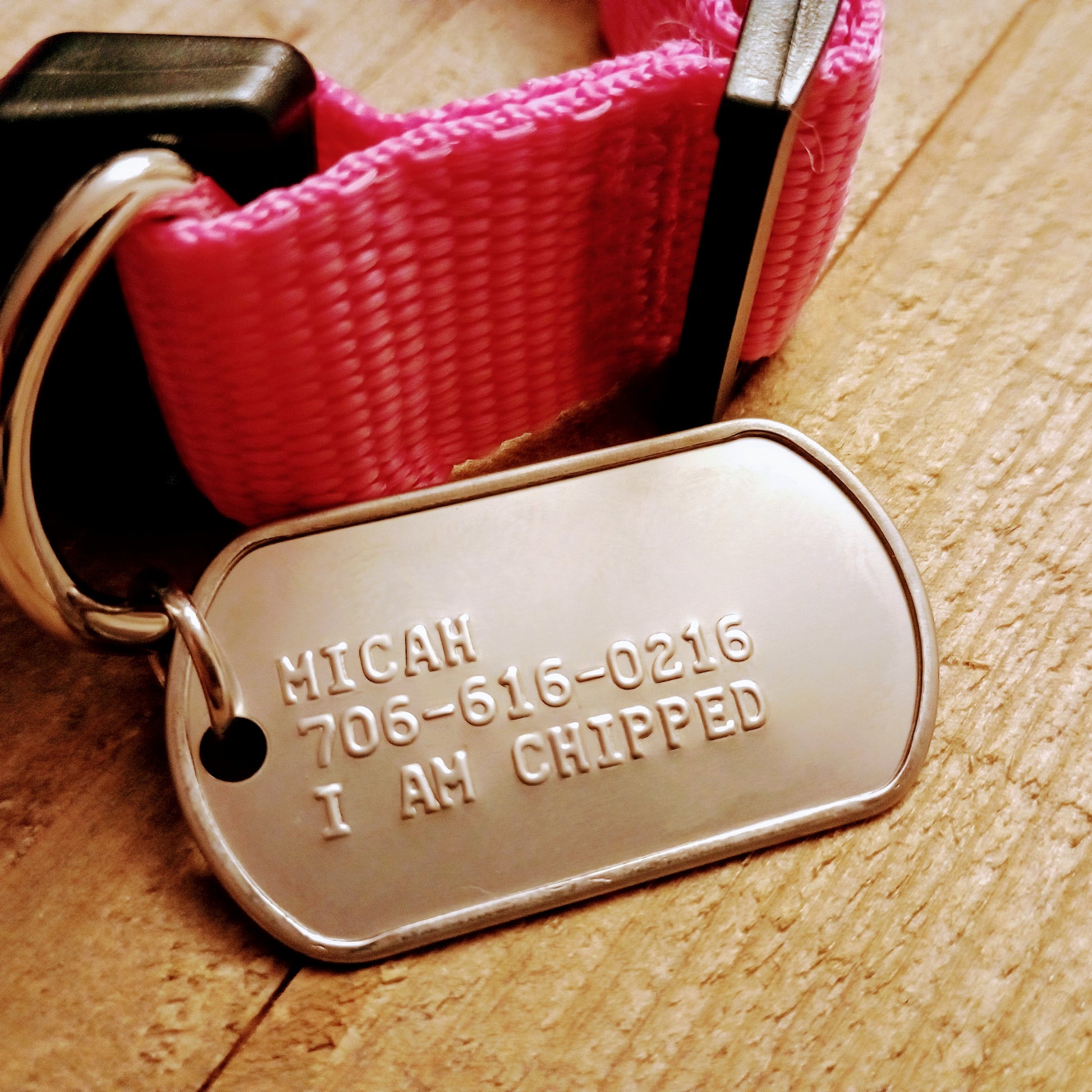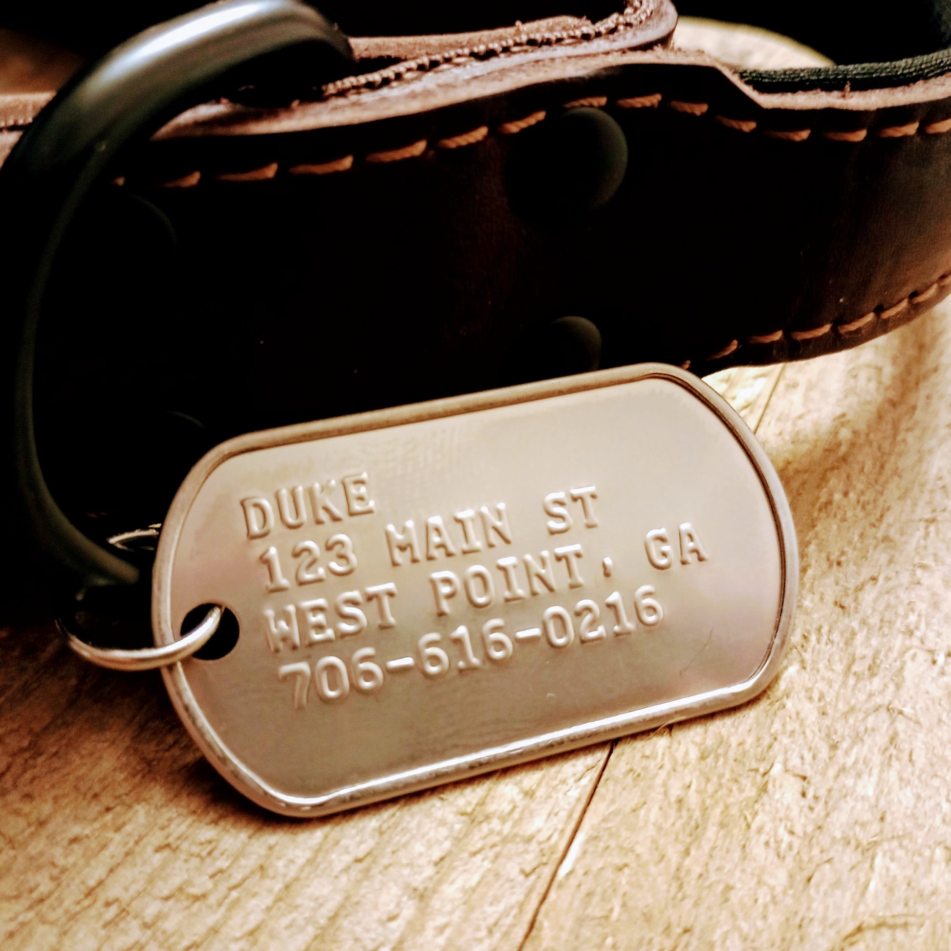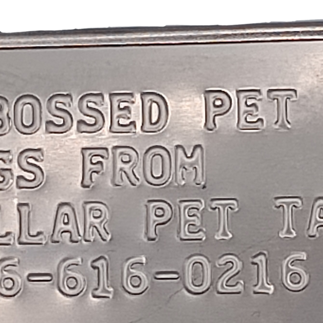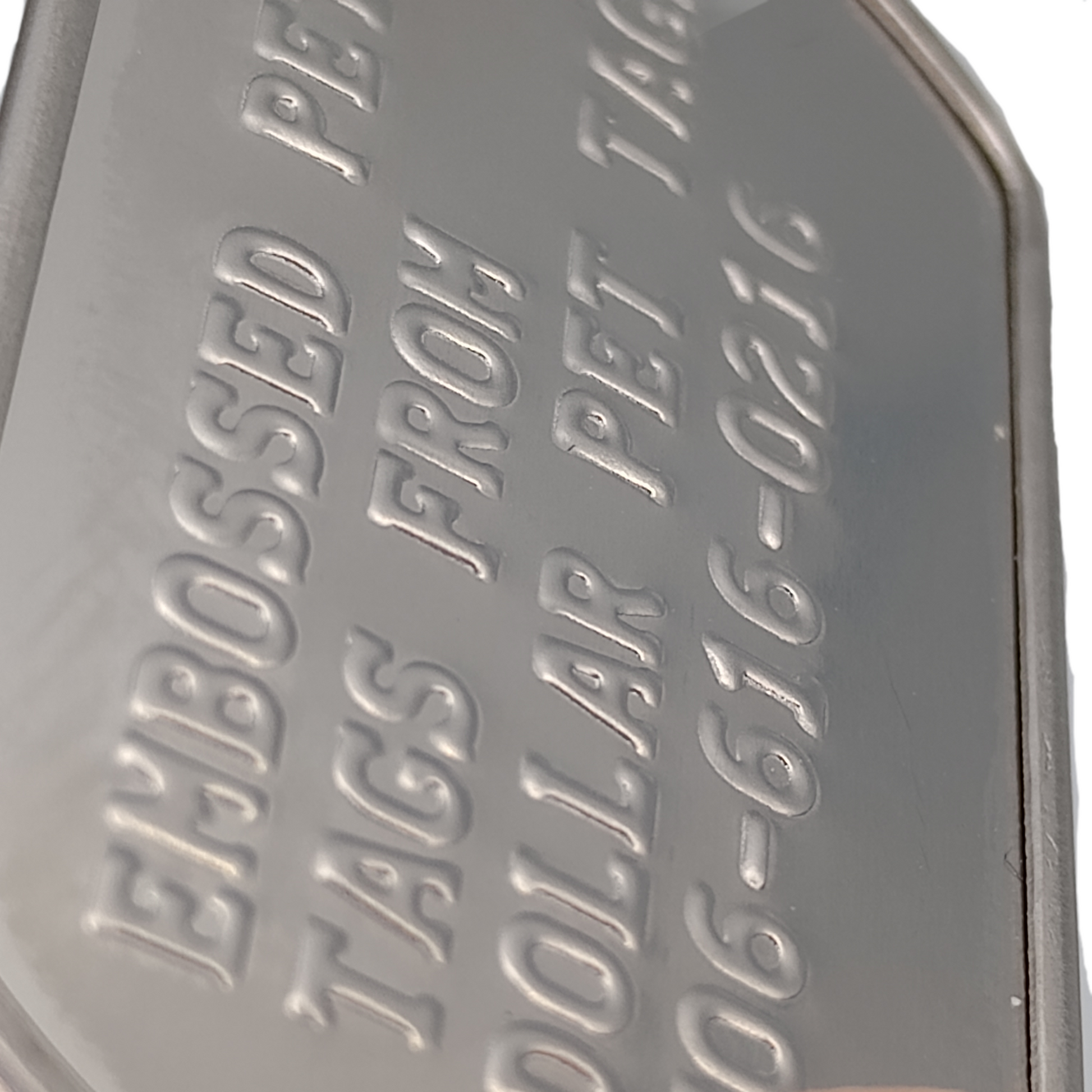 This is a standard sized stainless steel Military Identification Tag (Dog Tag) made to U.S. Military Specs. The dog tag is embossed with up to 5 lines of text. If you are looking for a tough pet tag, these have lasted more than 20 plus years for U.S. Military Personnel and are still readable.