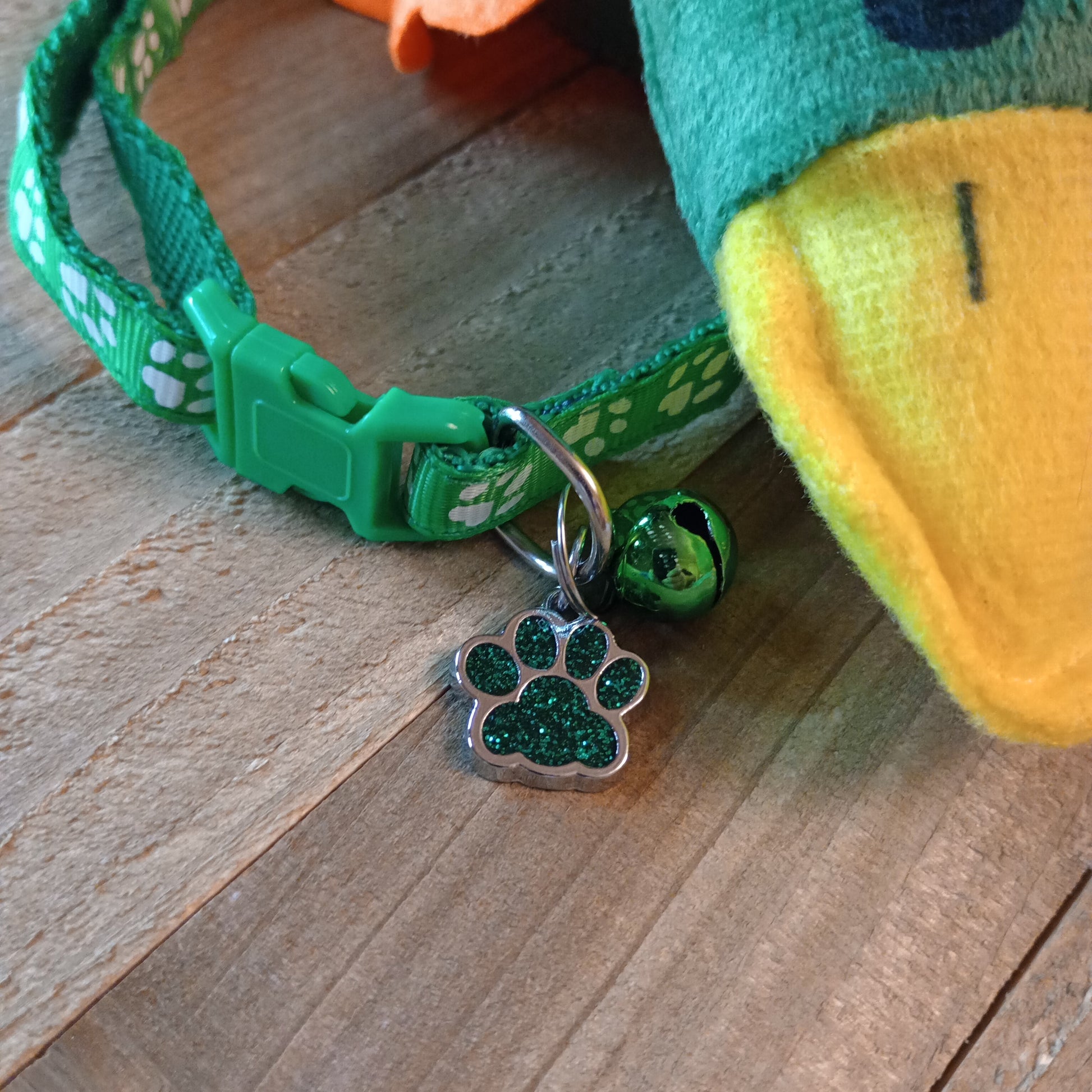 This Emerald Green Glitter Paw Pet Tag is 0.7 x 0.67 inches and made of metal alloy with an non-decorated silver colored back that allows for 1 line of text on the back.
