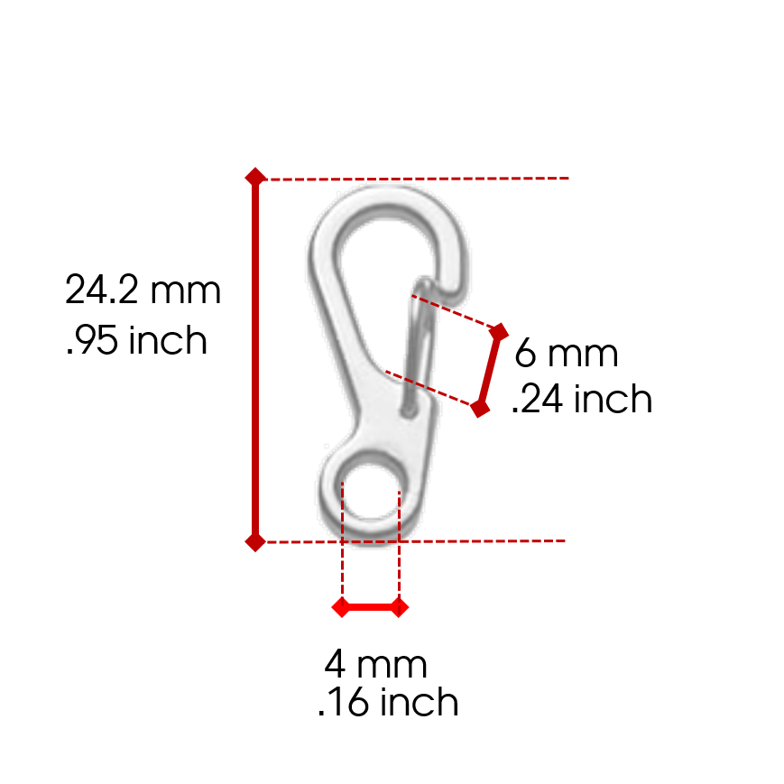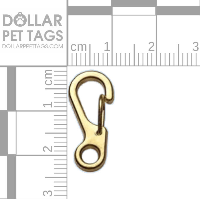 Gold Colored mini spring clip carabiner is made of a zinc alloy and electroplated. The spring clip allows this to be easily removed or put on a leash or collar. The opening of the clip is about 6 mm which is a little less than a quarter of an inch.