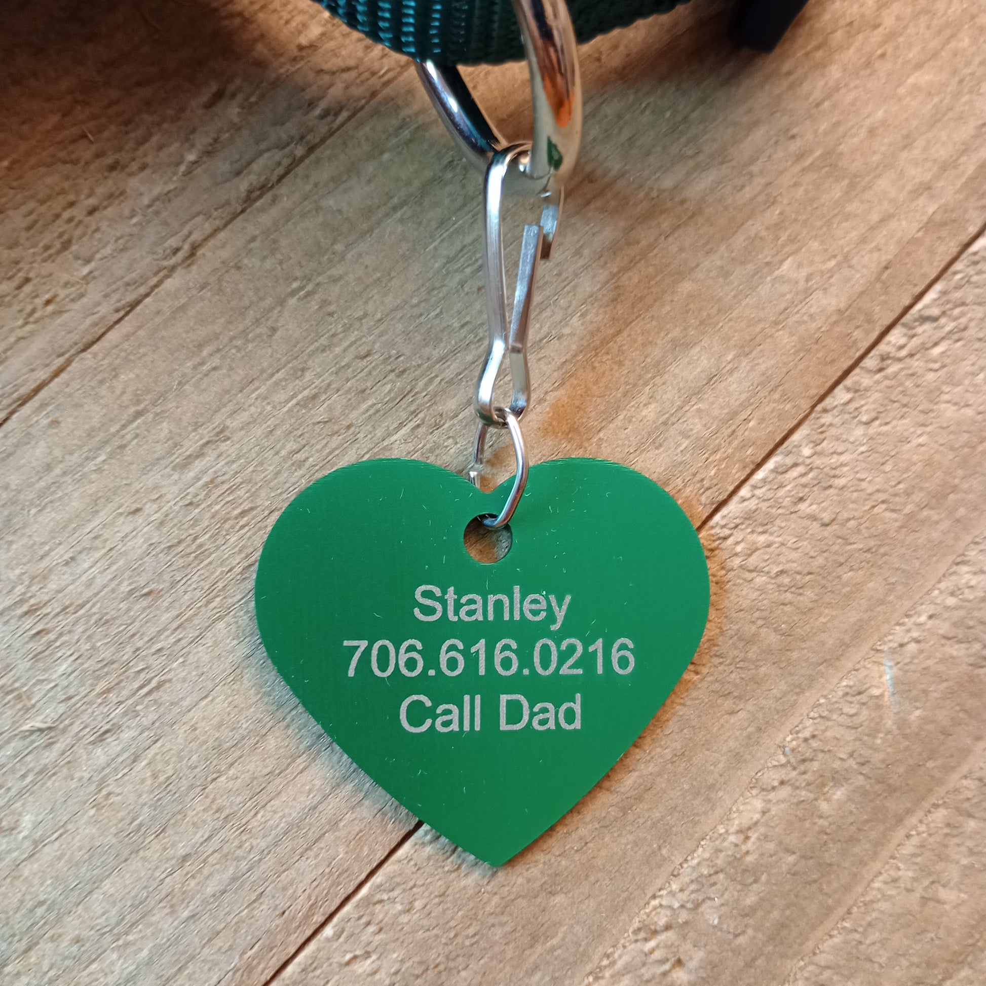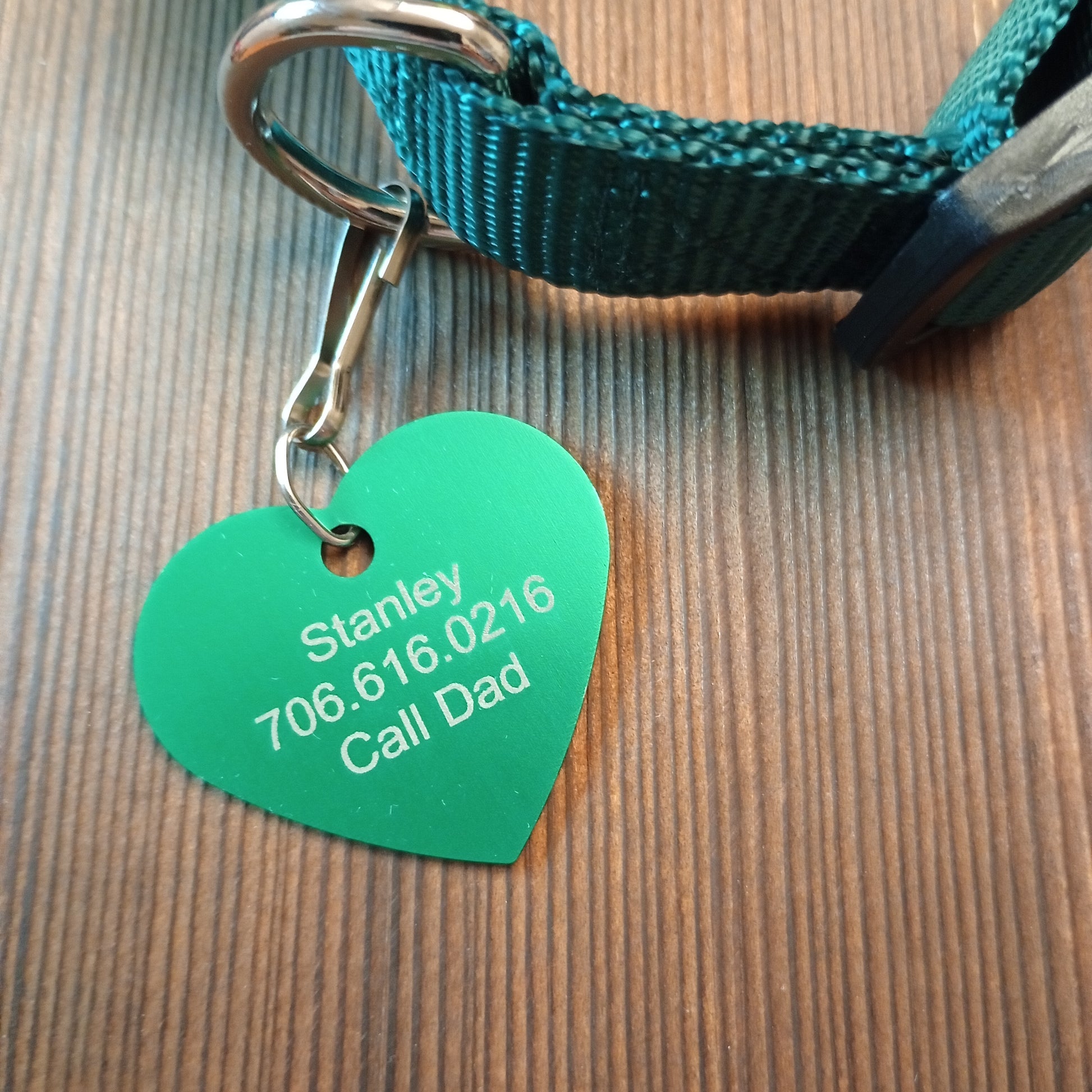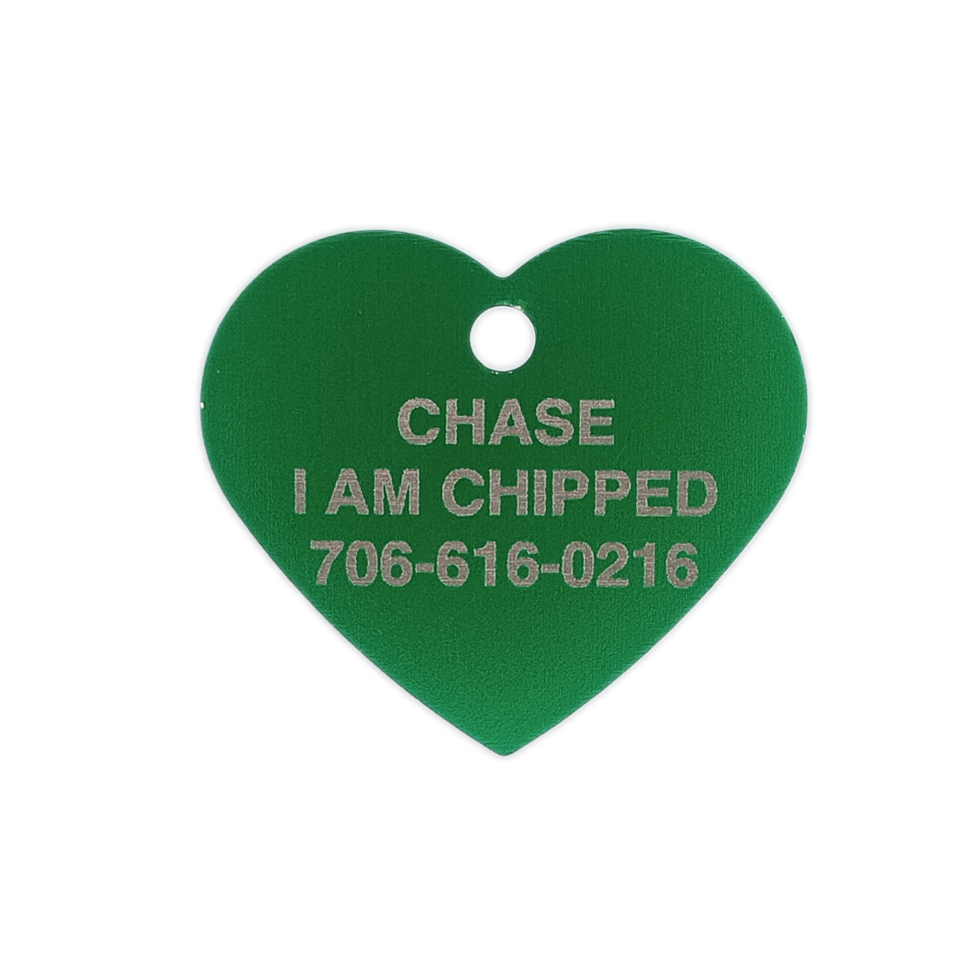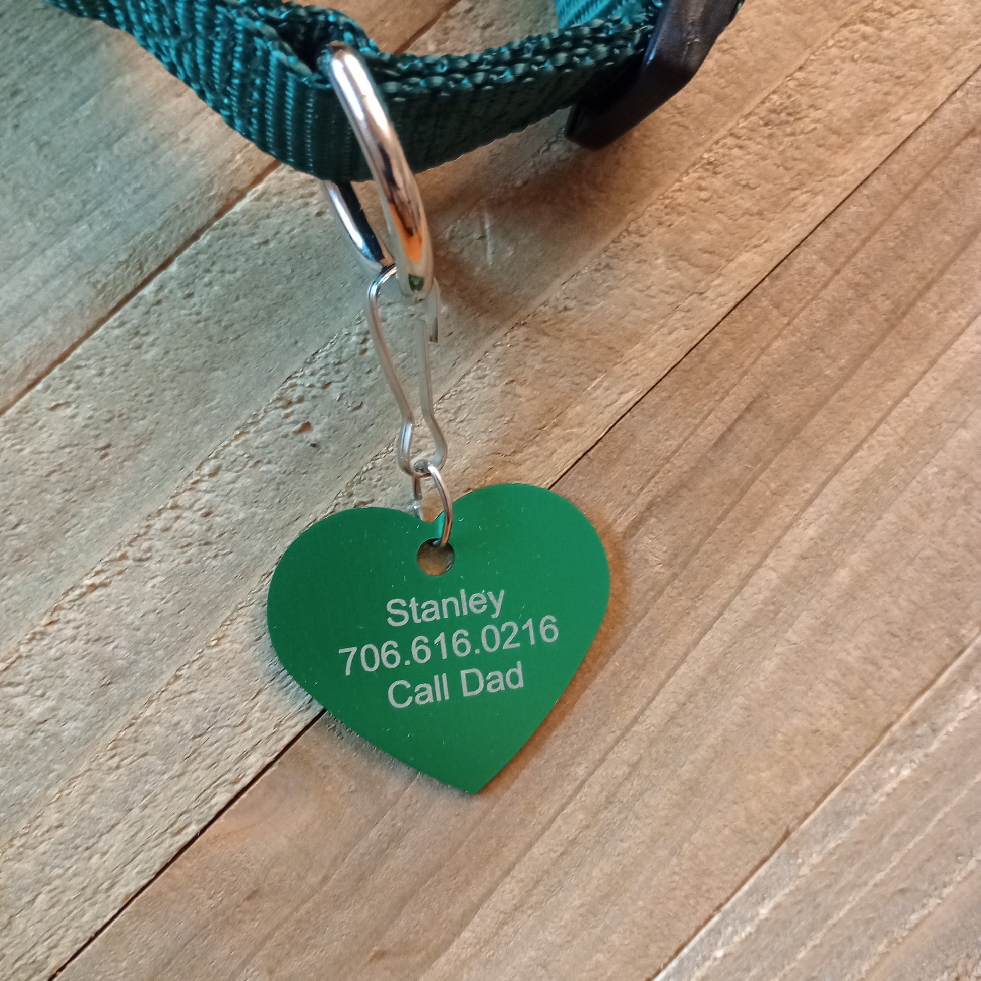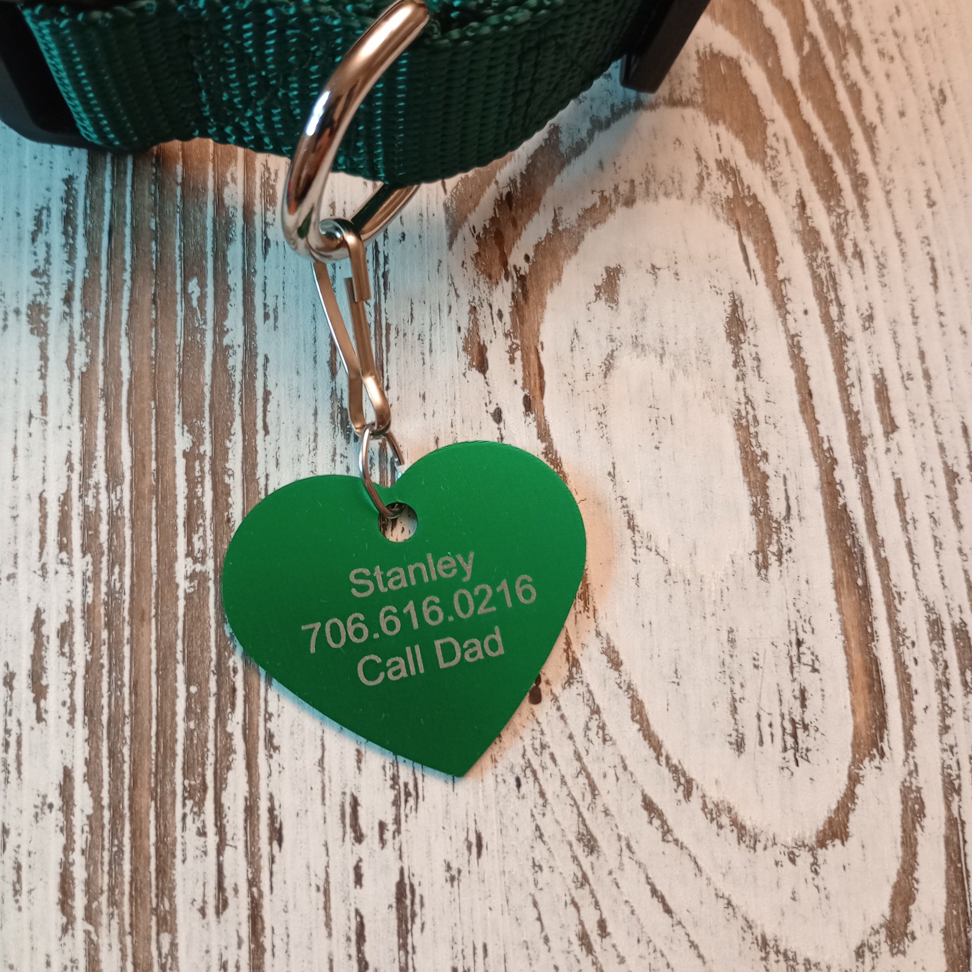 This Green Heart Shaped Pet Tag is anodized aluminum that allows for 4 lines of text to be engraved on the front and lines of text to be engraved on the back.