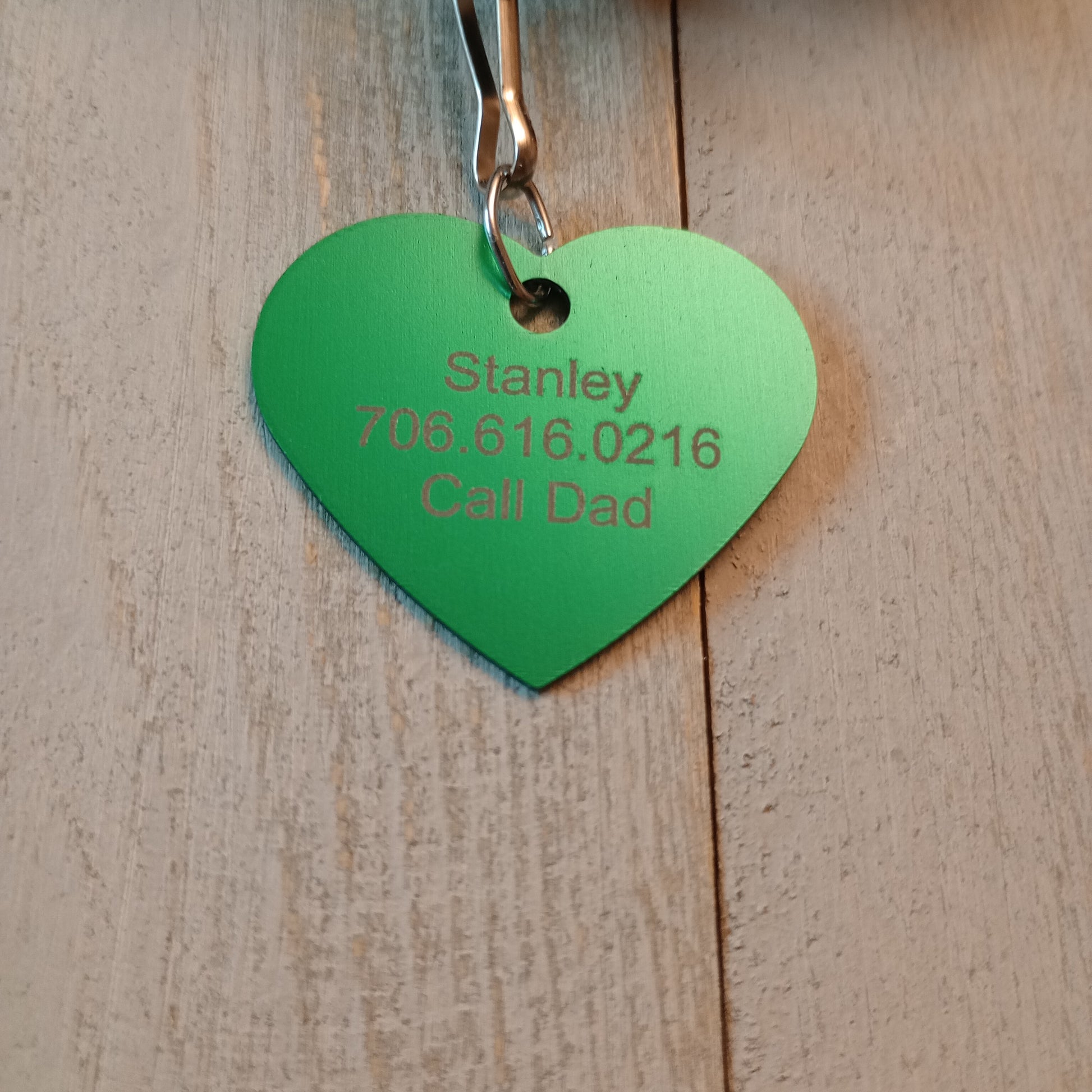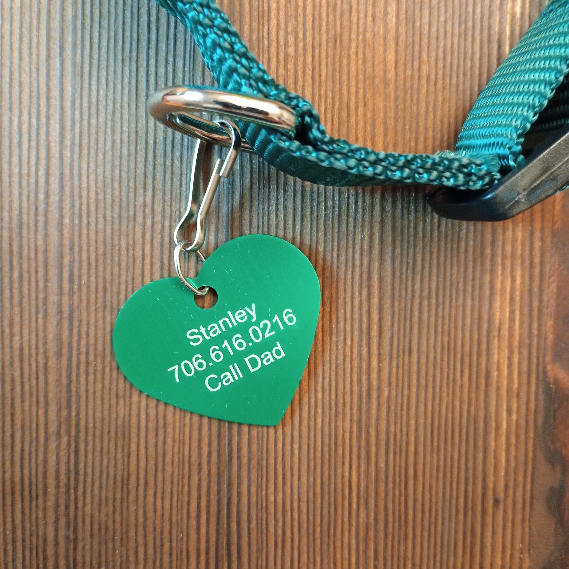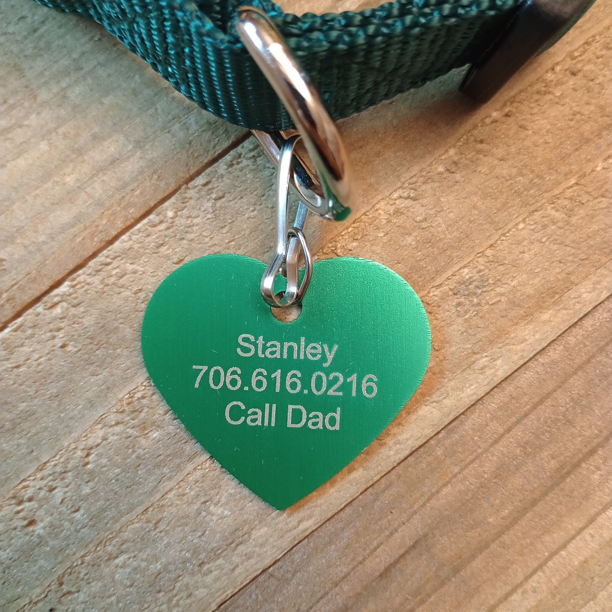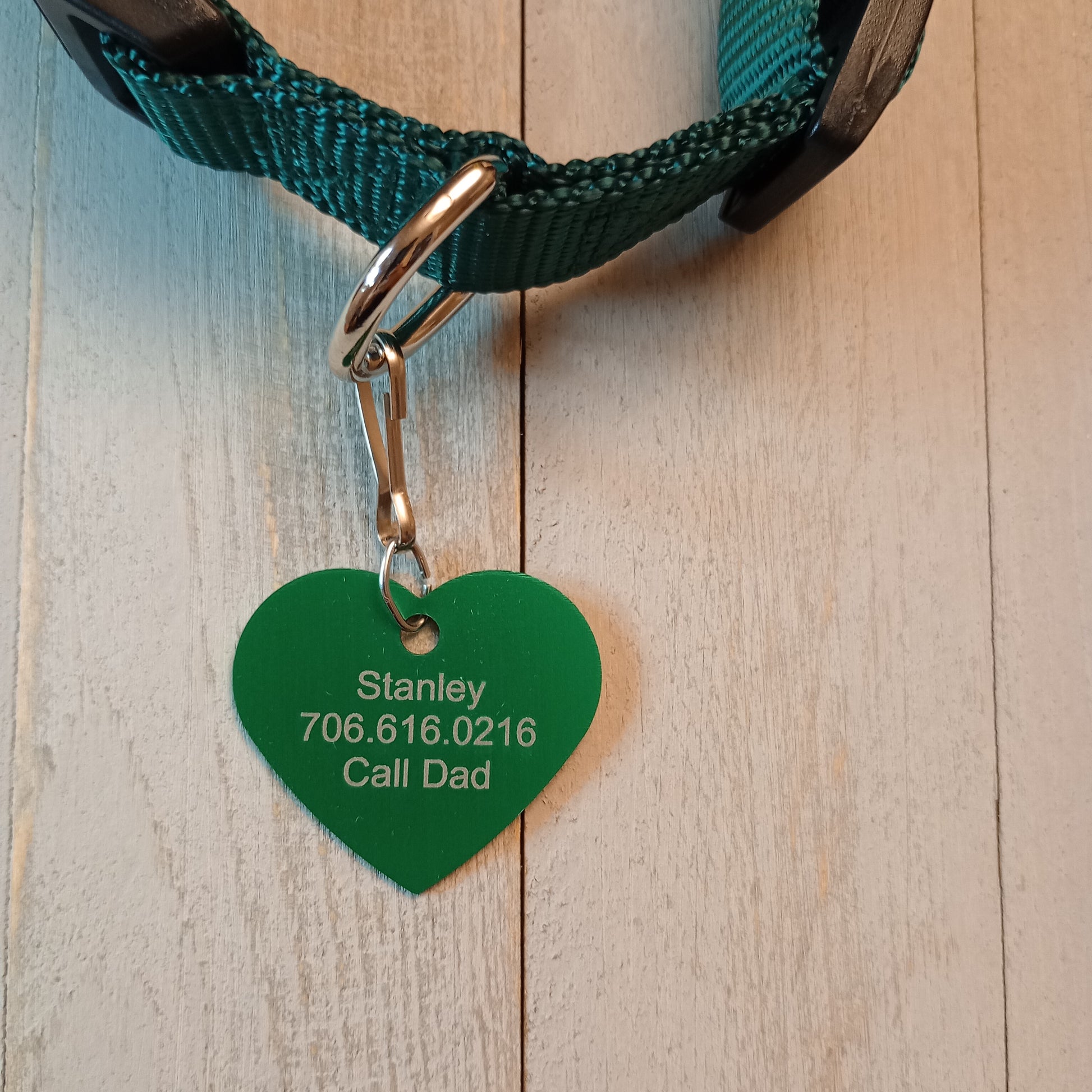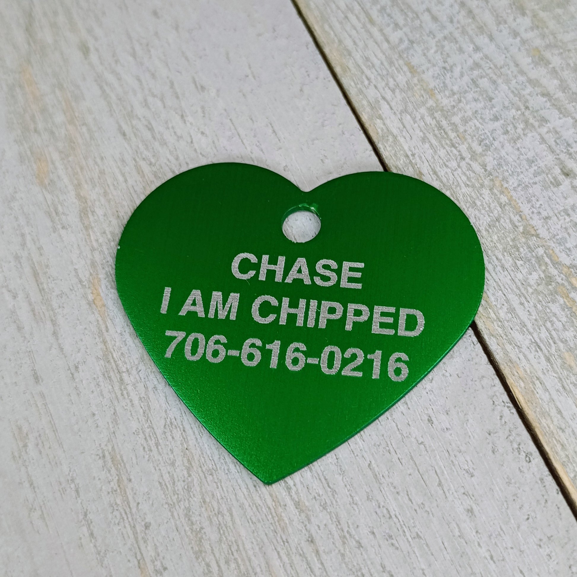 This Green Heart Shaped Pet Tag is anodized aluminum that allows for 4 lines of text to be engraved on the front and lines of text to be engraved on the back.