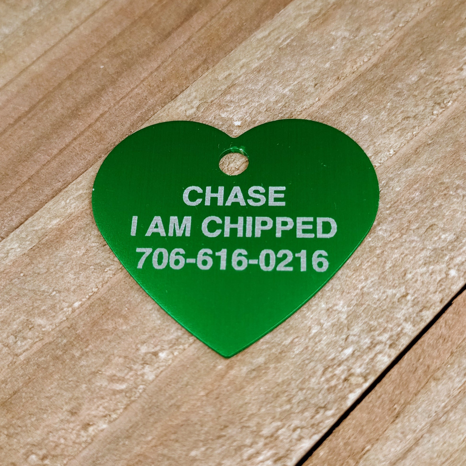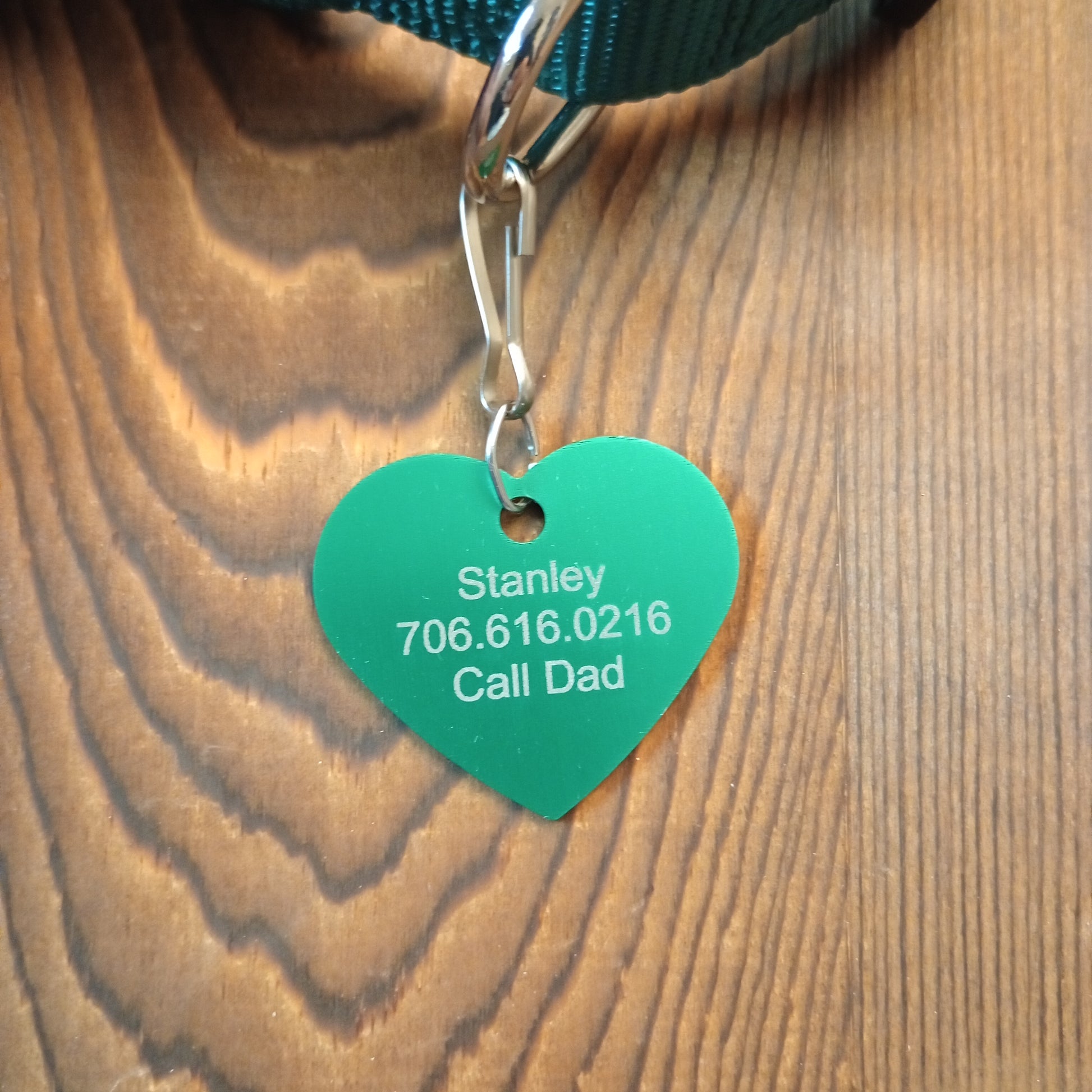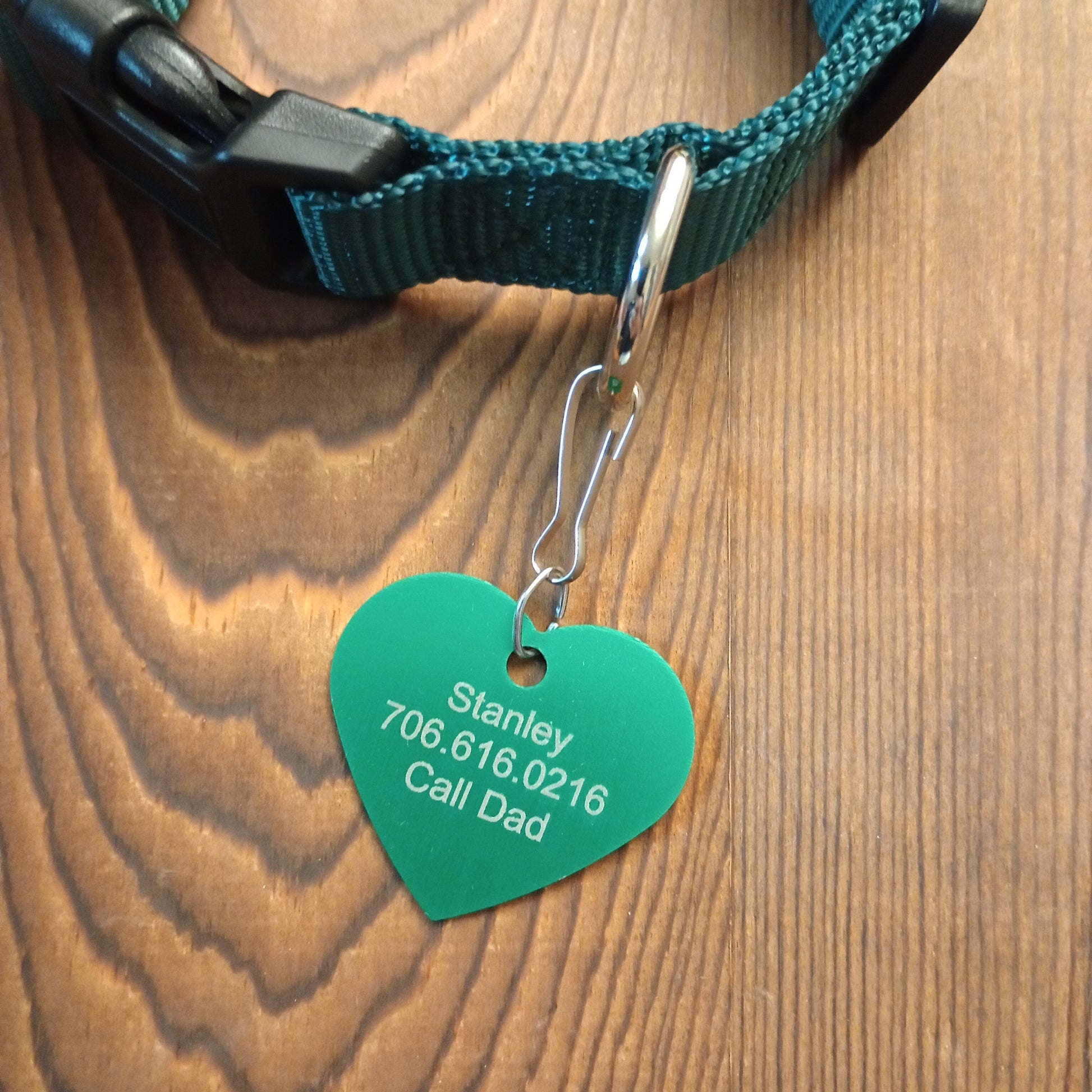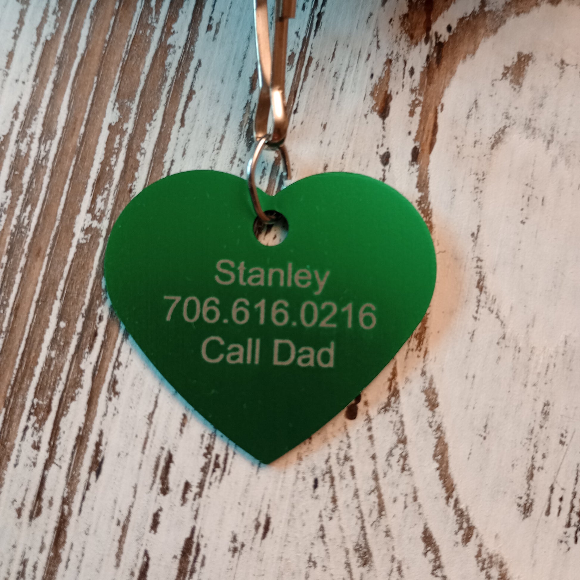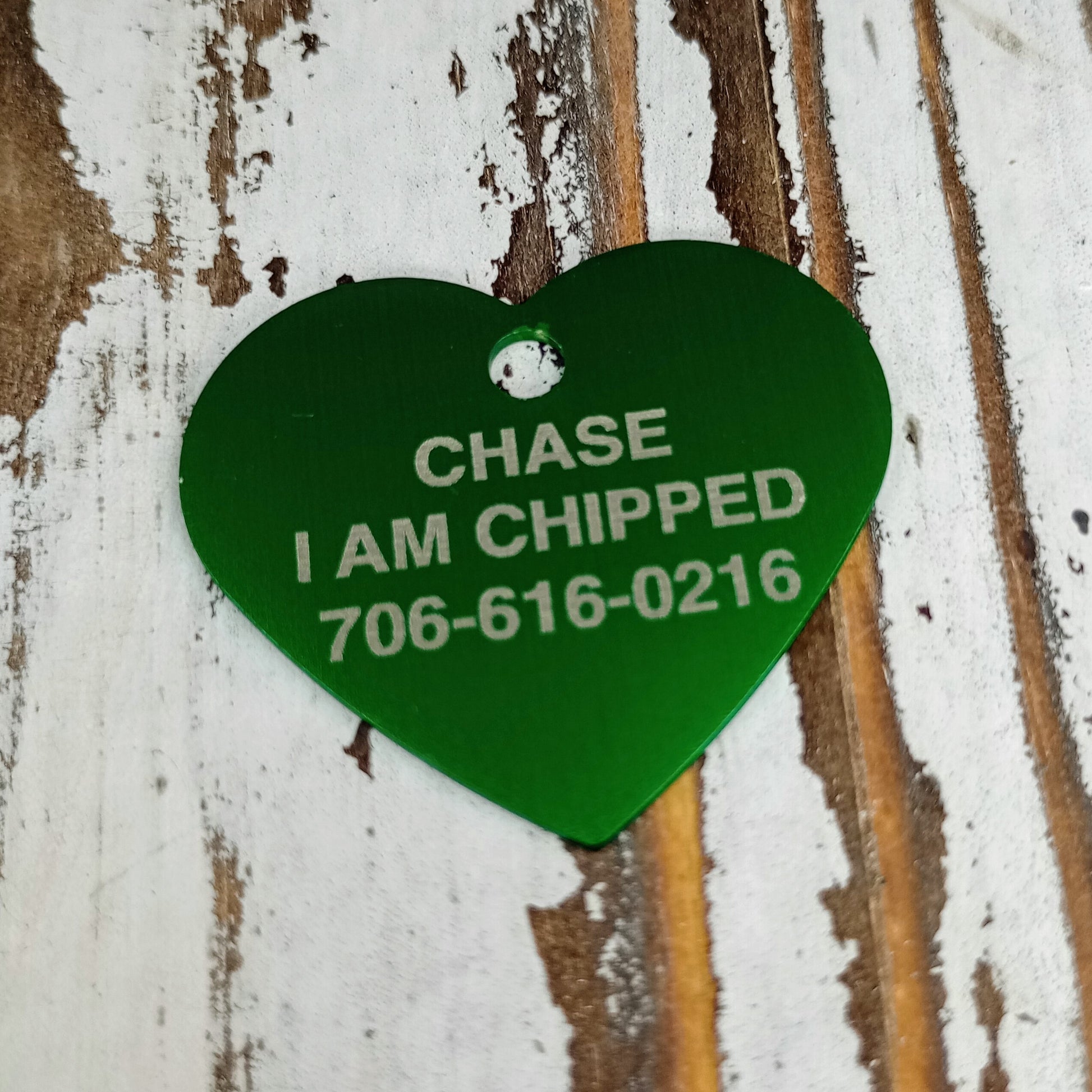This Green Heart Shaped Pet Tag is anodized aluminum that allows for 4 lines of text to be engraved on the front and lines of text to be engraved on the back.