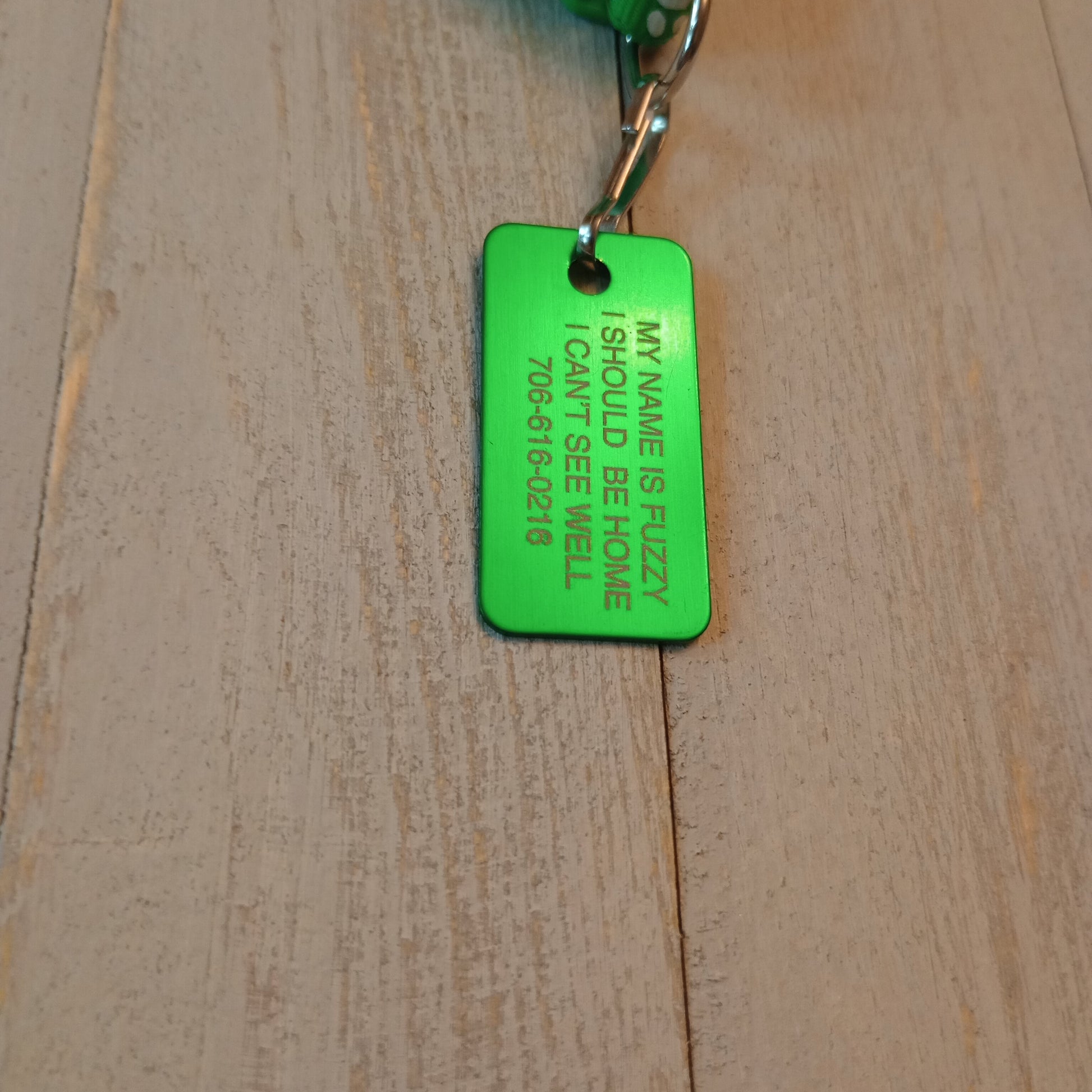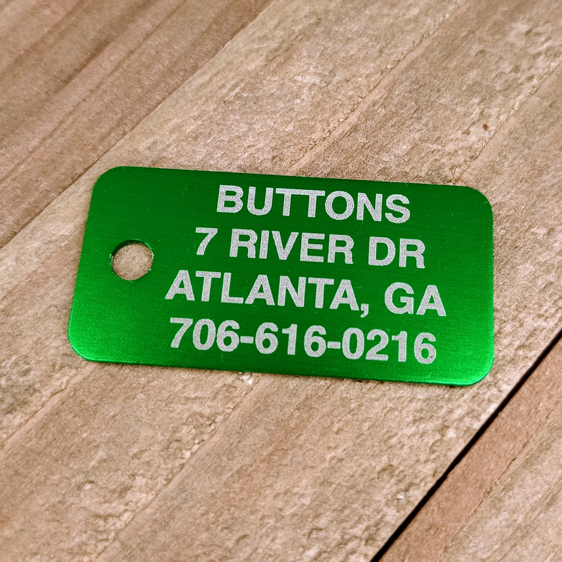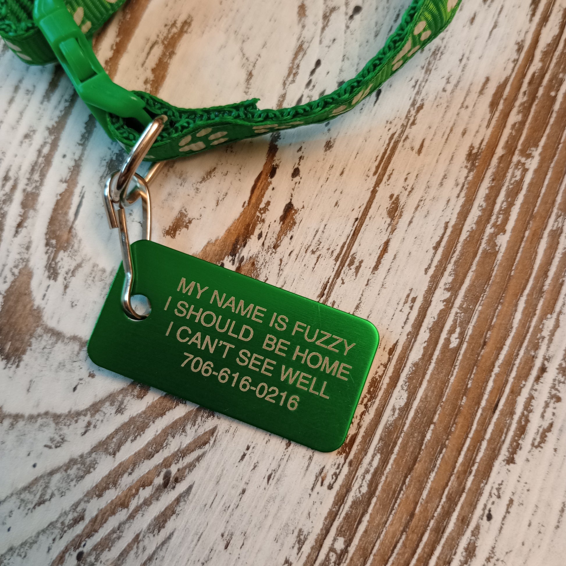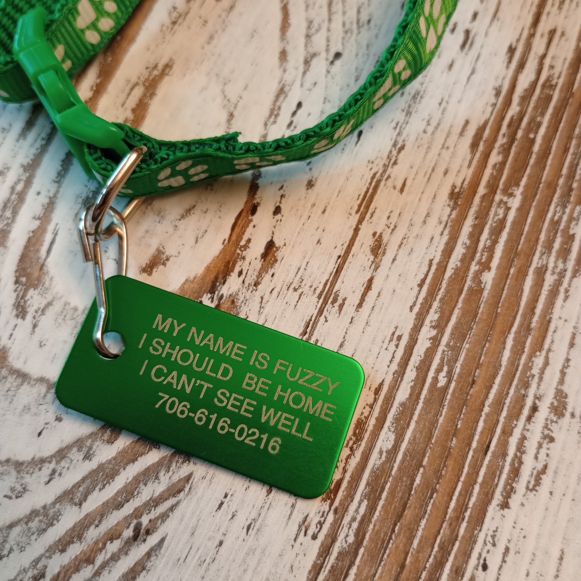 This Green Rectangular Pet Tag is anodized aluminum that allows for 4 lines of text to be engraved lengthwise on the front and 4 lines of text to be engraved lengthwise on the back.
