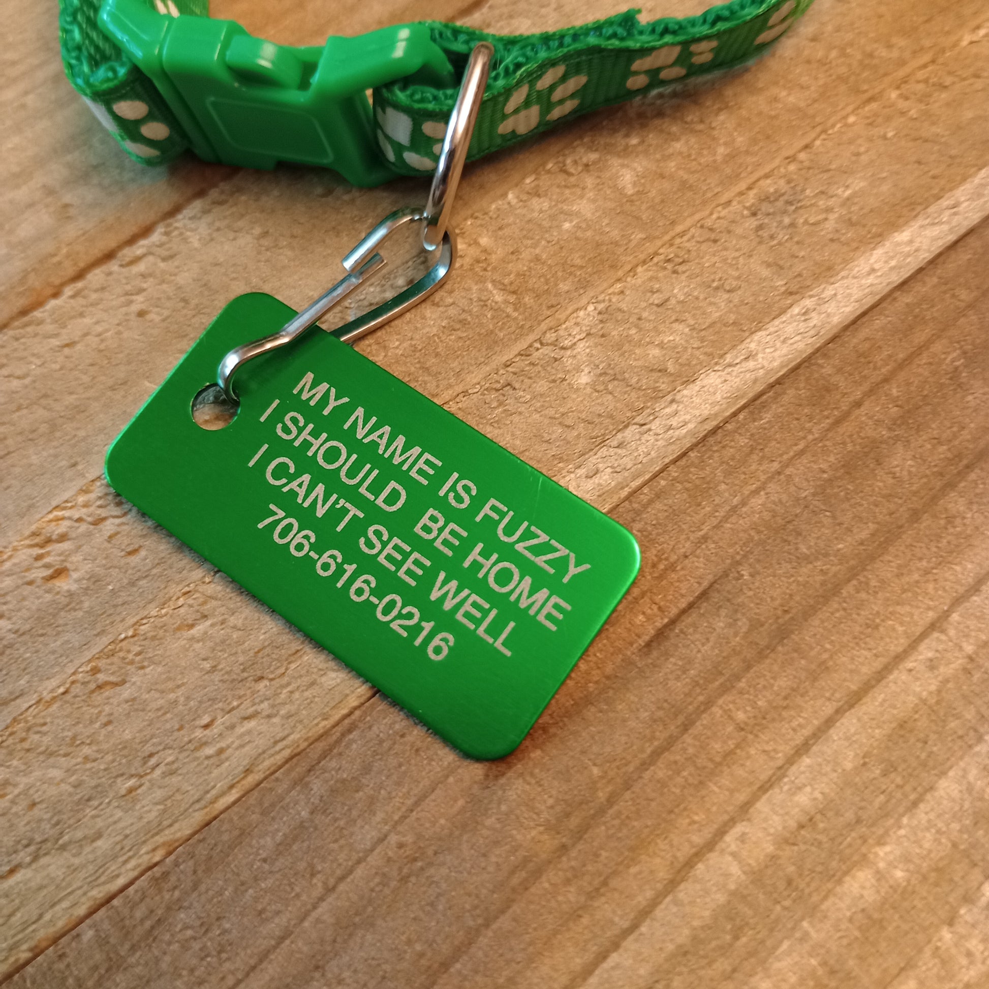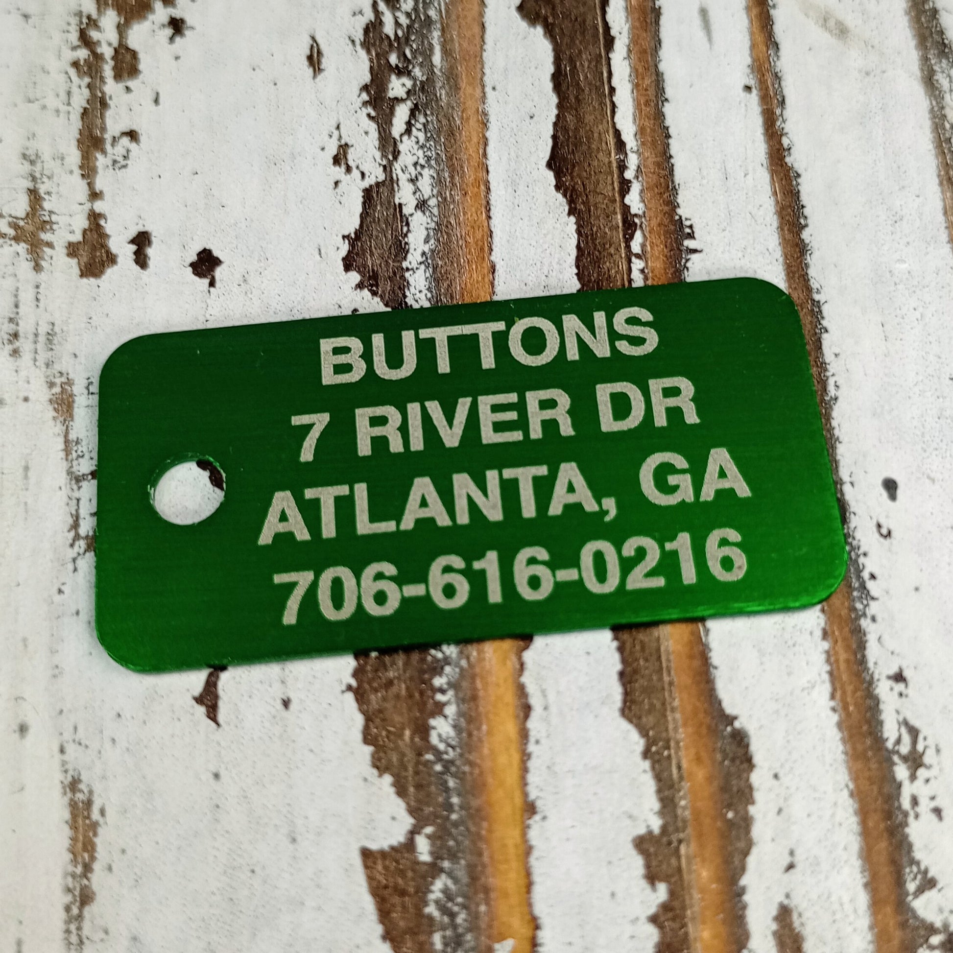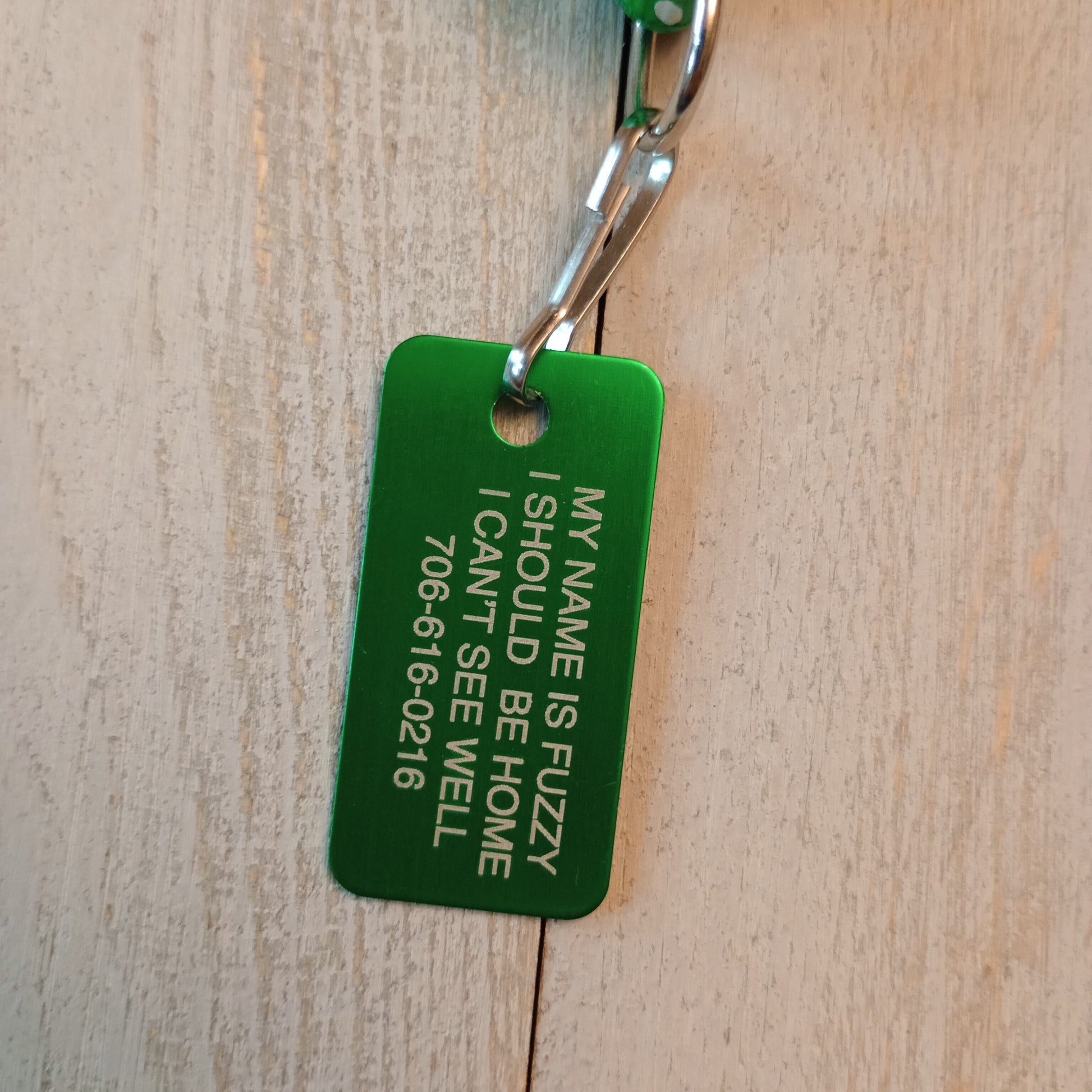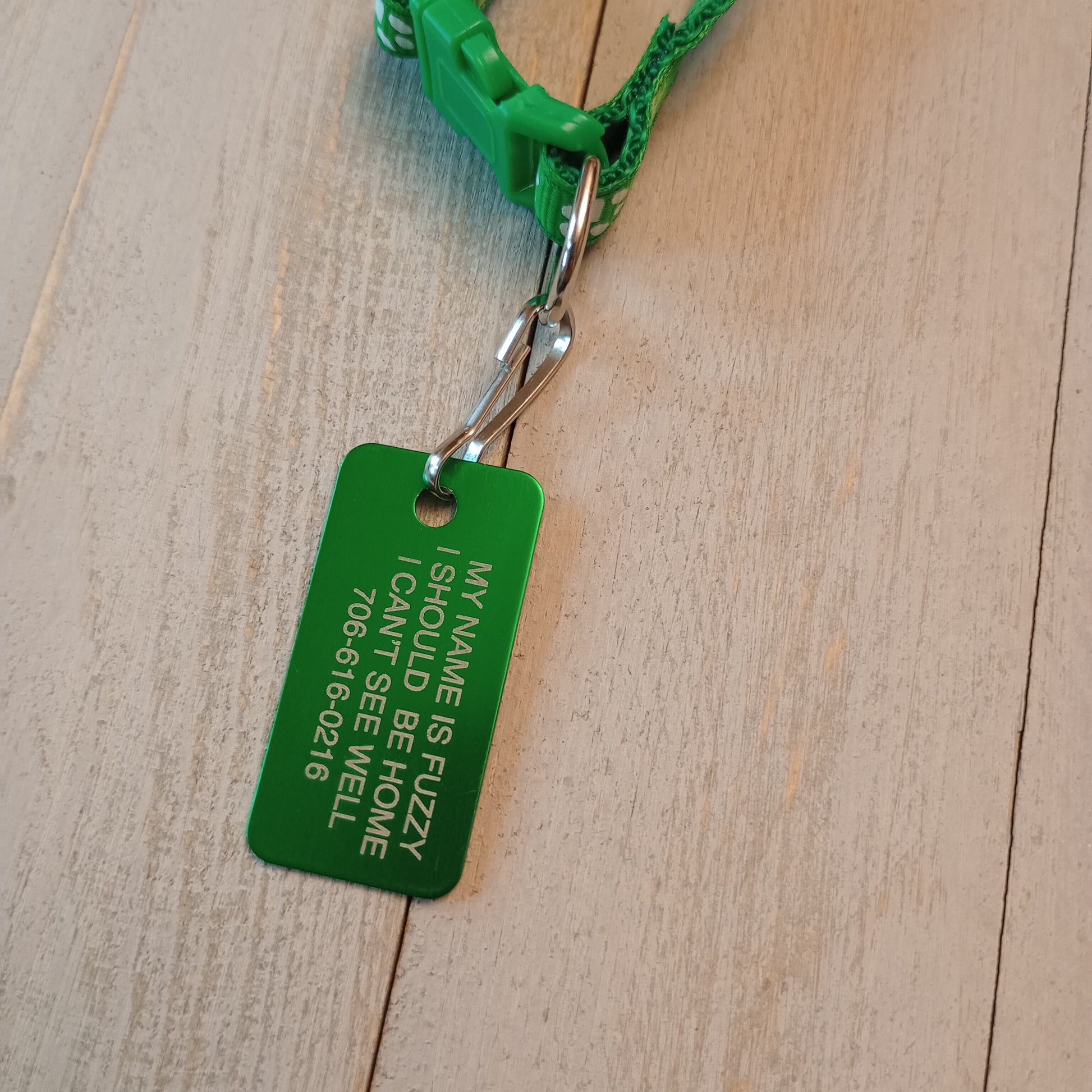 This Green Rectangular Pet Tag is anodized aluminum that allows for 4 lines of text to be engraved lengthwise on the front and 4 lines of text to be engraved lengthwise on the back.