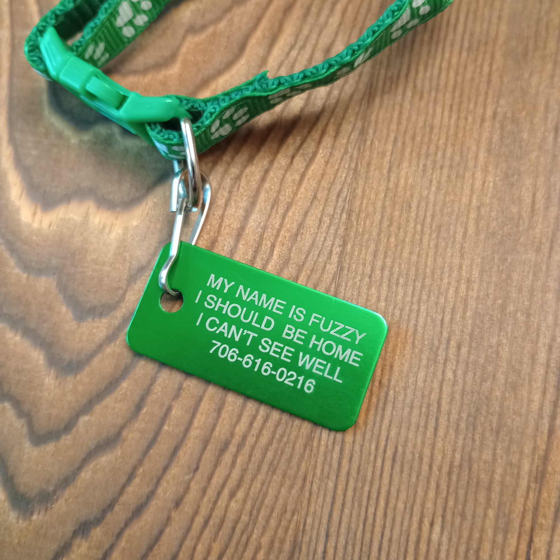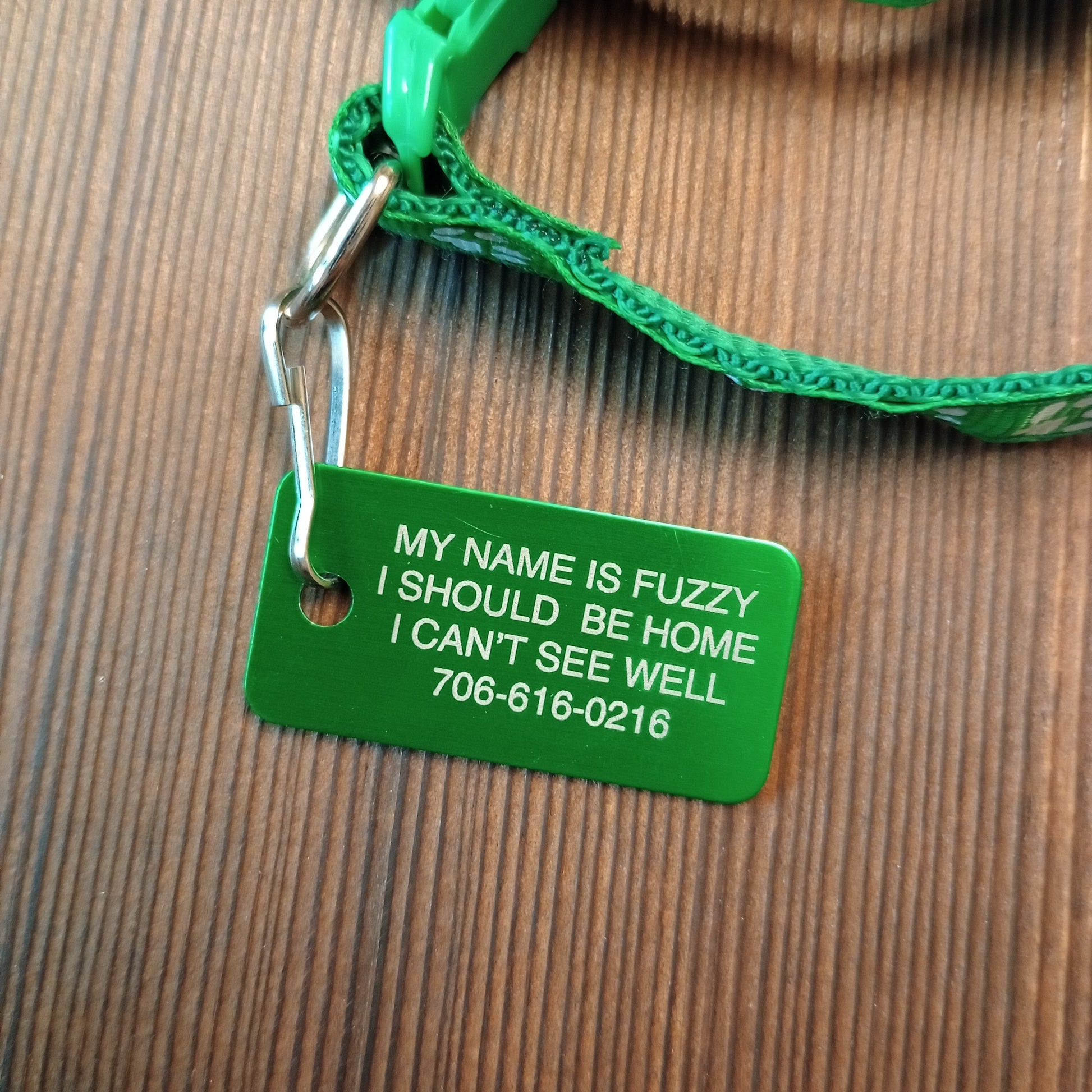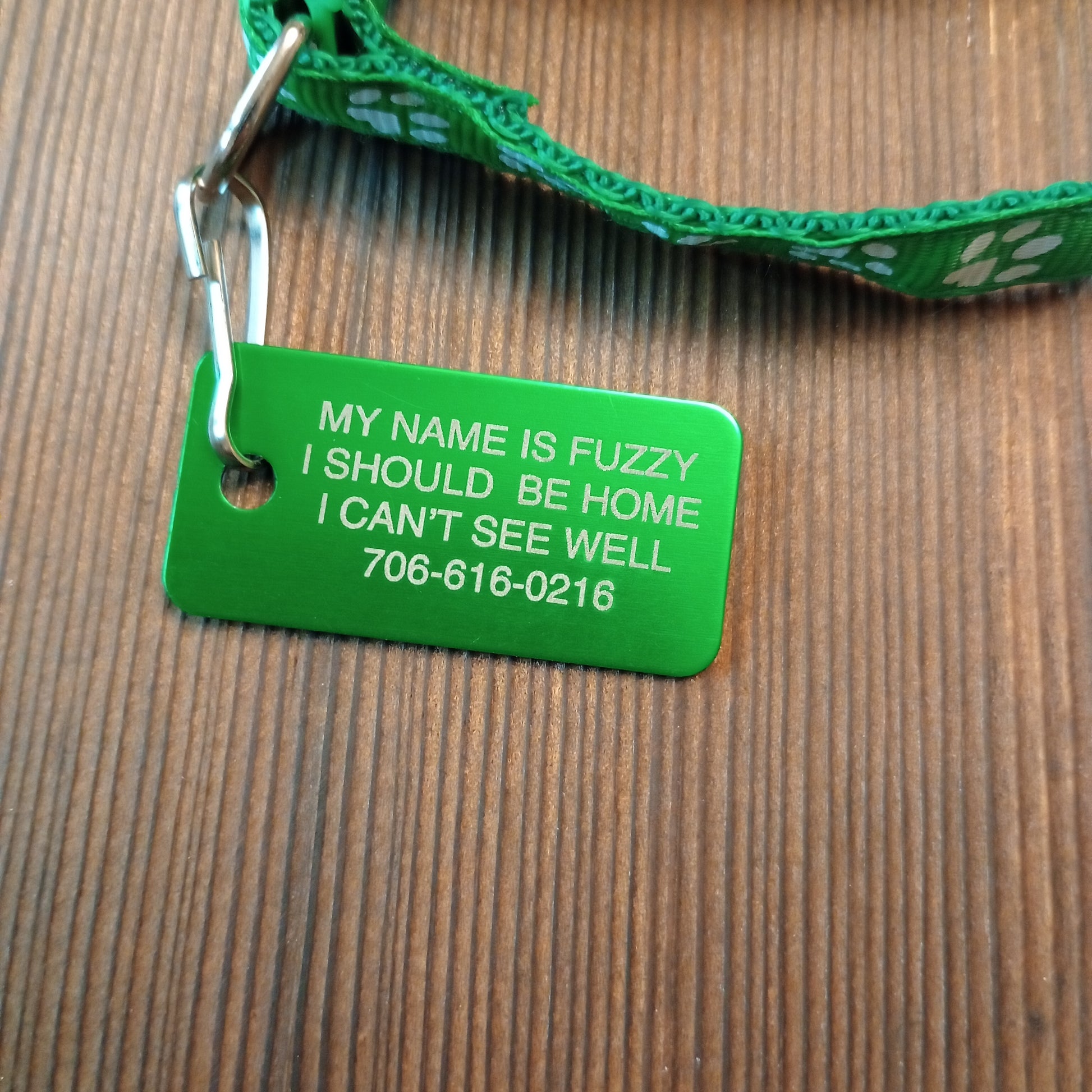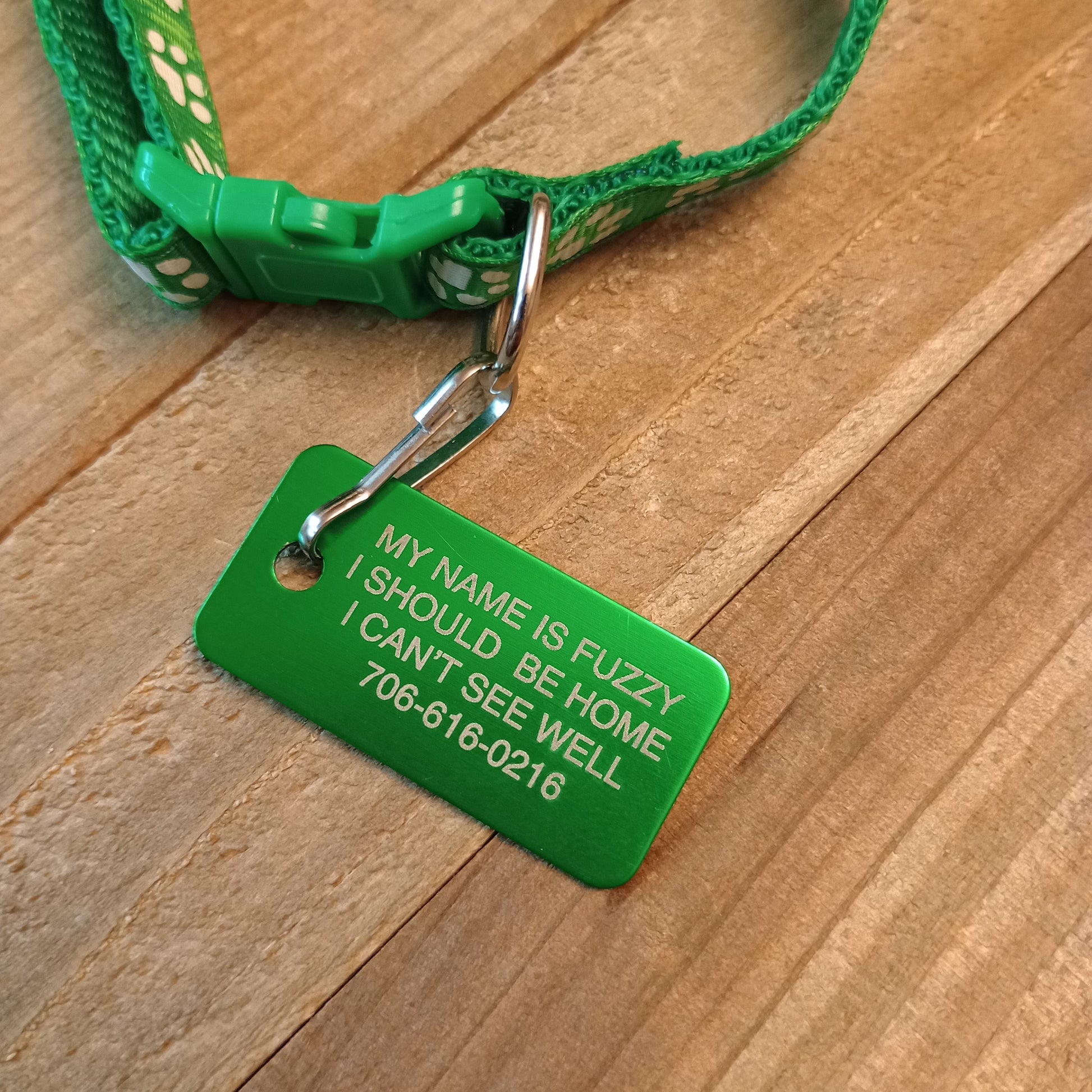 This Green Rectangular Pet Tag is anodized aluminum that allows for 4 lines of text to be engraved lengthwise on the front and 4 lines of text to be engraved lengthwise on the back.