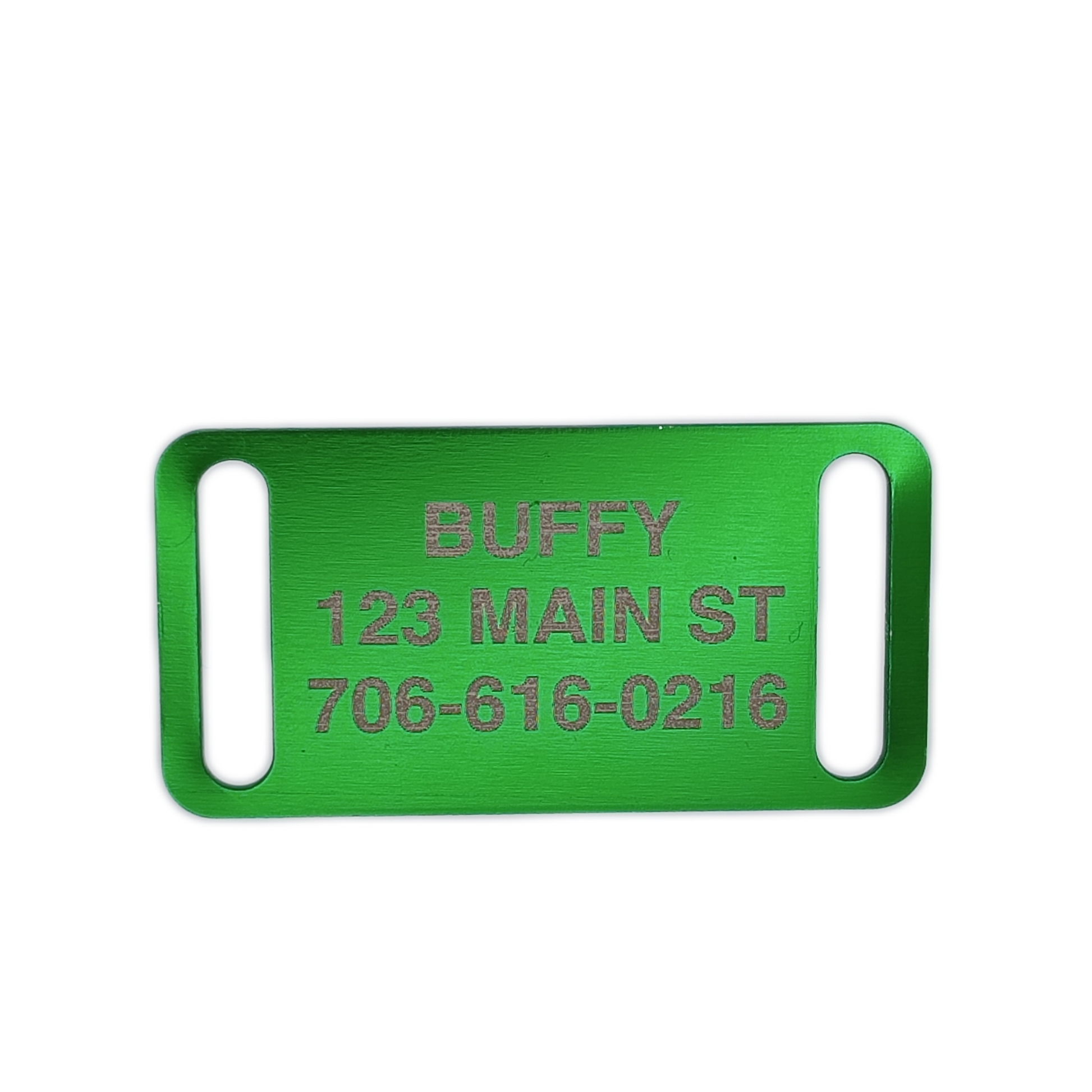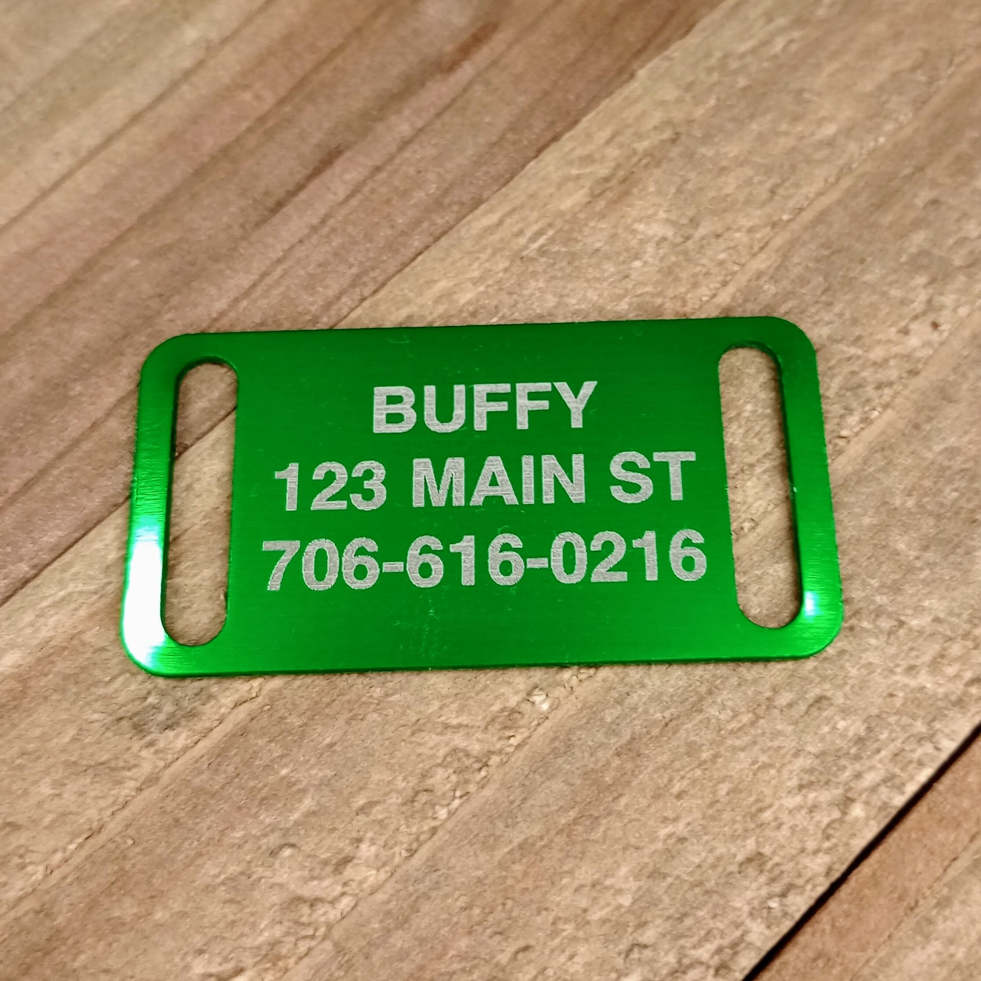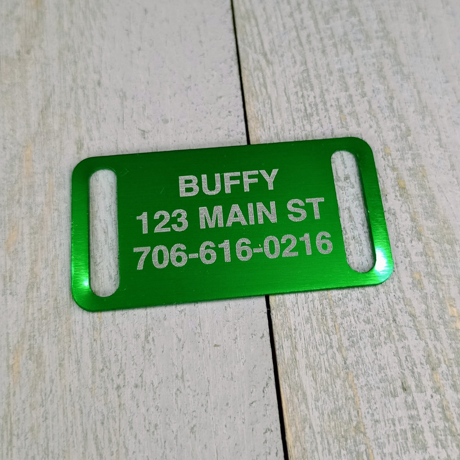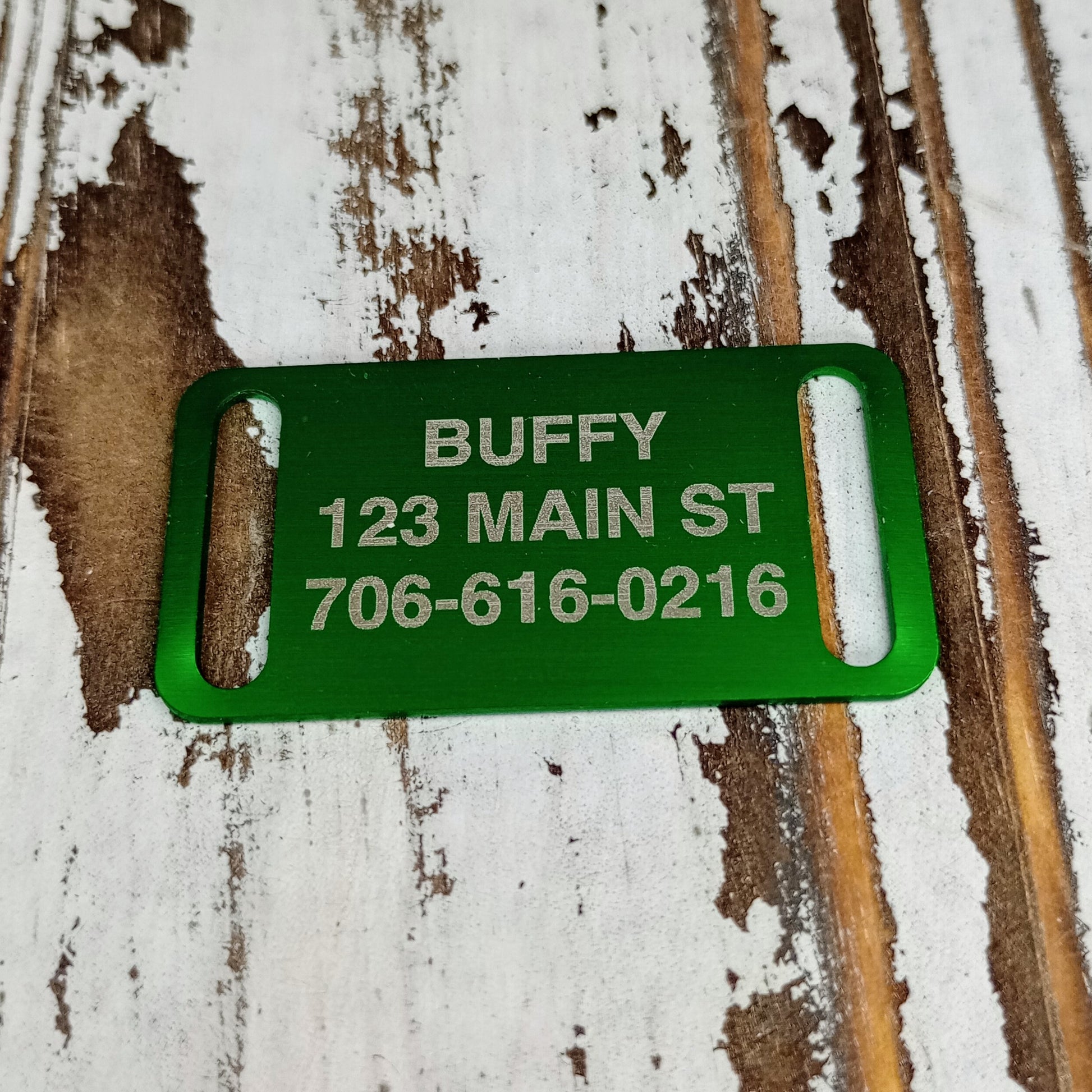 This Green Slide-On Pet Tag is anodized aluminum that allows for 4 lines of text on the front. This tag will slide on a collar that is 3/4 inch wide or less.