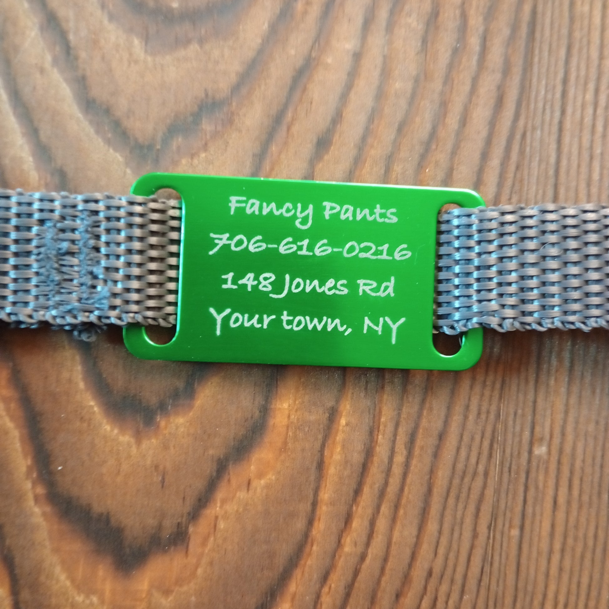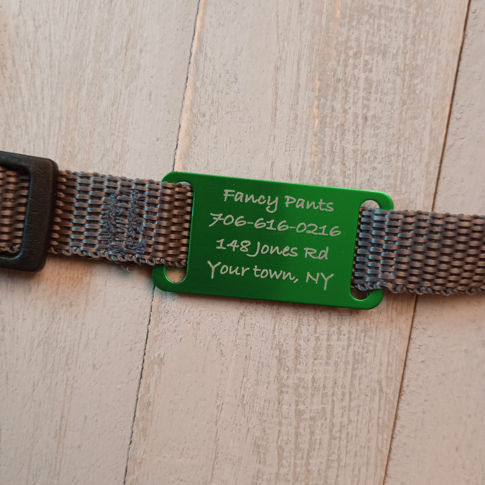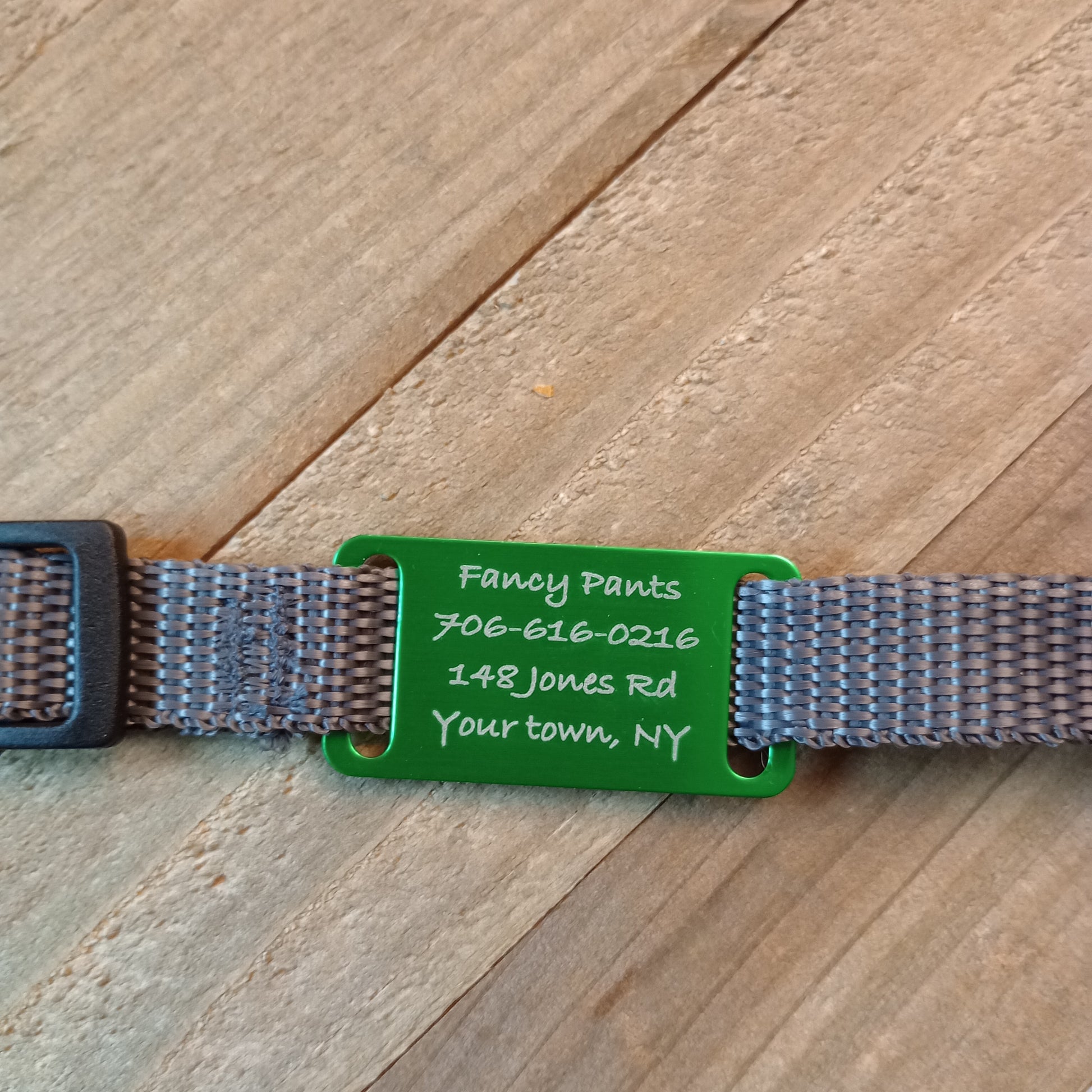 This Green Slide-On Pet Tag is anodized aluminum that allows for 4 lines of text on the front. This tag will slide on a collar that is 3/4 inch wide or less.