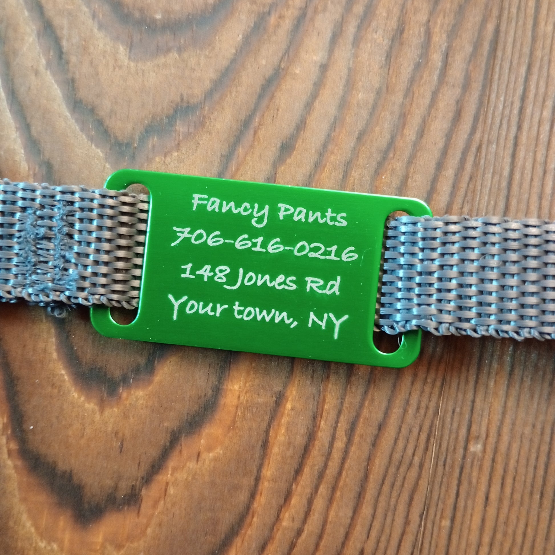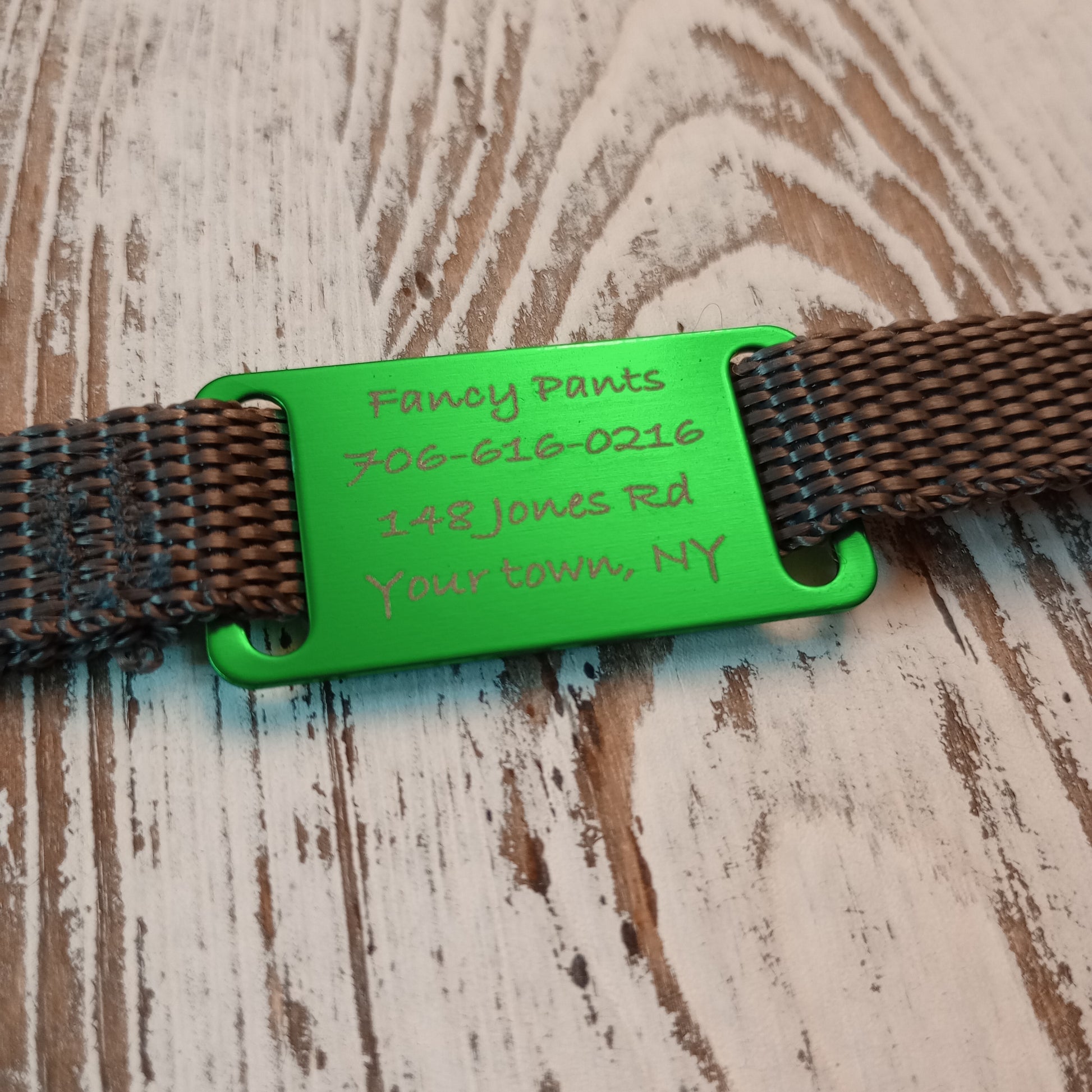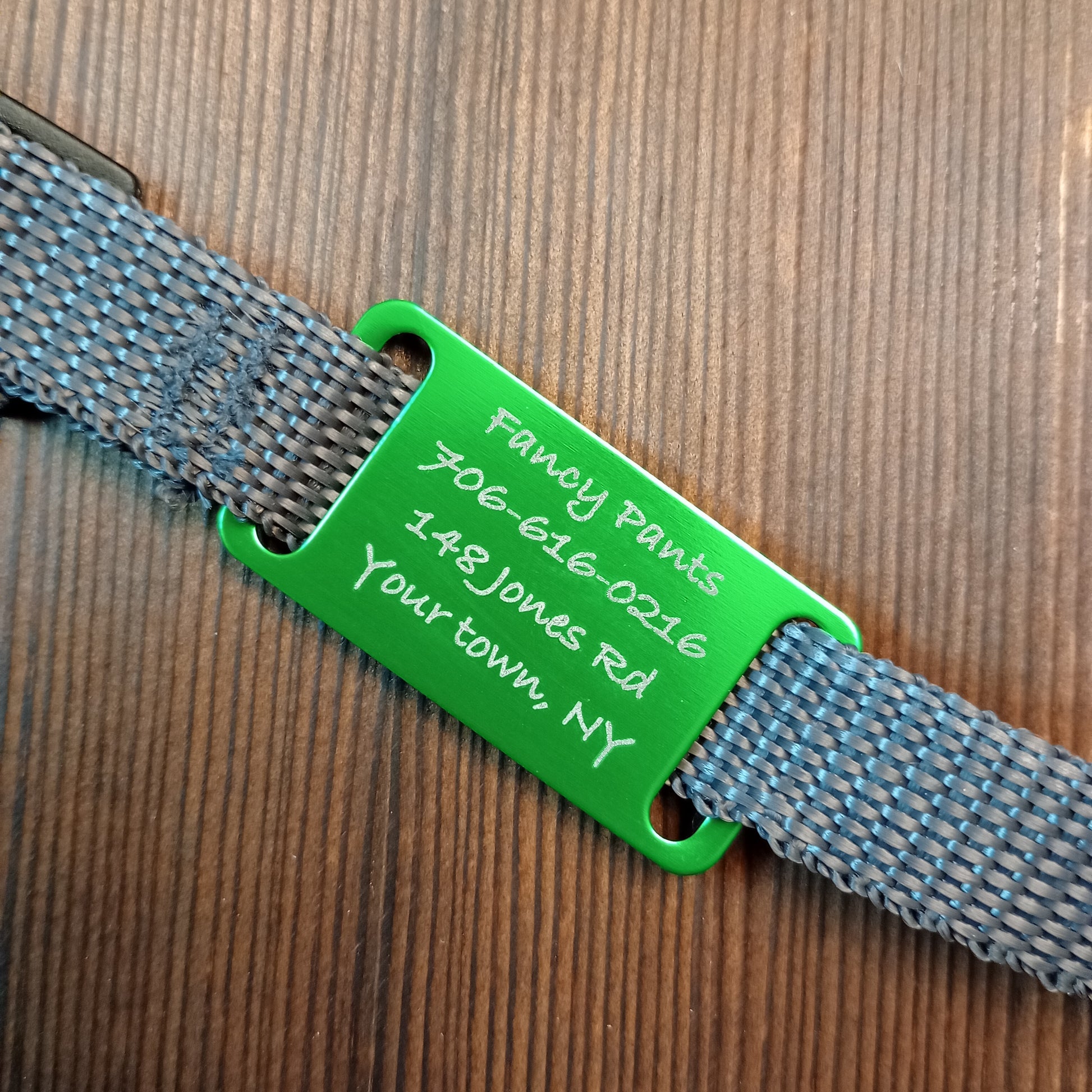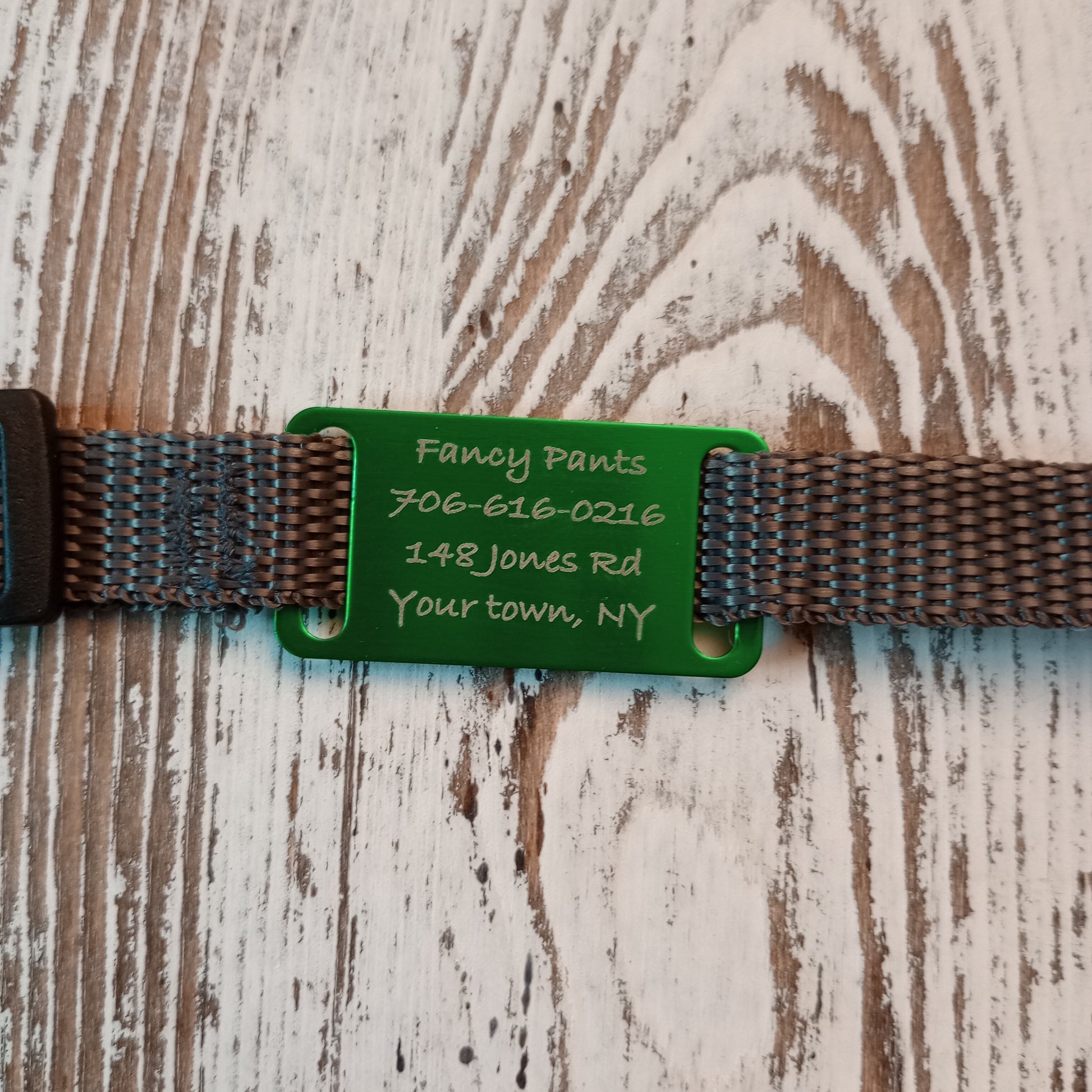 This Green Slide-On Pet Tag is anodized aluminum that allows for 4 lines of text on the front. This tag will slide on a collar that is 3/4 inch wide or less.