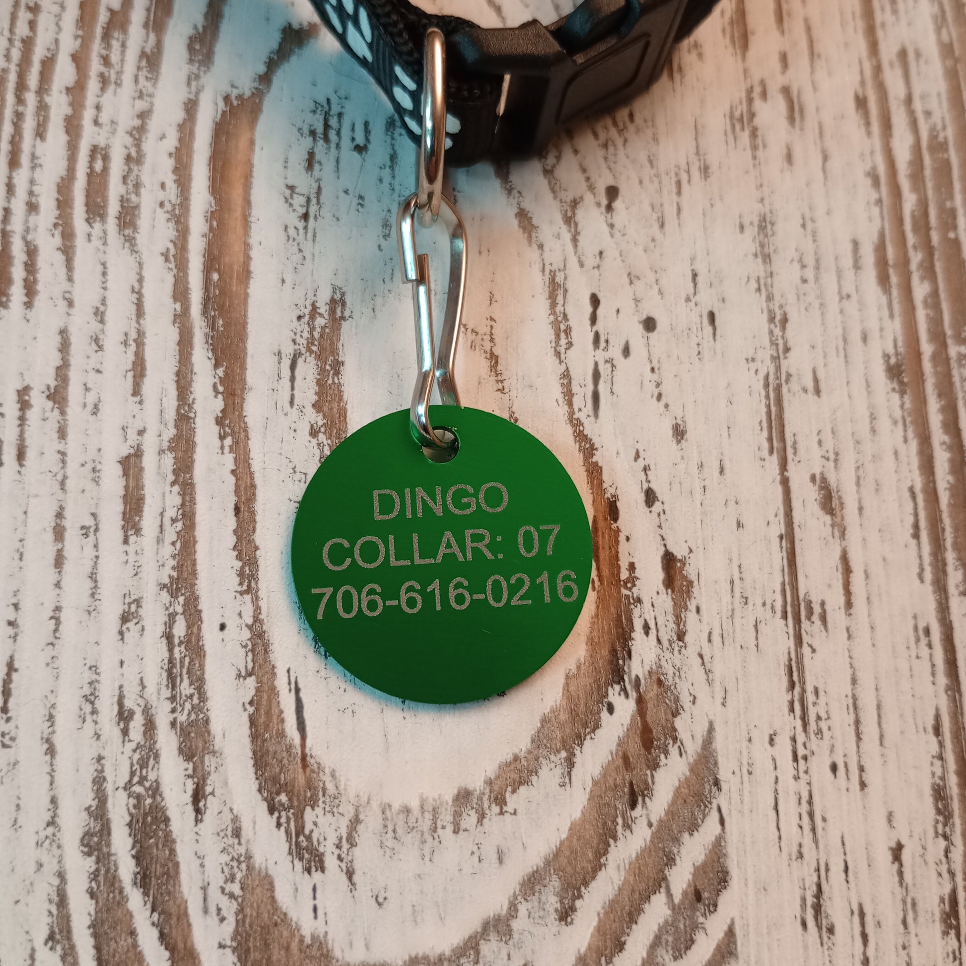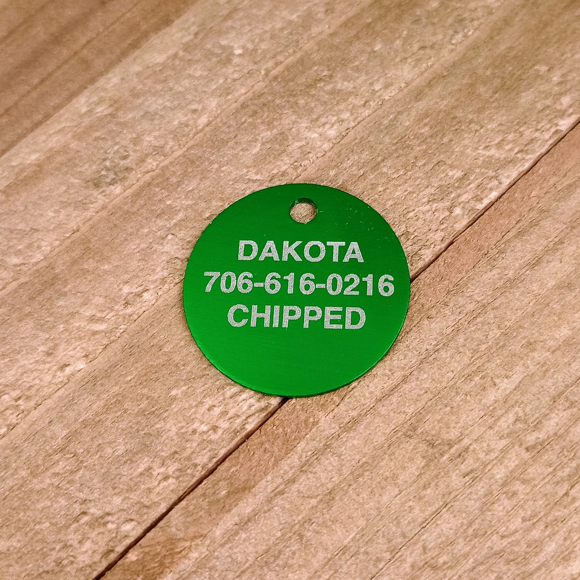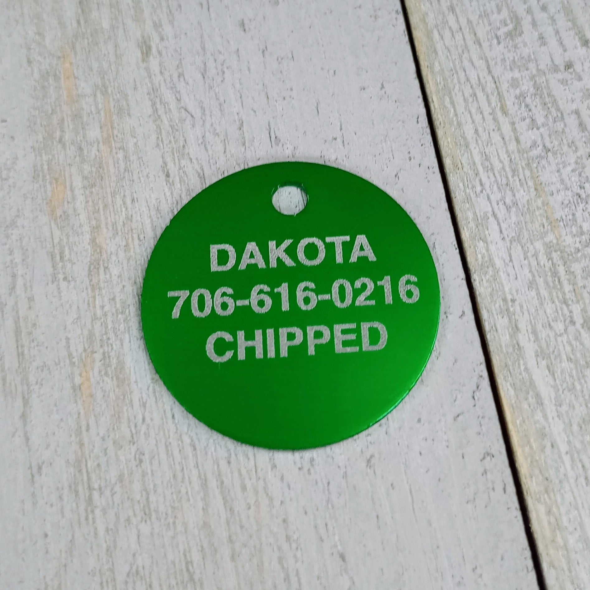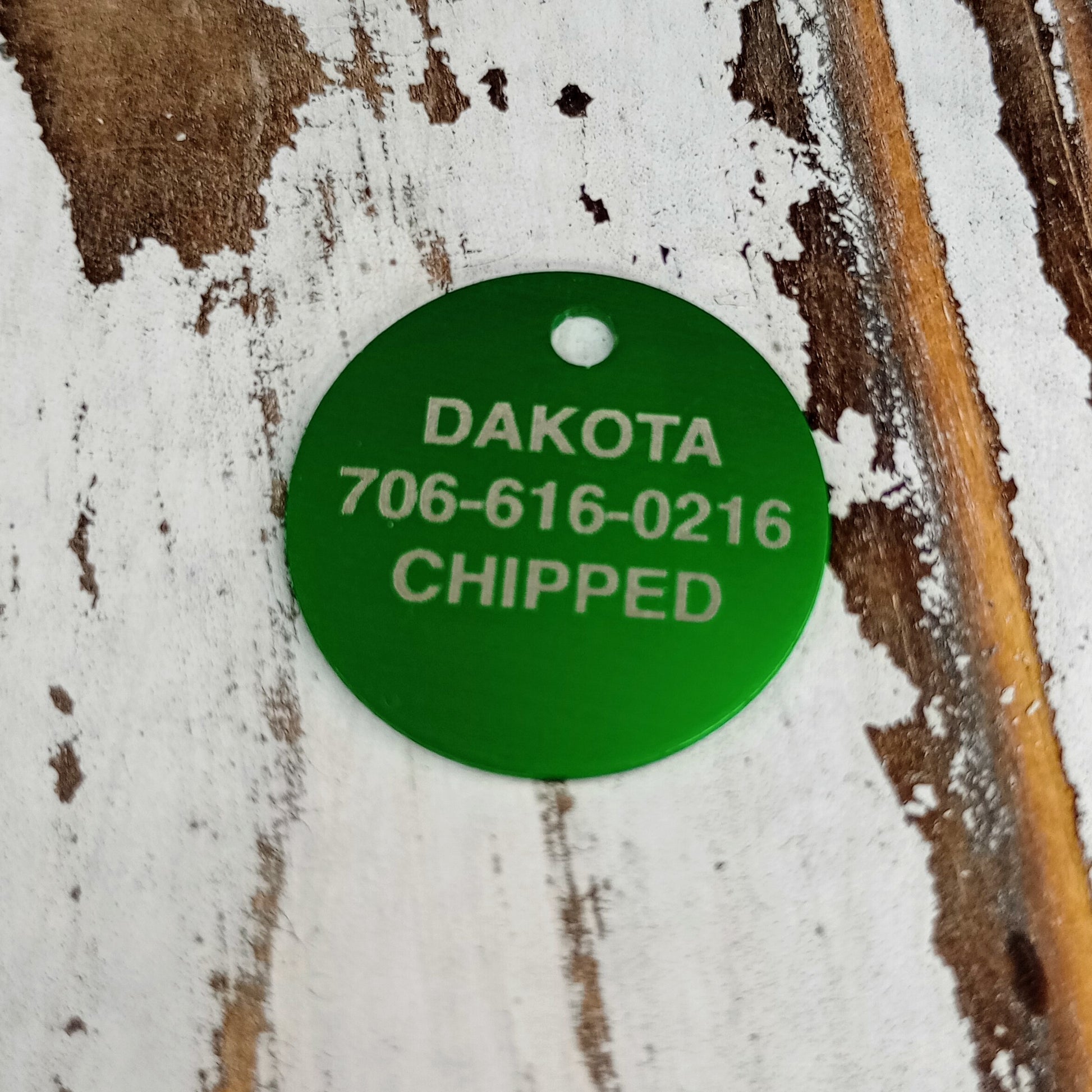 This Green Round Pet Tag is anodized aluminum that allows for 4 lines of text to be engraved on the front and 4 lines of text to be engraved on the back.