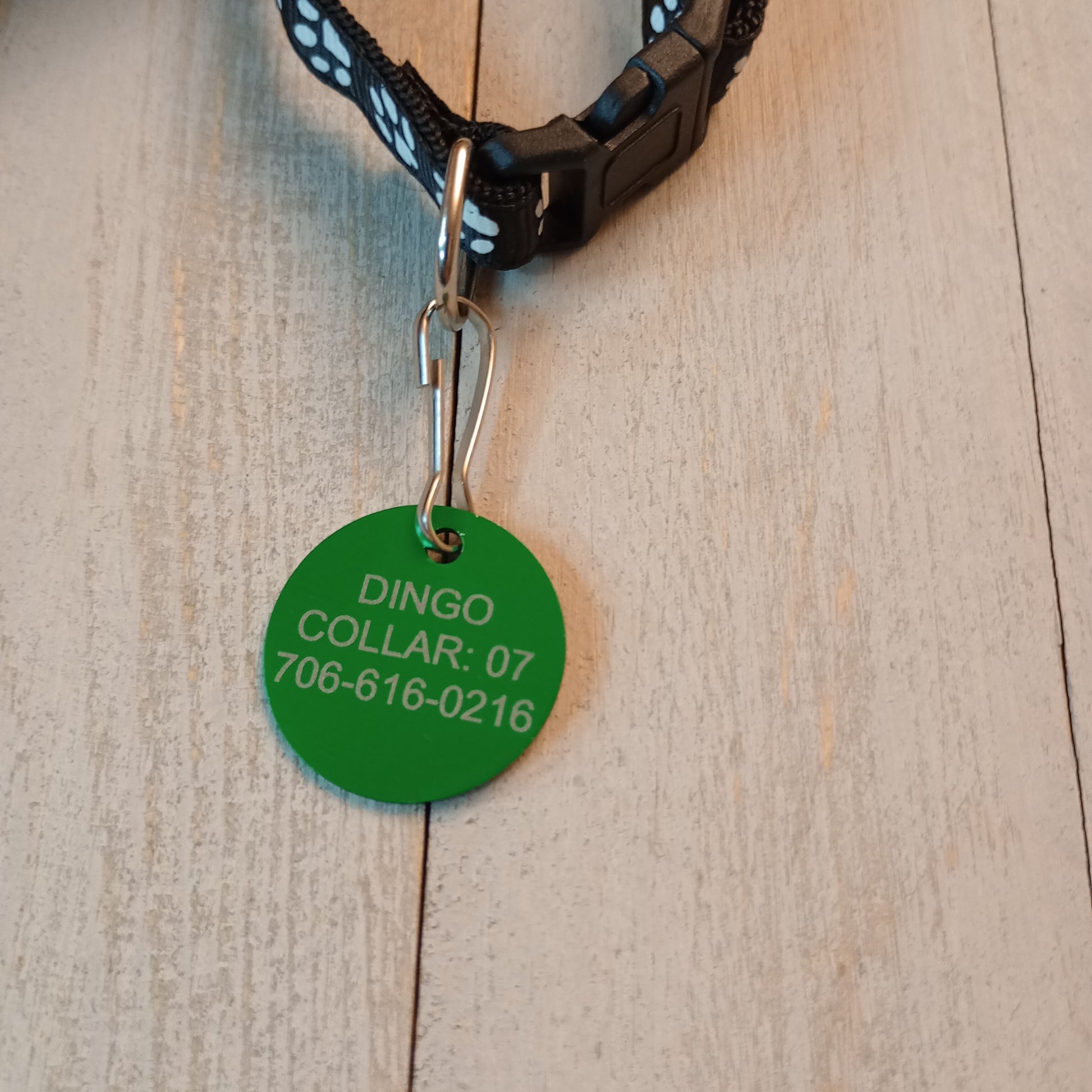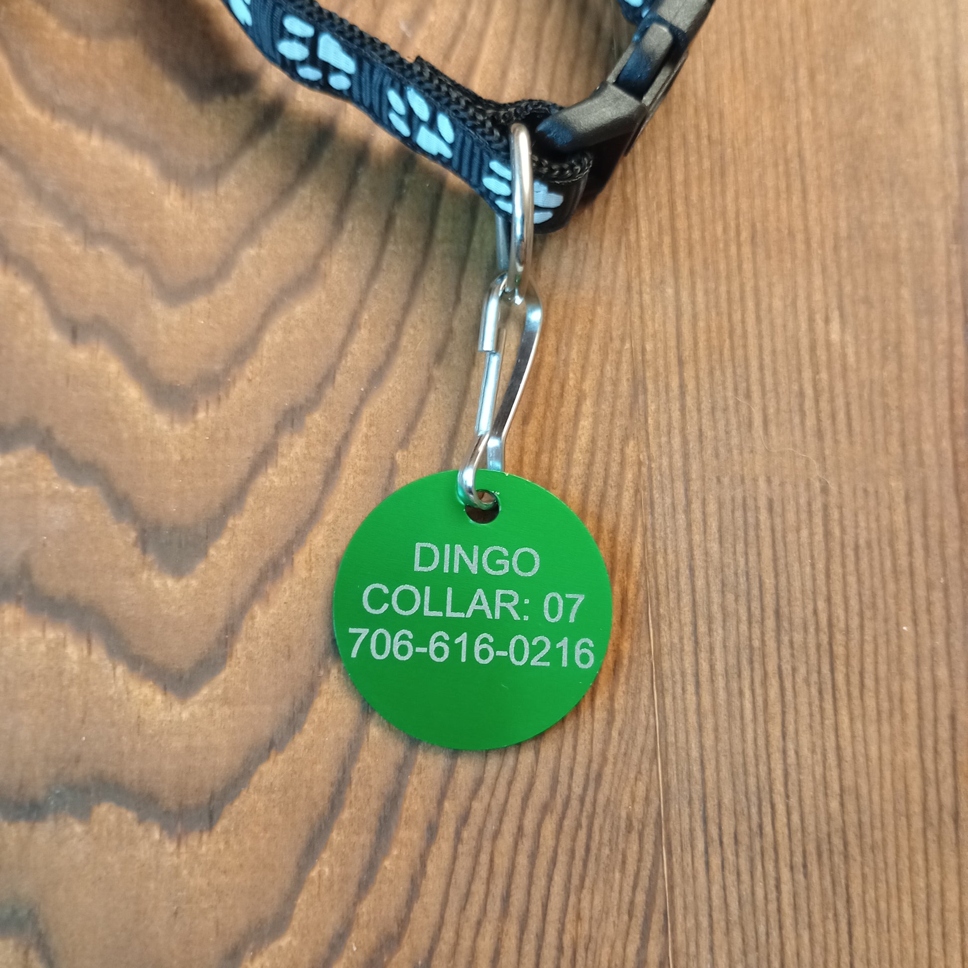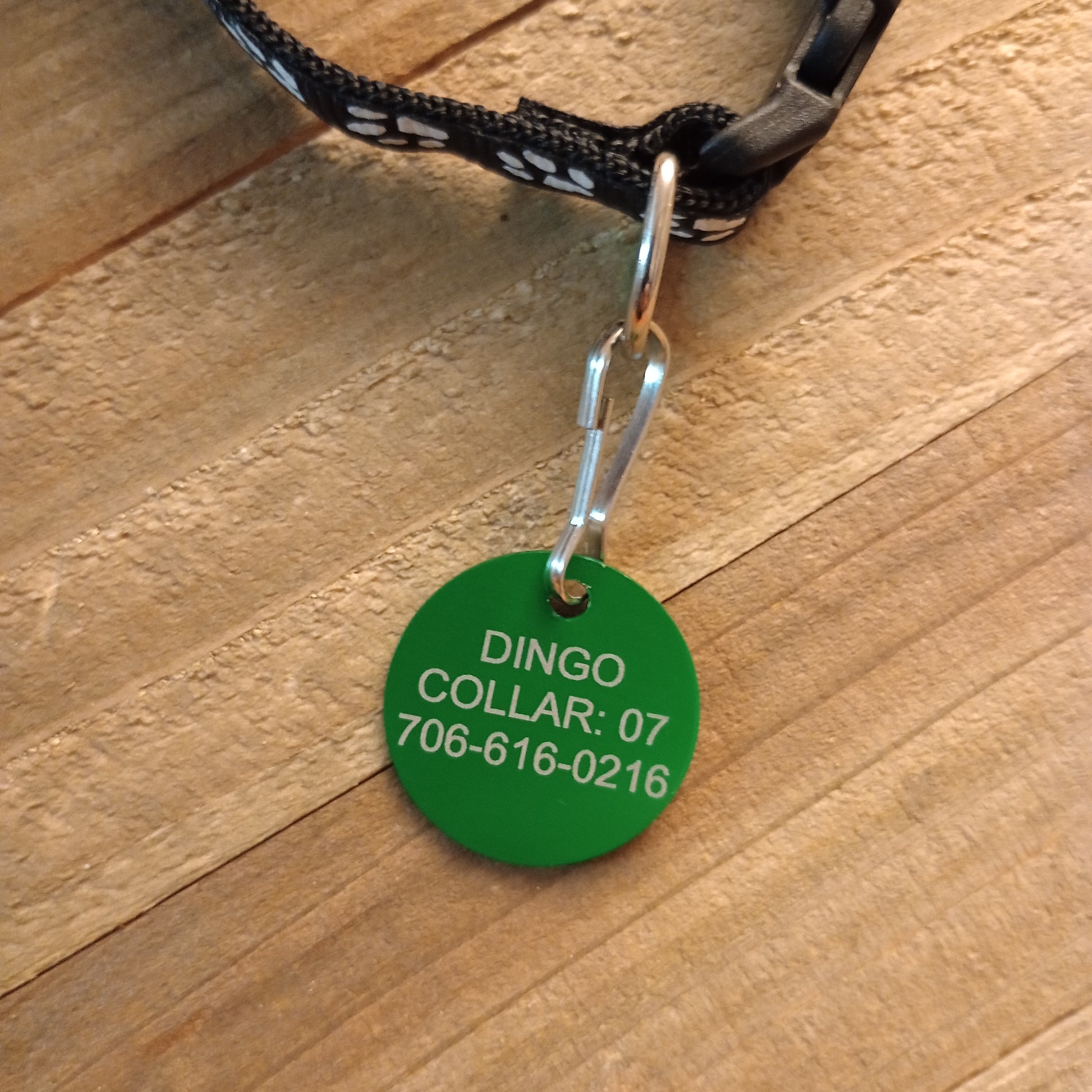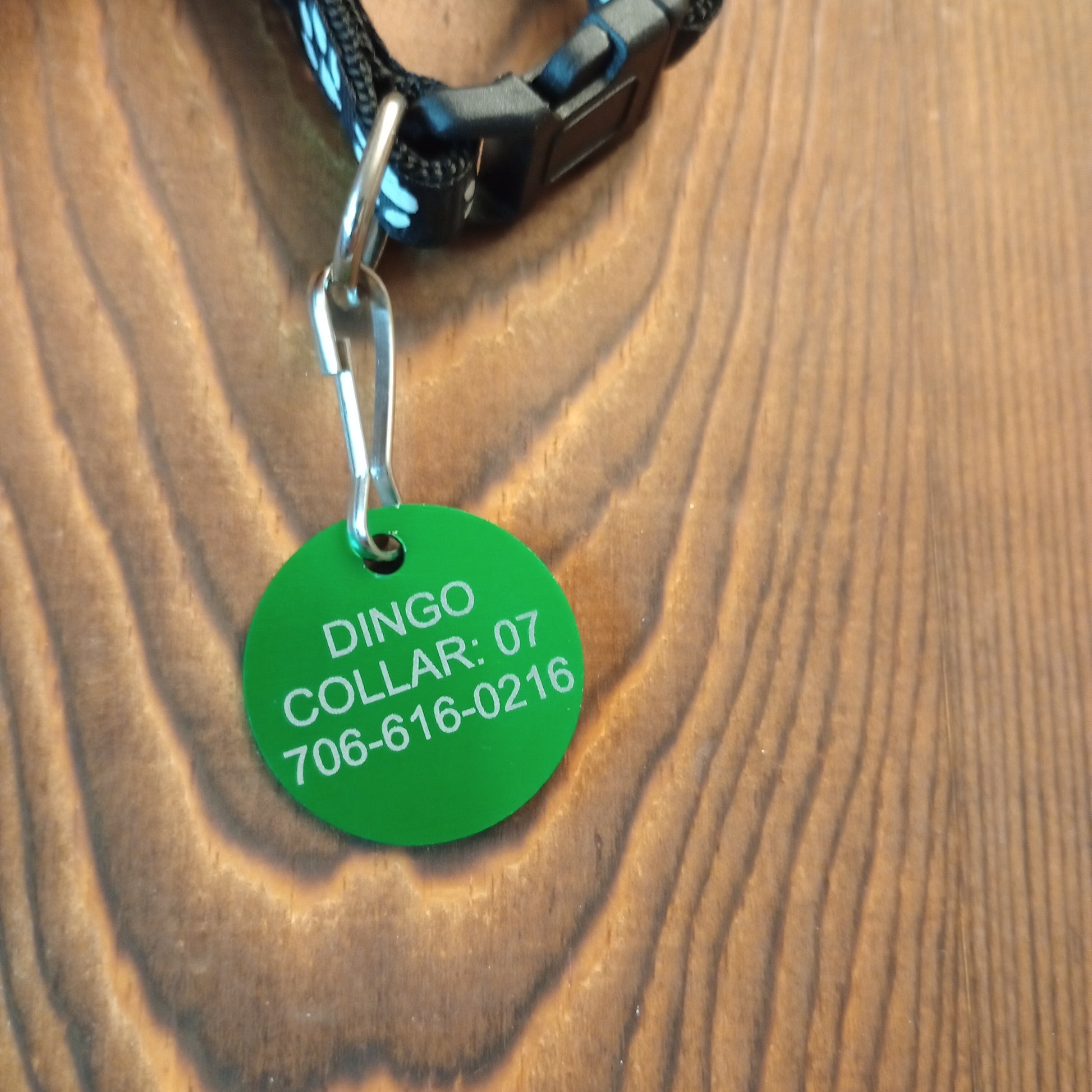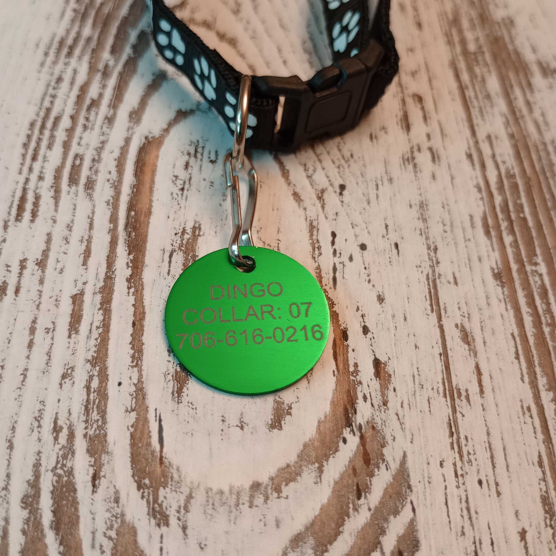 This Green Round Pet Tag is anodized aluminum that allows for 4 lines of text to be engraved on the front and 4 lines of text to be engraved on the back.