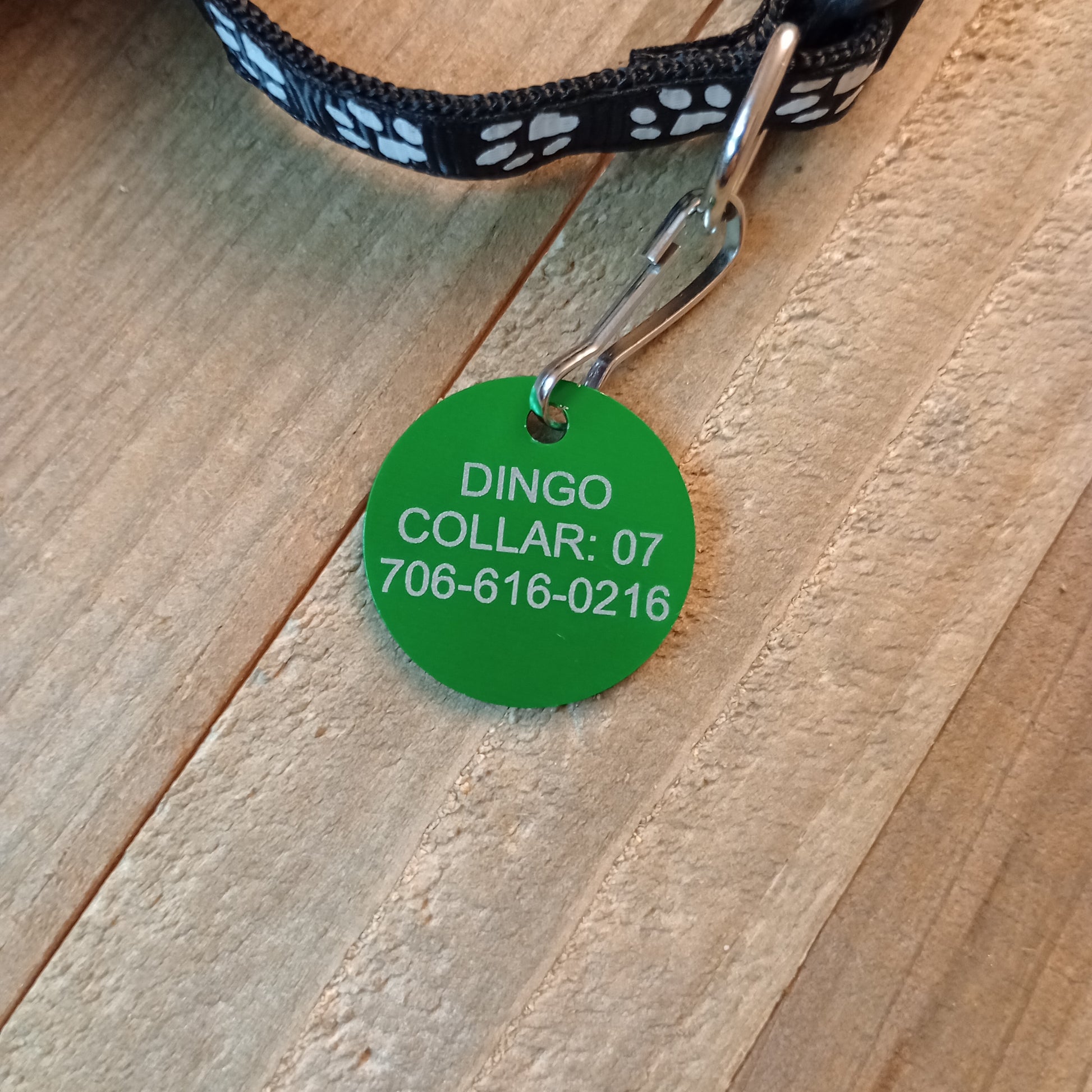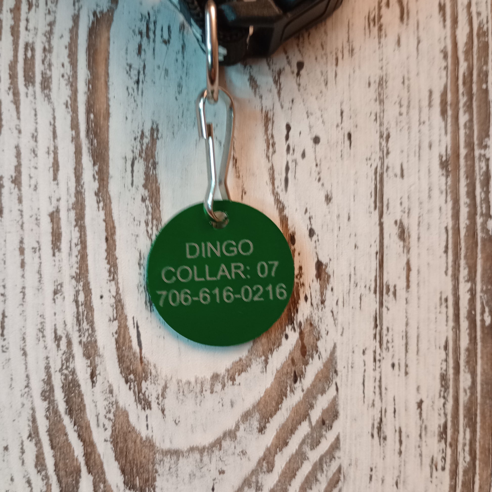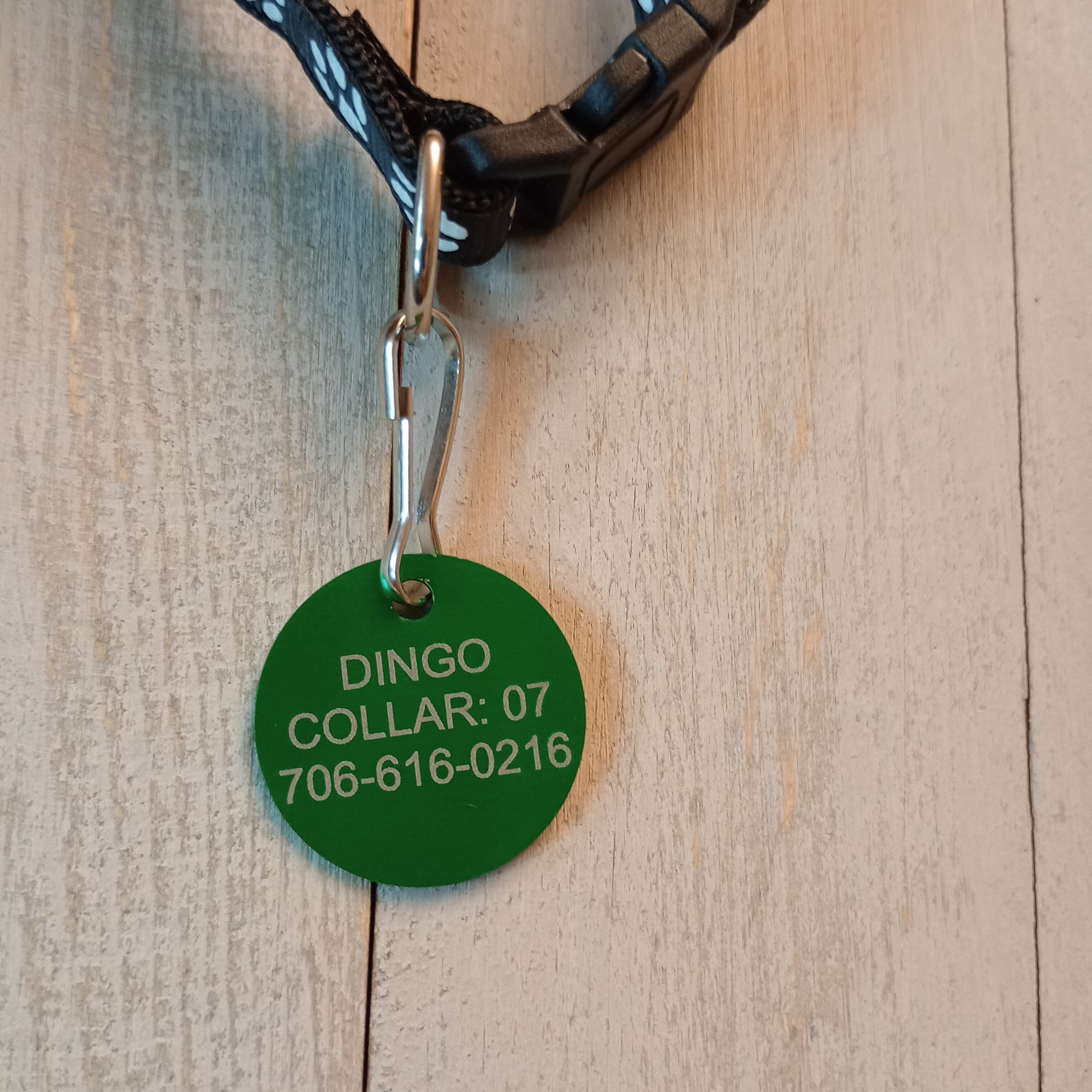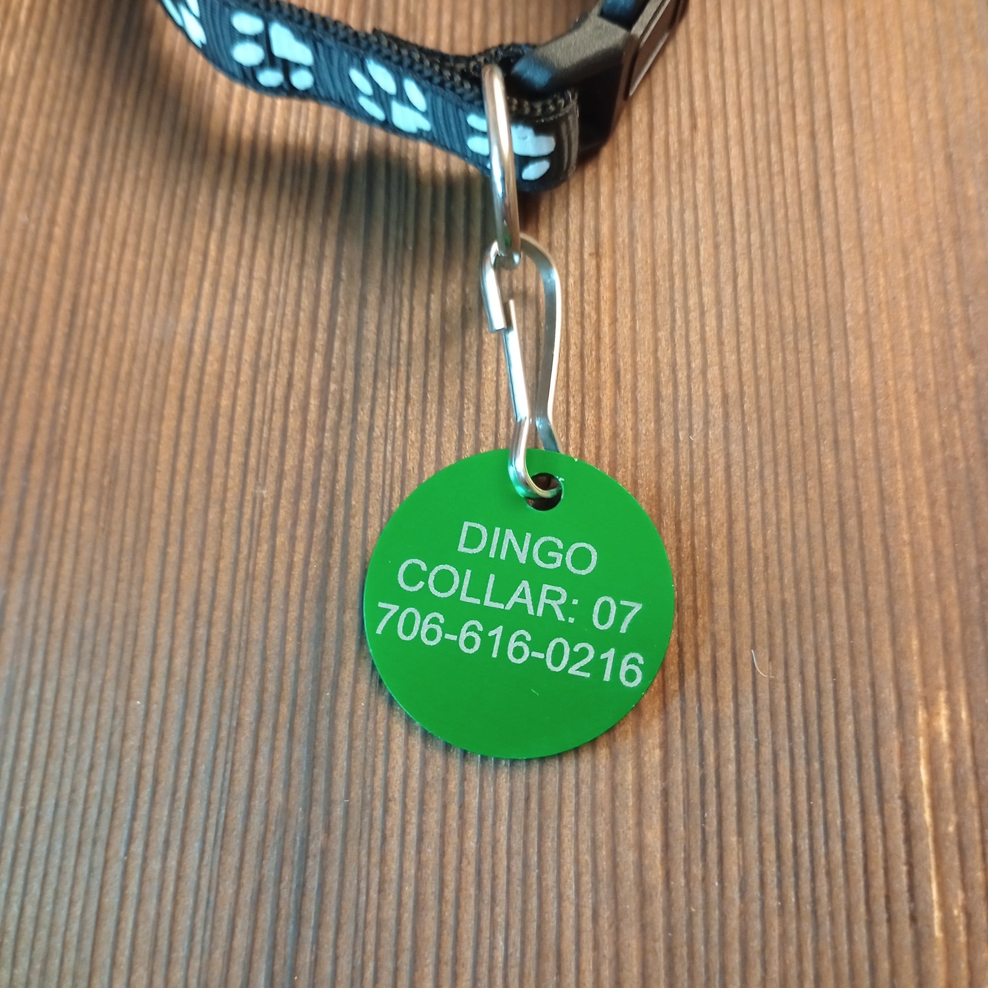 This Green Round Pet Tag is anodized aluminum that allows for 4 lines of text to be engraved on the front and 4 lines of text to be engraved on the back.