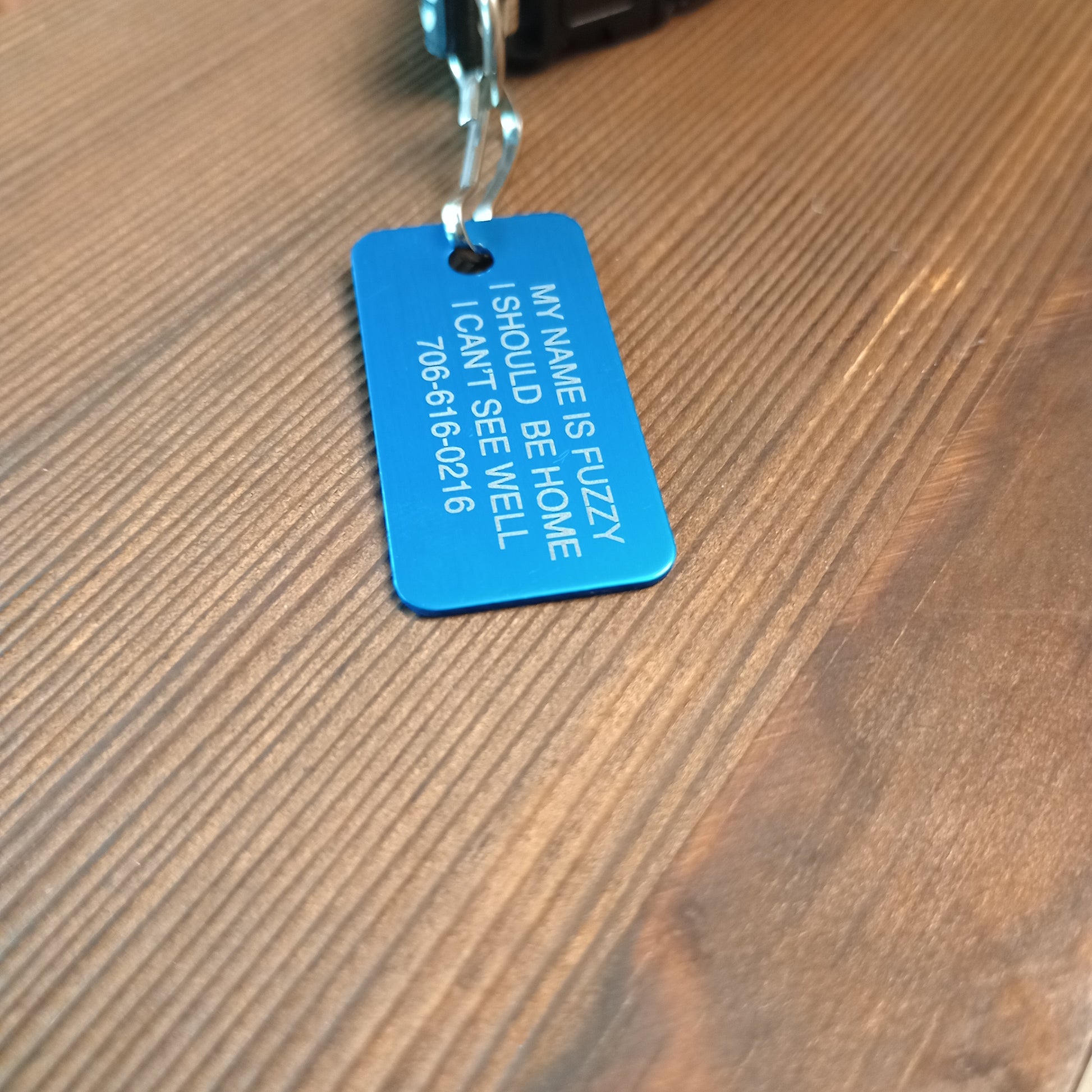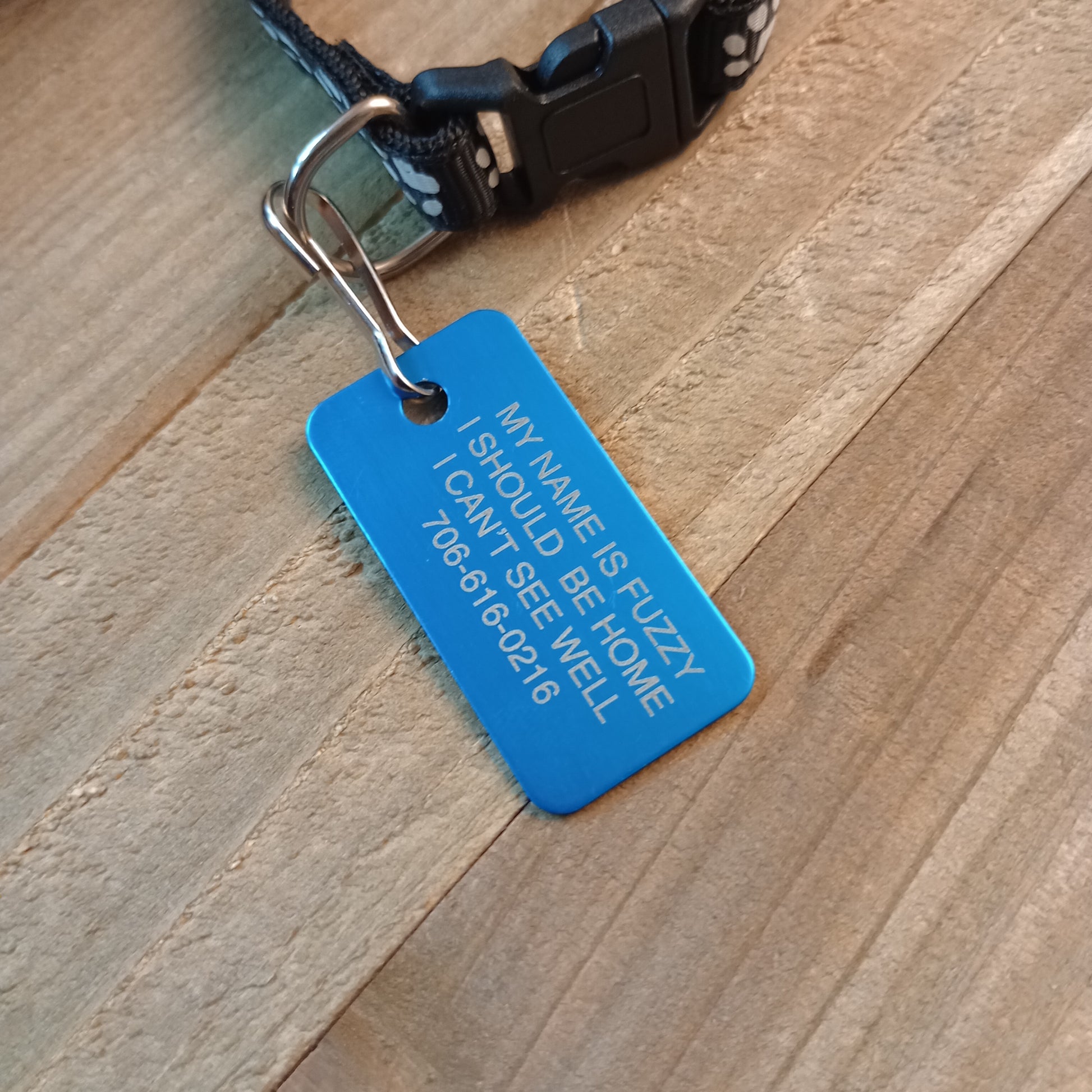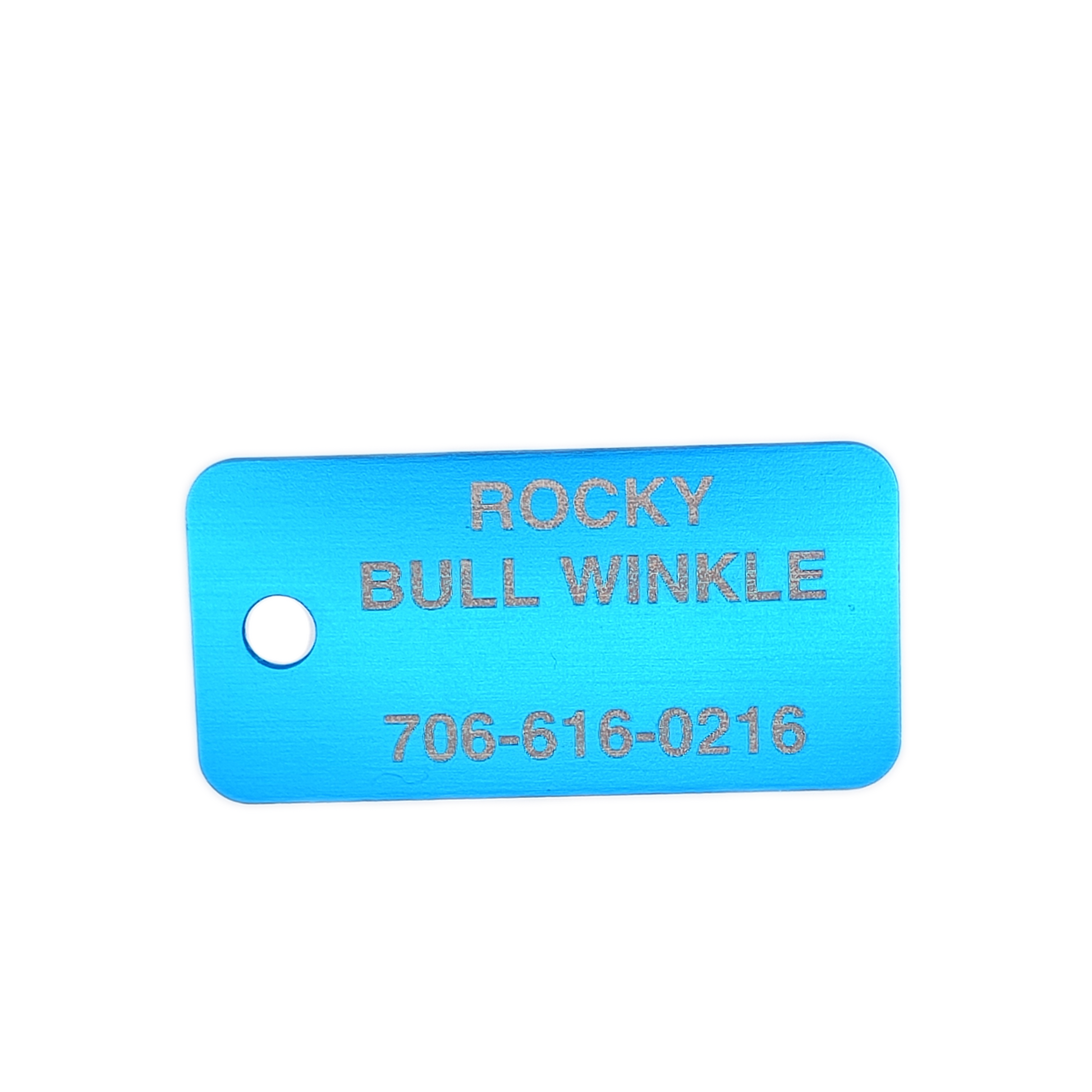 This Light Blue Rectangular Pet Tag is anodized aluminum that allows for 4 lines of text to be engraved lengthwise on the front and 4 lines of text to be engraved lengthwise on the back.