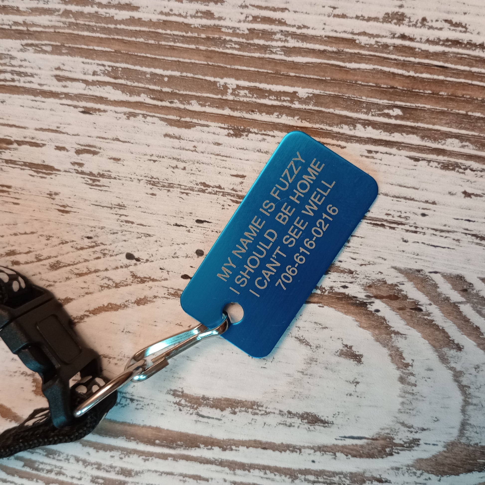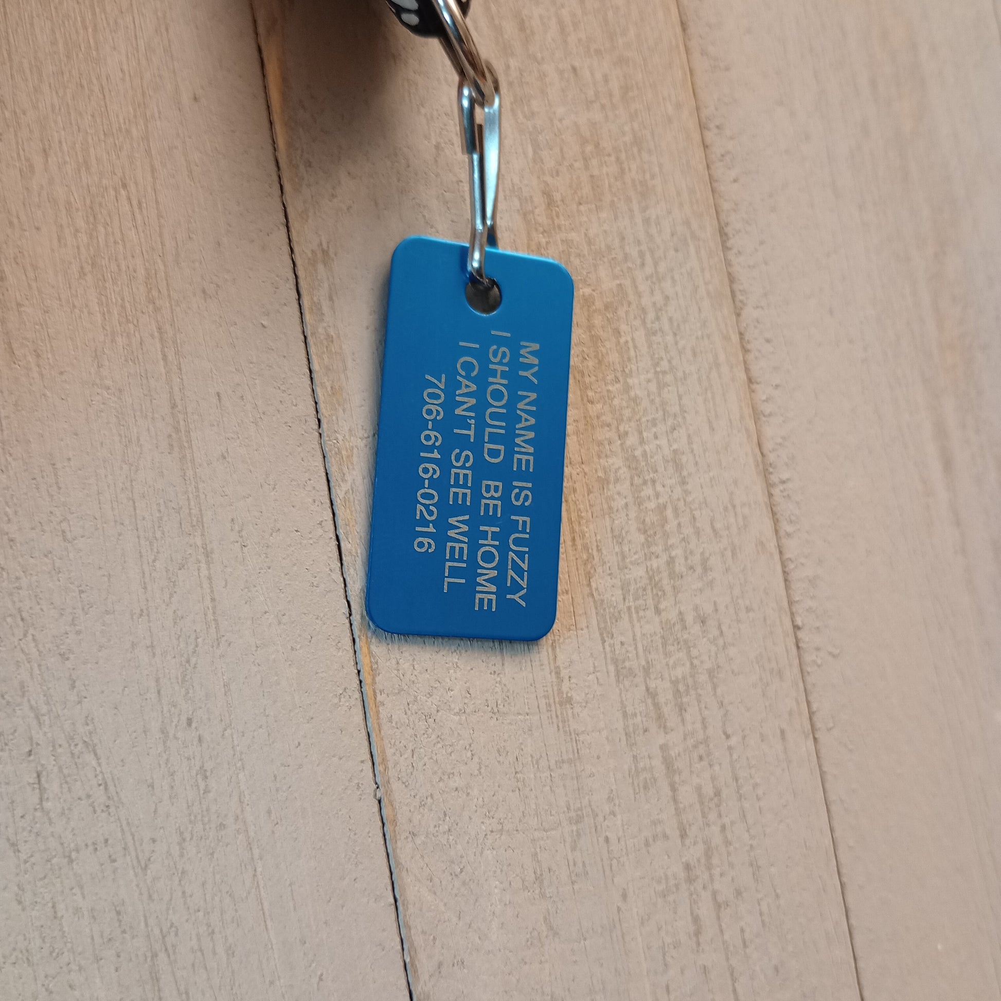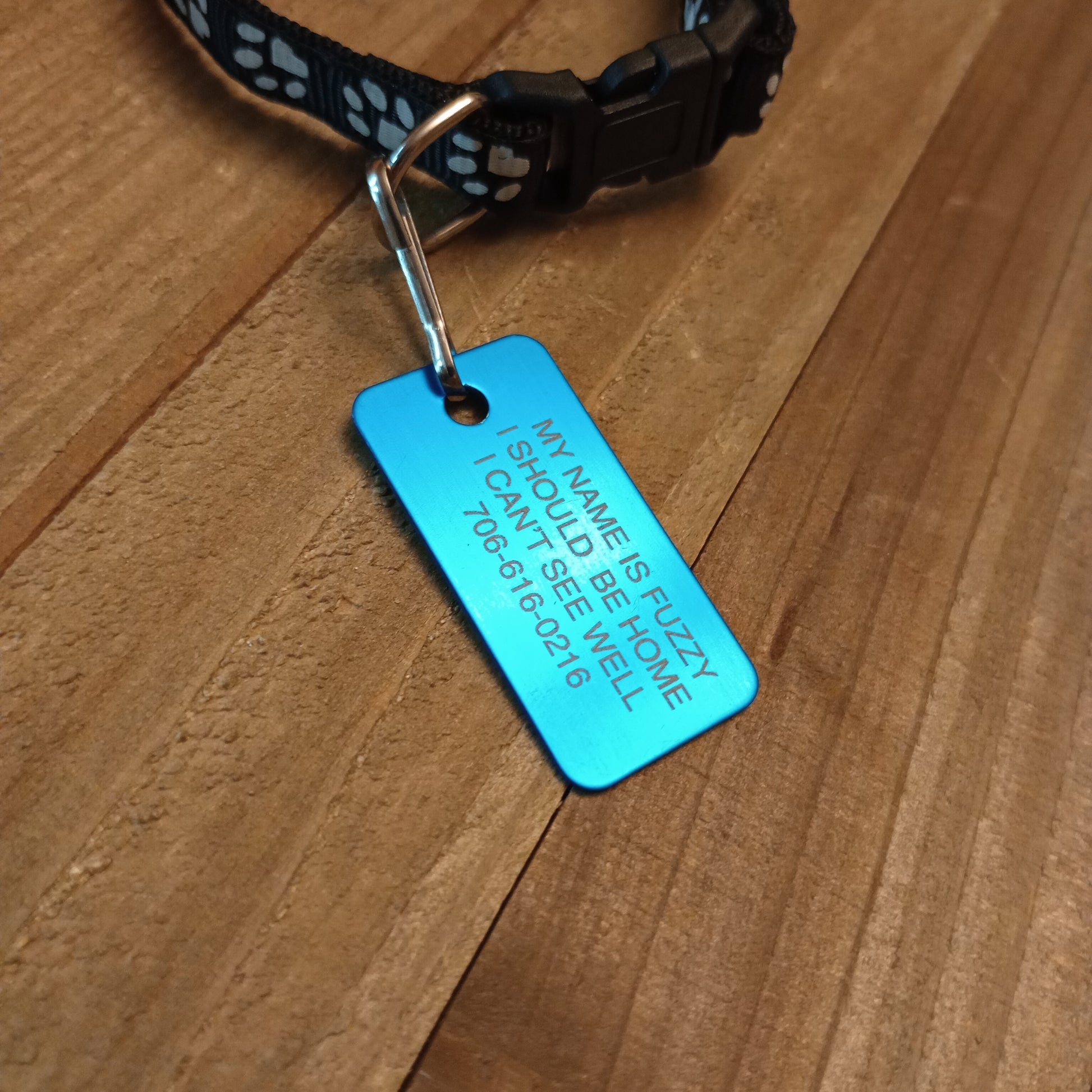This Light Blue Rectangular Pet Tag is anodized aluminum that allows for 4 lines of text to be engraved lengthwise on the front and 4 lines of text to be engraved lengthwise on the back.