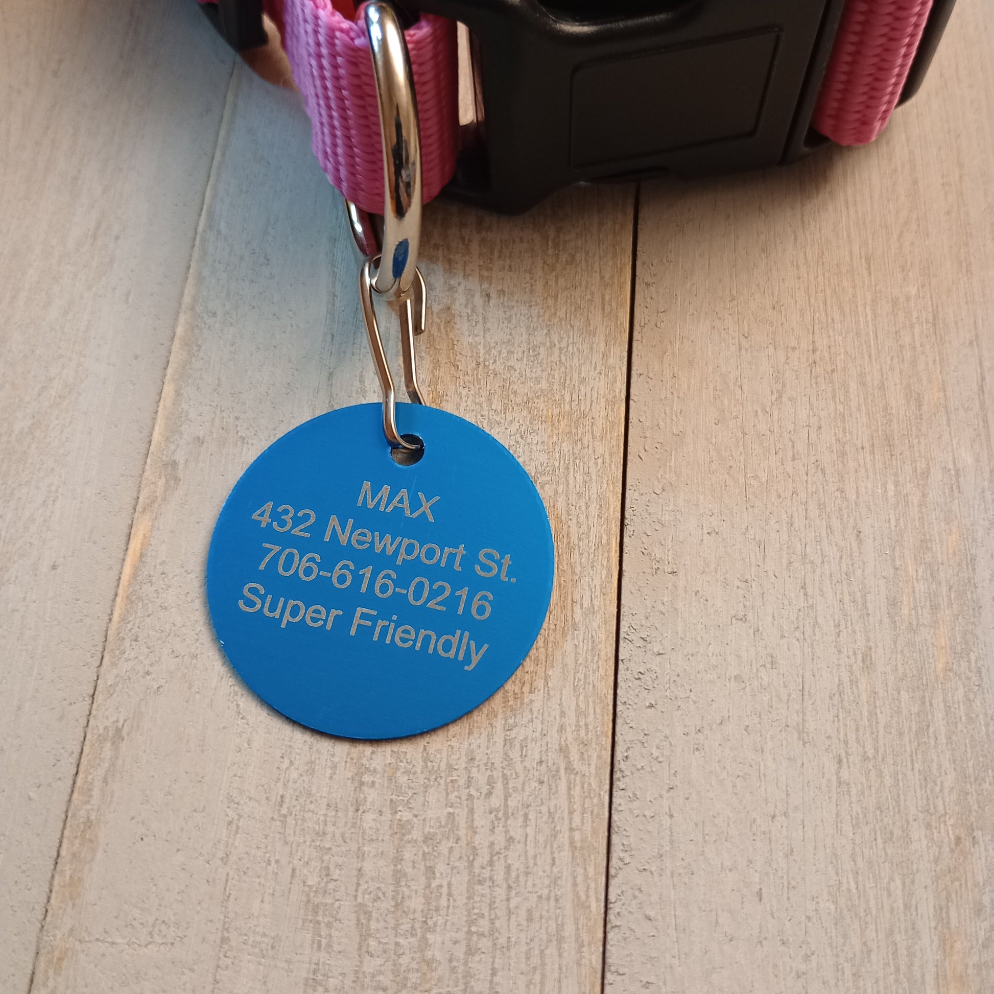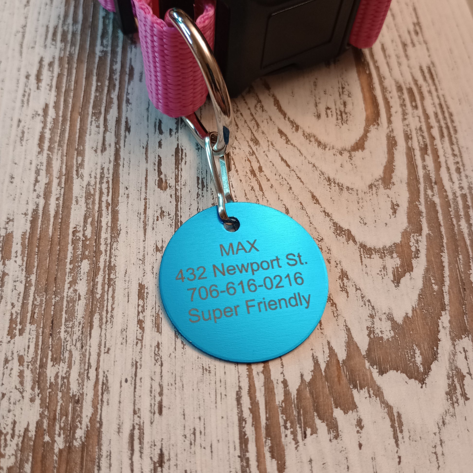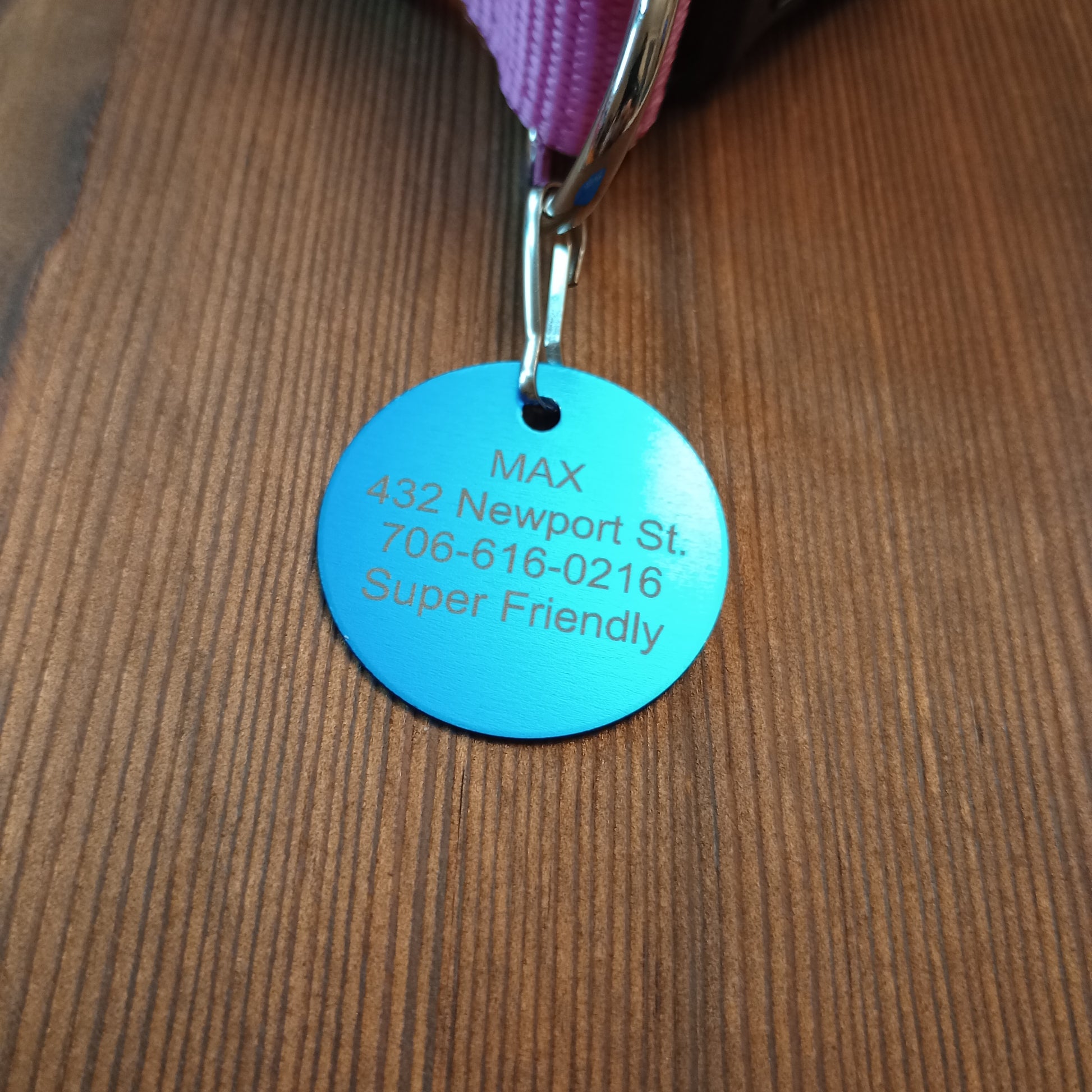 This Light Blue Round Pet Tag is anodized aluminum that allows for 4 lines of text to be engraved on the front and 4 lines of text to be engraved on the back.