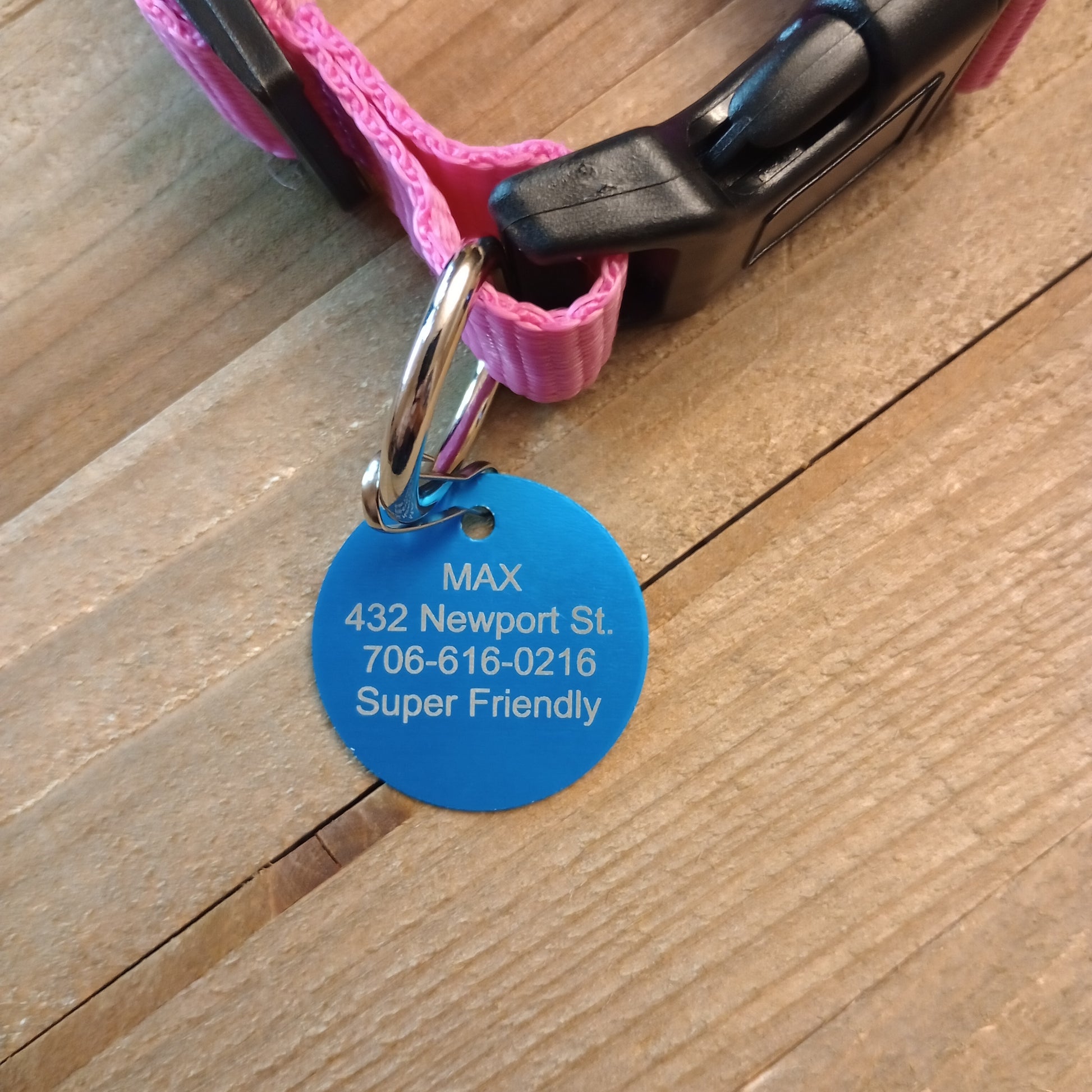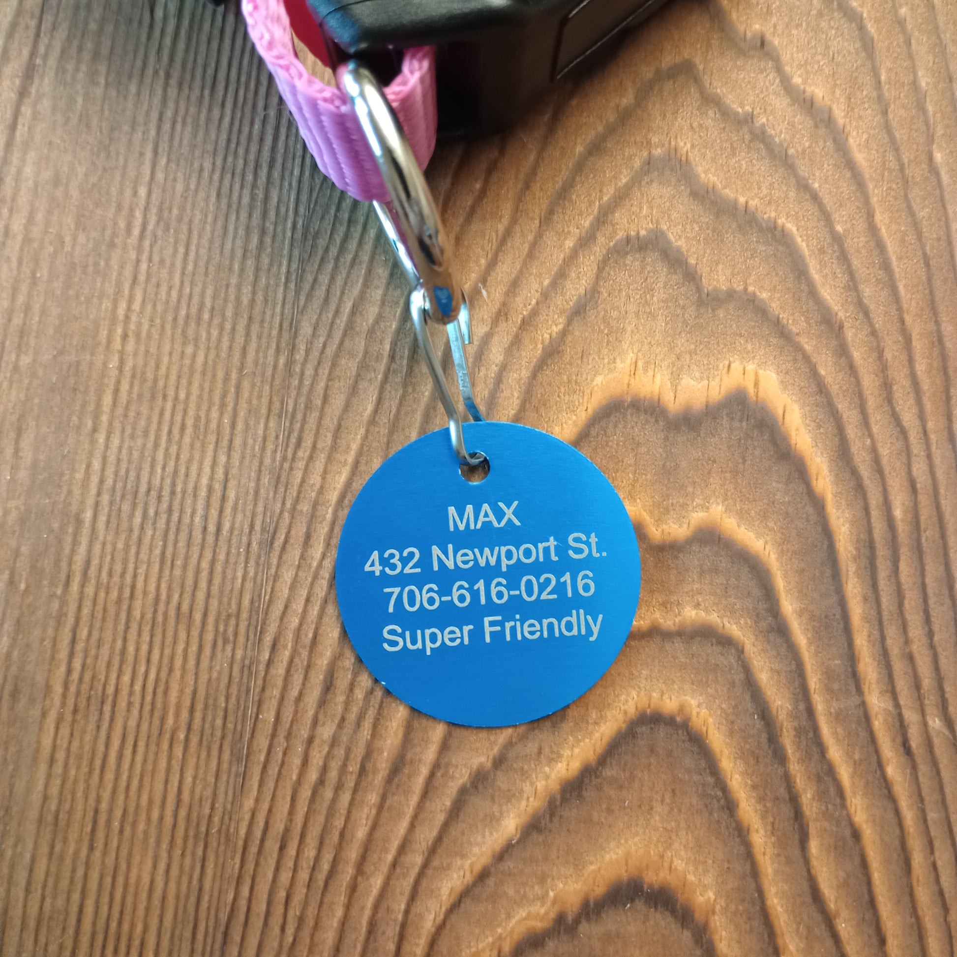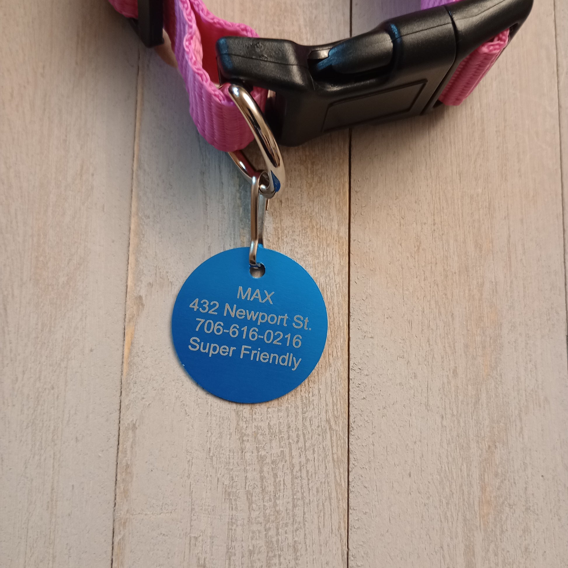 This Light Blue Round Pet Tag is anodized aluminum that allows for 4 lines of text to be engraved on the front and 4 lines of text to be engraved on the back.