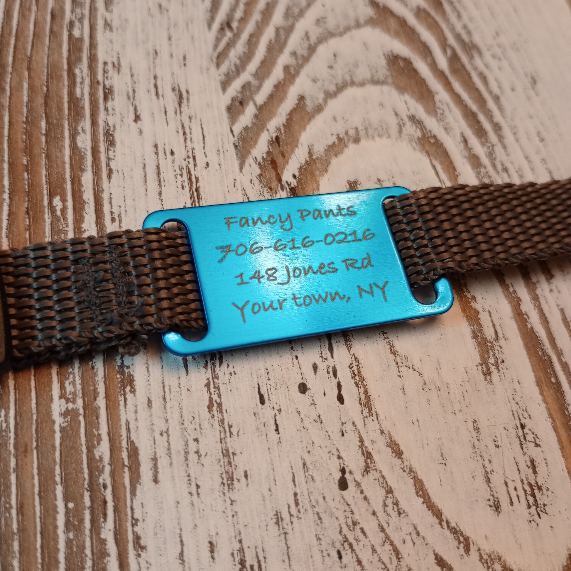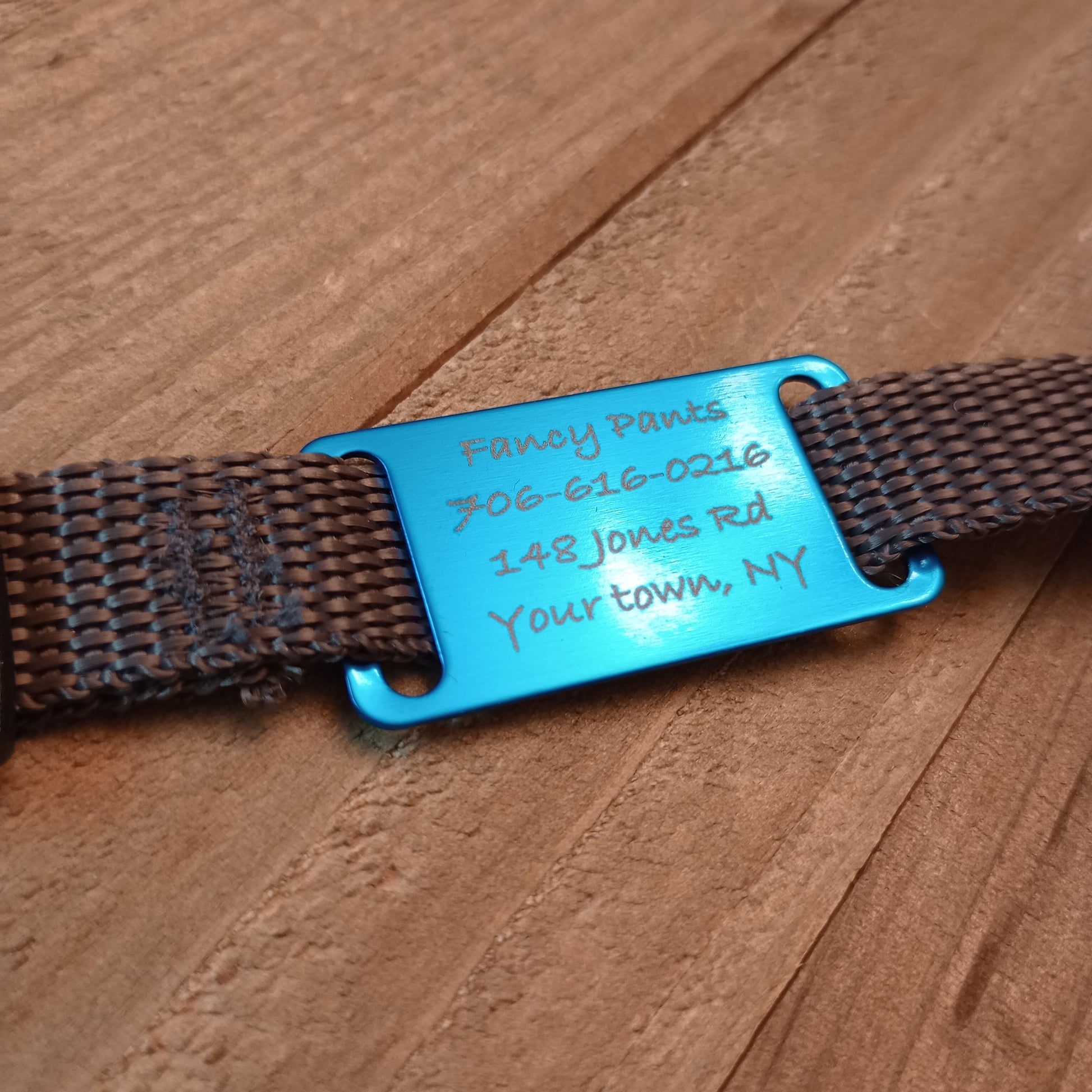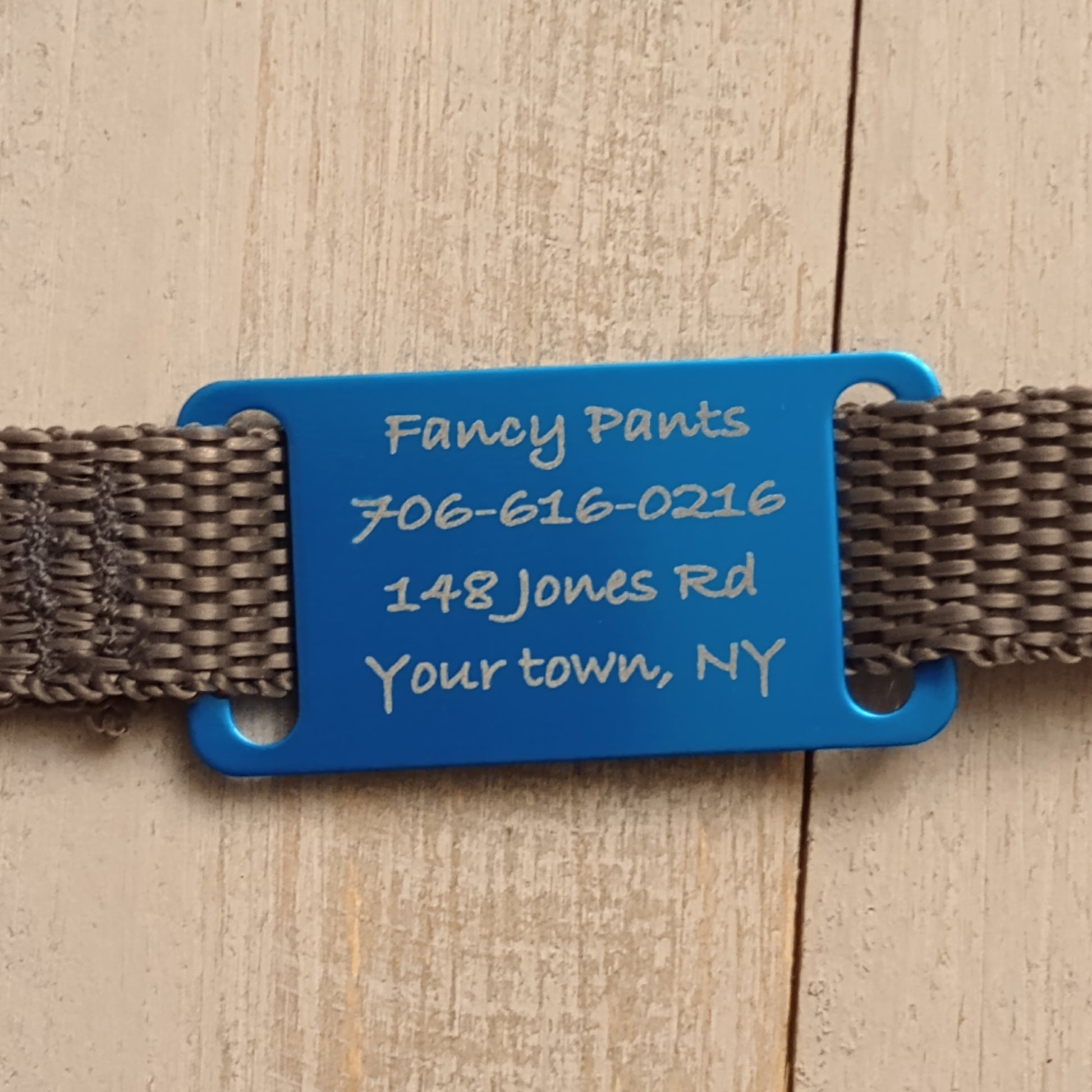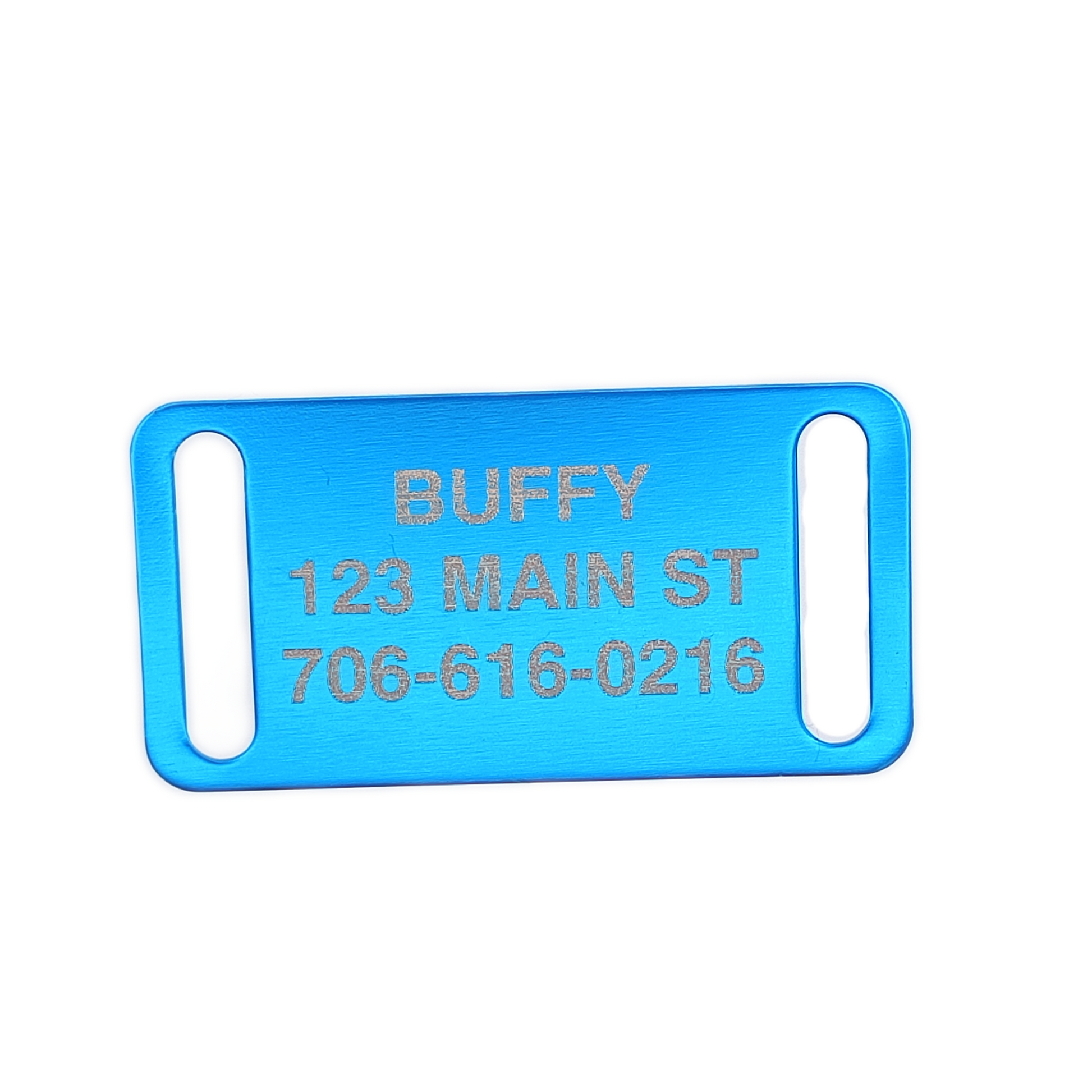 This Light Blue Slide-On Pet Tag is anodized aluminum that allows for 4 lines of text on the front. This tag will slide on a collar that is 3/4 inch wide or less.