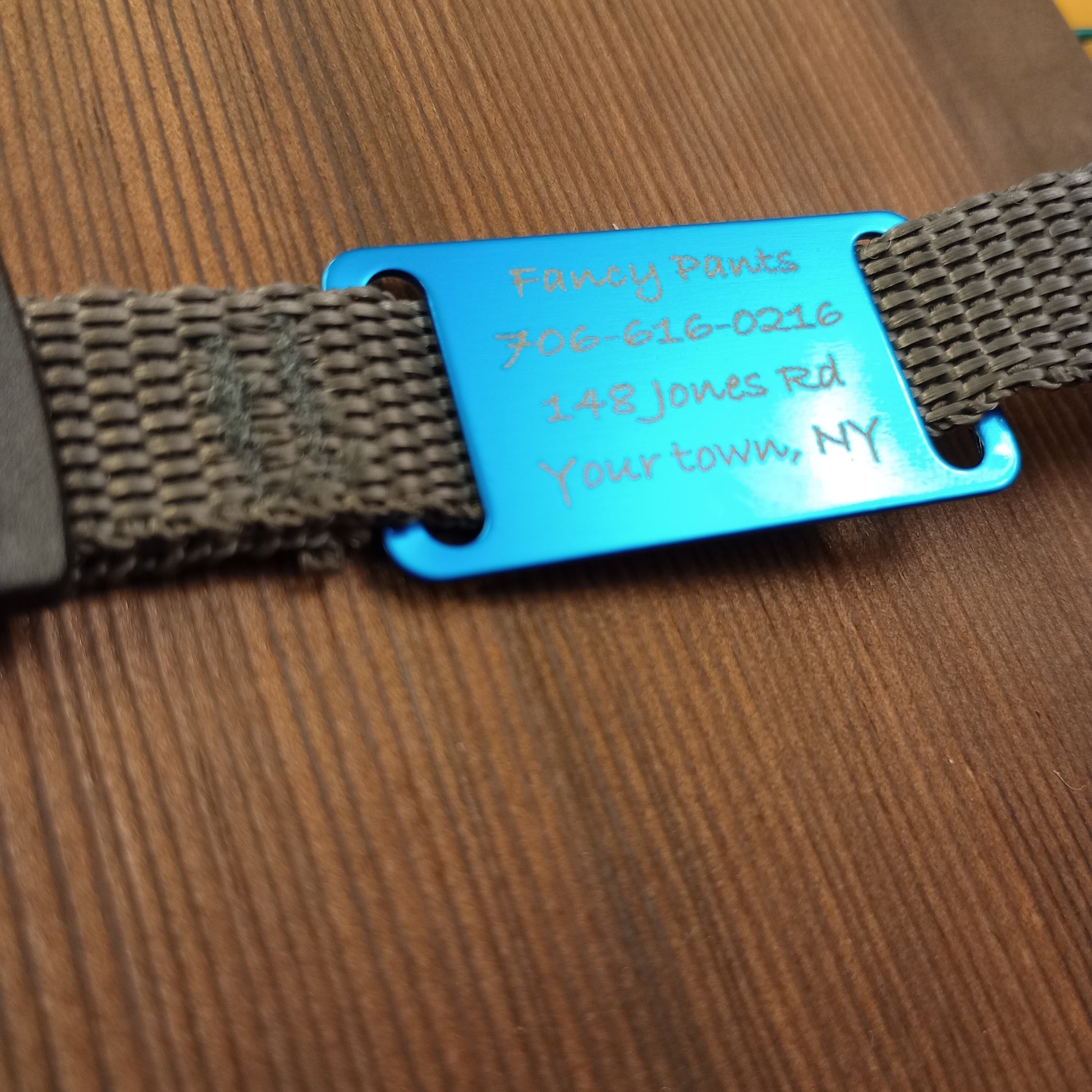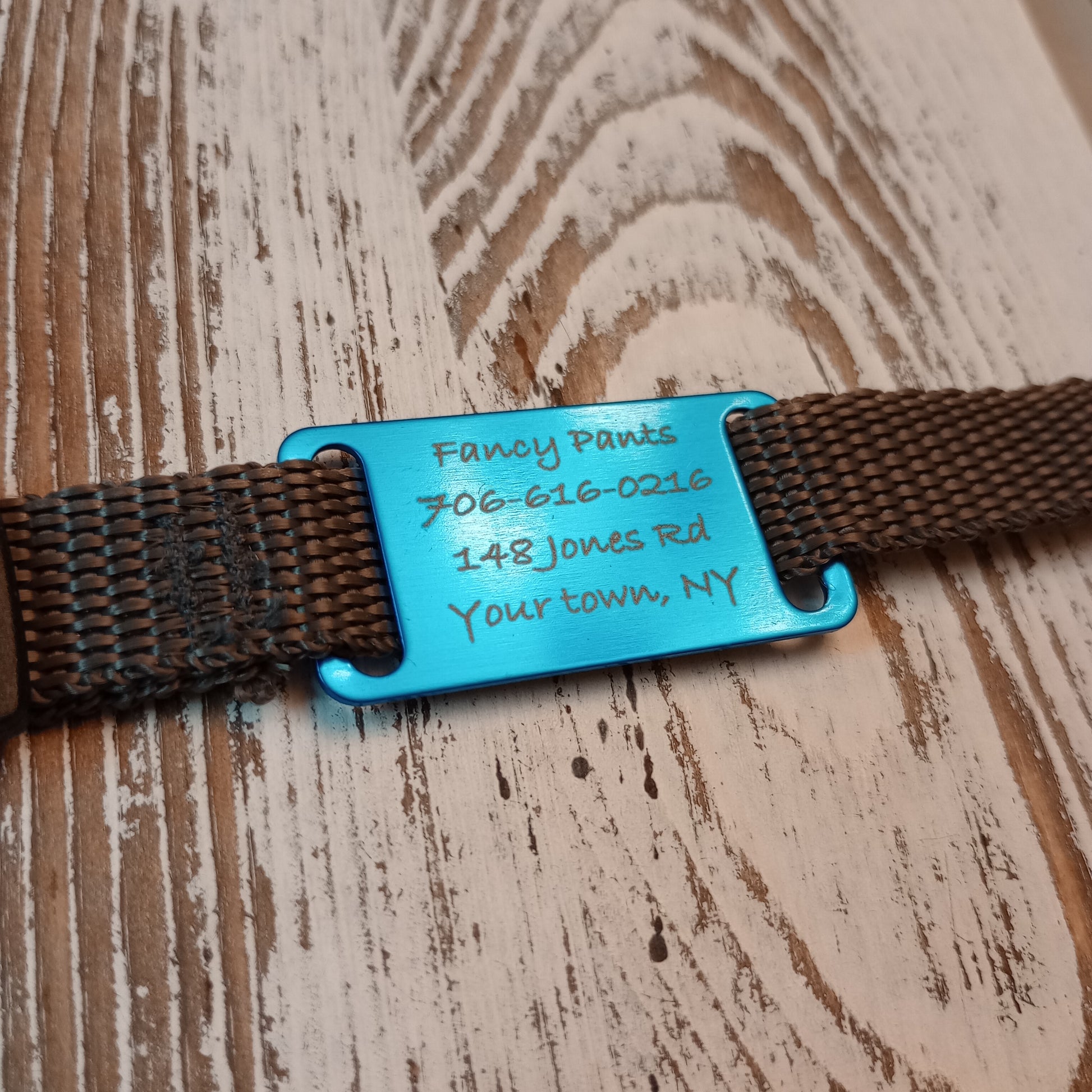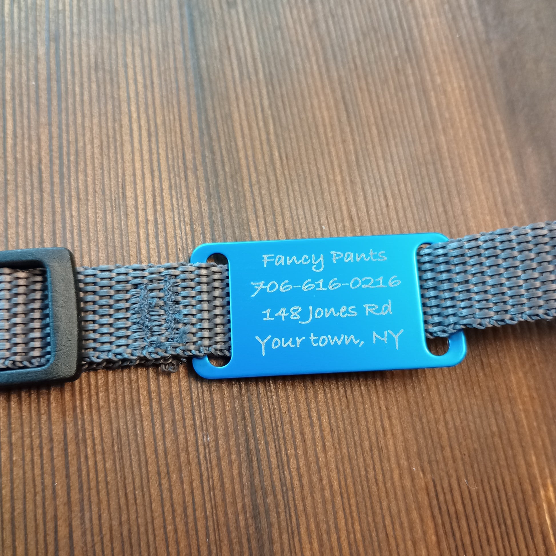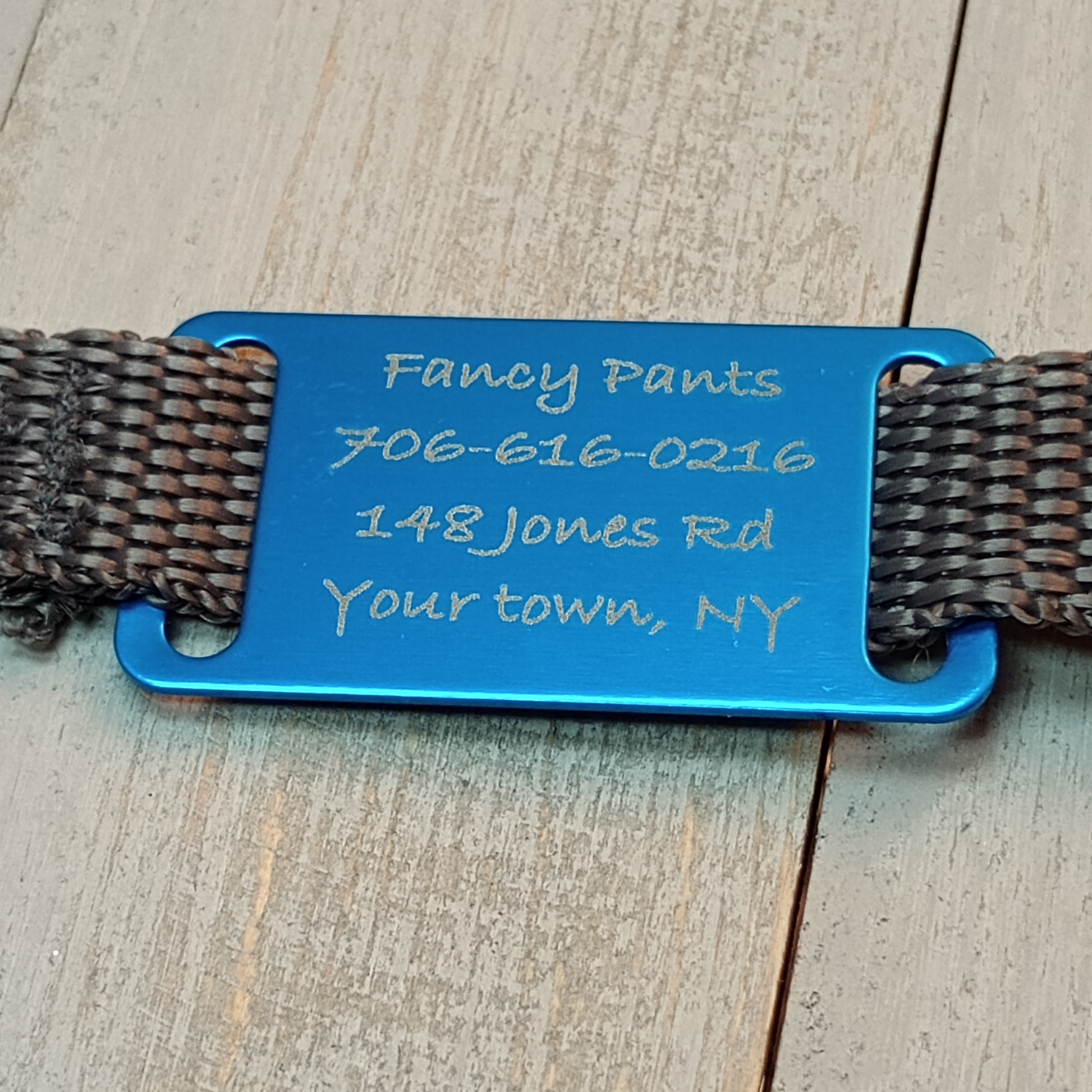 This Light Blue Slide-On Pet Tag is anodized aluminum that allows for 4 lines of text on the front. This tag will slide on a collar that is 3/4 inch wide or less.