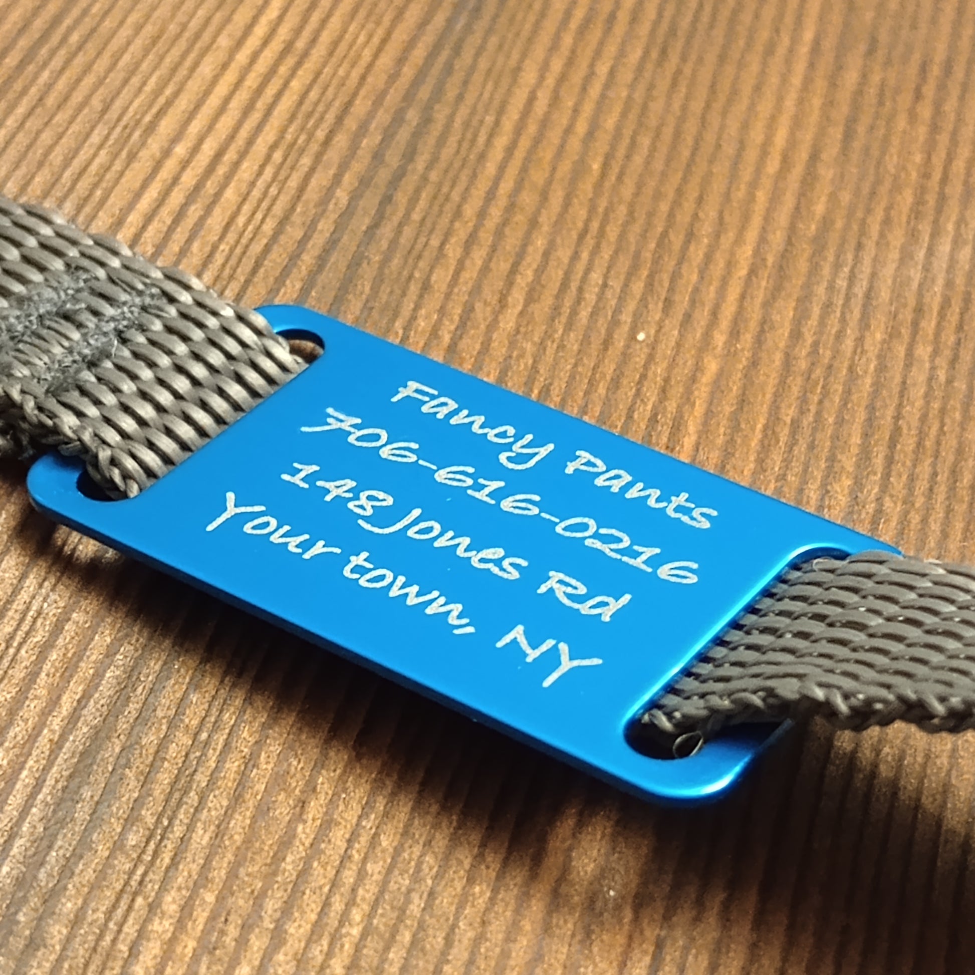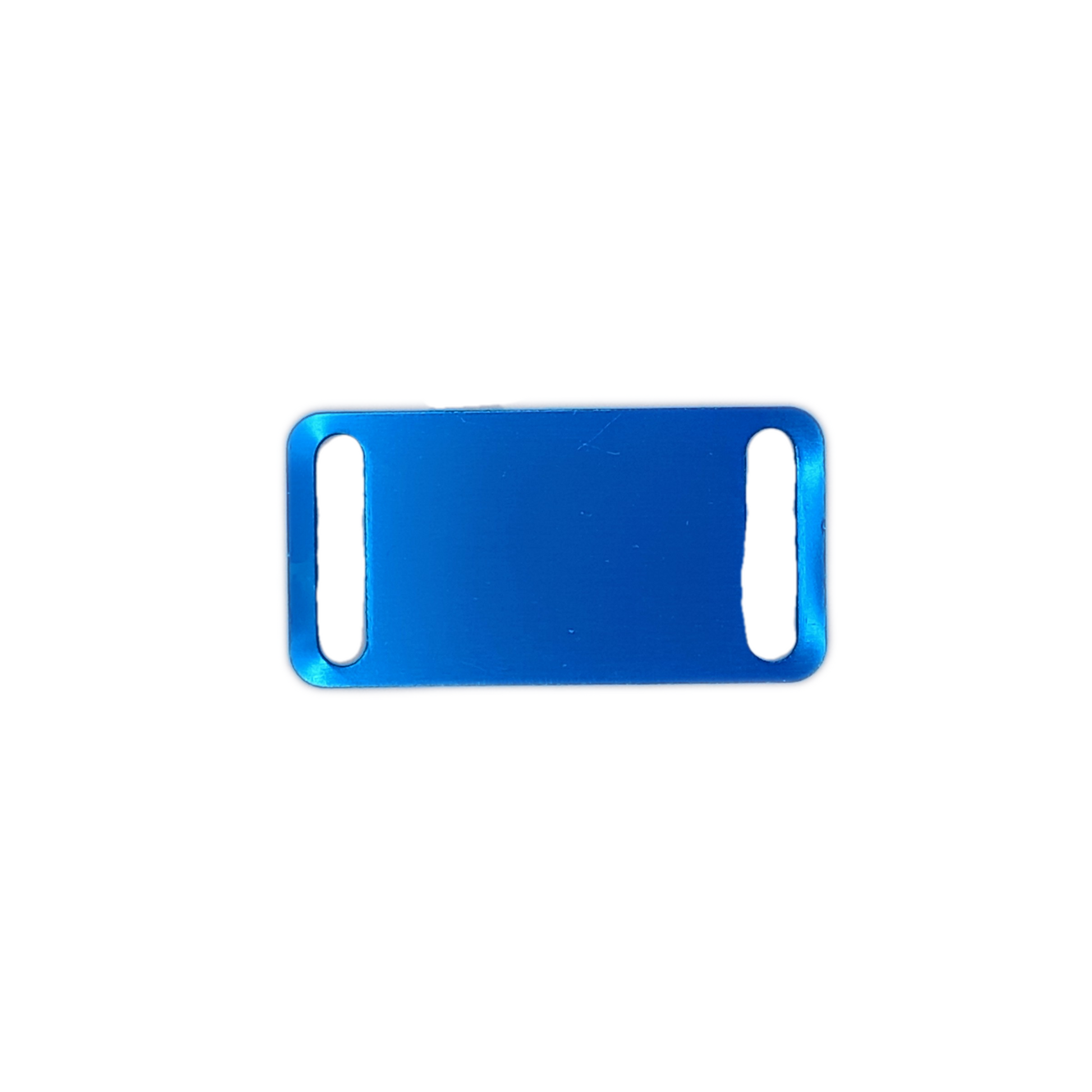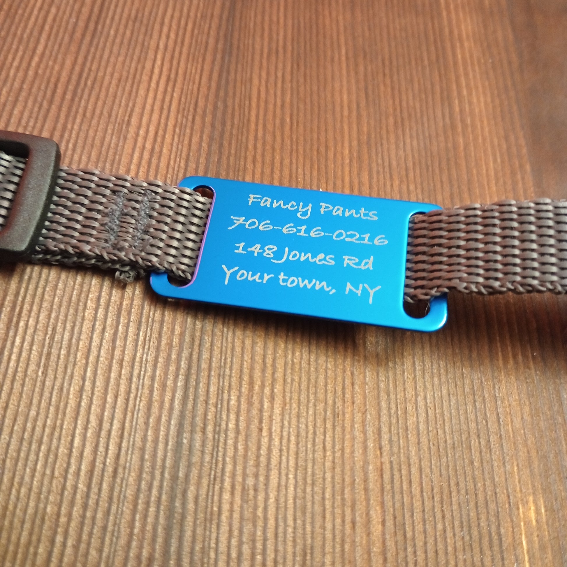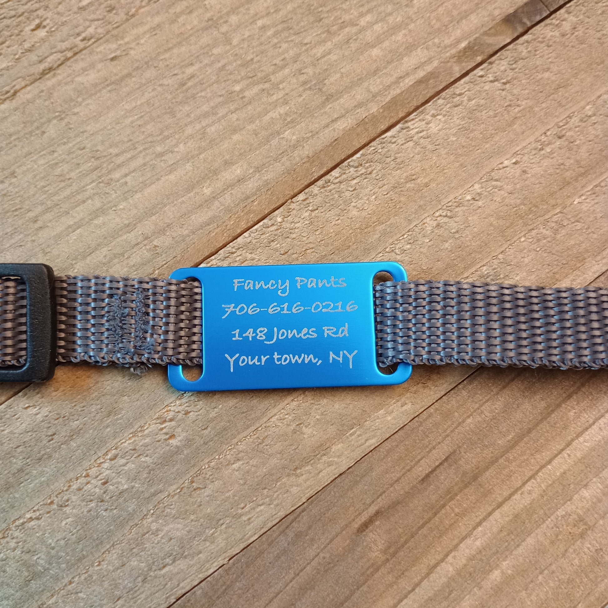This Light Blue Slide-On Pet Tag is anodized aluminum that allows for 4 lines of text on the front. This tag will slide on a collar that is 3/4 inch wide or less.
