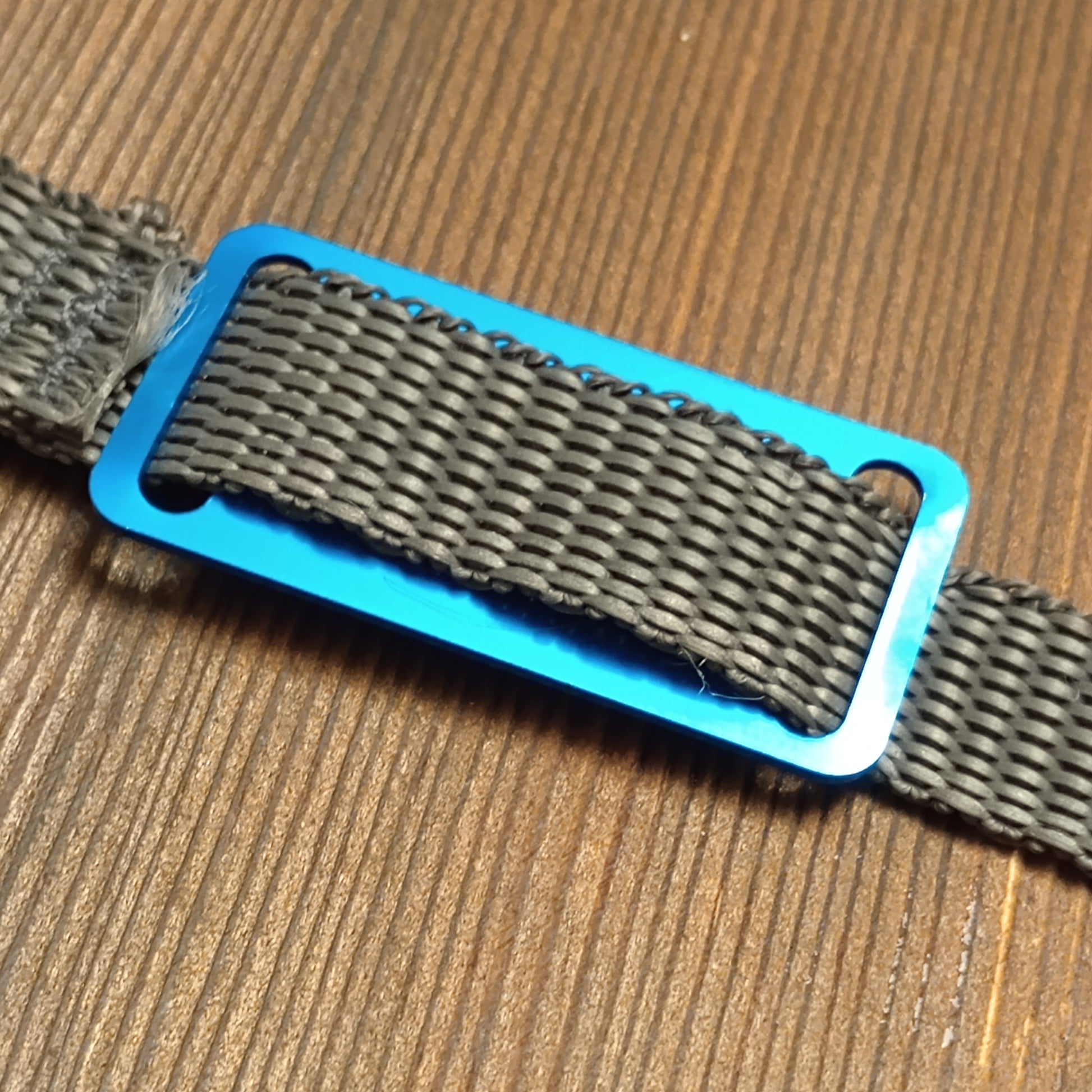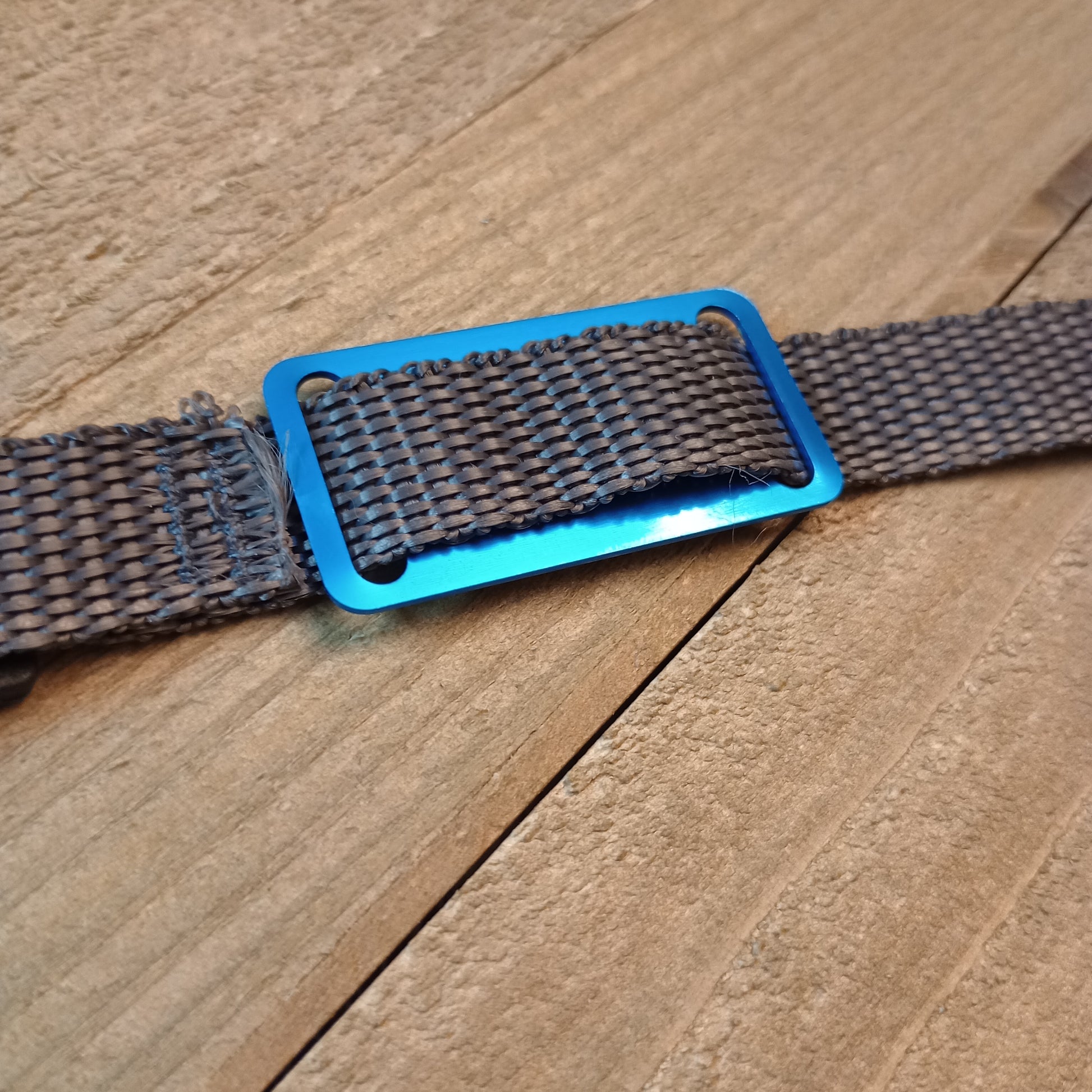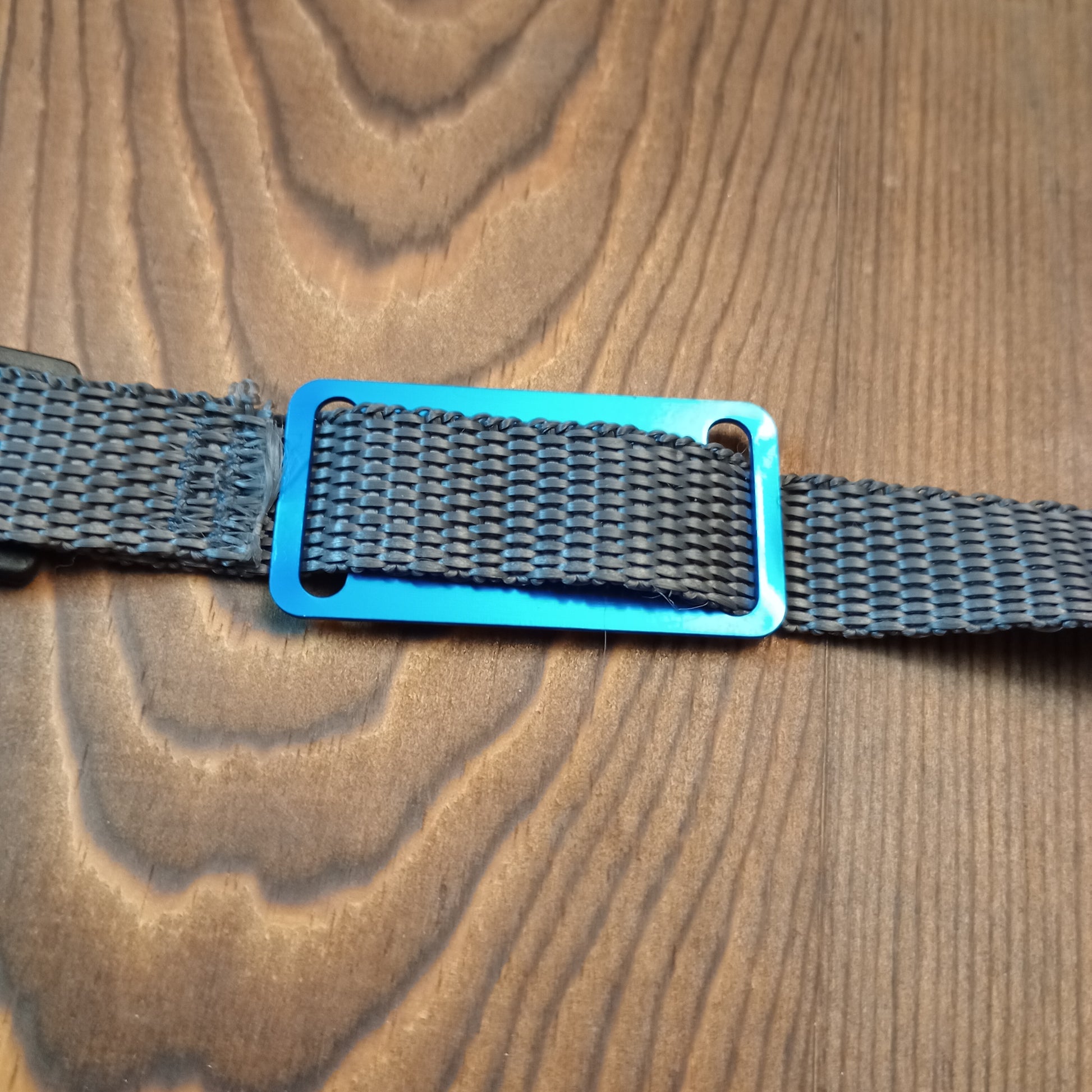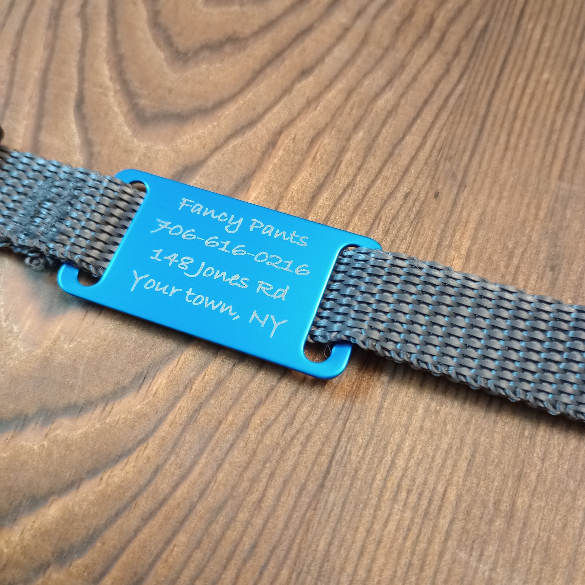 This Light Blue Slide-On Pet Tag is anodized aluminum that allows for 4 lines of text on the front. This tag will slide on a collar that is 3/4 inch wide or less.