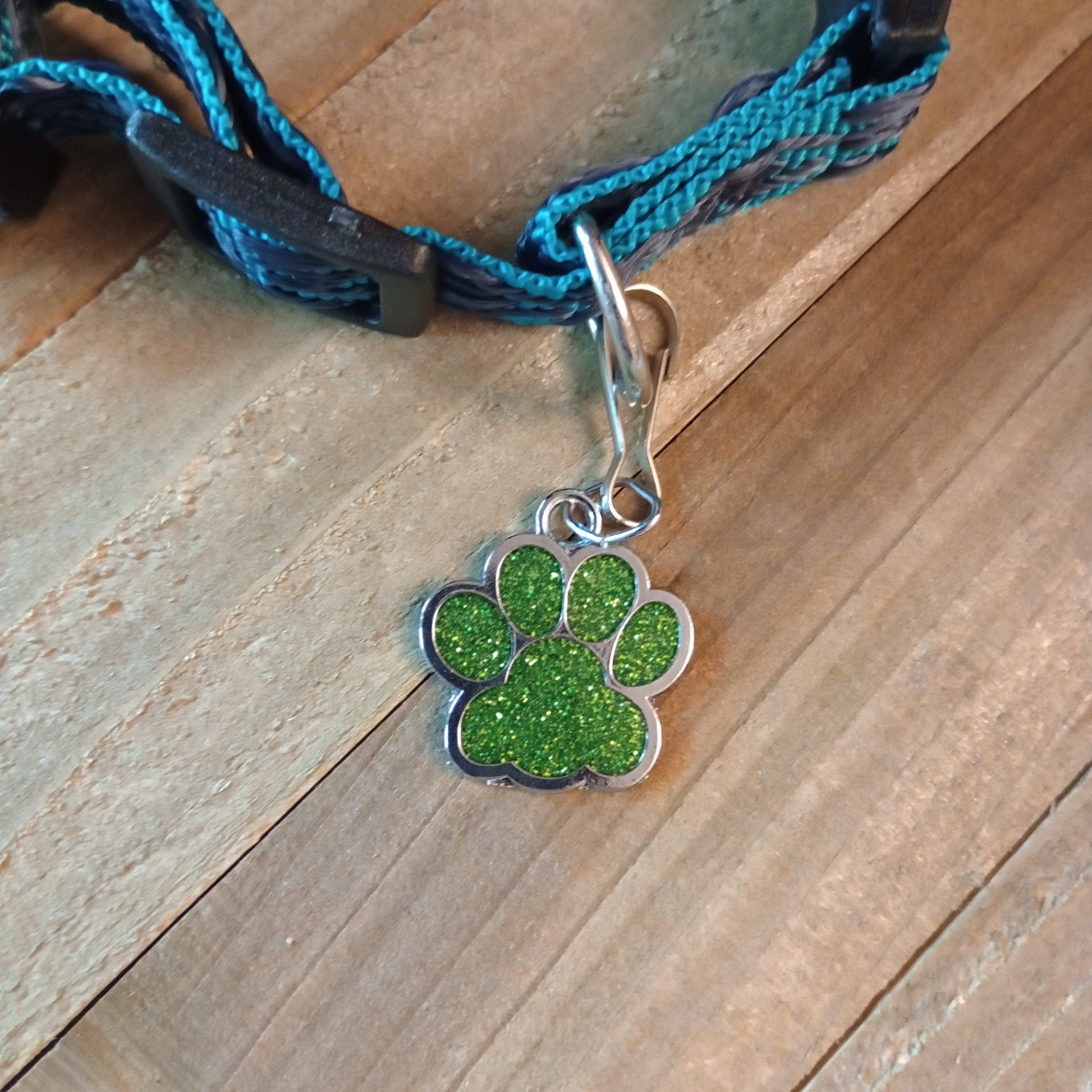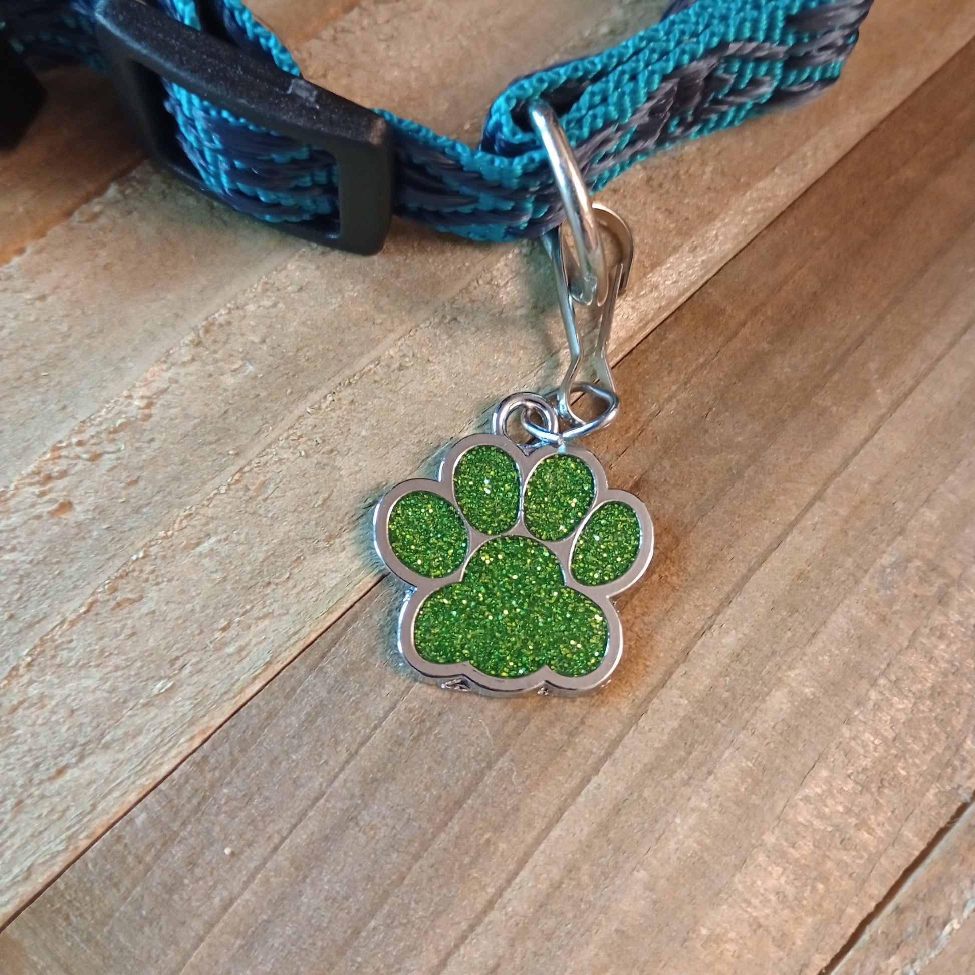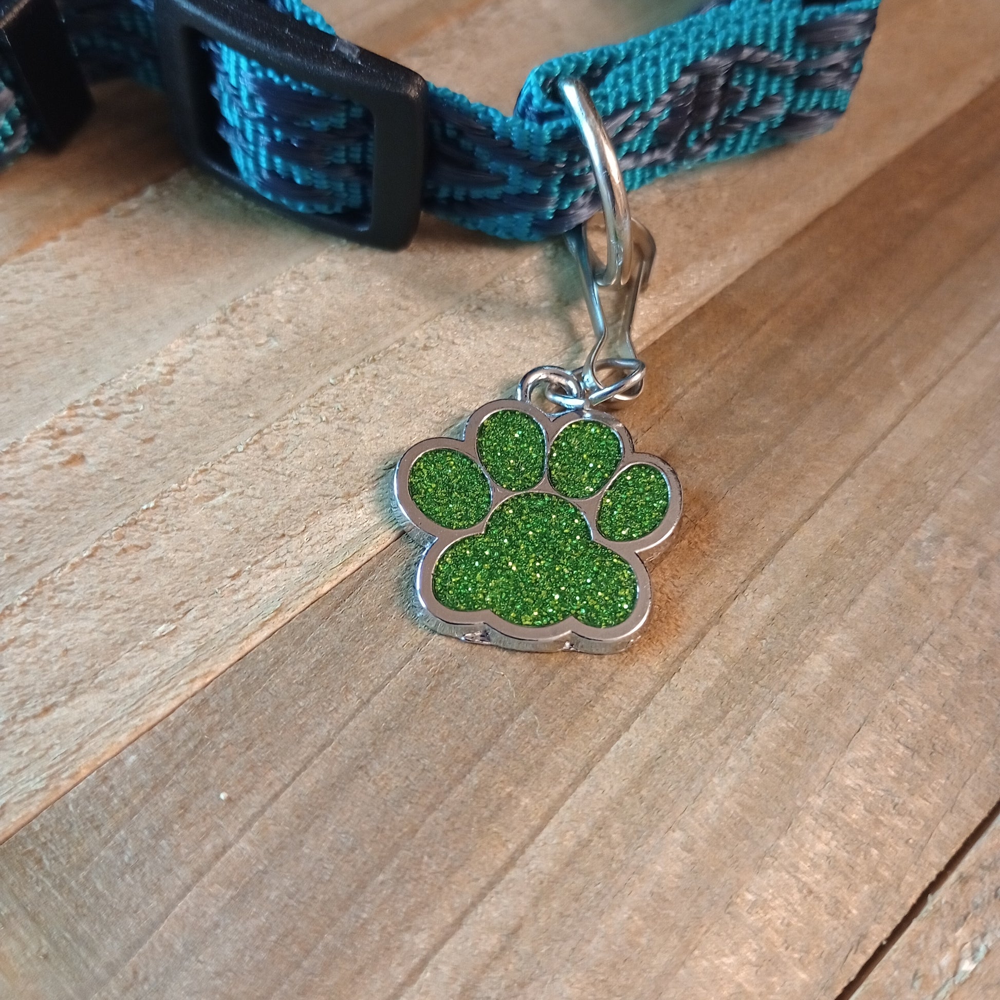 This Light Green Glitter Paw Pet Tag is metal alloy with a non-decorated silver colored back that allows for 3 lines of text on the back.