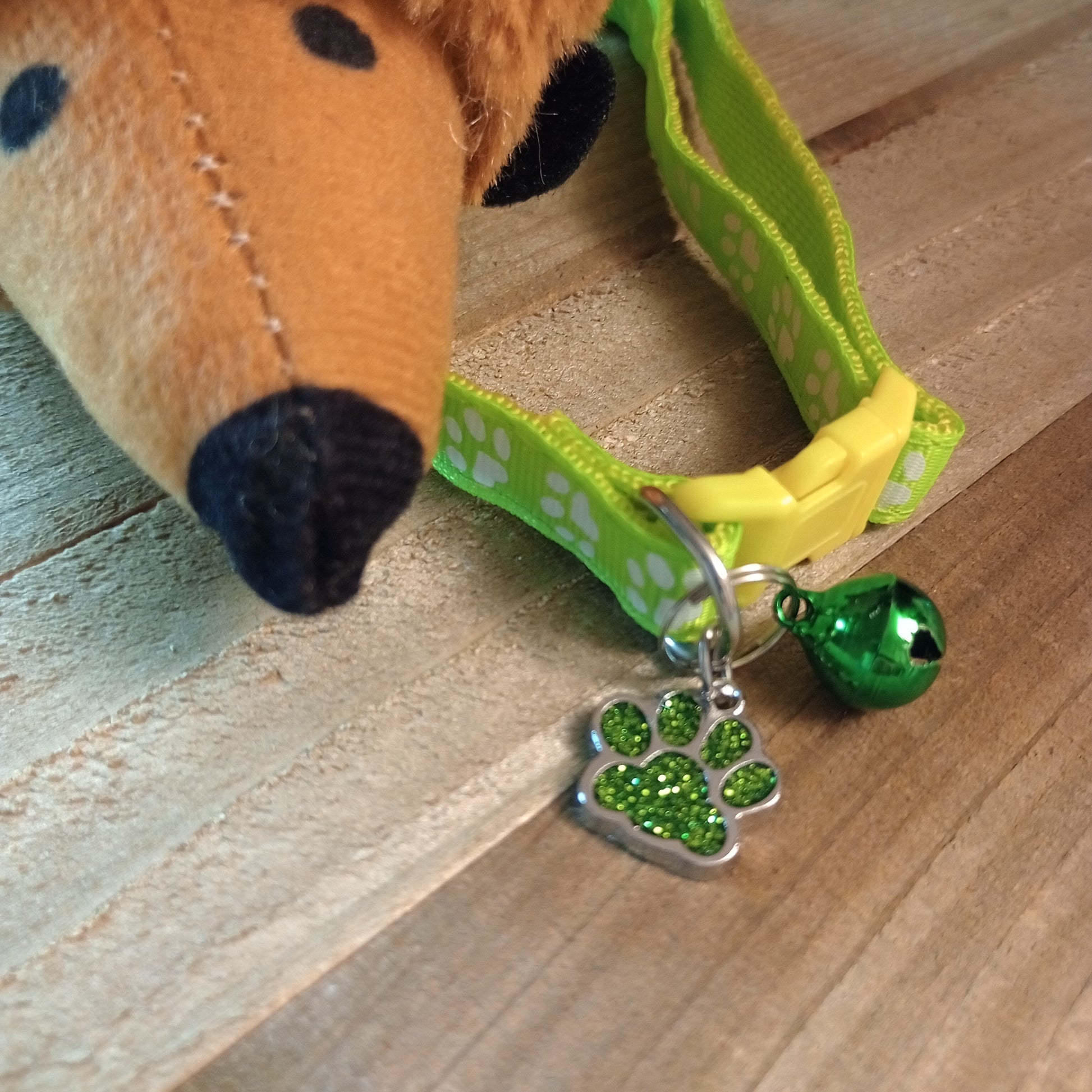 This Light Green Glitter Paw Pet Tag is 0.7 x 0.67 inches and made of metal alloy with an non-decorated silver colored back that allows for 1 line of text on the back.