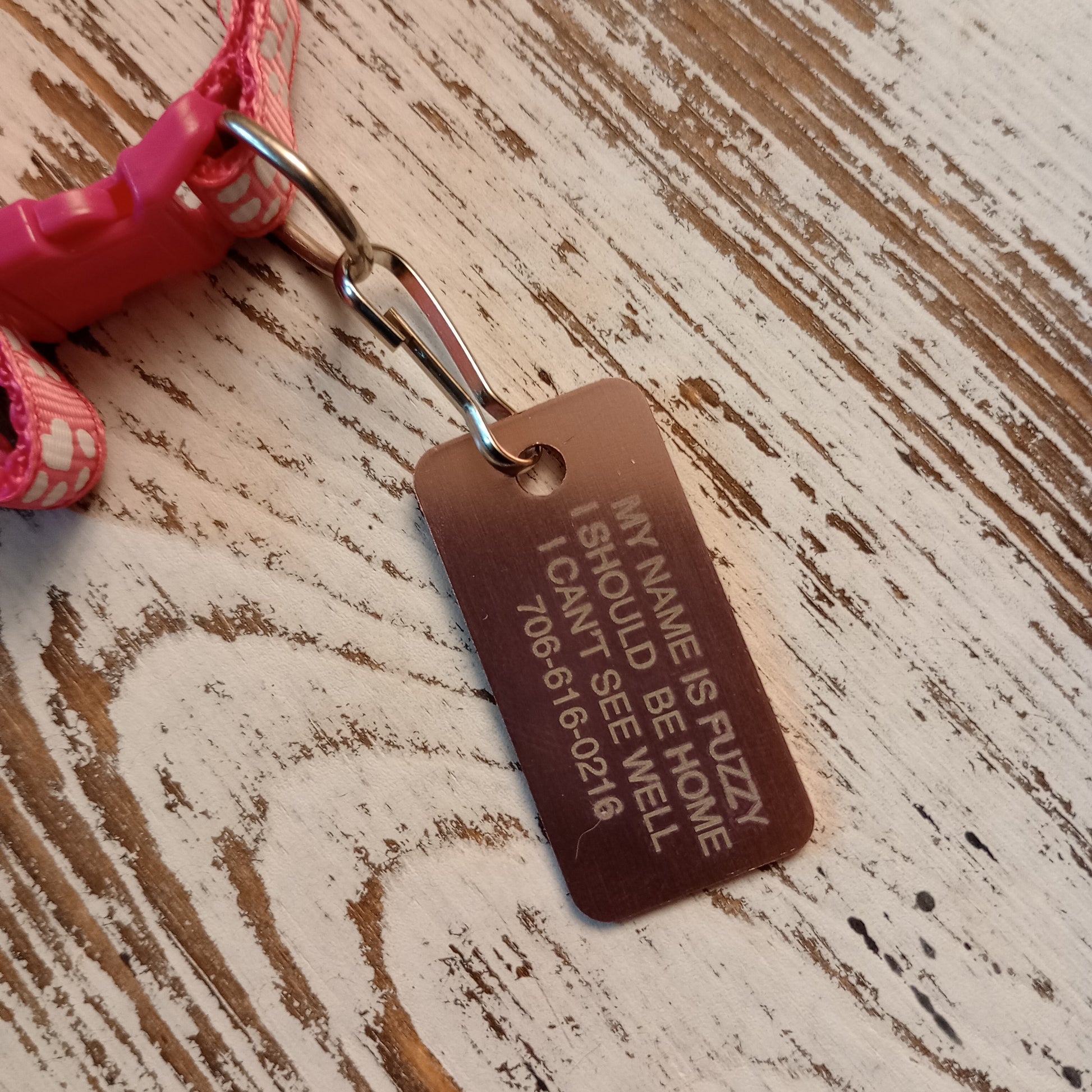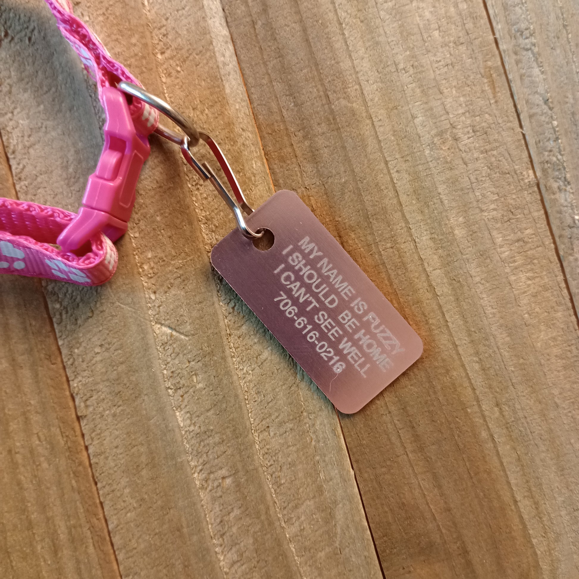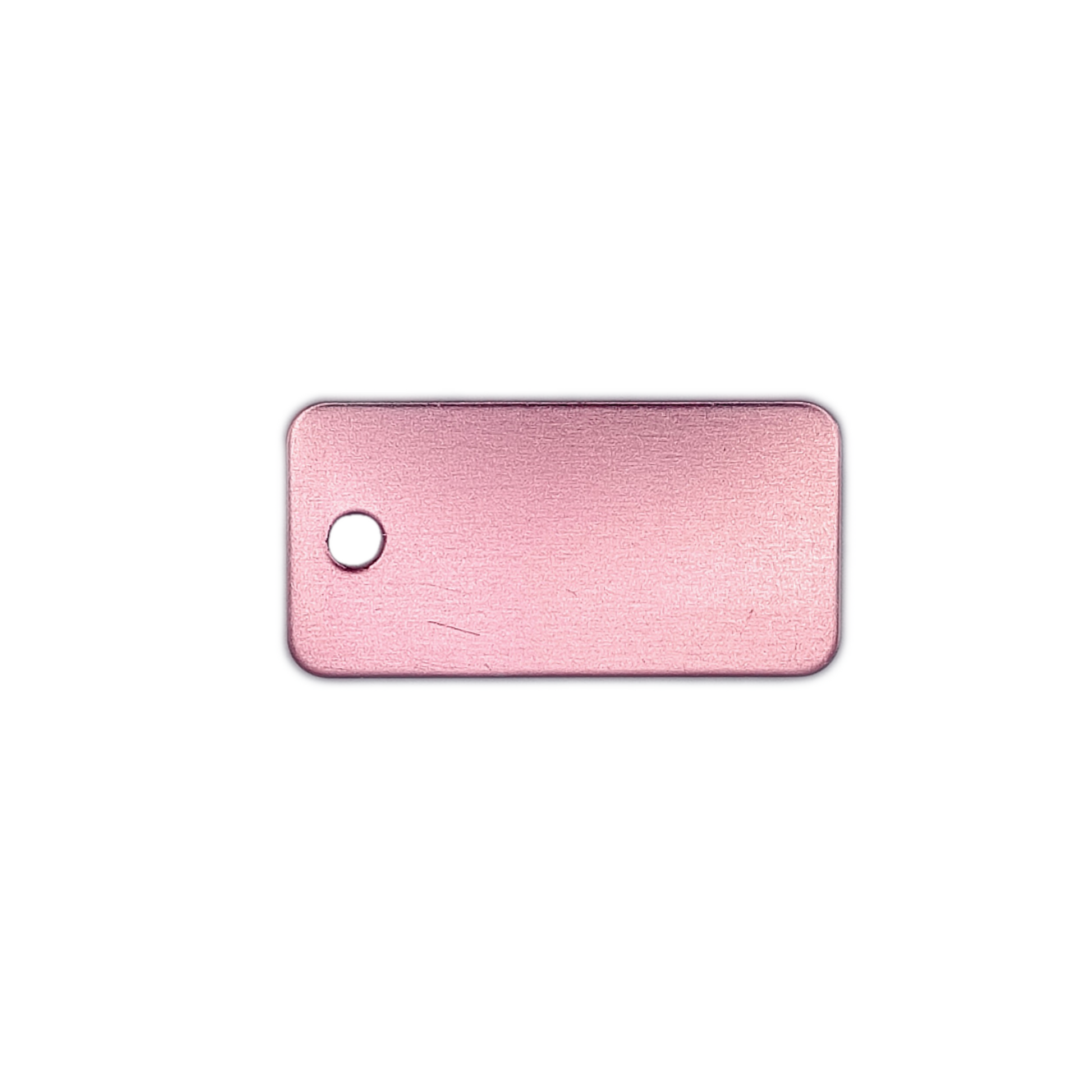 This Light Pink Rectangular Pet Tag is anodized aluminum that allows for 4 lines of text to be engraved lengthwise on the front and 4 lines of text to be engraved lengthwise on the back.