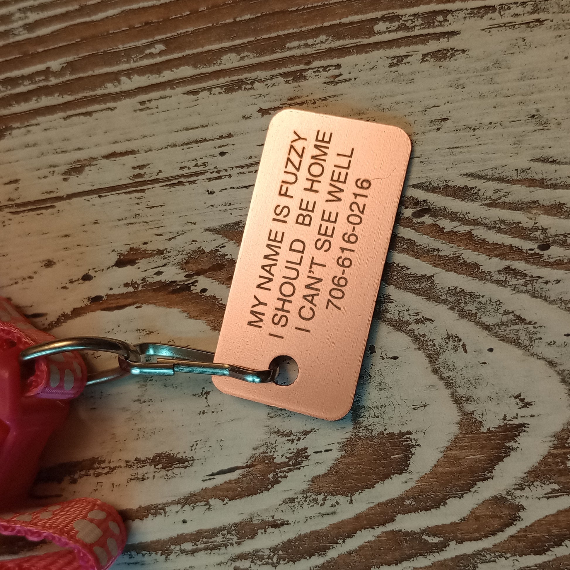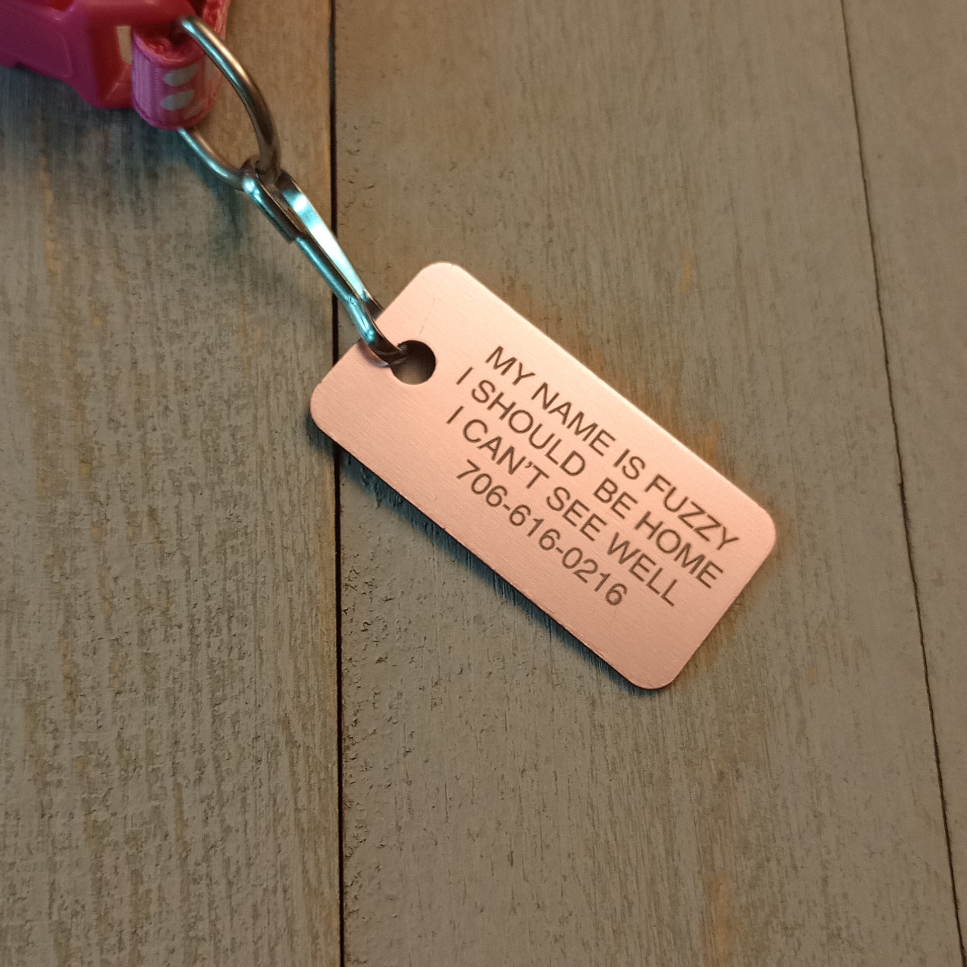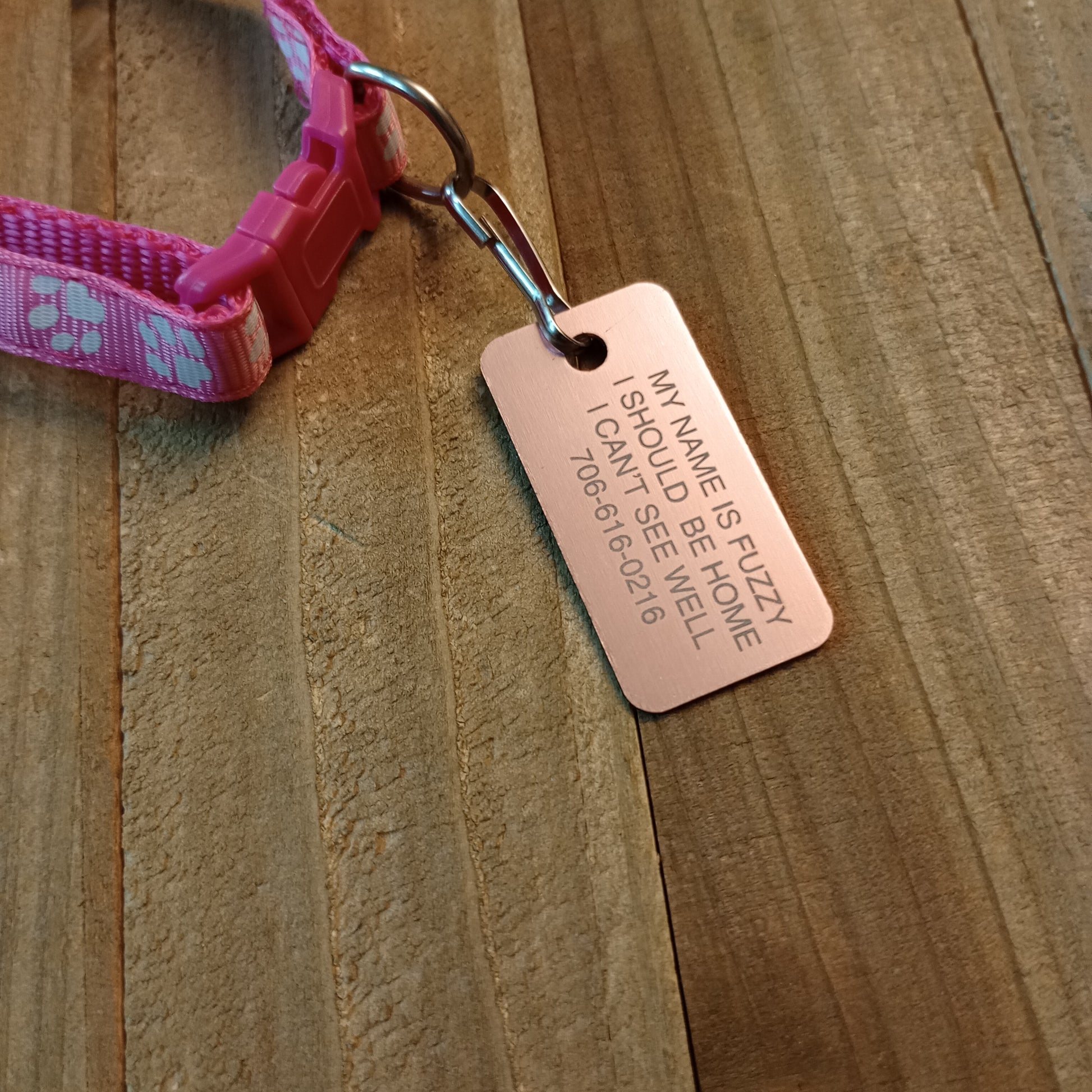This Light Pink Rectangular Pet Tag is anodized aluminum that allows for 4 lines of text to be engraved lengthwise on the front and 4 lines of text to be engraved lengthwise on the back.