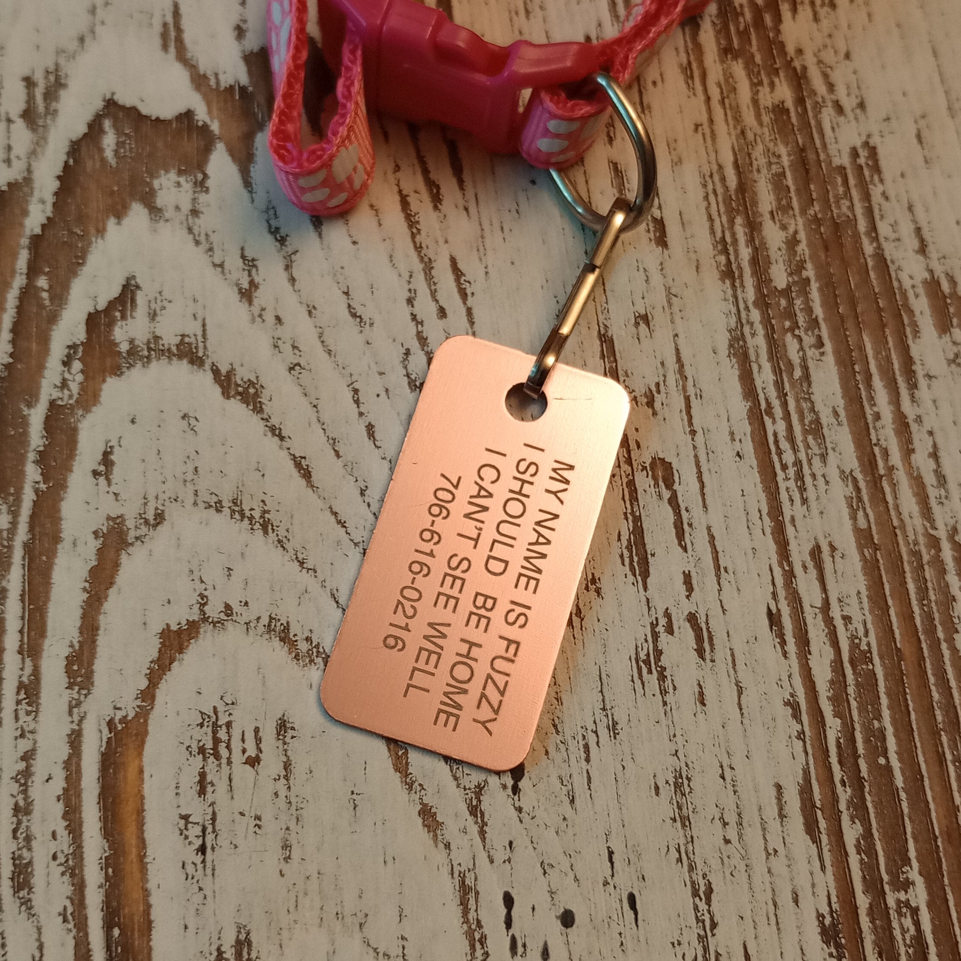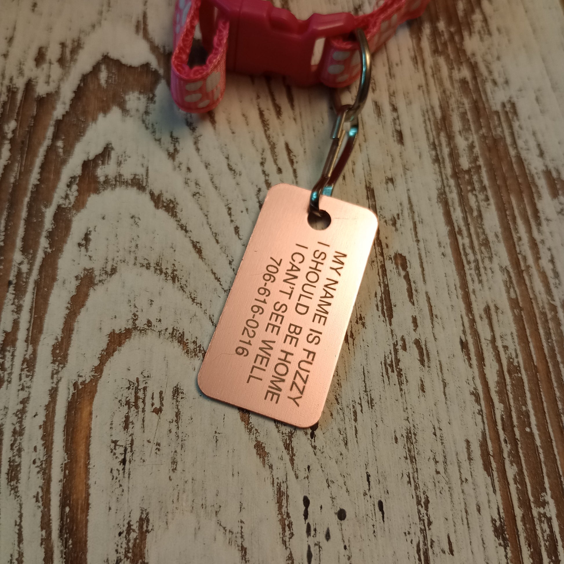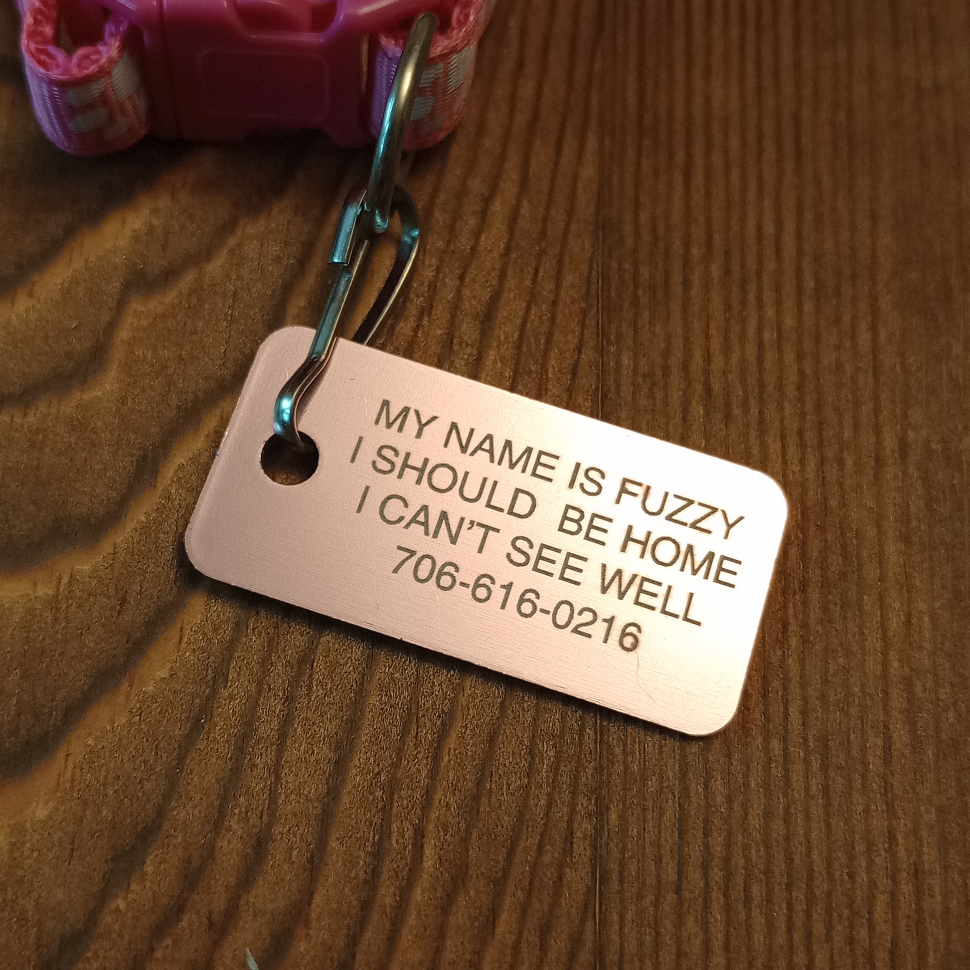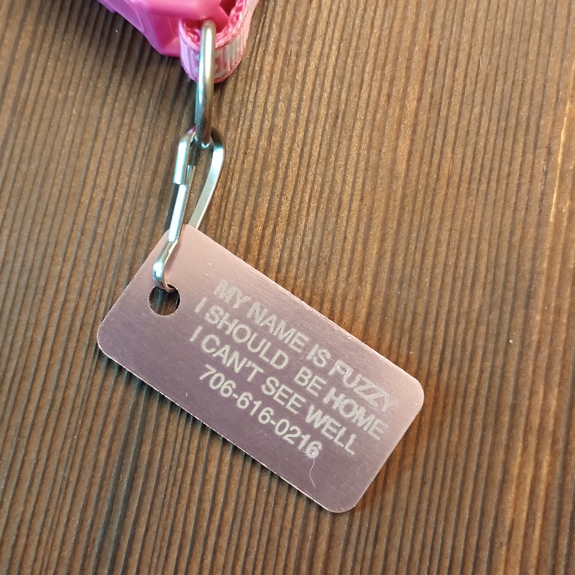 Maximum text limits: If you have more text that you would like to fit on the tag than the online store allows for the customization, reach out to us using the contact page at the top of the site. The limits are typically set so that the text can look good based on the engravable area for the pet tag. In most cases, we can add a lot more text, but the size of the text will have to decrease due to the engravable space.