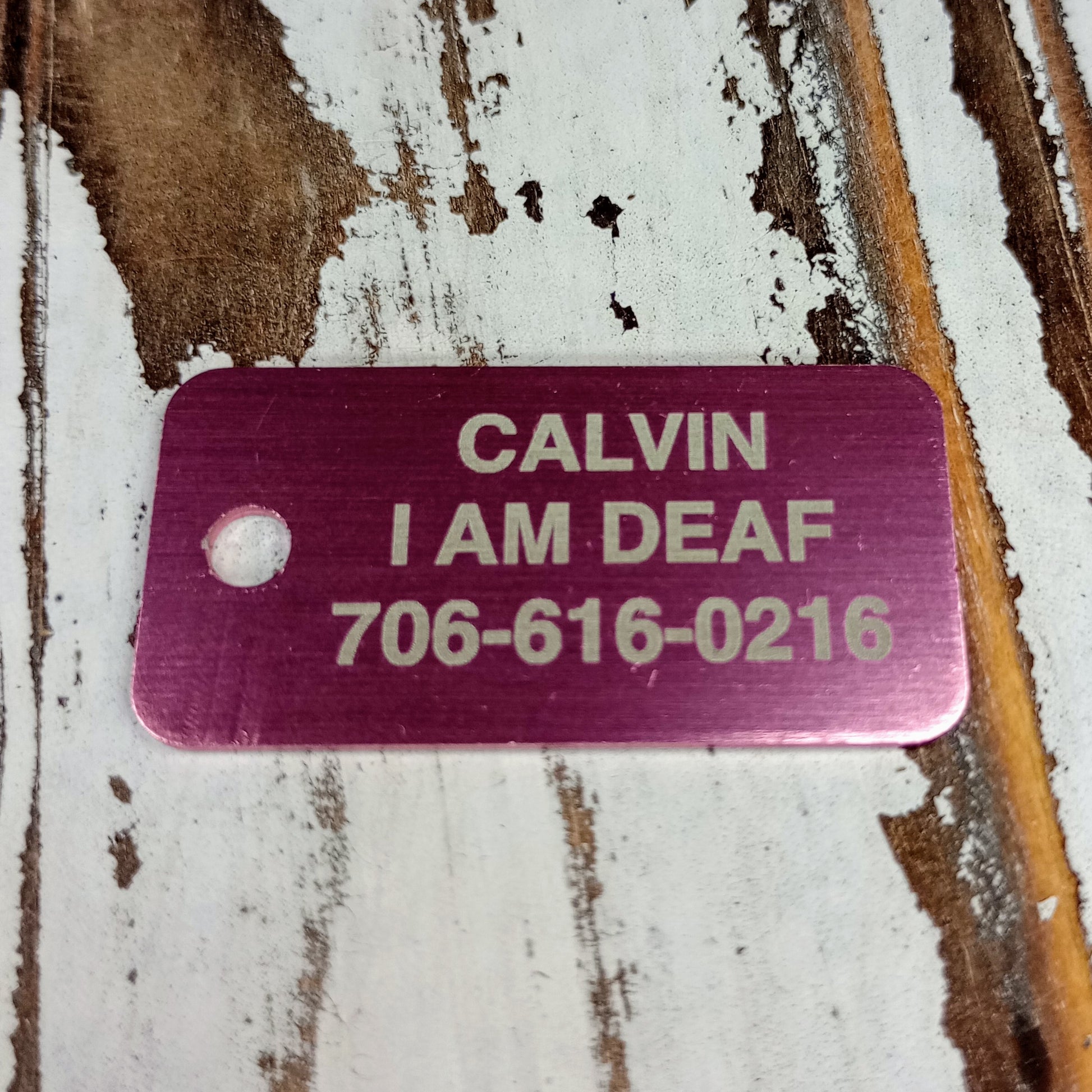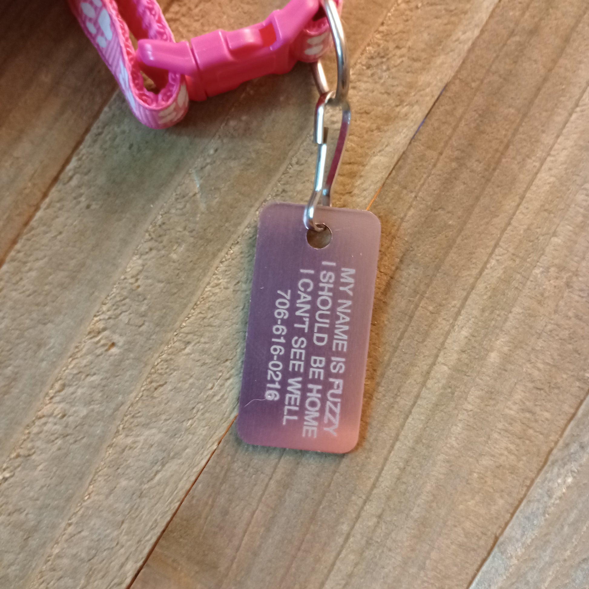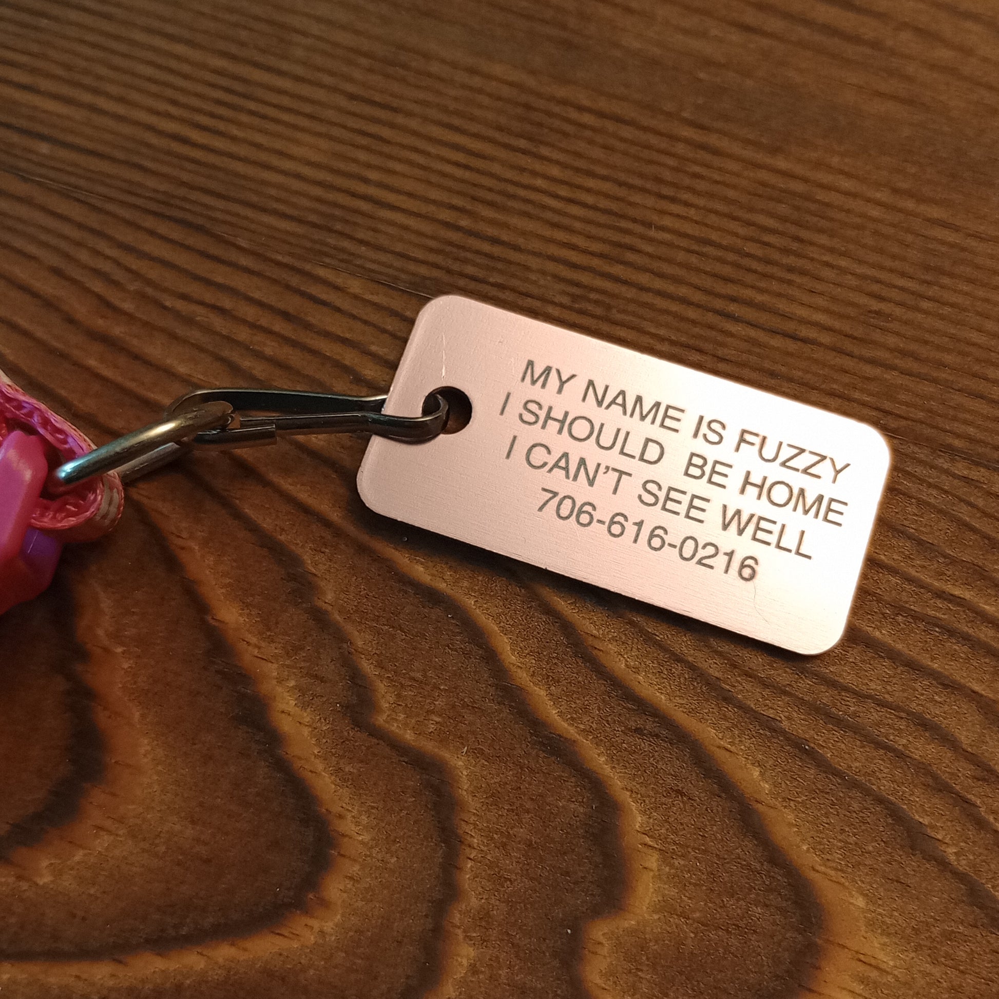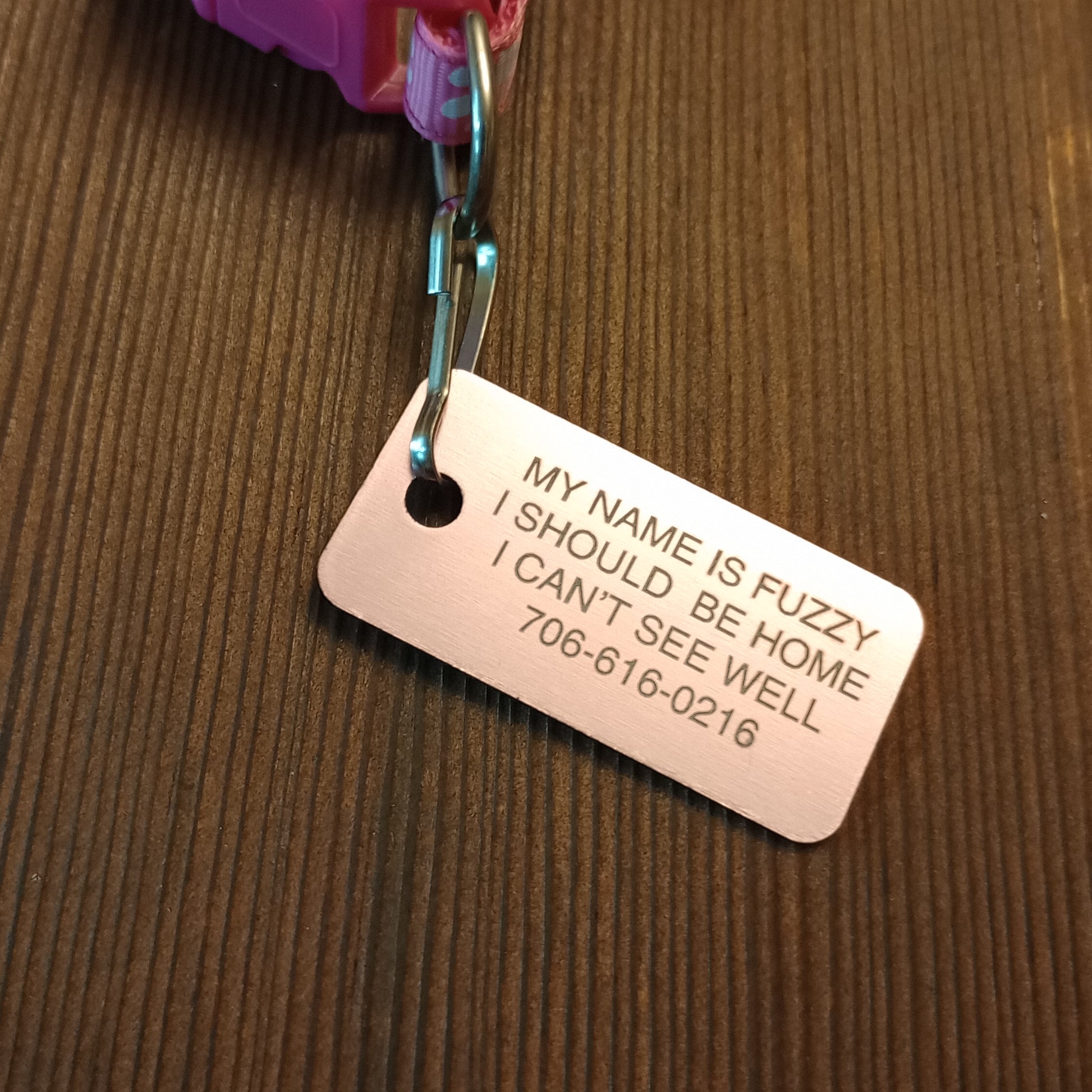 Making the name larger font size: If the tag allows for four lines and you use only three we will use the space from that extra line to make the name of the pet larger than the other lines of text.