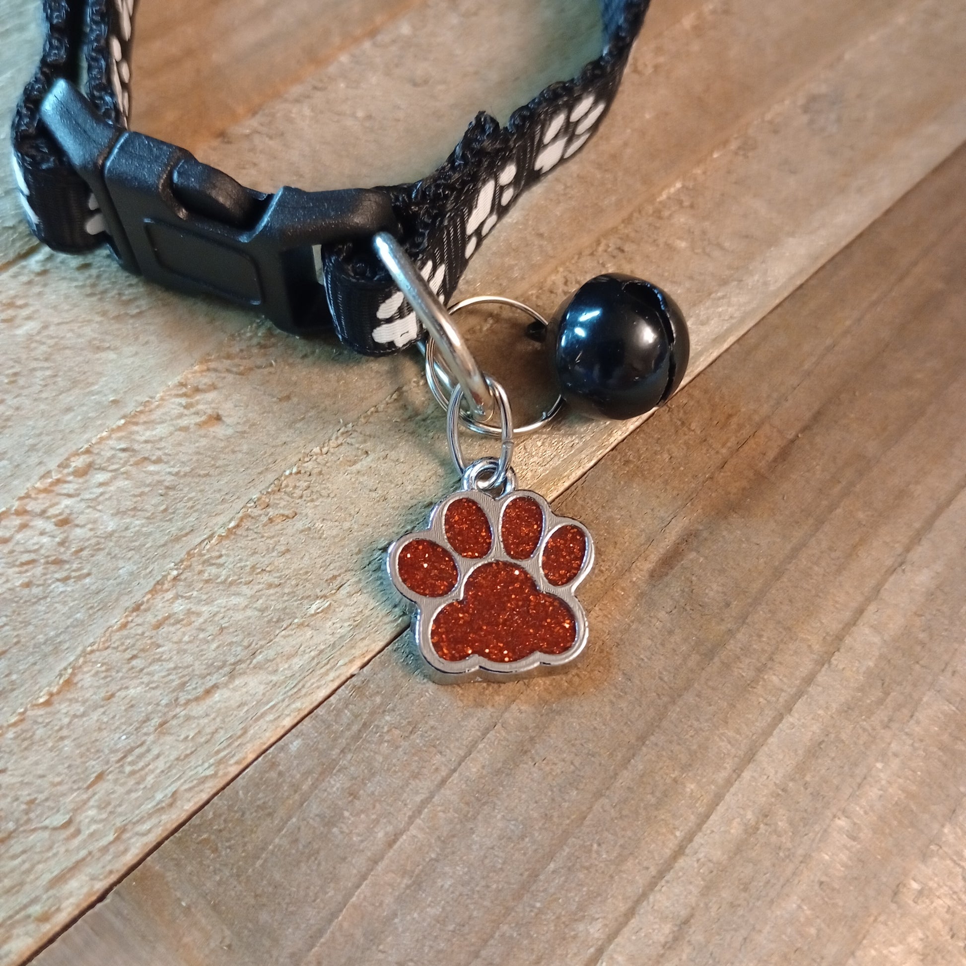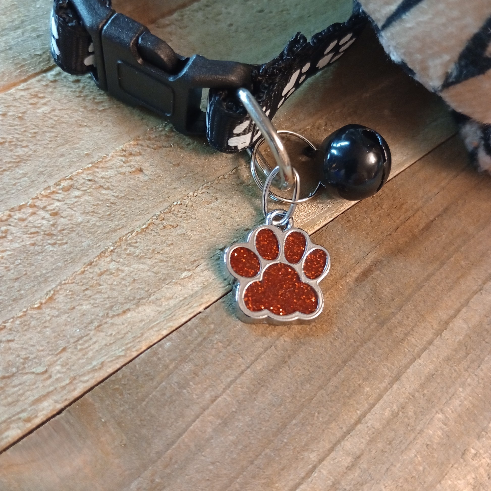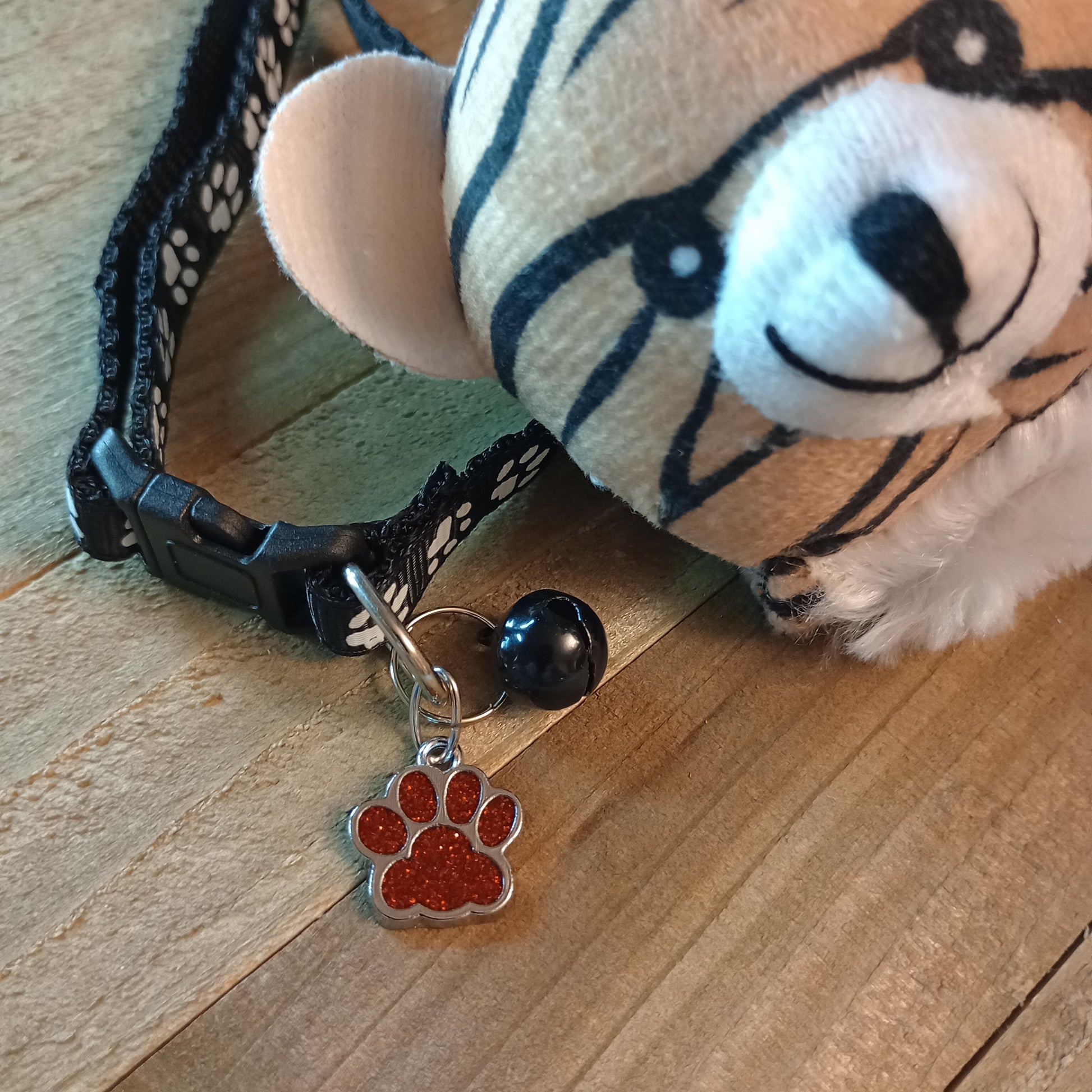 This Red Glitter Paw Pet Tag is 0.7 x 0.67 inches and made of metal alloy with an non-decorated silver colored back that allows for 1 line of text on the back.