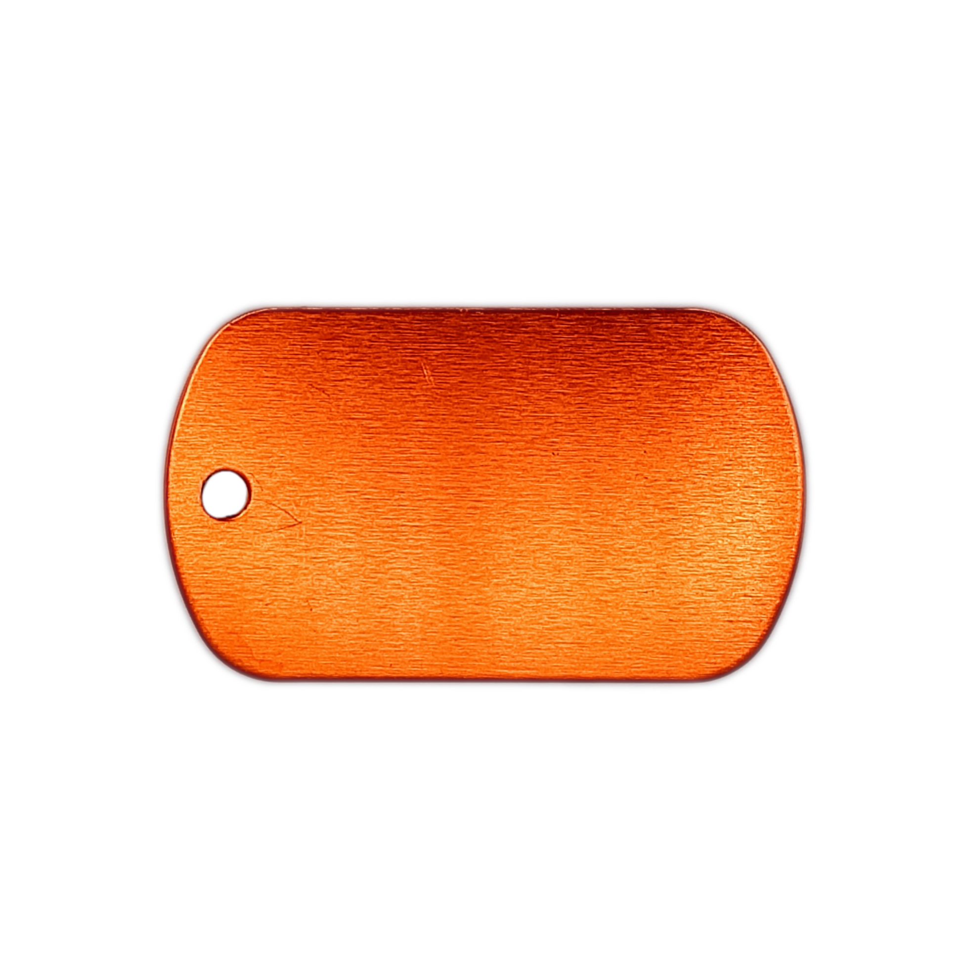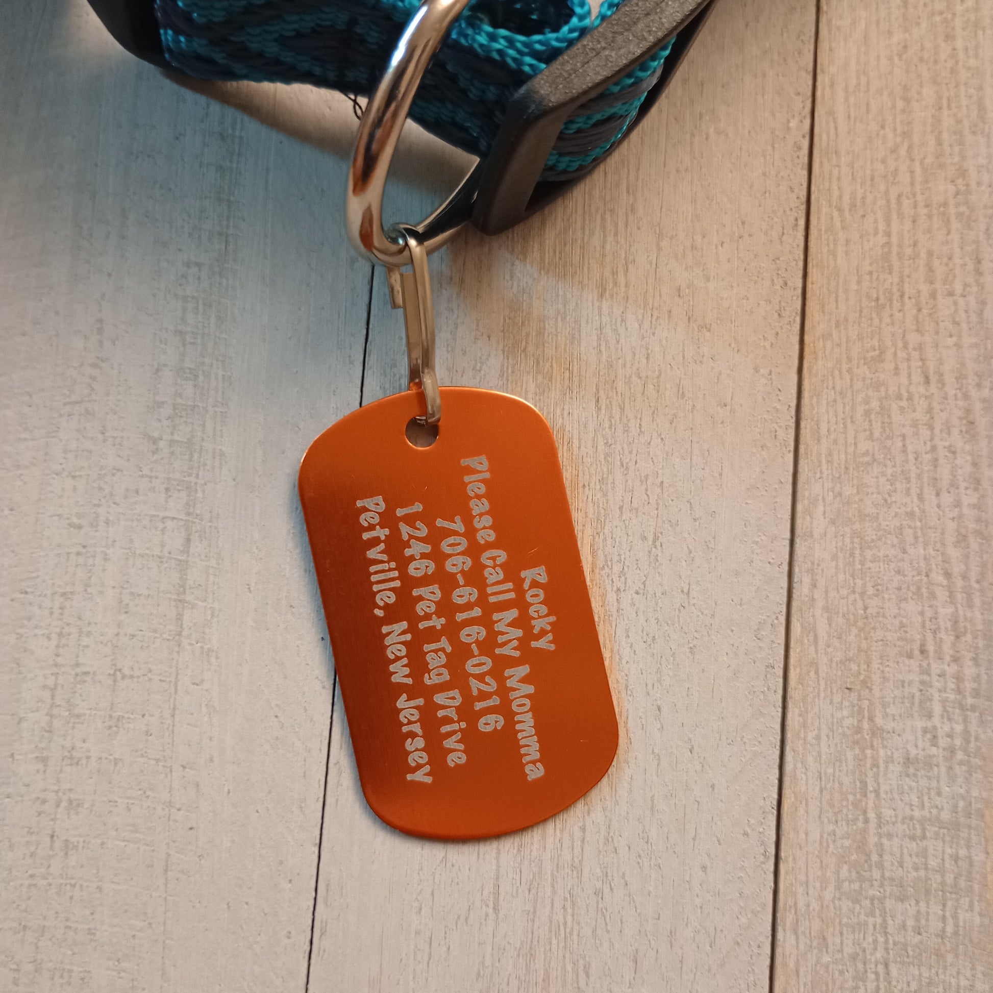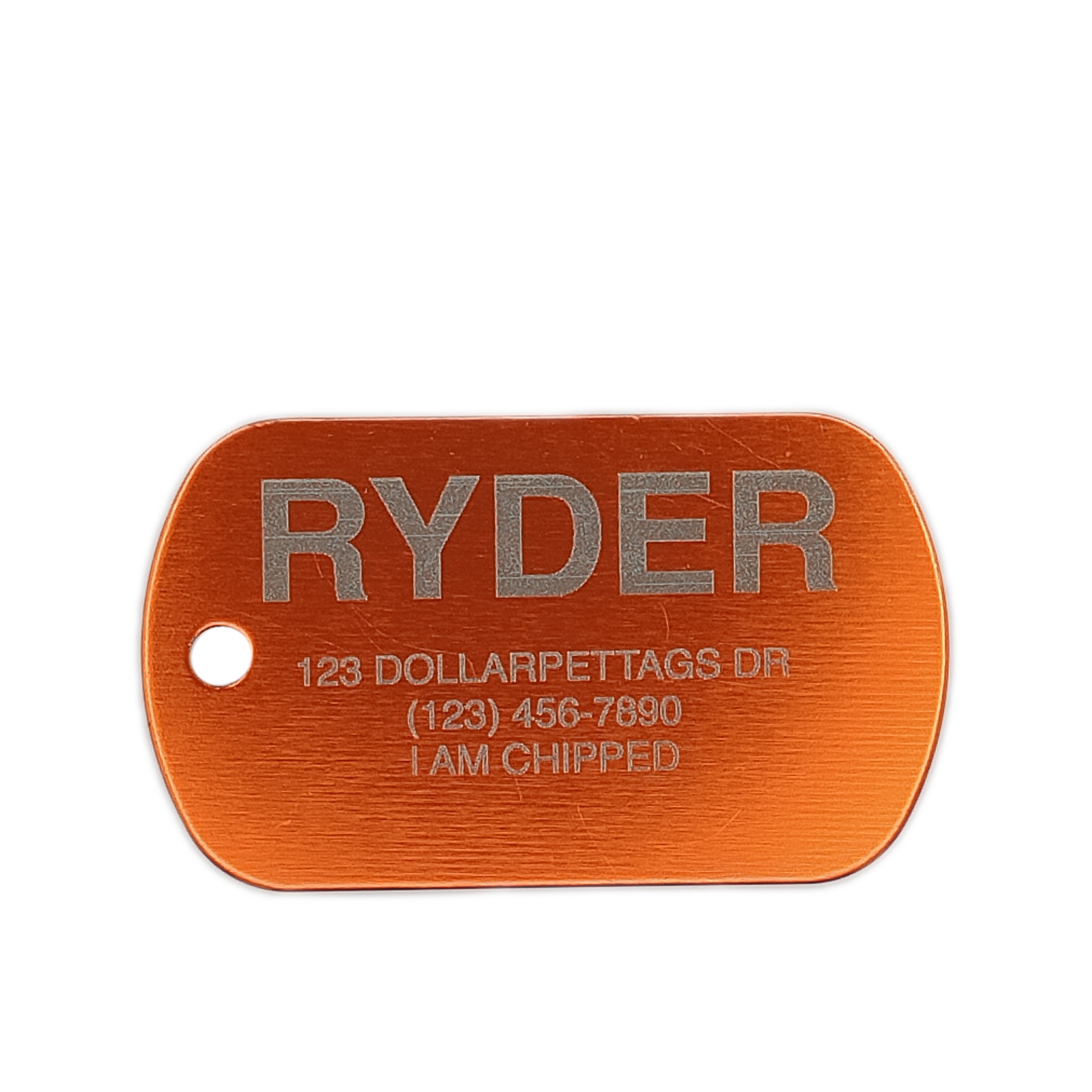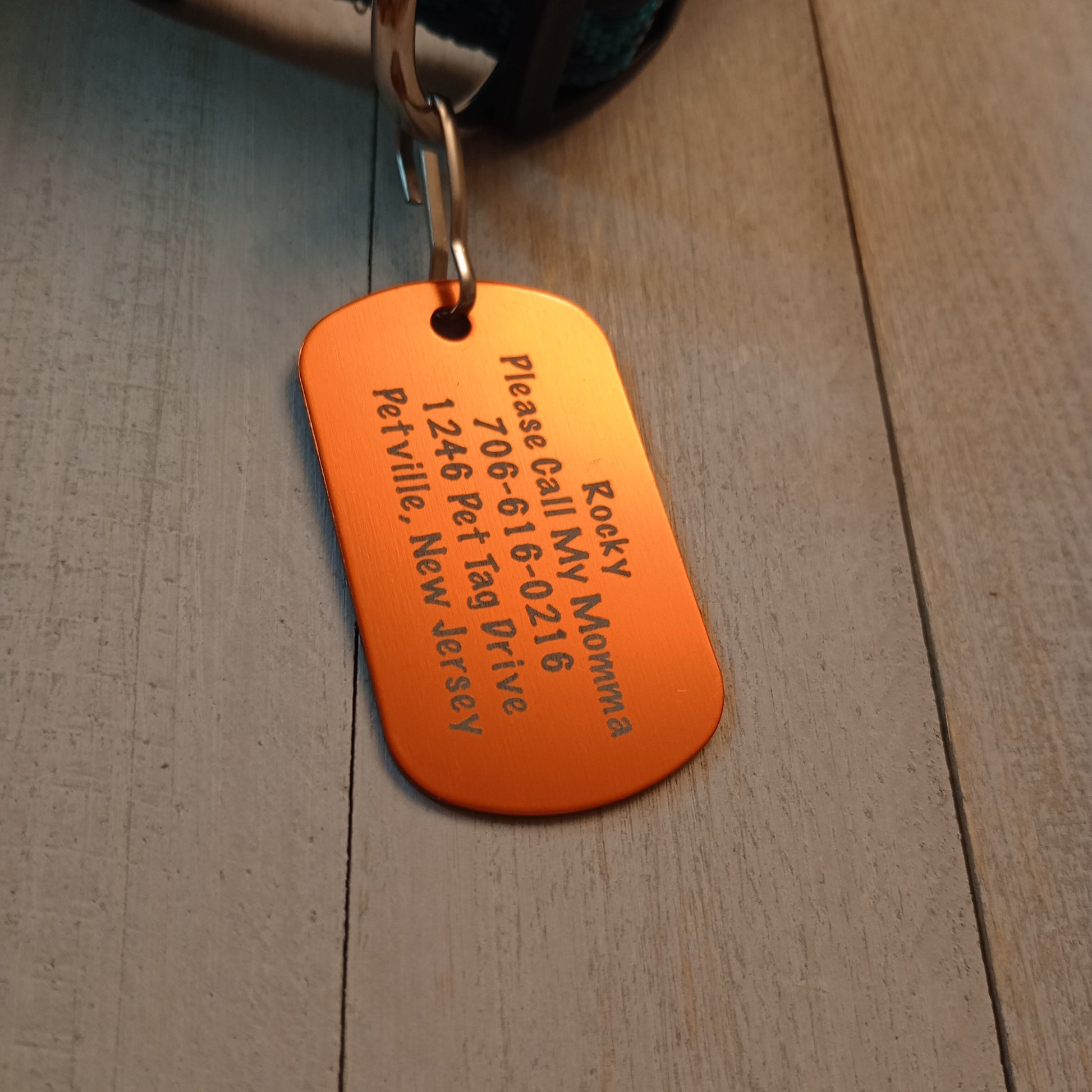This Orange Military Style Pet Tag is anodized aluminum that allows for 5 lines of text to be engraved lengthwise on the front and 5 lines of text to be engraved lengthwise on the back.