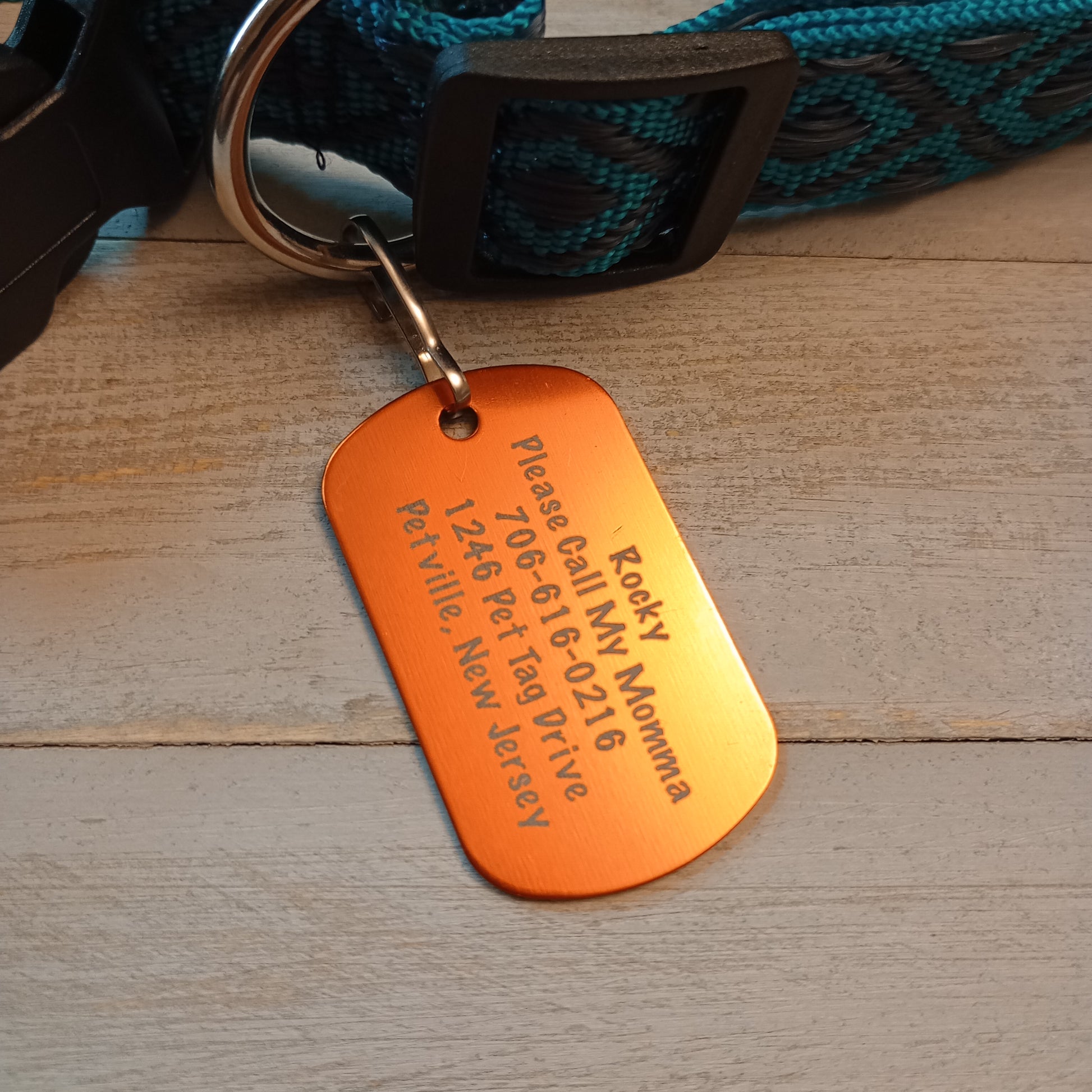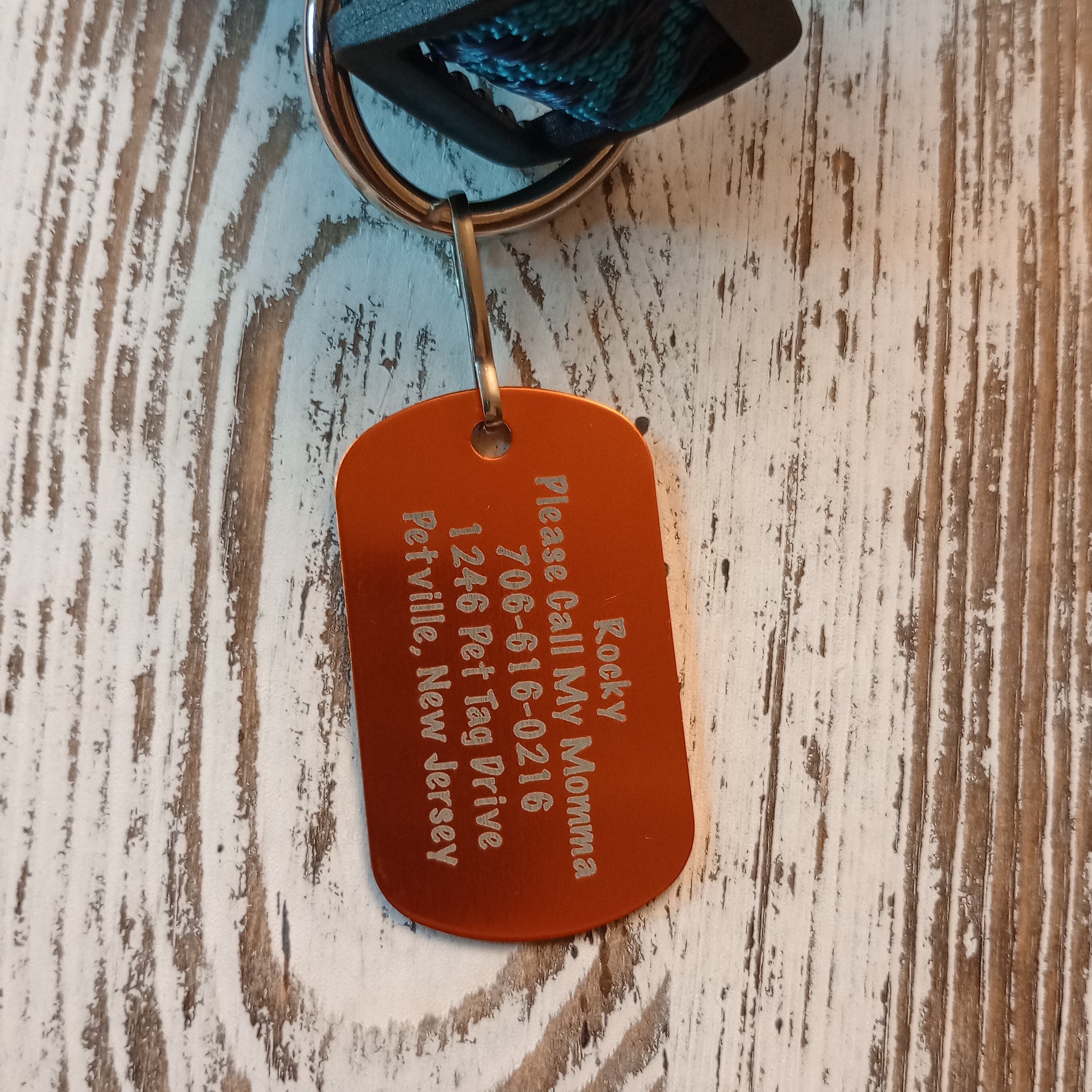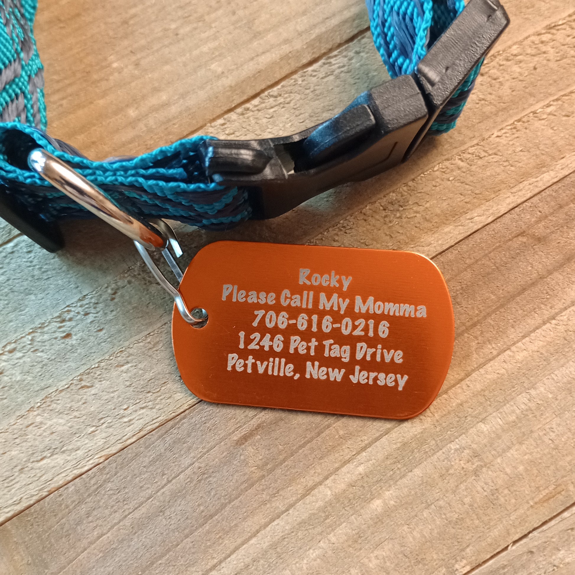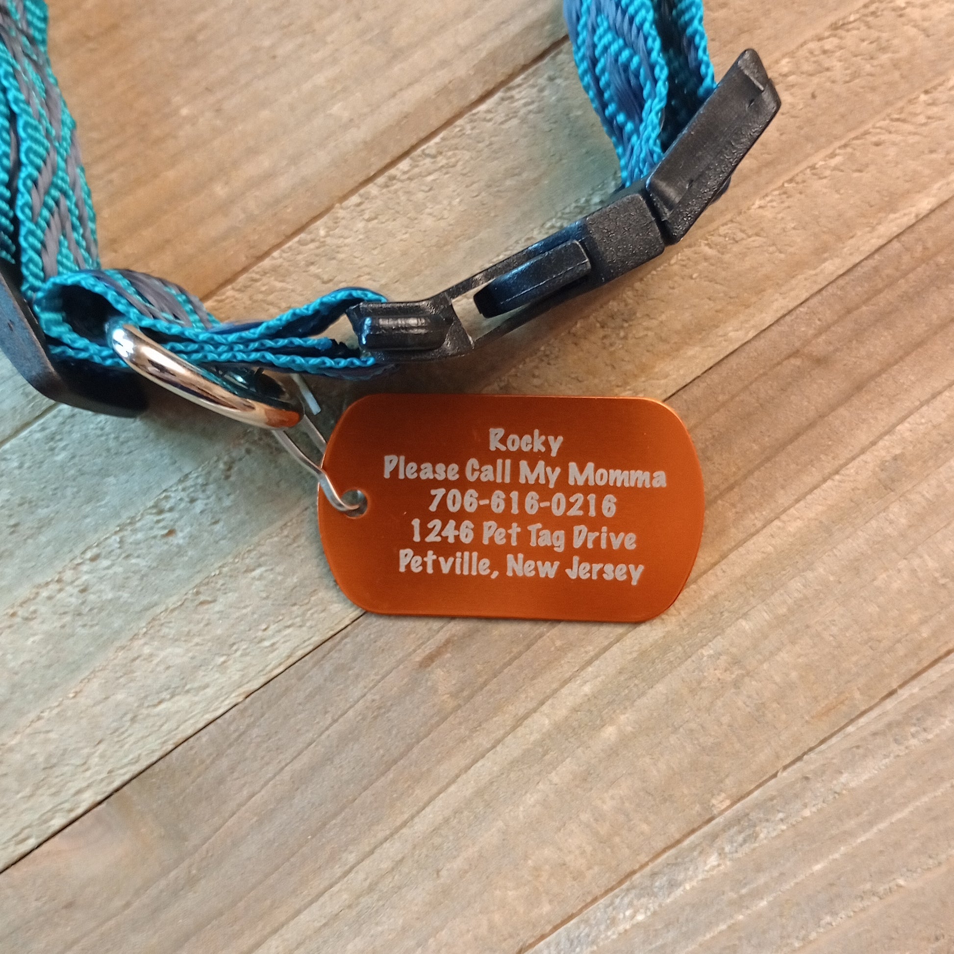 This Orange Military Style Pet Tag is anodized aluminum that allows for 5 lines of text to be engraved lengthwise on the front and 5 lines of text to be engraved lengthwise on the back.