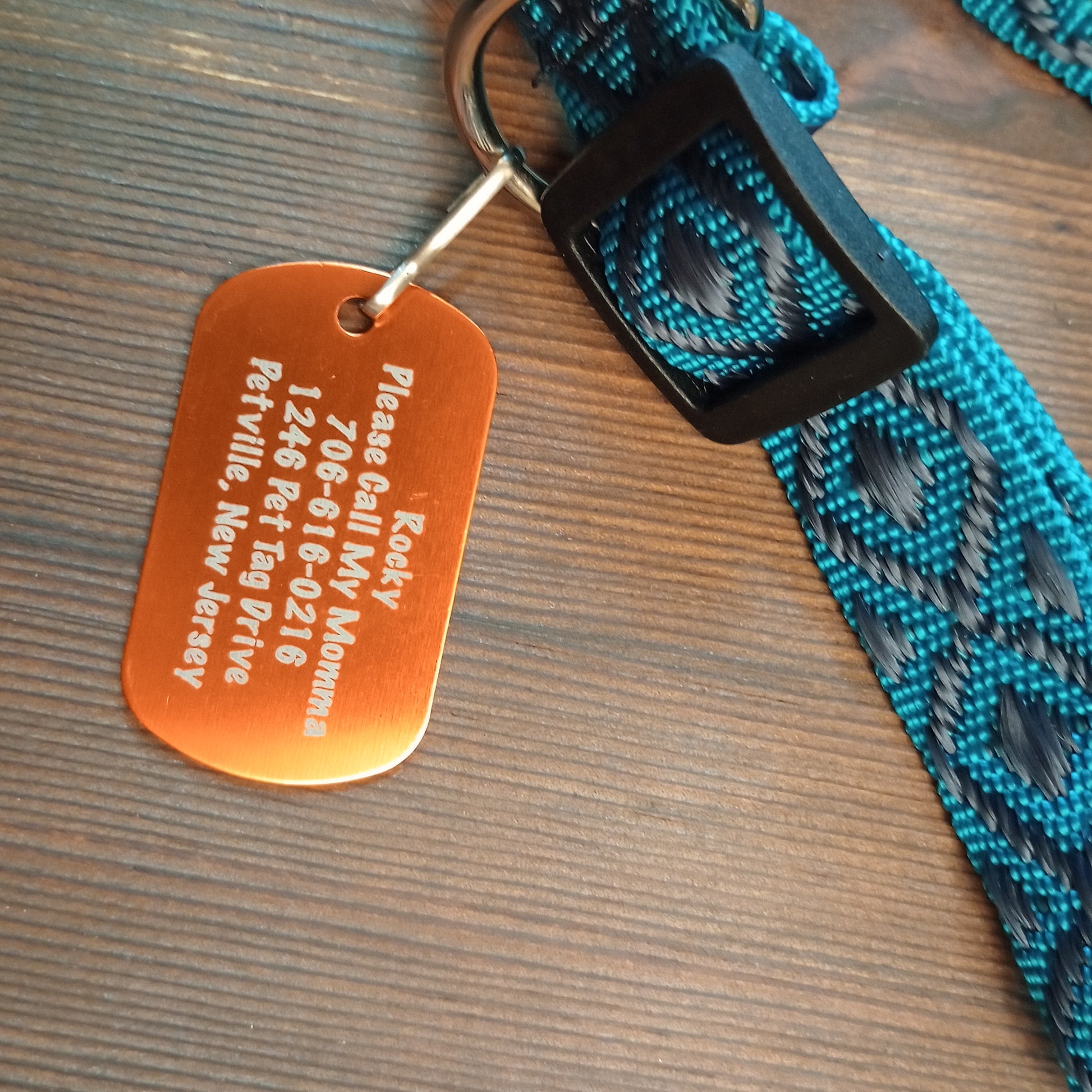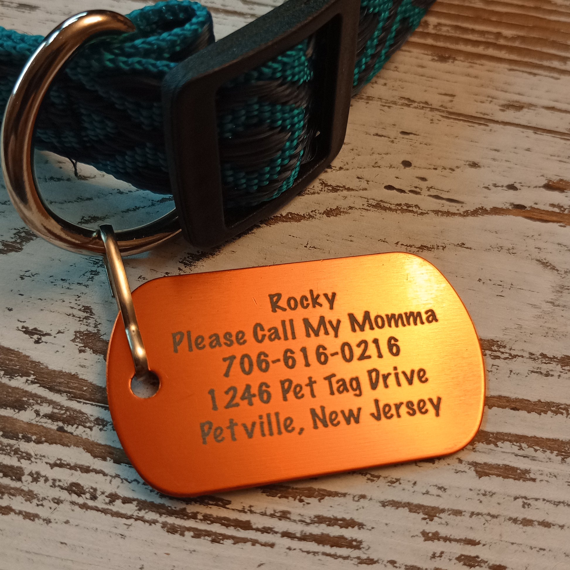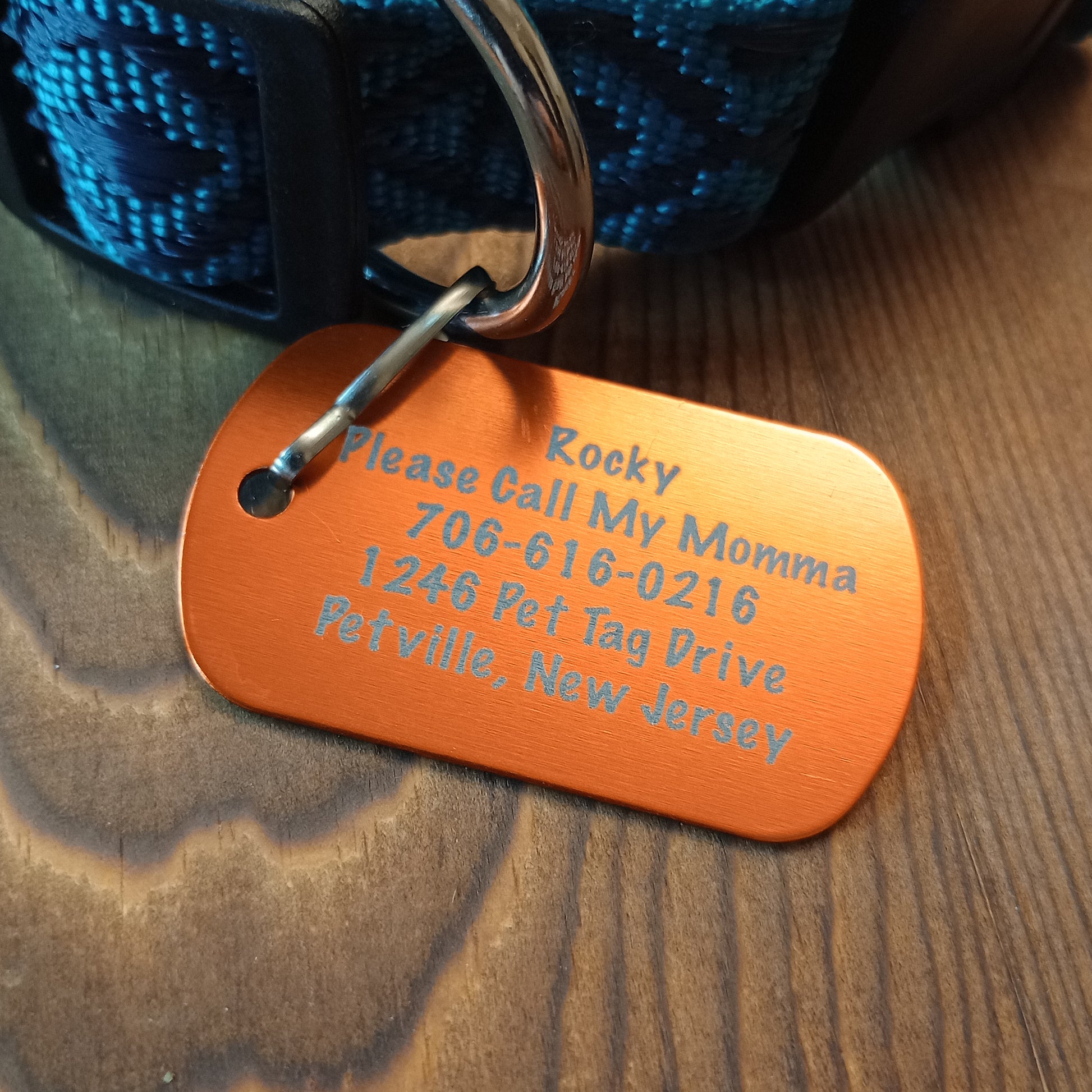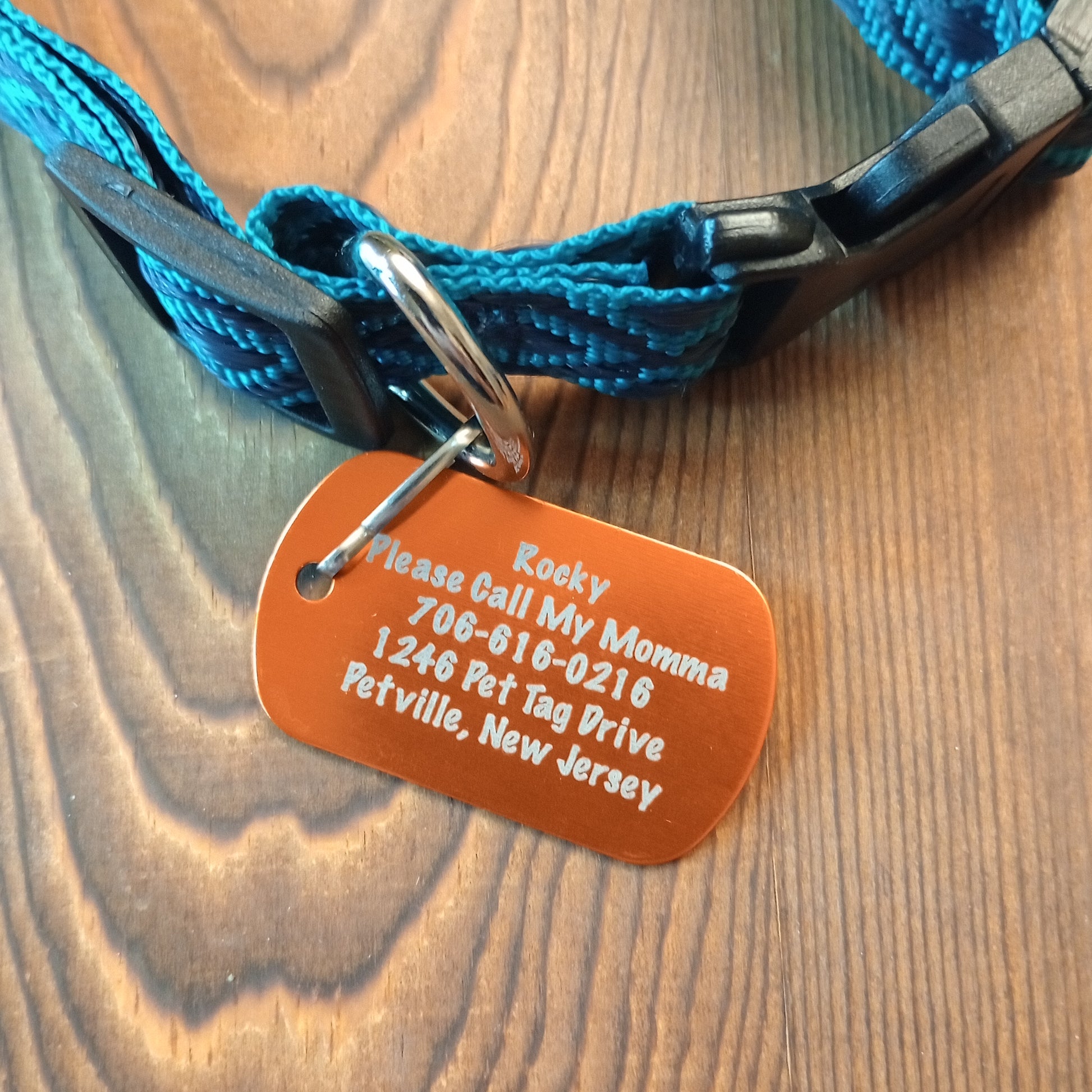 This Orange Military Style Pet Tag is anodized aluminum that allows for 5 lines of text to be engraved lengthwise on the front and 5 lines of text to be engraved lengthwise on the back.