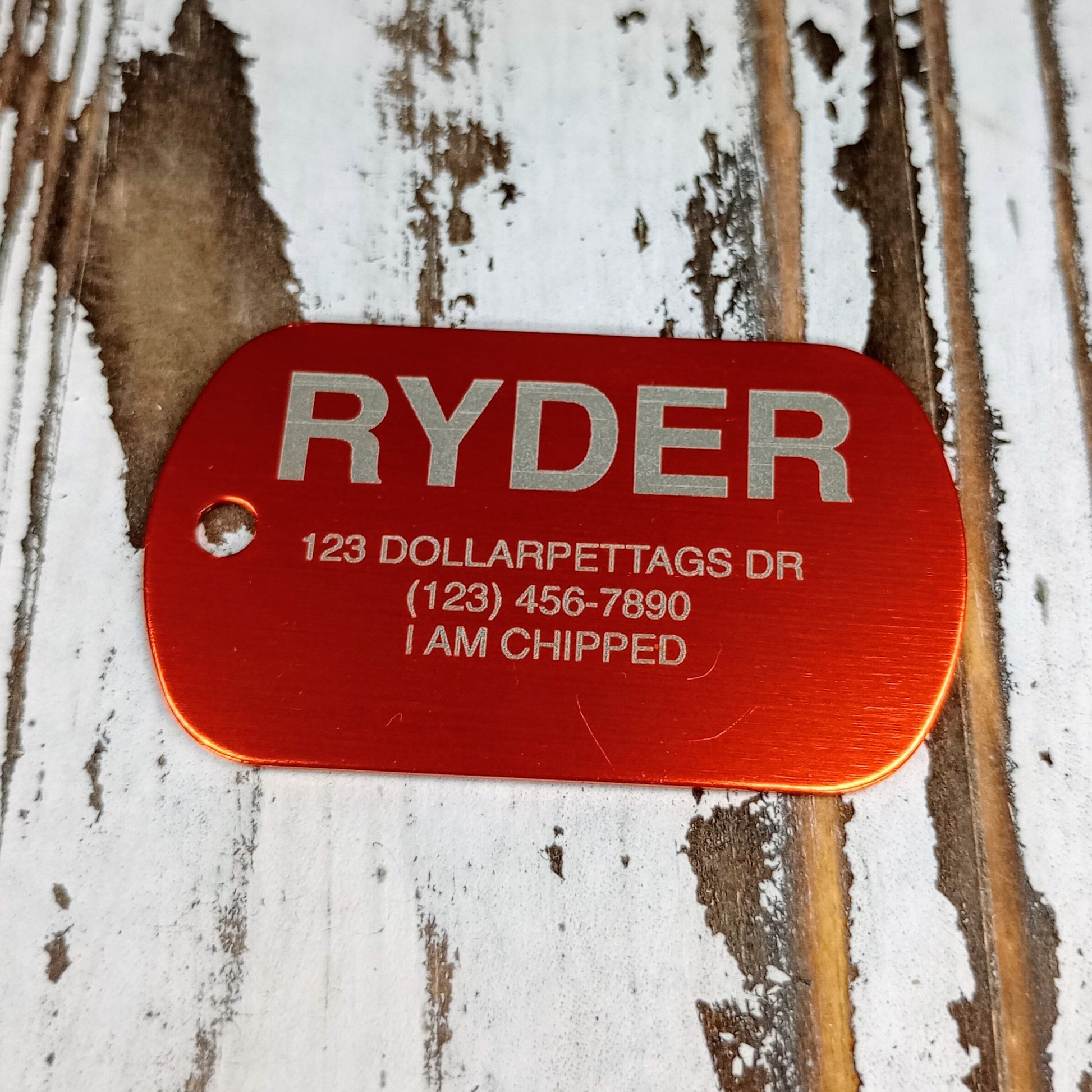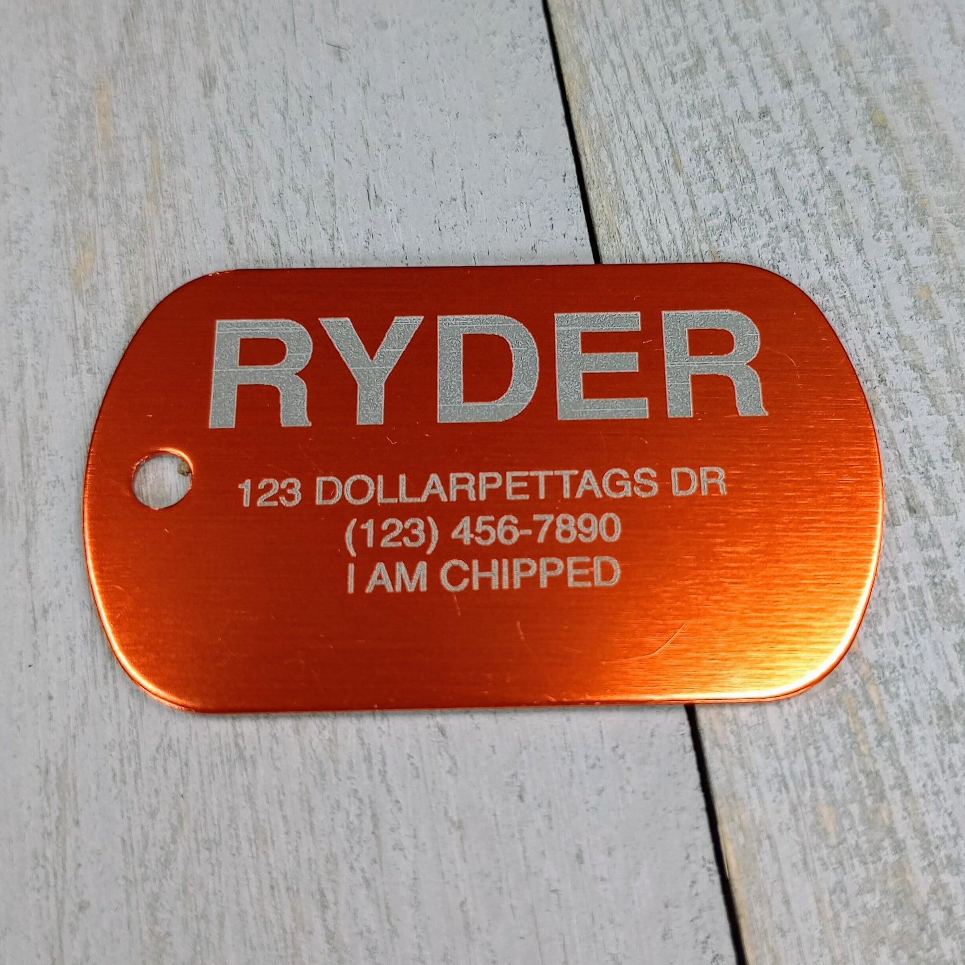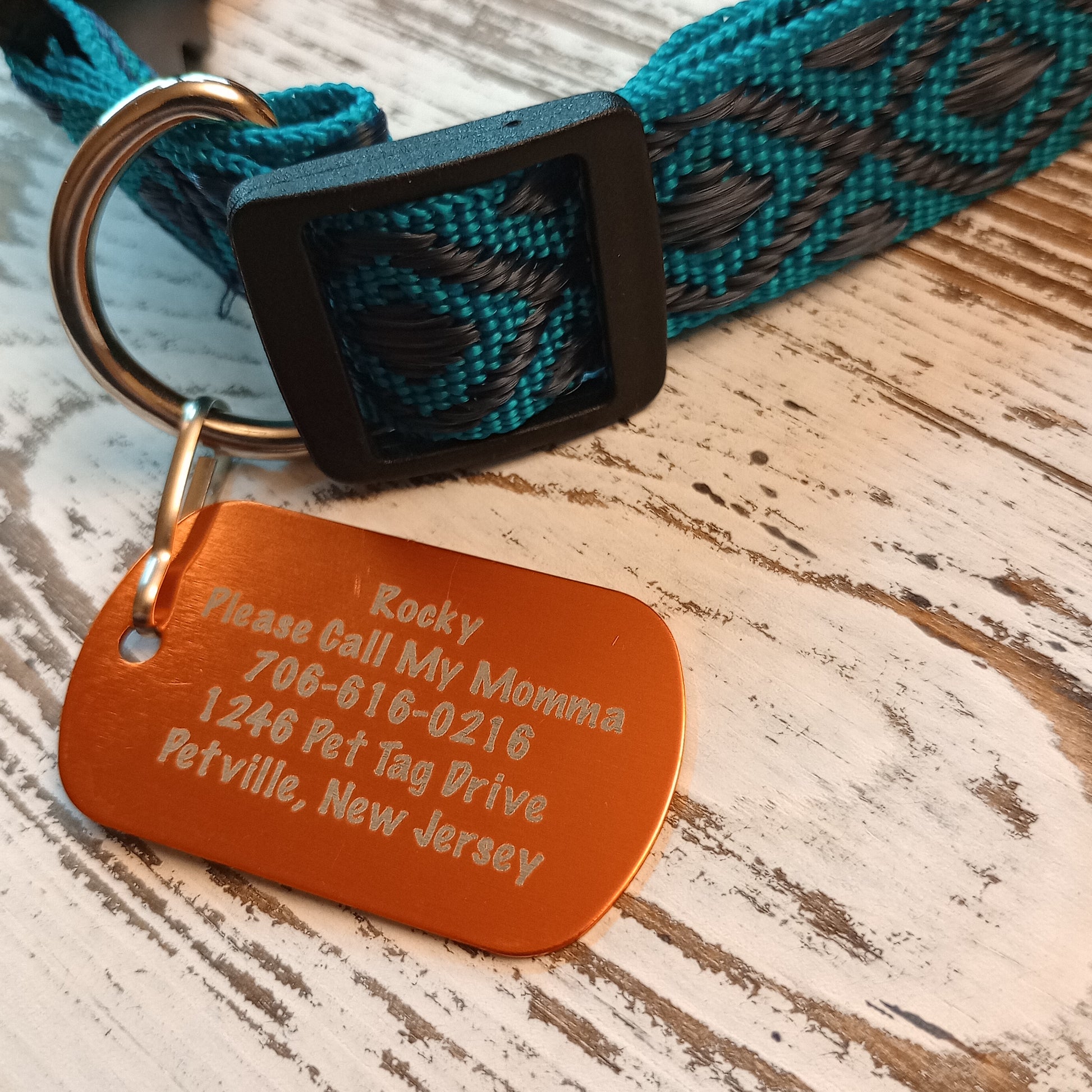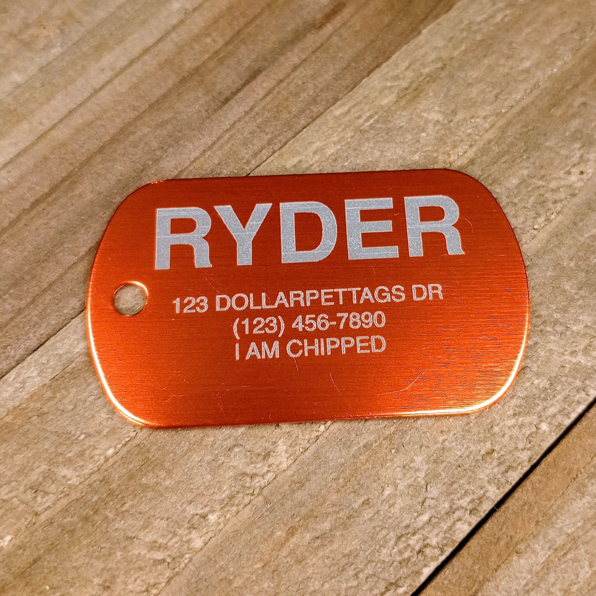 This Orange Military Style Pet Tag is anodized aluminum that allows for 5 lines of text to be engraved lengthwise on the front and 5 lines of text to be engraved lengthwise on the back.