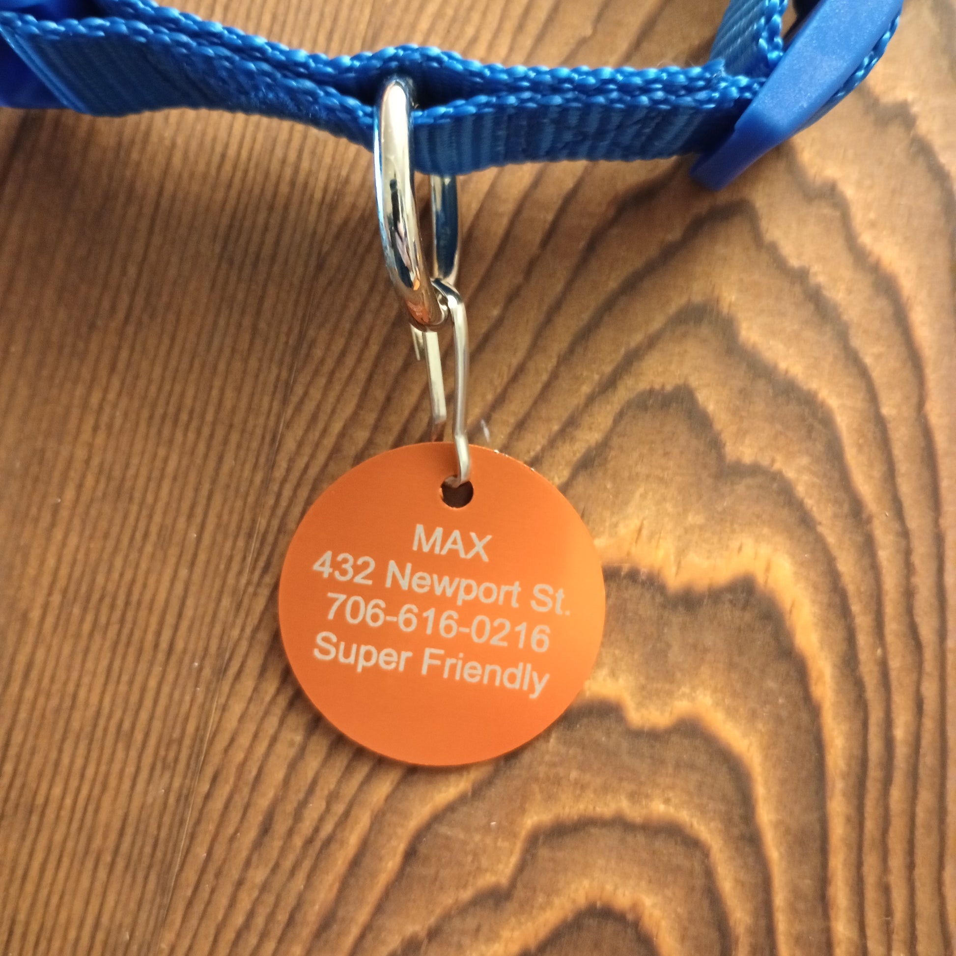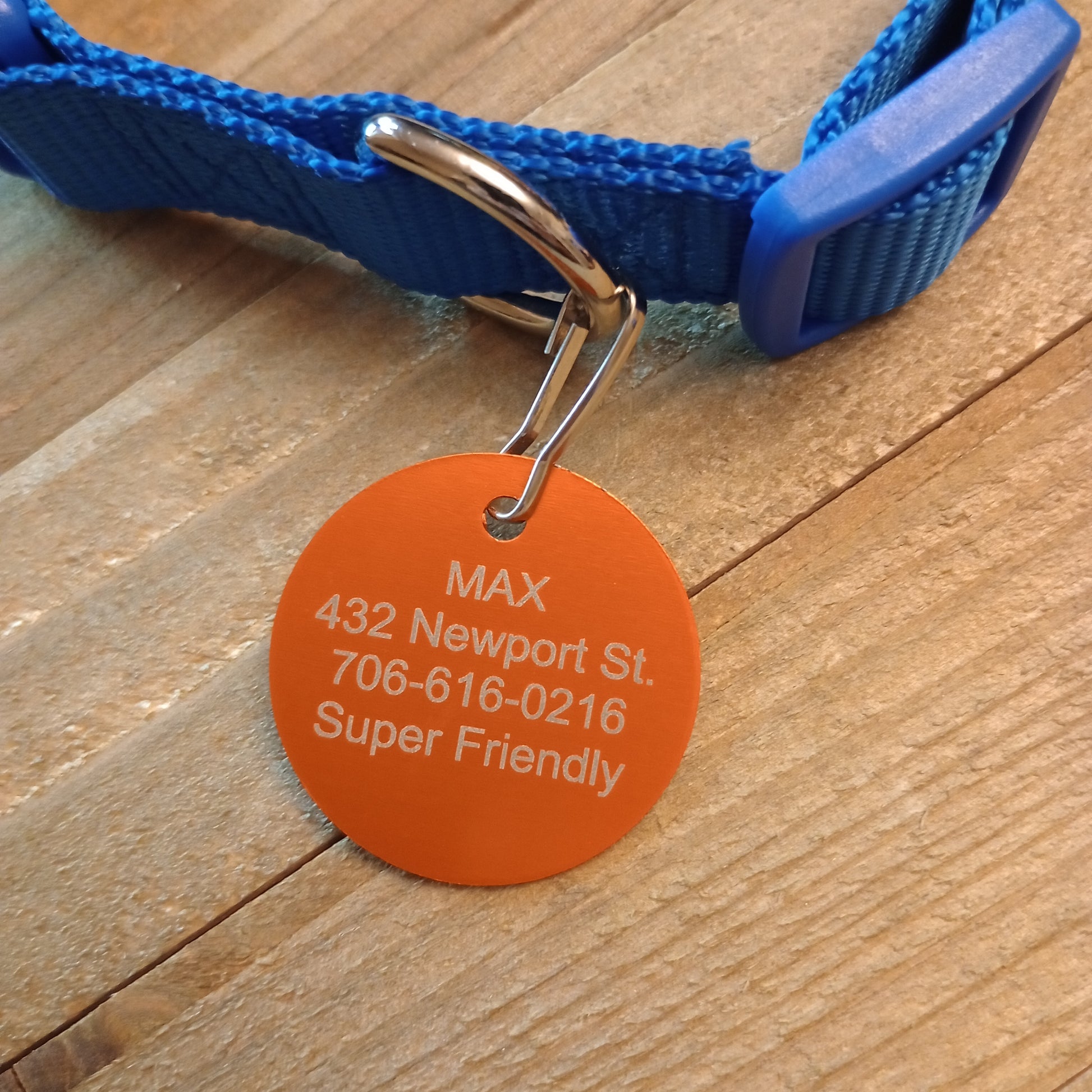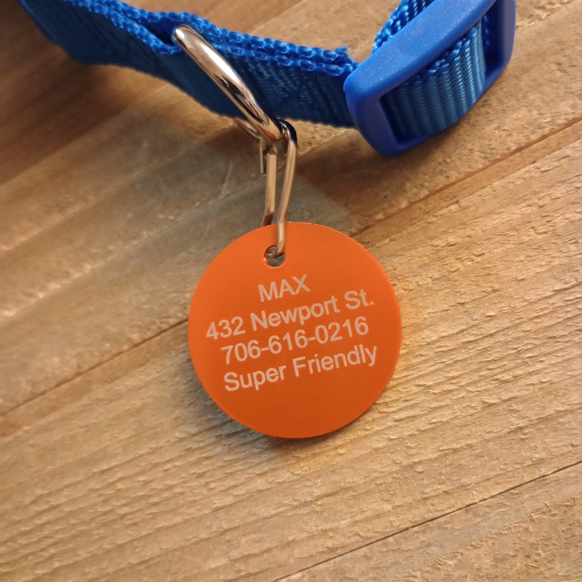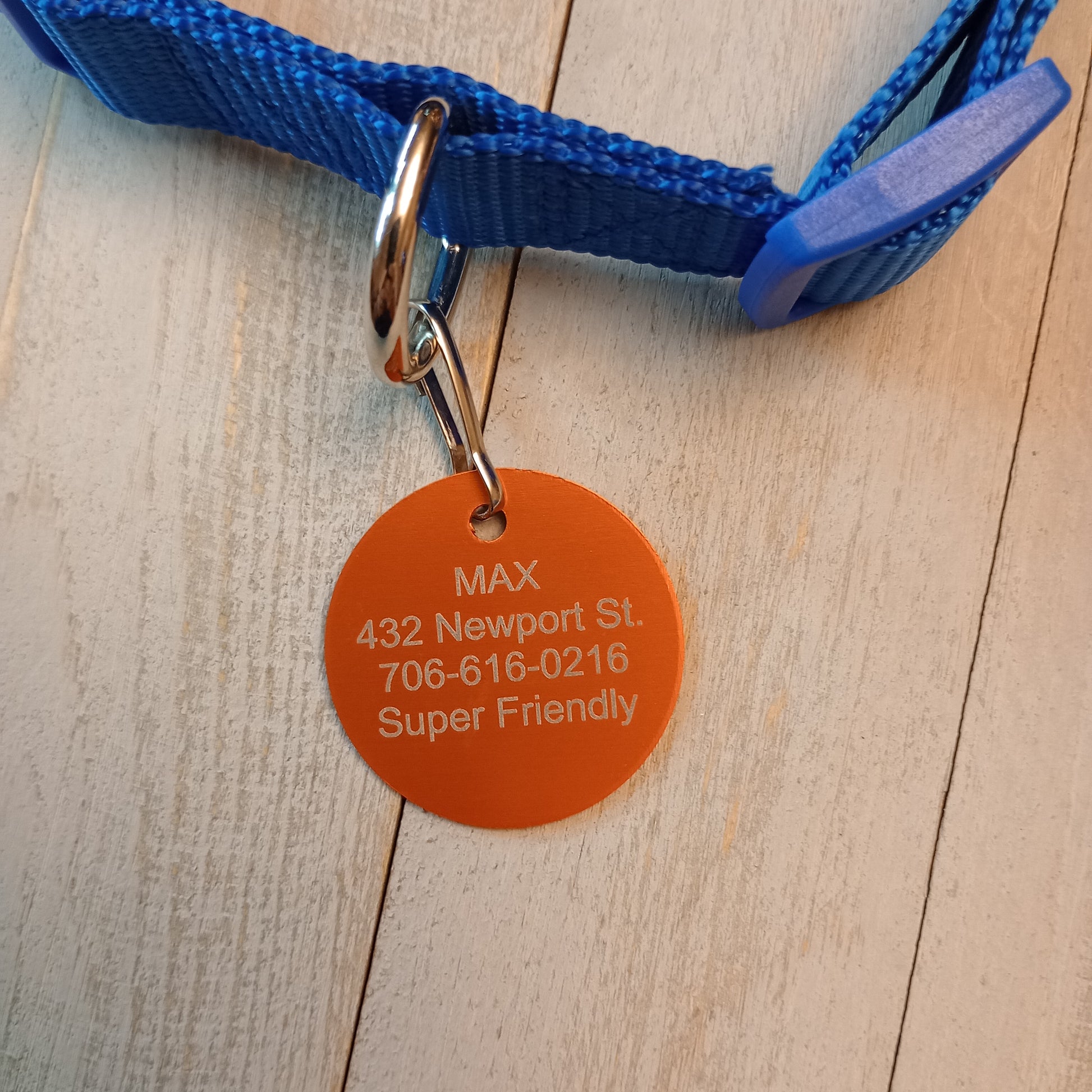 This Orange Round Pet Tag is anodized aluminum that allows for 4 lines of text to be engraved on the front and 4 lines of text to be engraved on the back.