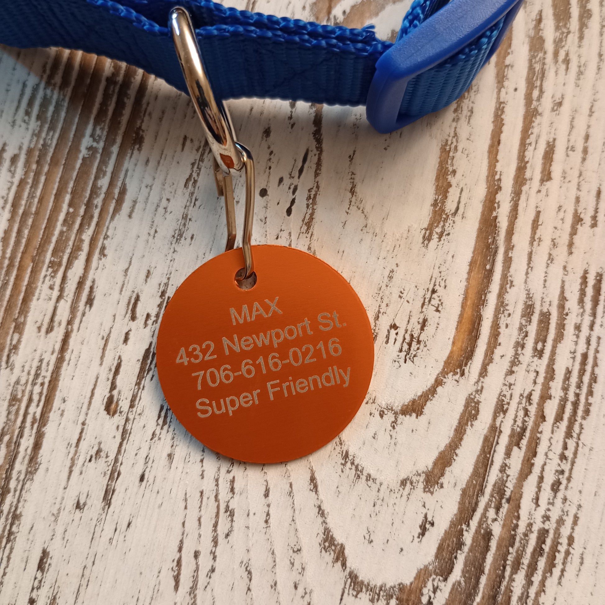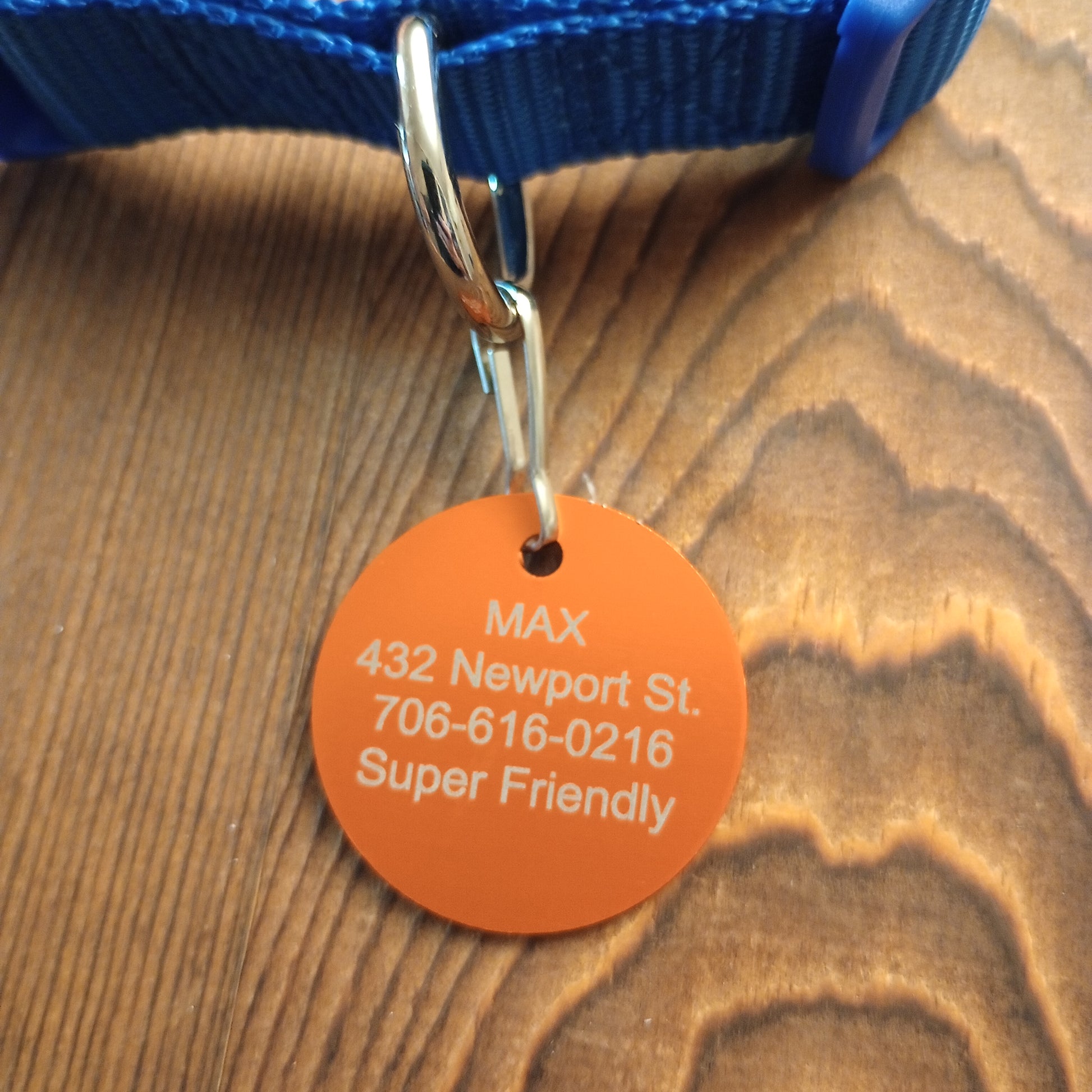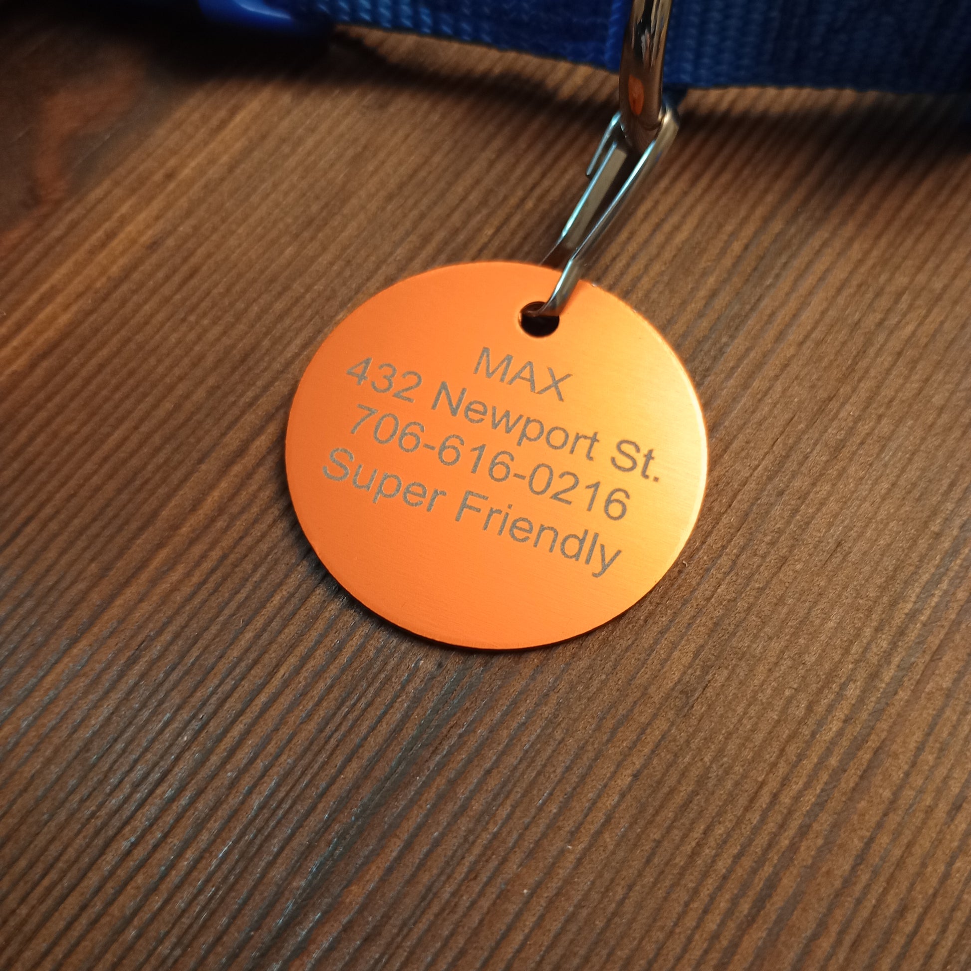 This Orange Round Pet Tag is anodized aluminum that allows for 4 lines of text to be engraved on the front and 4 lines of text to be engraved on the back.