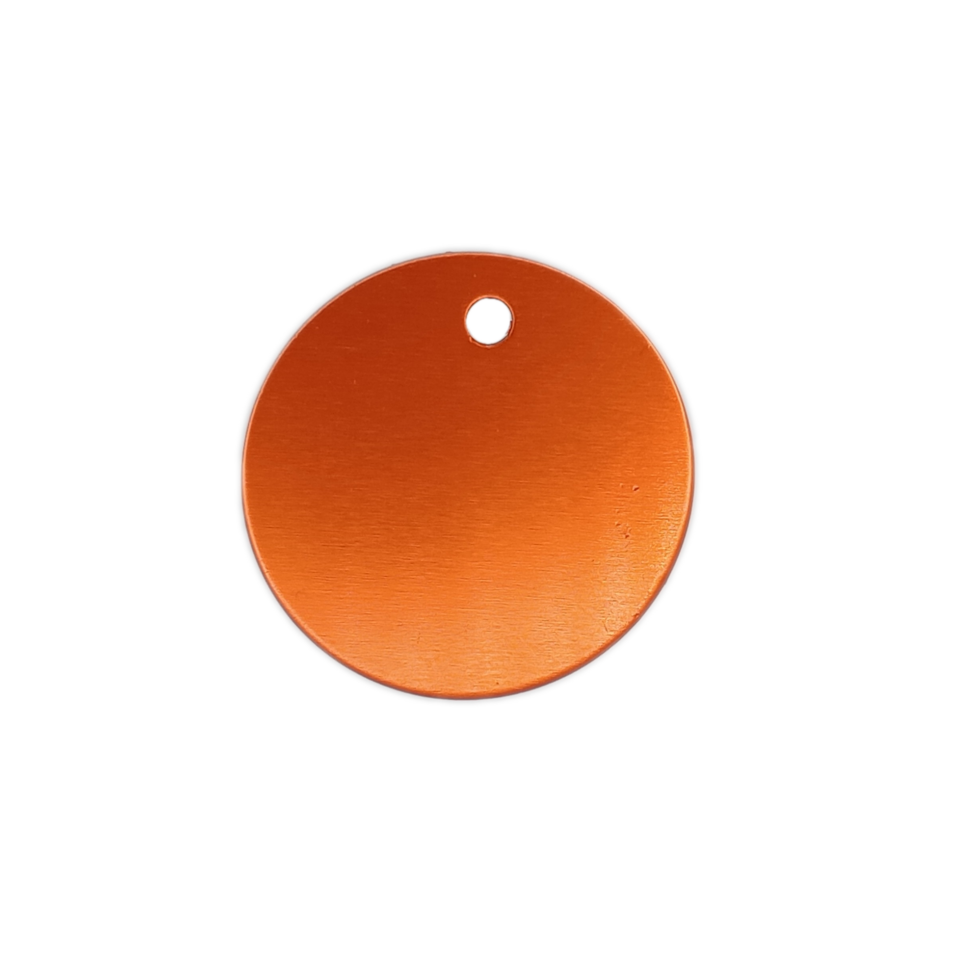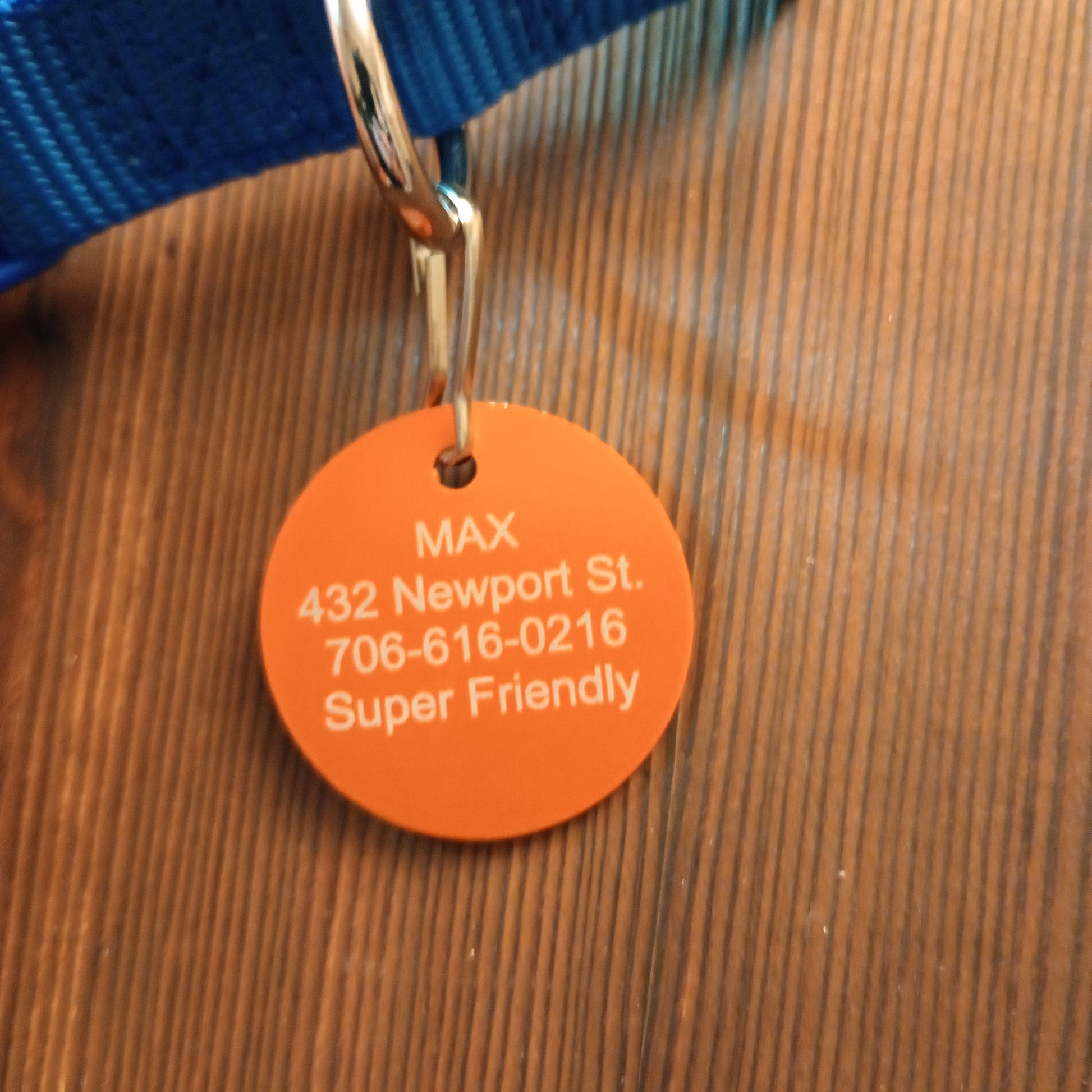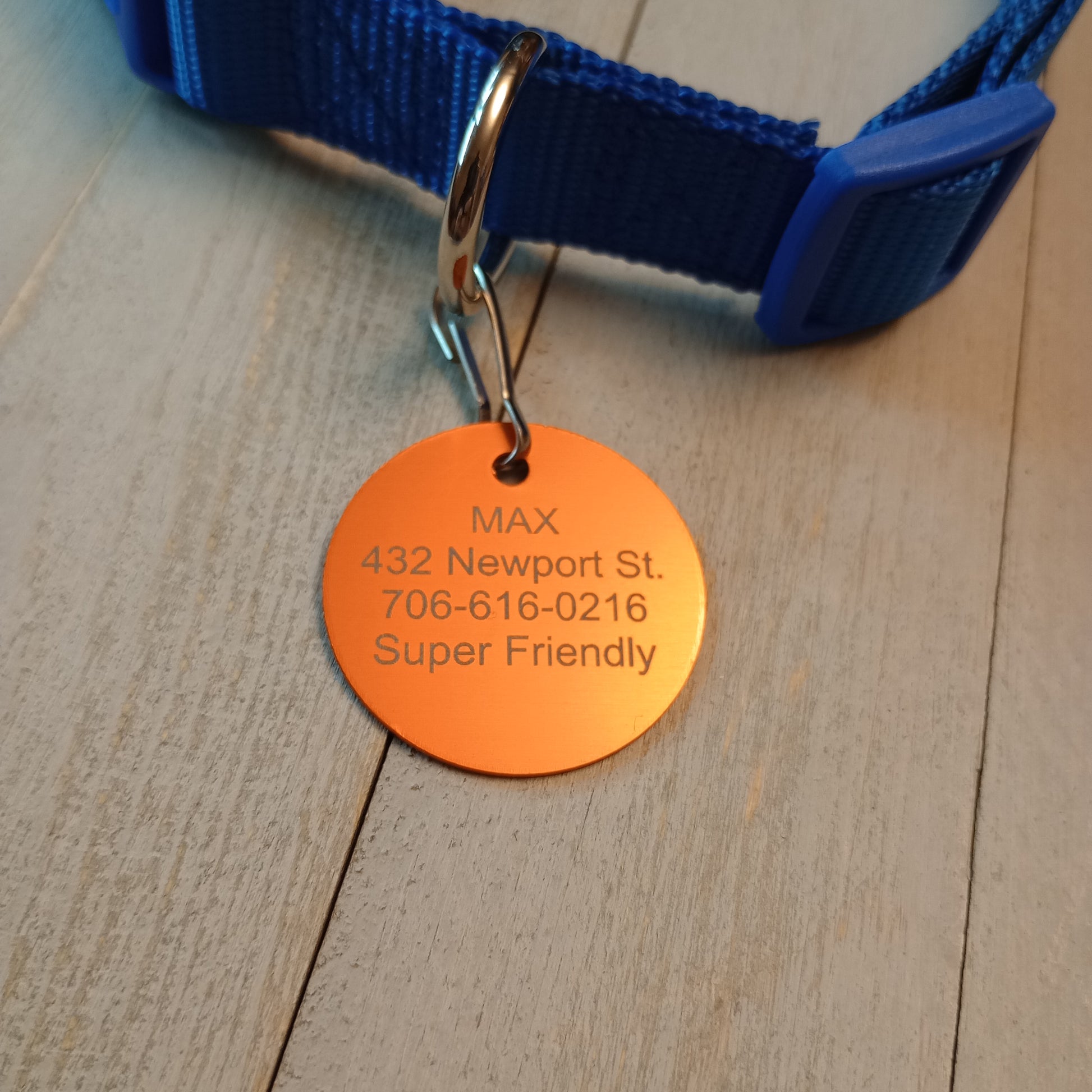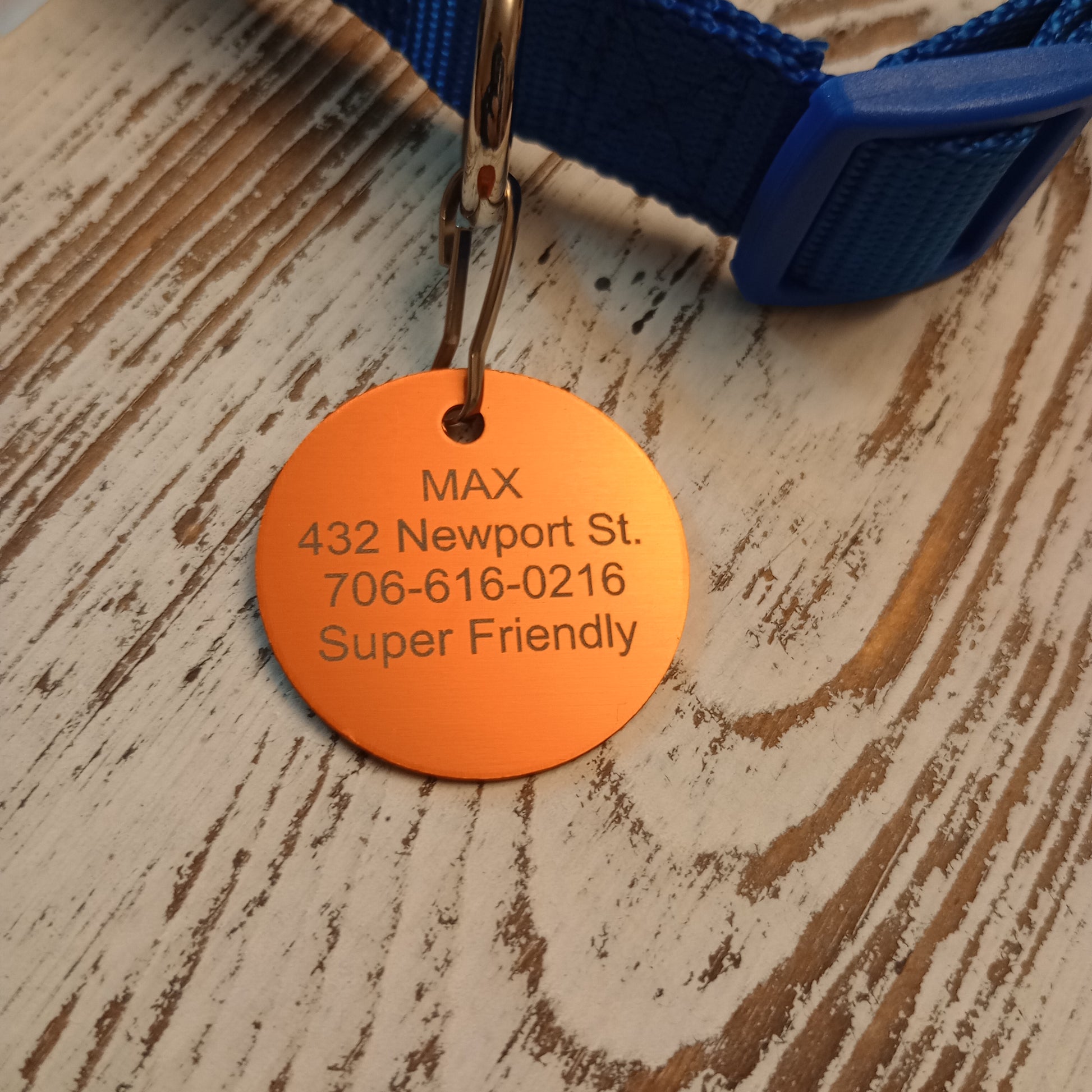 This Orange Round Pet Tag is anodized aluminum that allows for 4 lines of text to be engraved on the front and 4 lines of text to be engraved on the back.