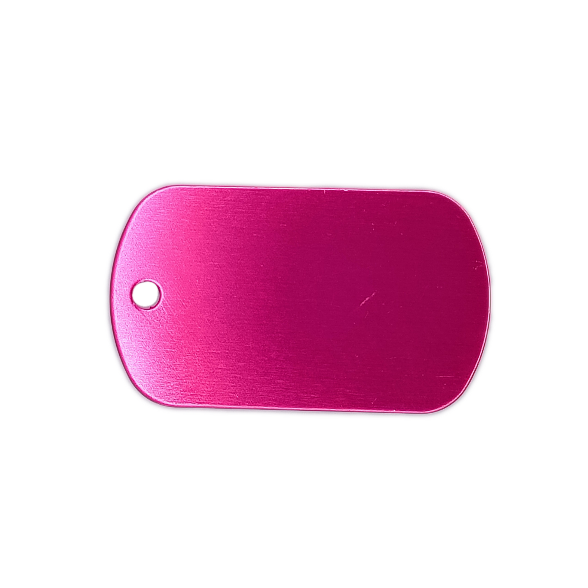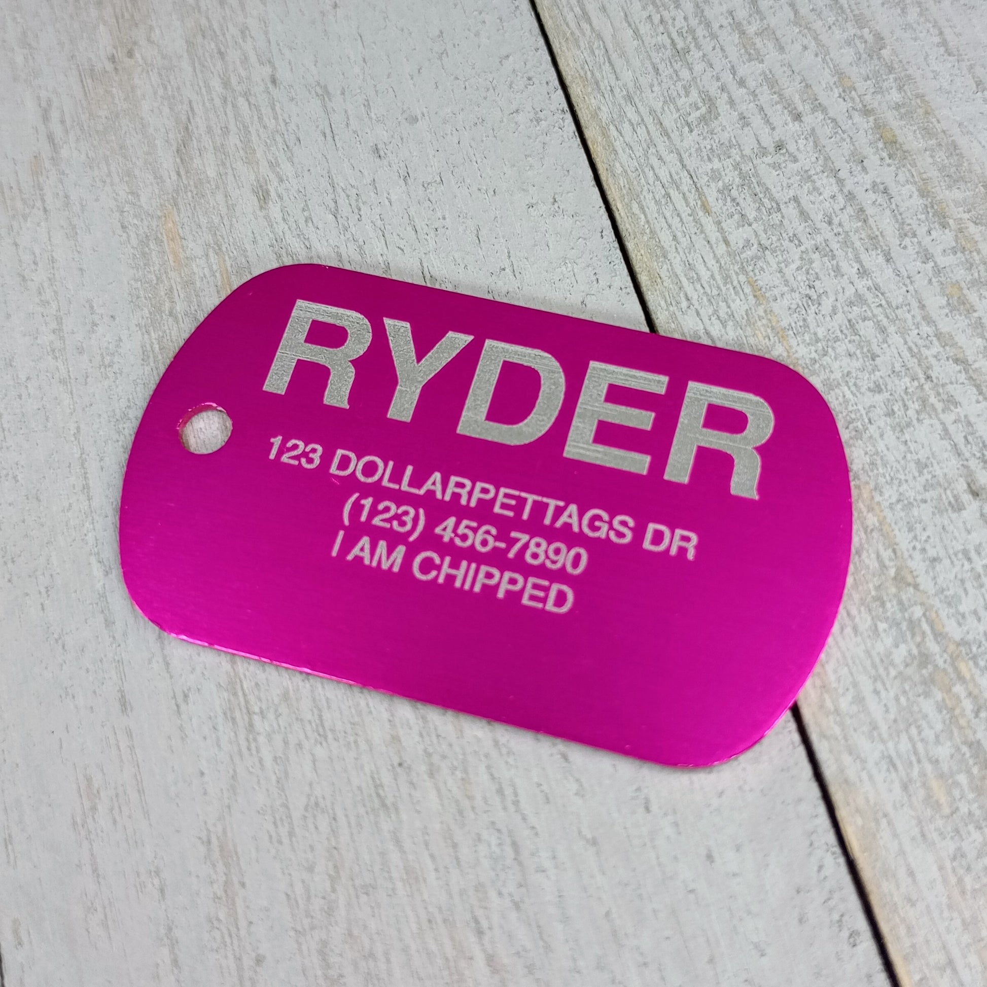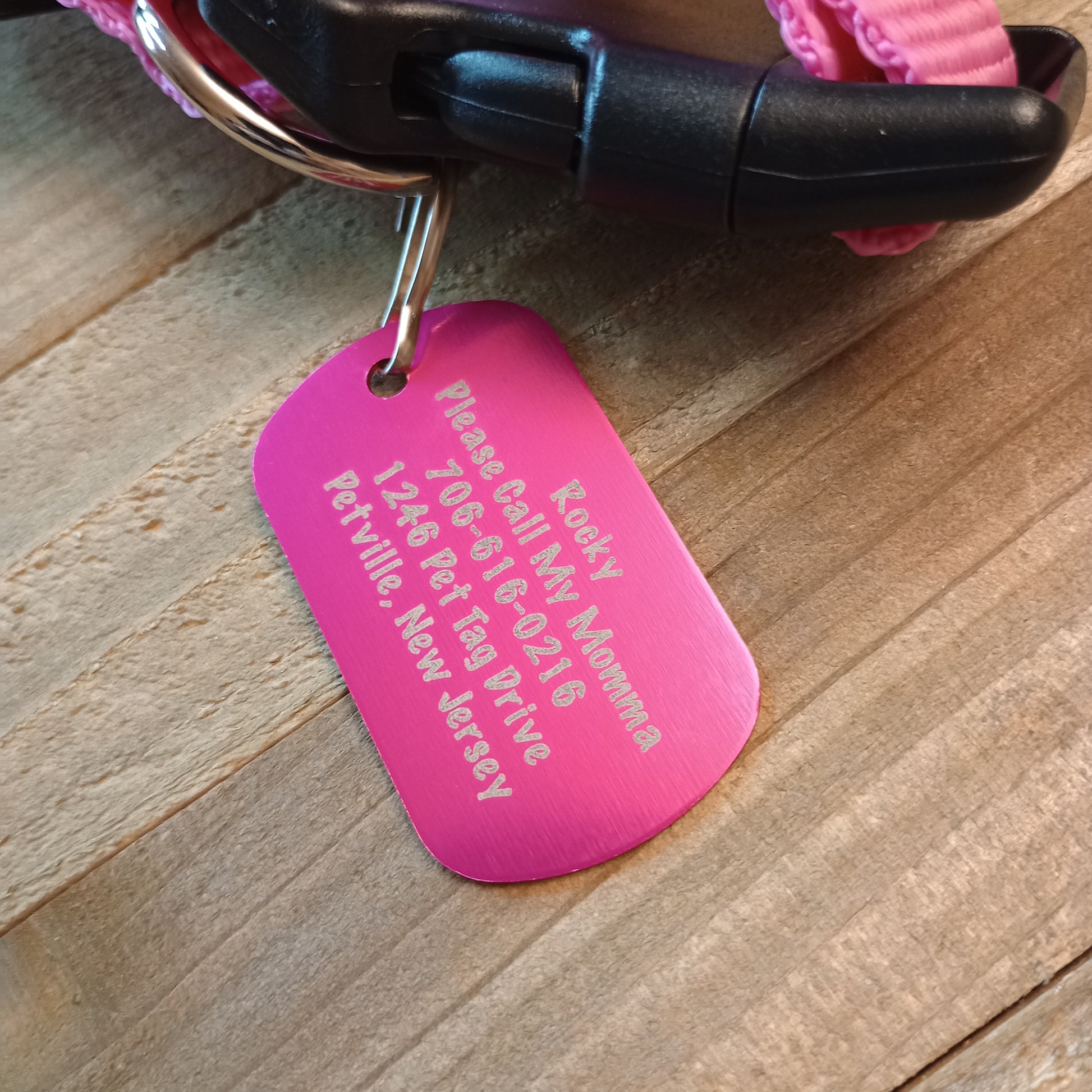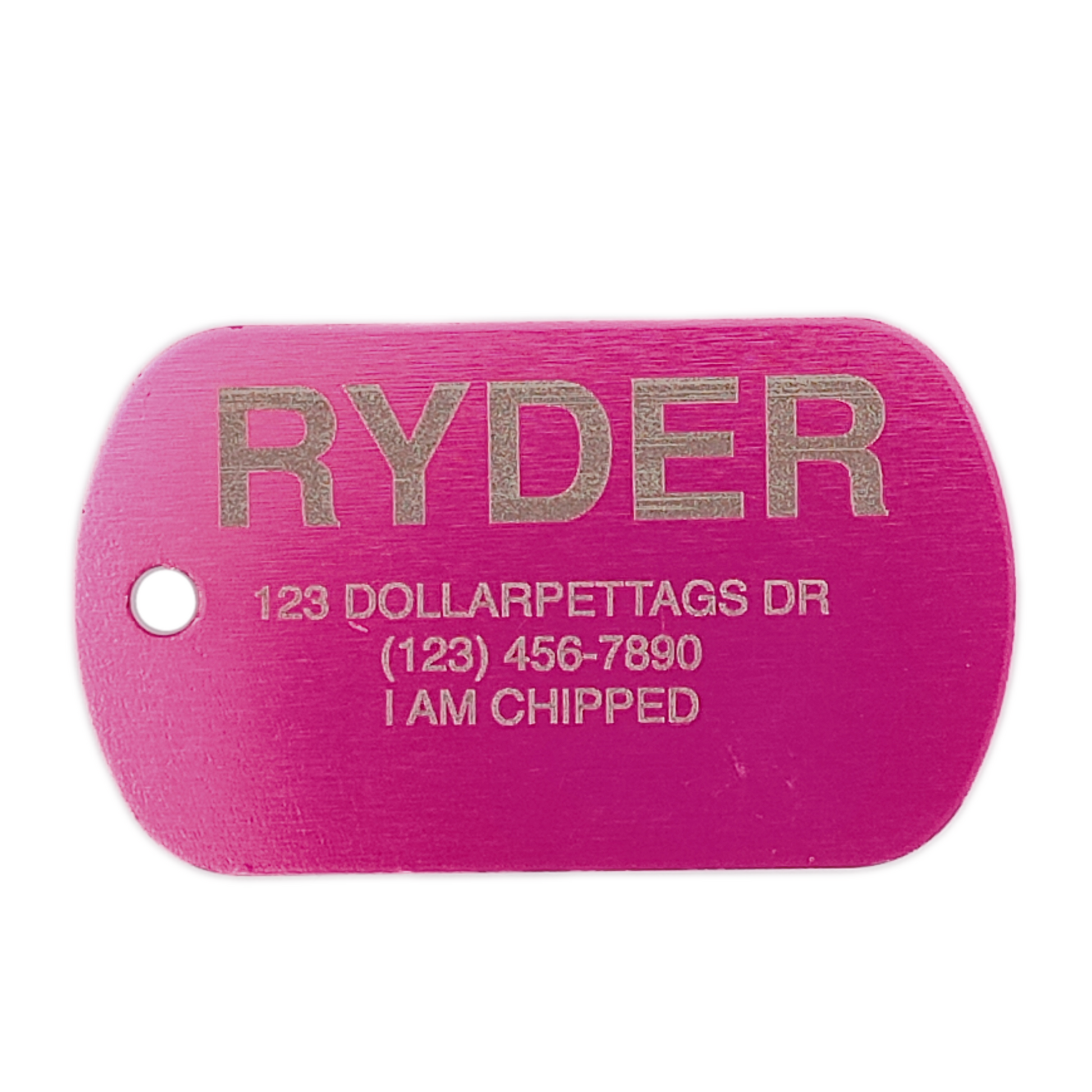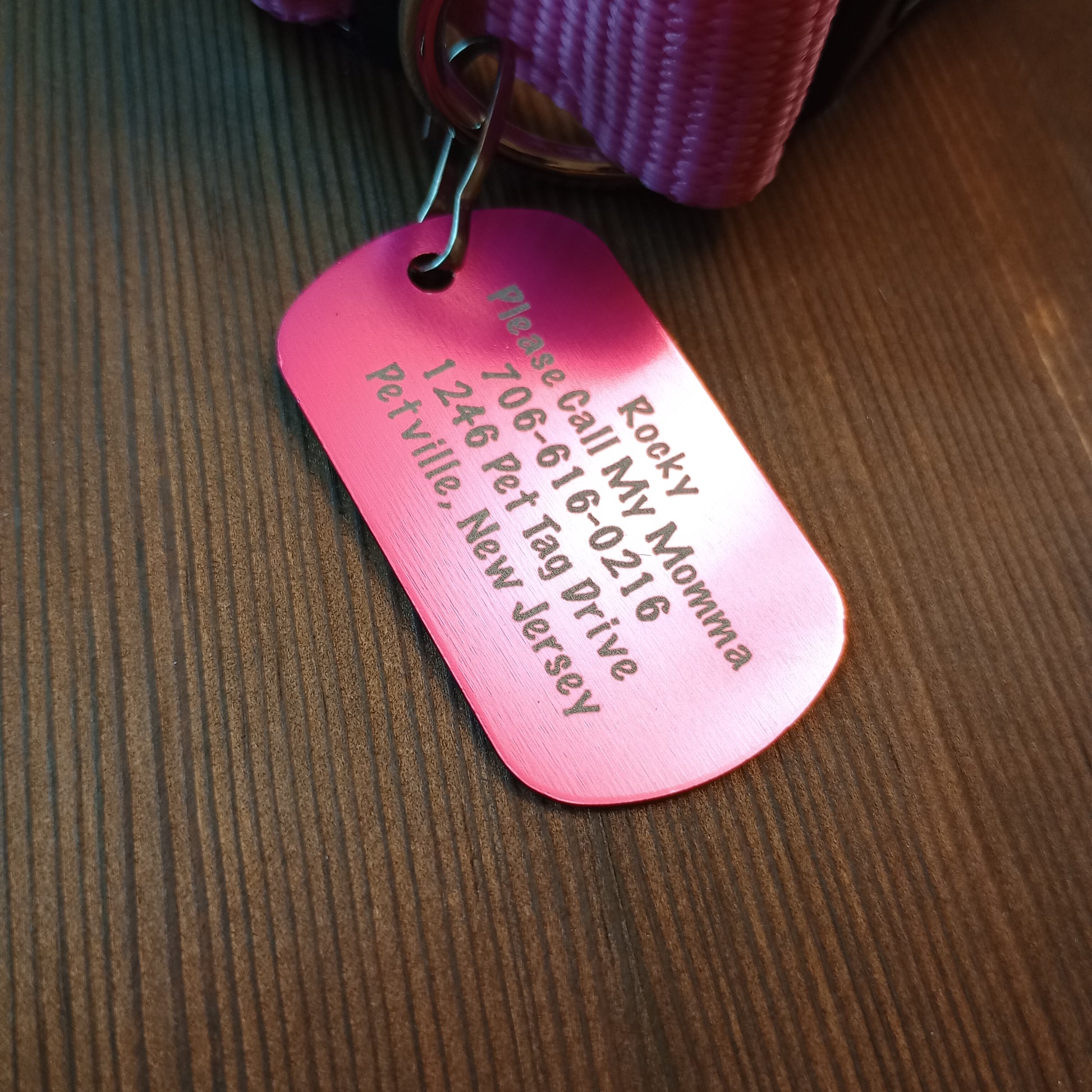 This Pink Military Style Pet Tag is anodized aluminum that allows for 5 lines of text to be engraved lengthwise on the front and 5 lines of text to be engraved lengthwise on the back.