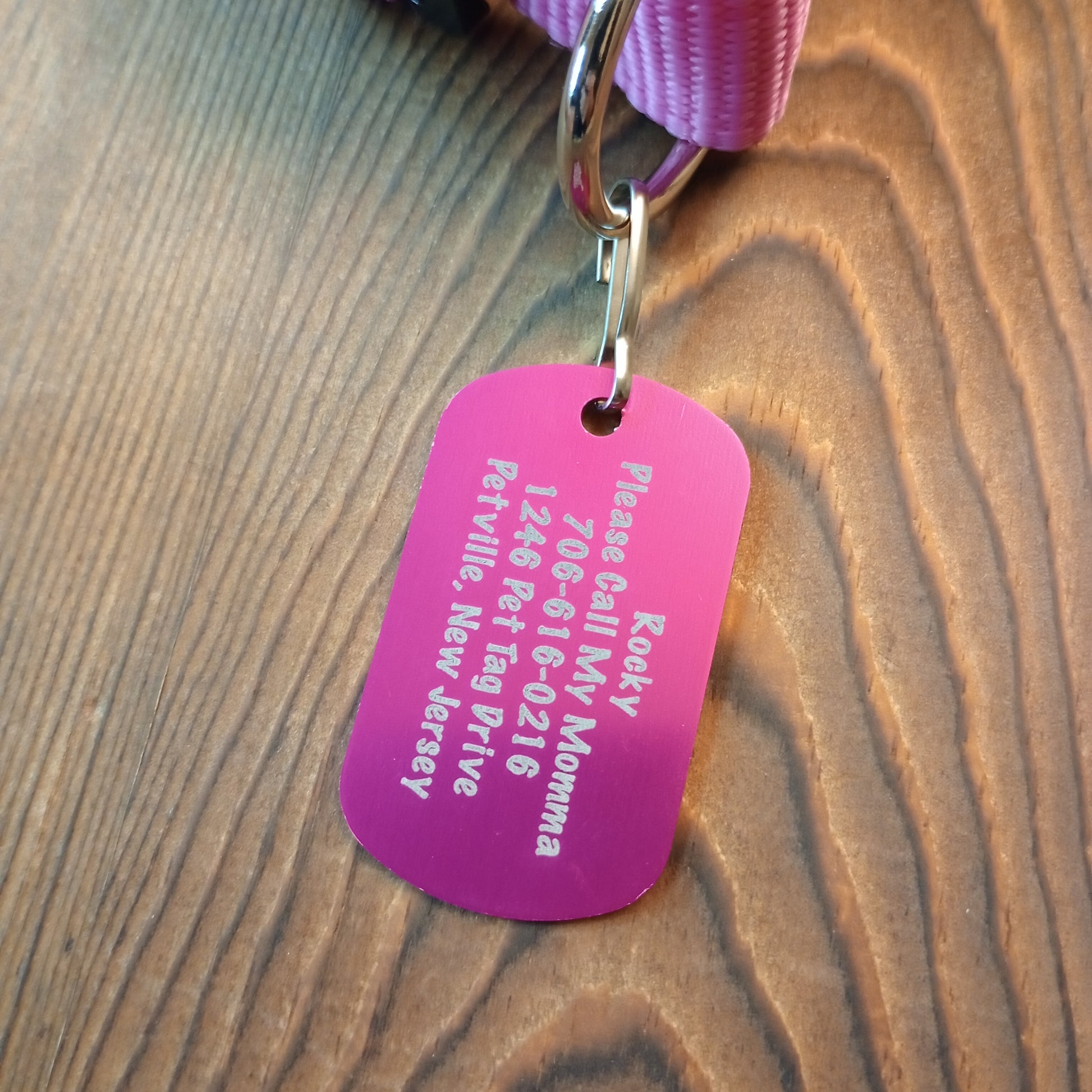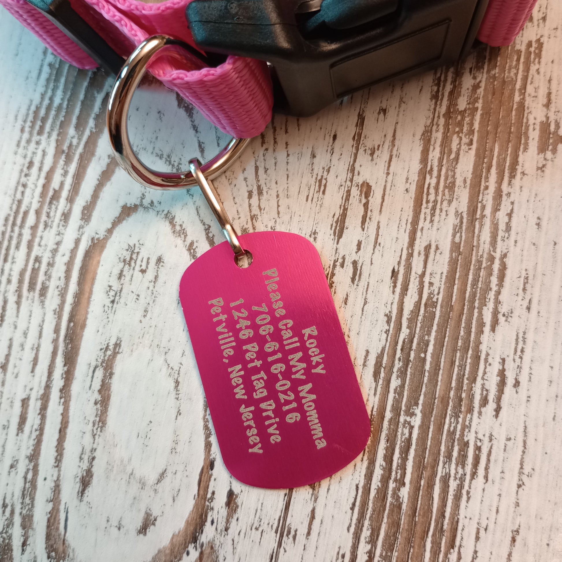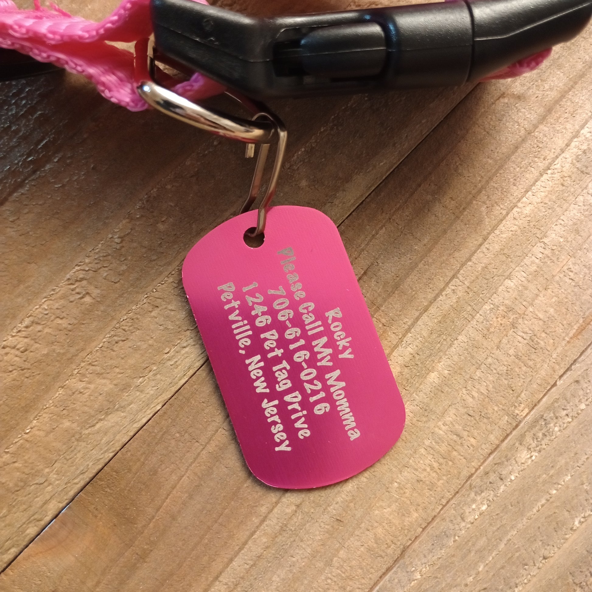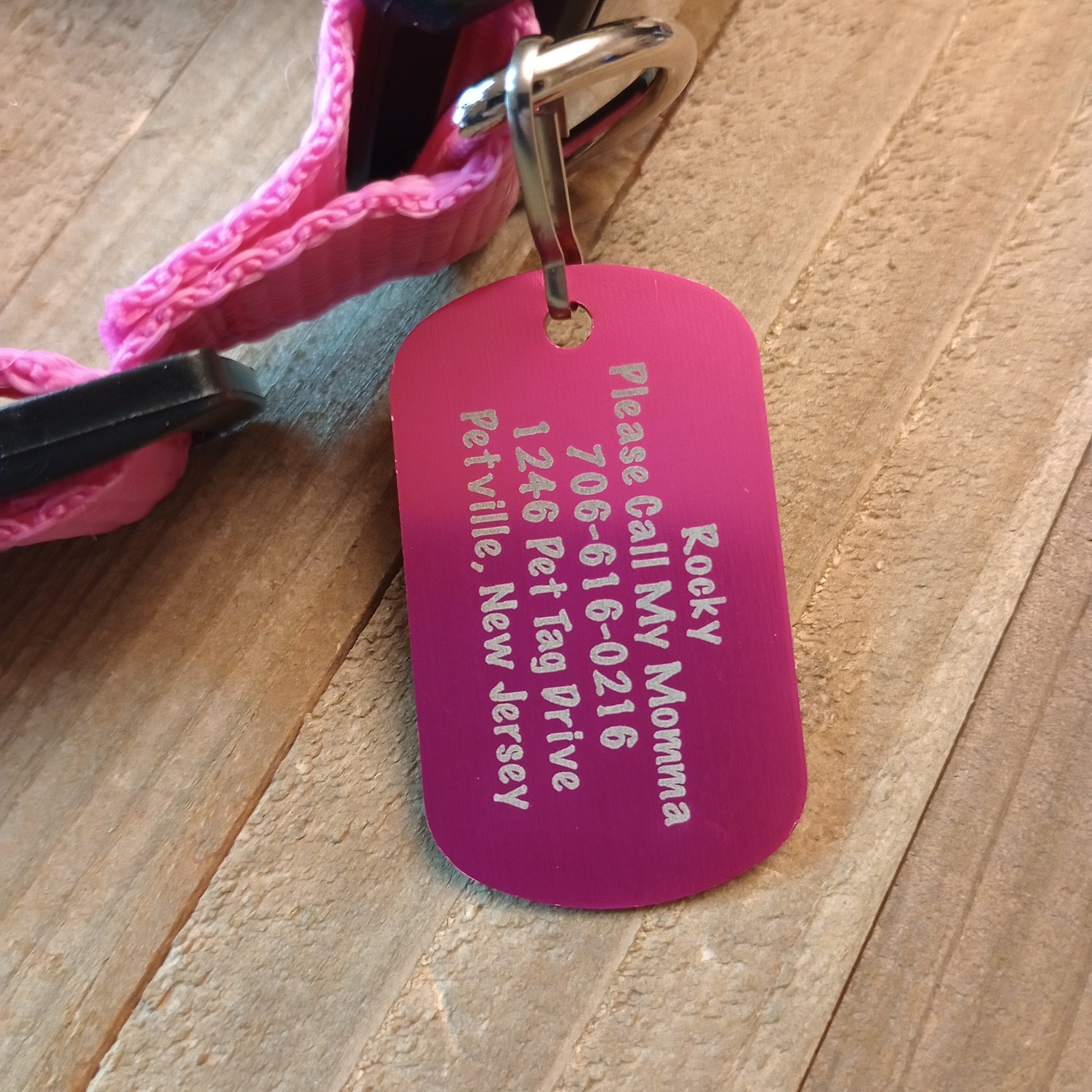 This Pink Military Style Pet Tag is anodized aluminum that allows for 5 lines of text to be engraved lengthwise on the front and 5 lines of text to be engraved lengthwise on the back.