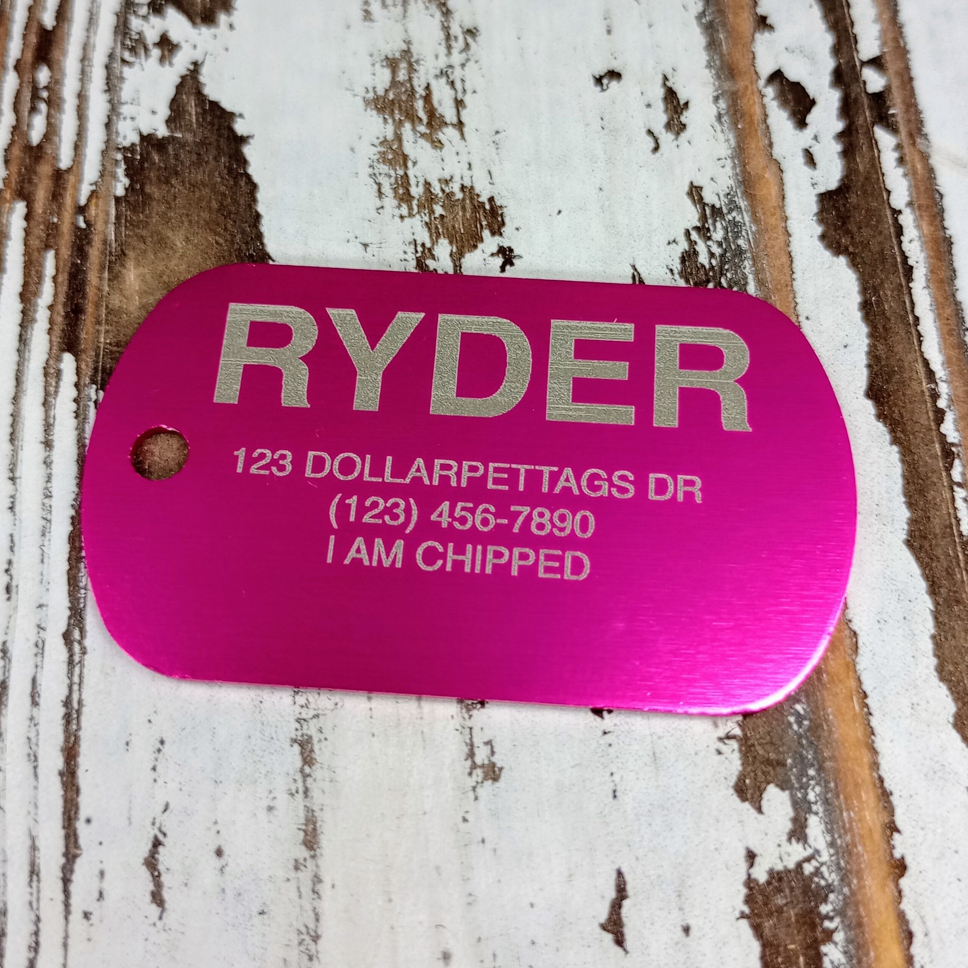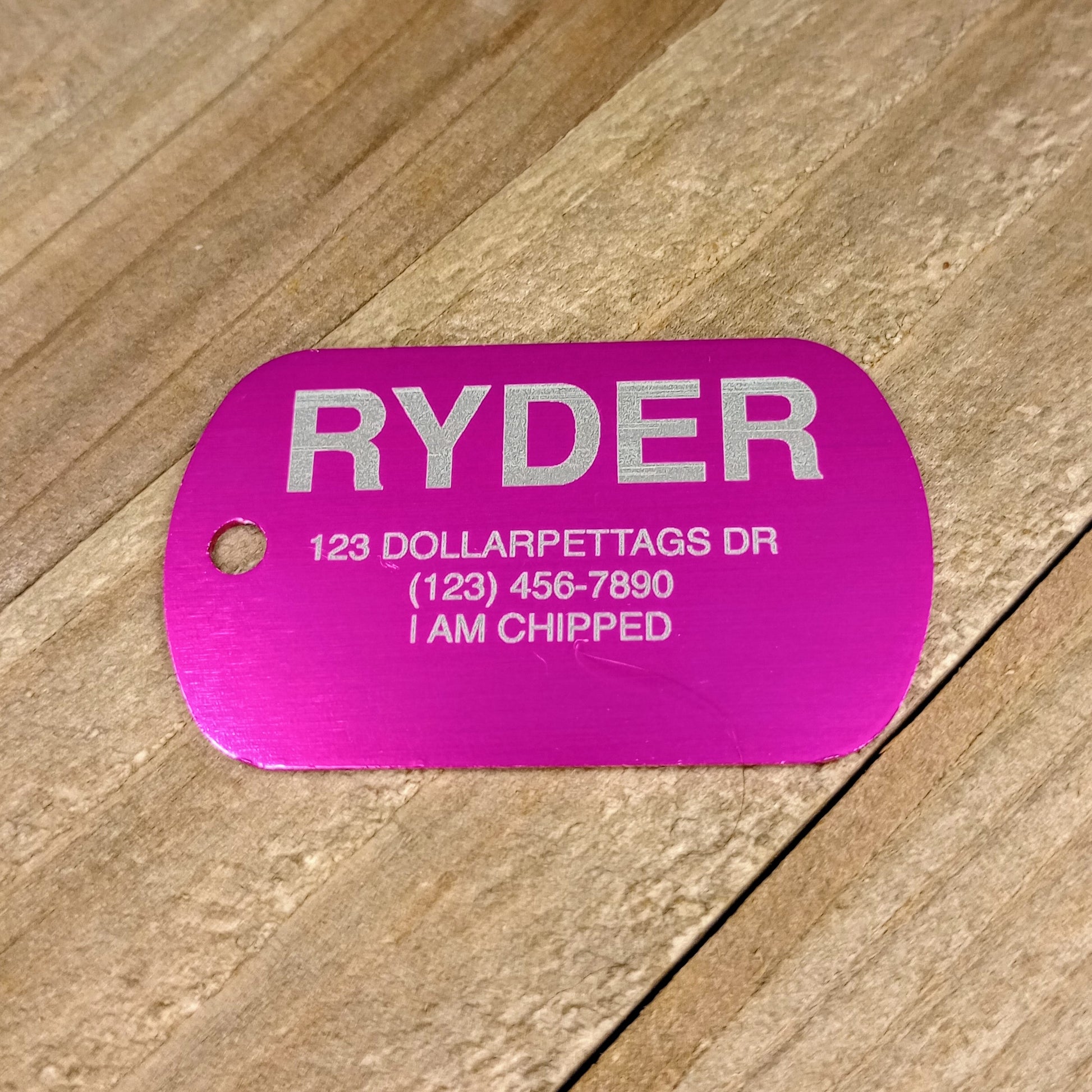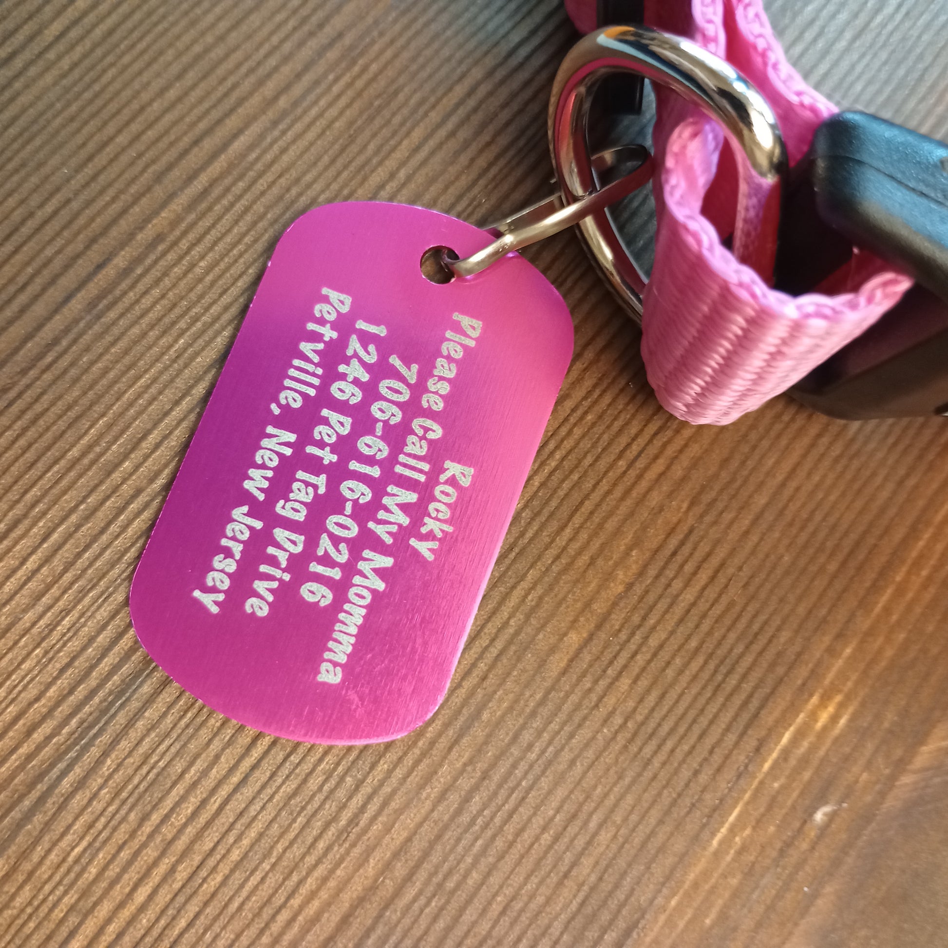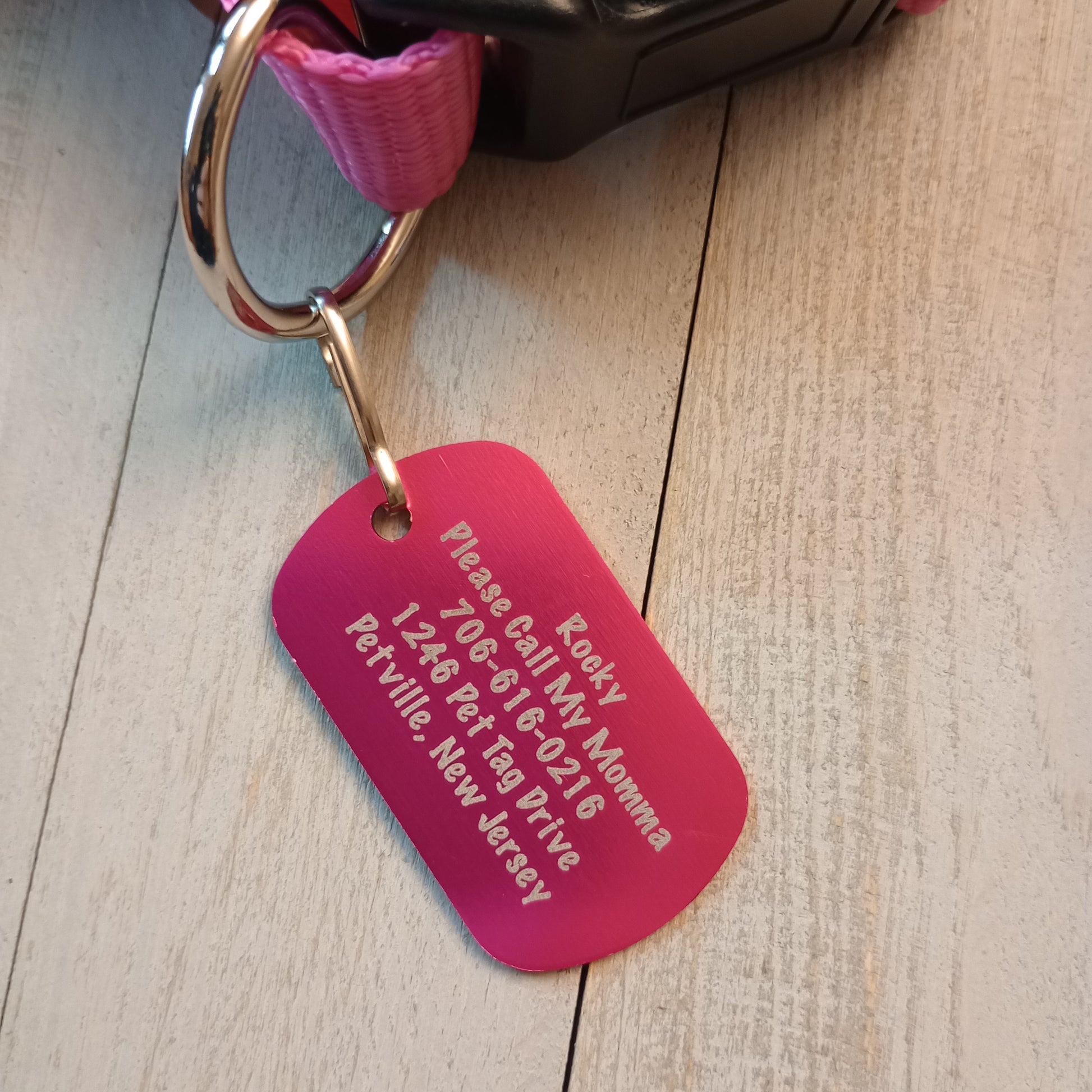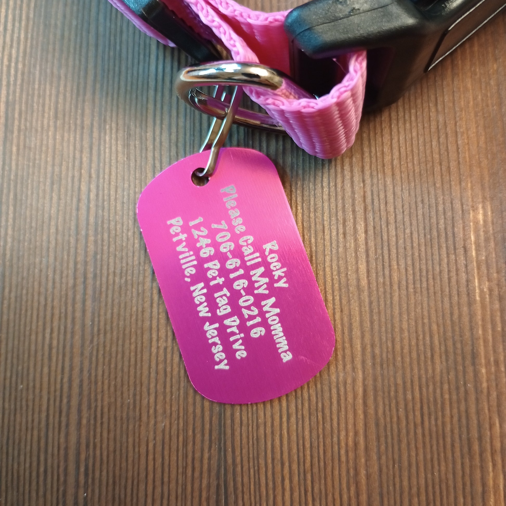 This Pink Military Style Pet Tag is anodized aluminum that allows for 5 lines of text to be engraved lengthwise on the front and 5 lines of text to be engraved lengthwise on the back.