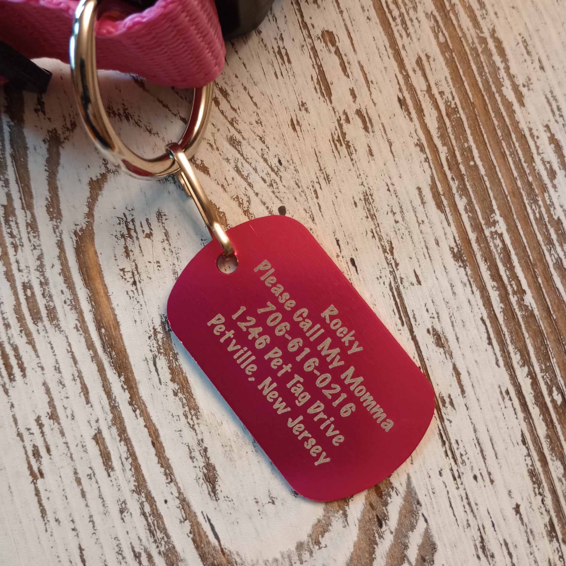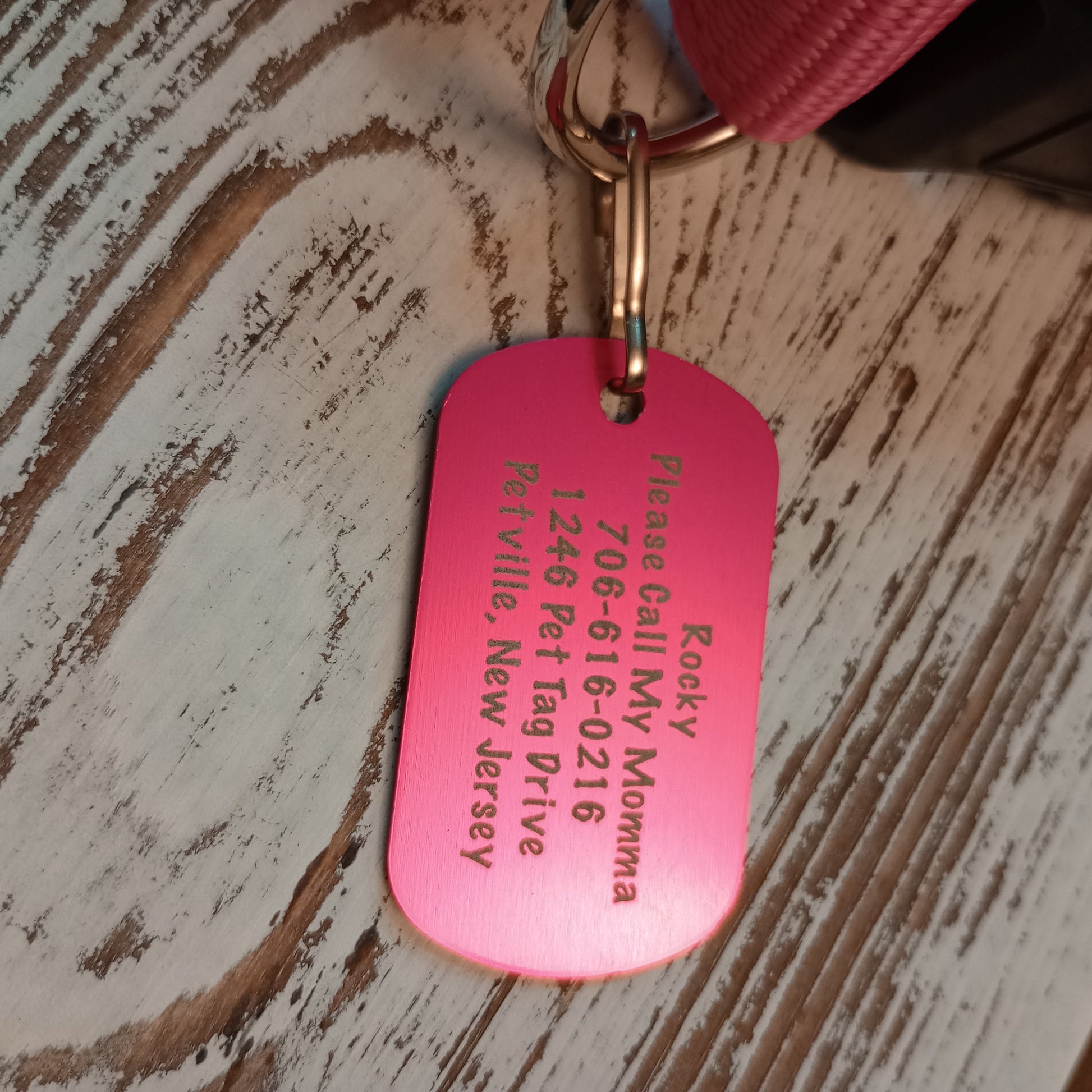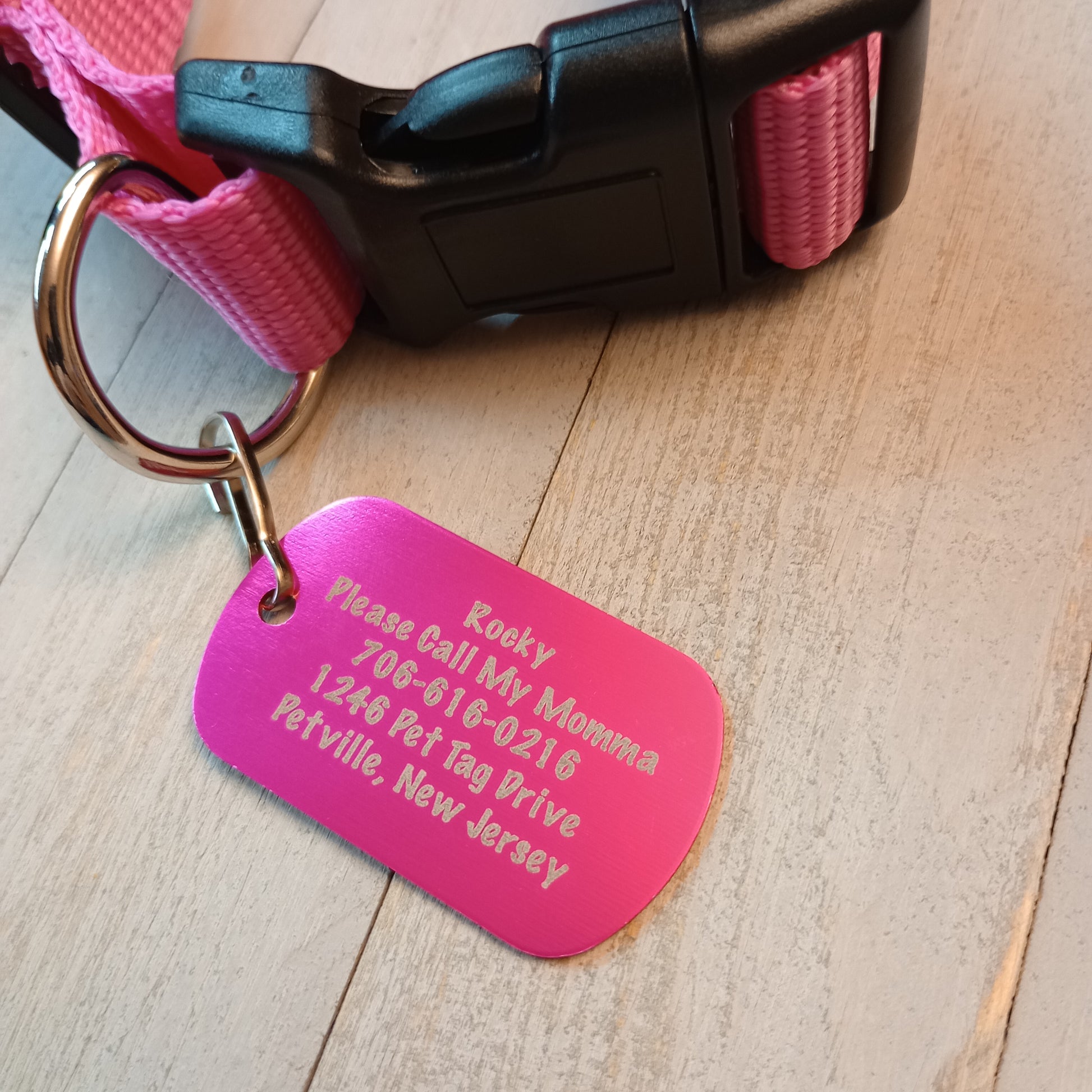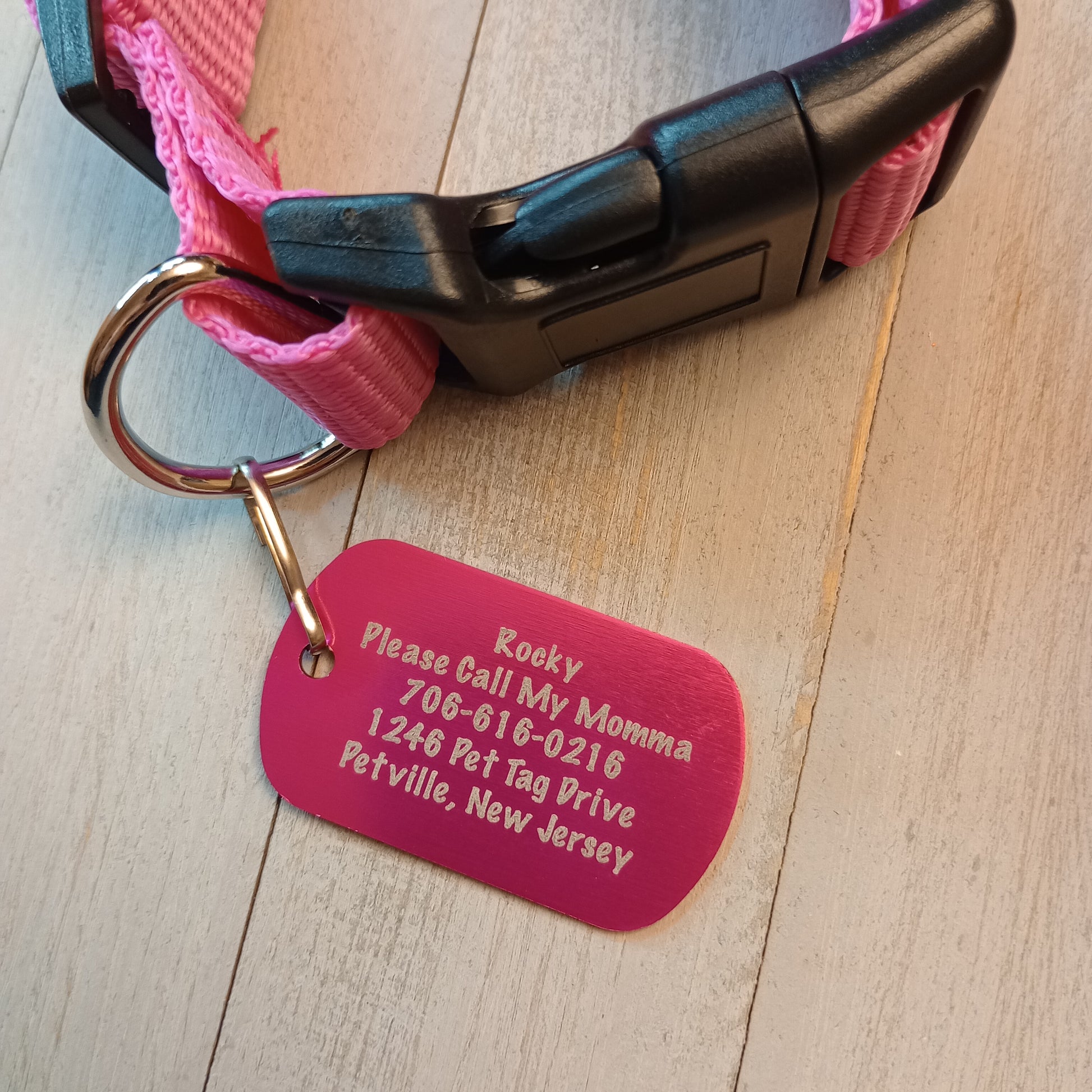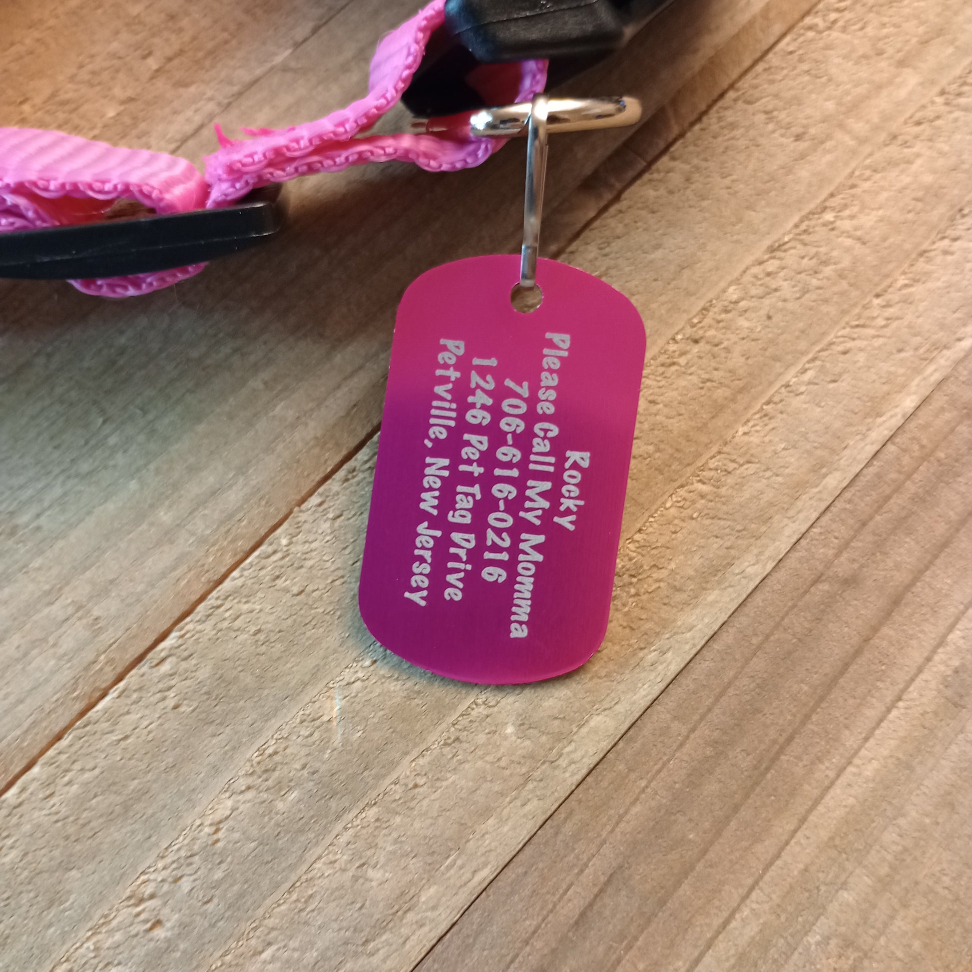 This Pink Military Style Pet Tag is anodized aluminum that allows for 5 lines of text to be engraved lengthwise on the front and 5 lines of text to be engraved lengthwise on the back.