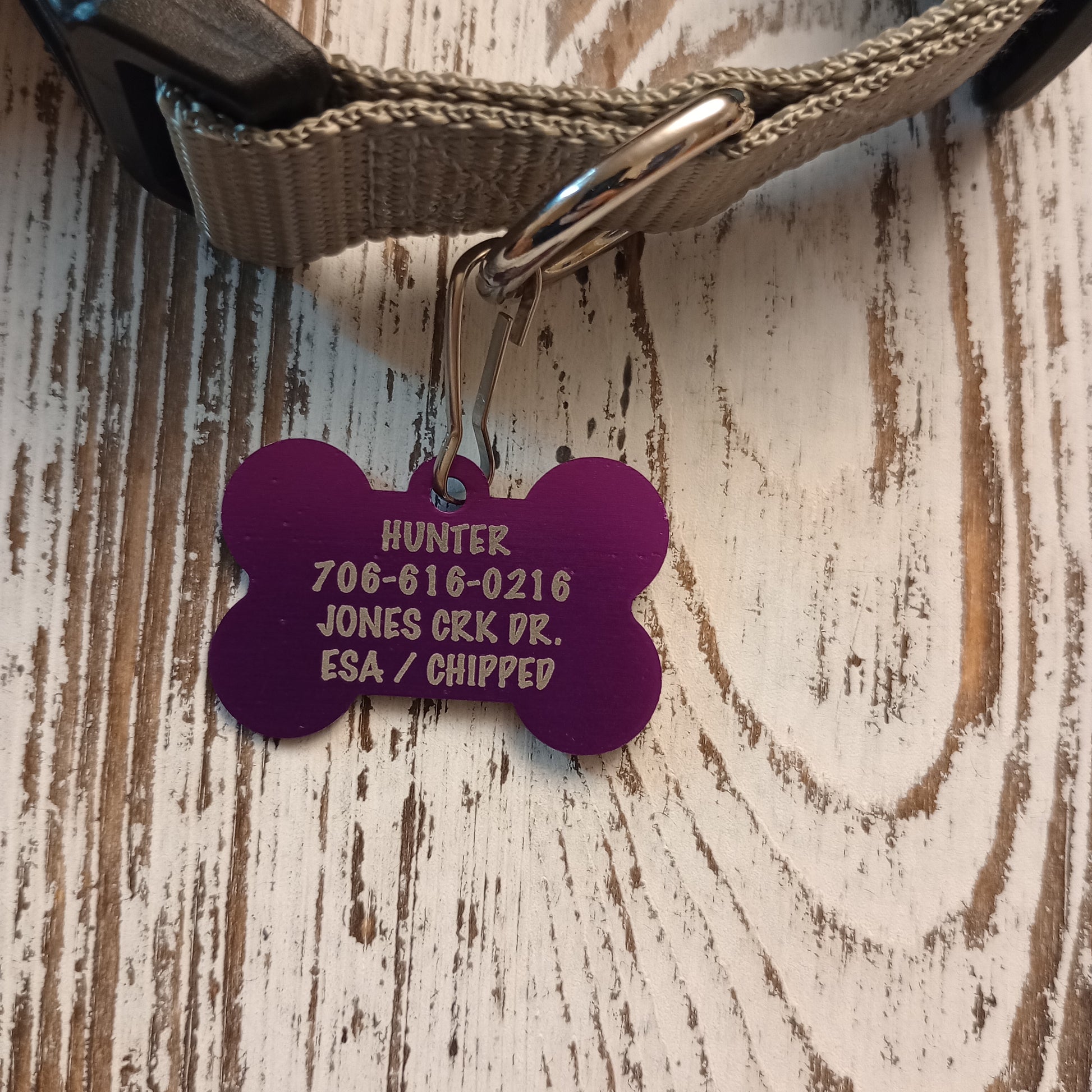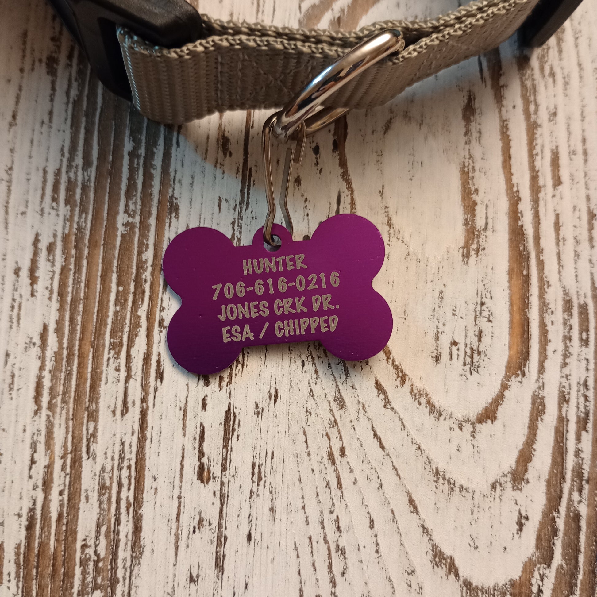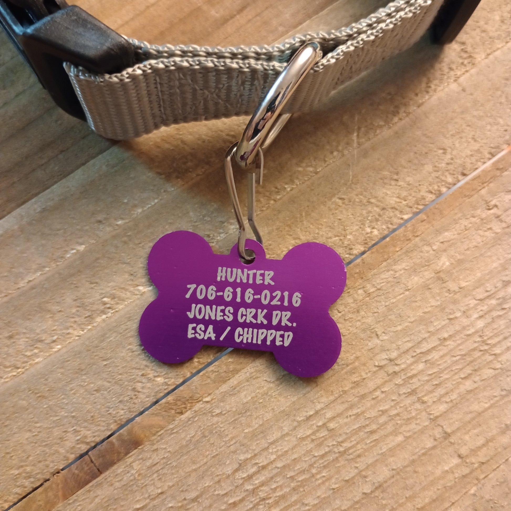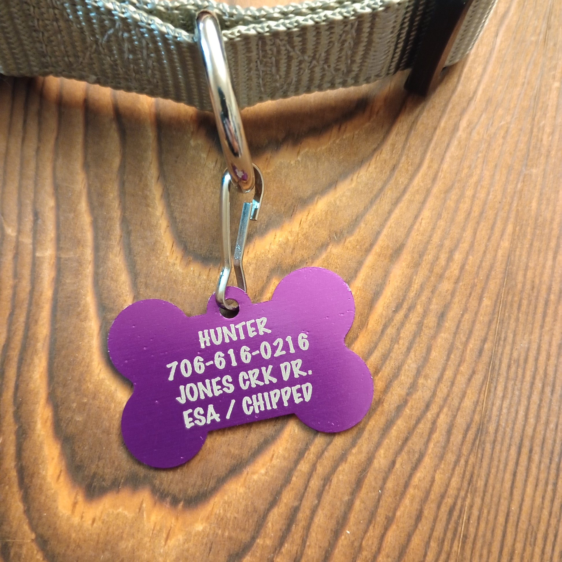 This Purple Bone Shaped Pet Tag is anodized aluminum that allows for 4 lines of text on the front and 4 lines of text on the back.