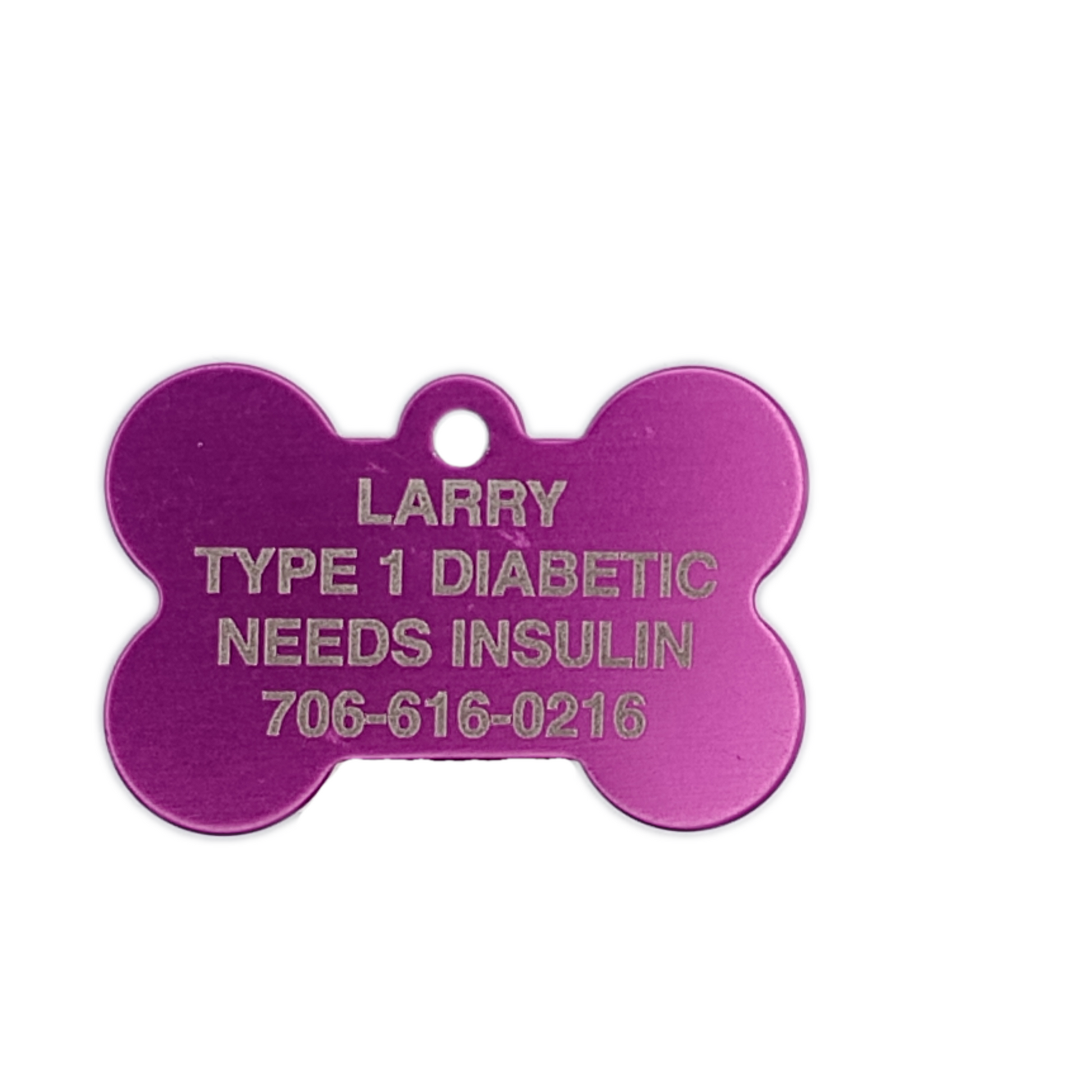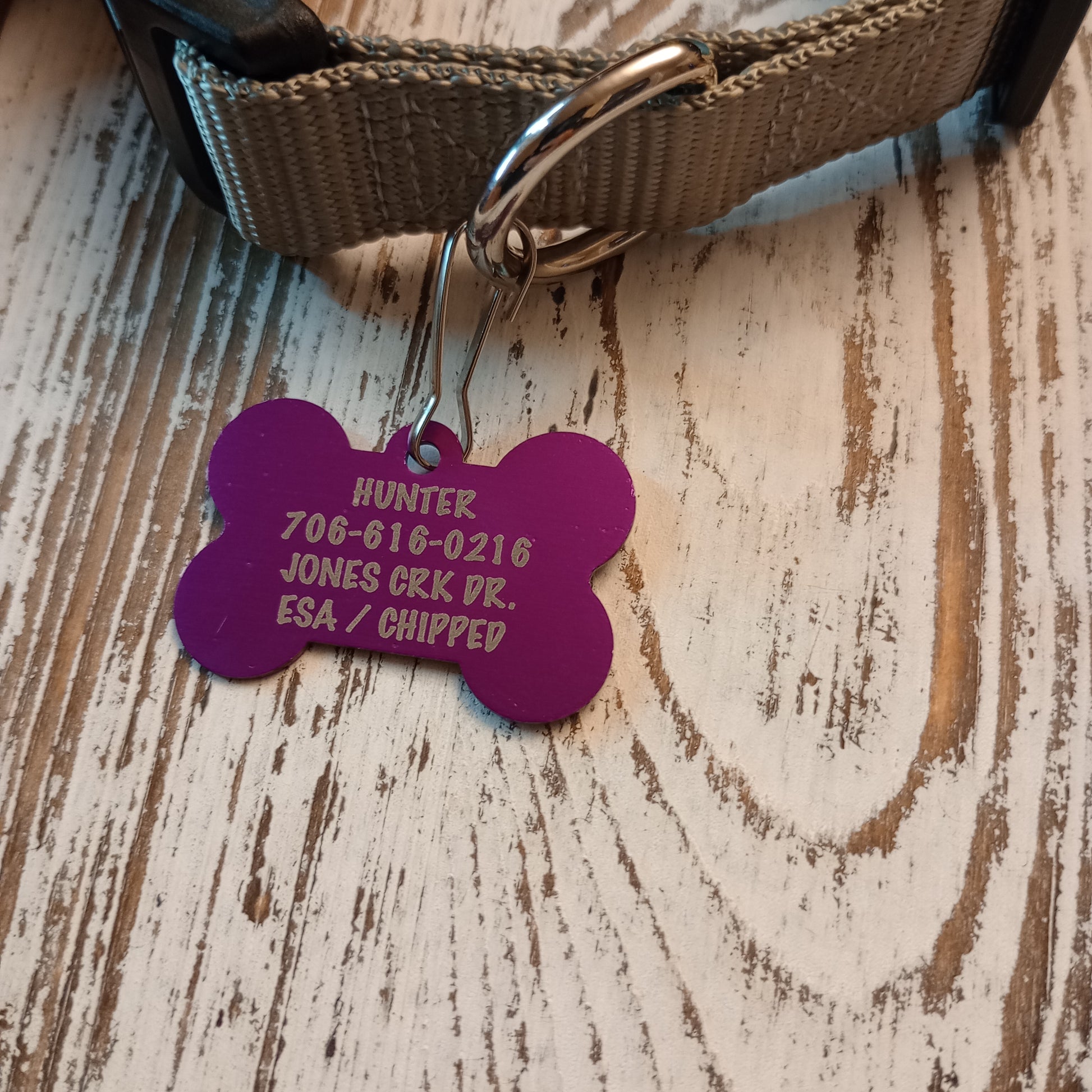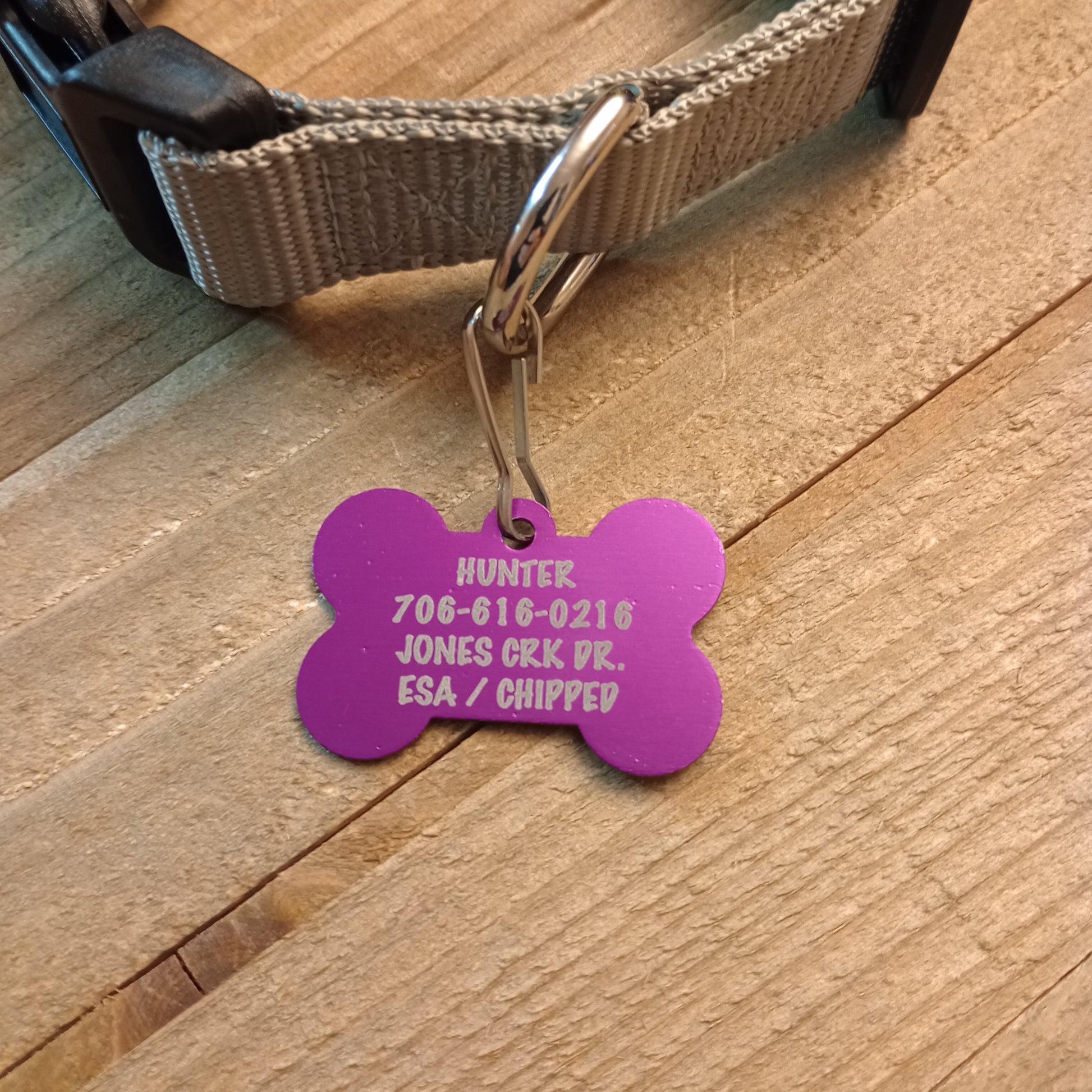 This Purple Bone Shaped Pet Tag is anodized aluminum that allows for 4 lines of text on the front and 4 lines of text on the back.