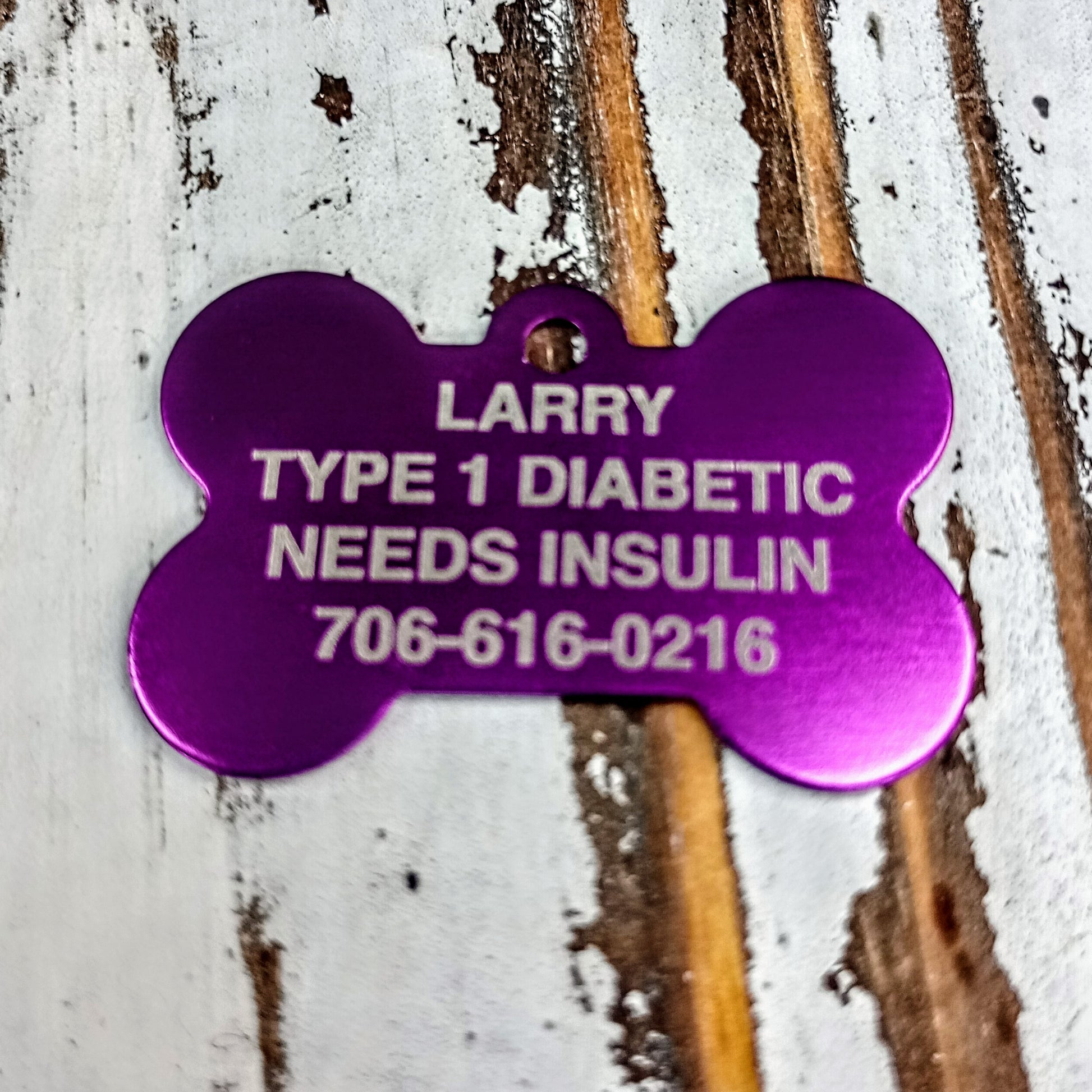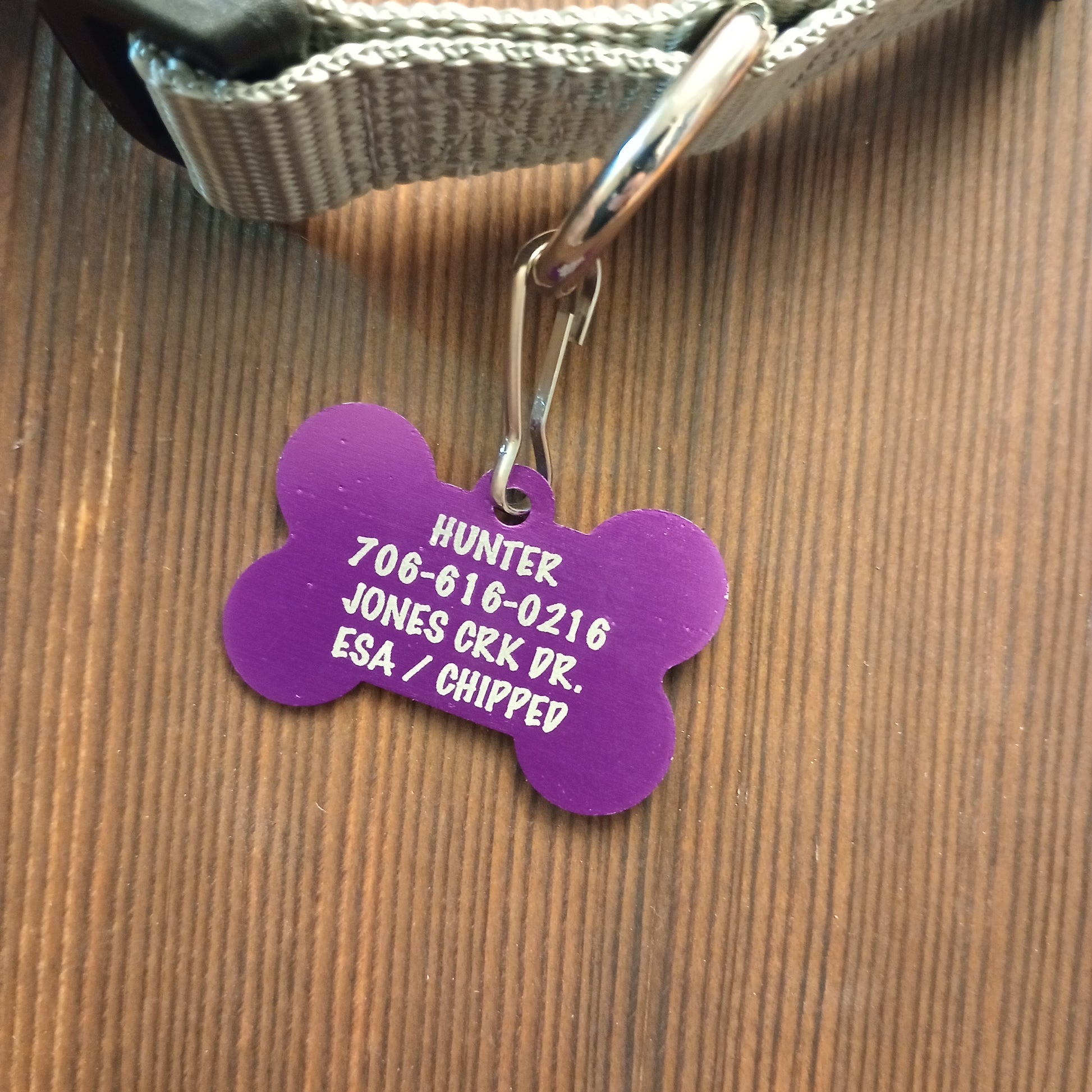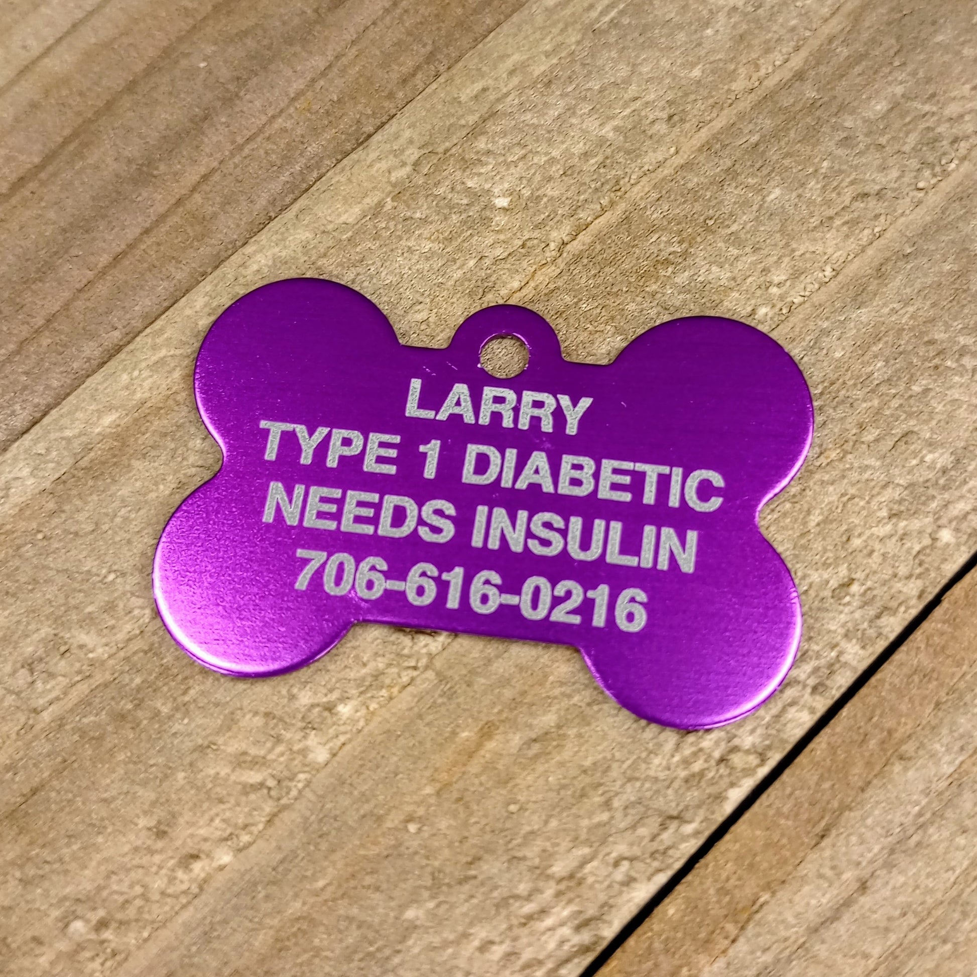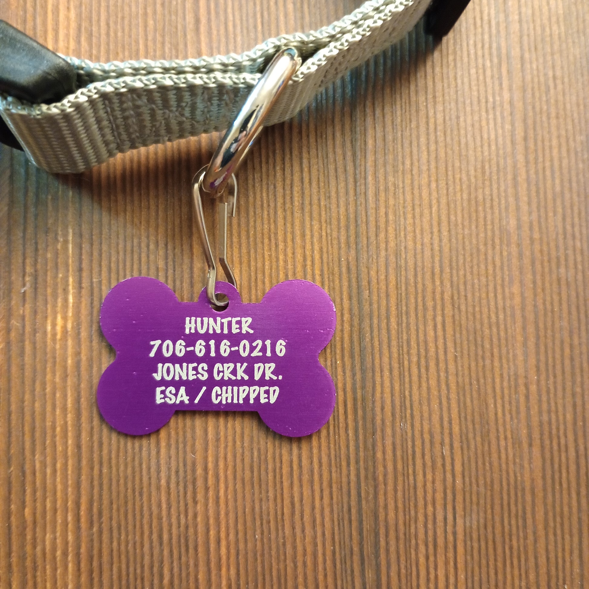 This Purple Bone Shaped Pet Tag is anodized aluminum that allows for 4 lines of text on the front and 4 lines of text on the back.