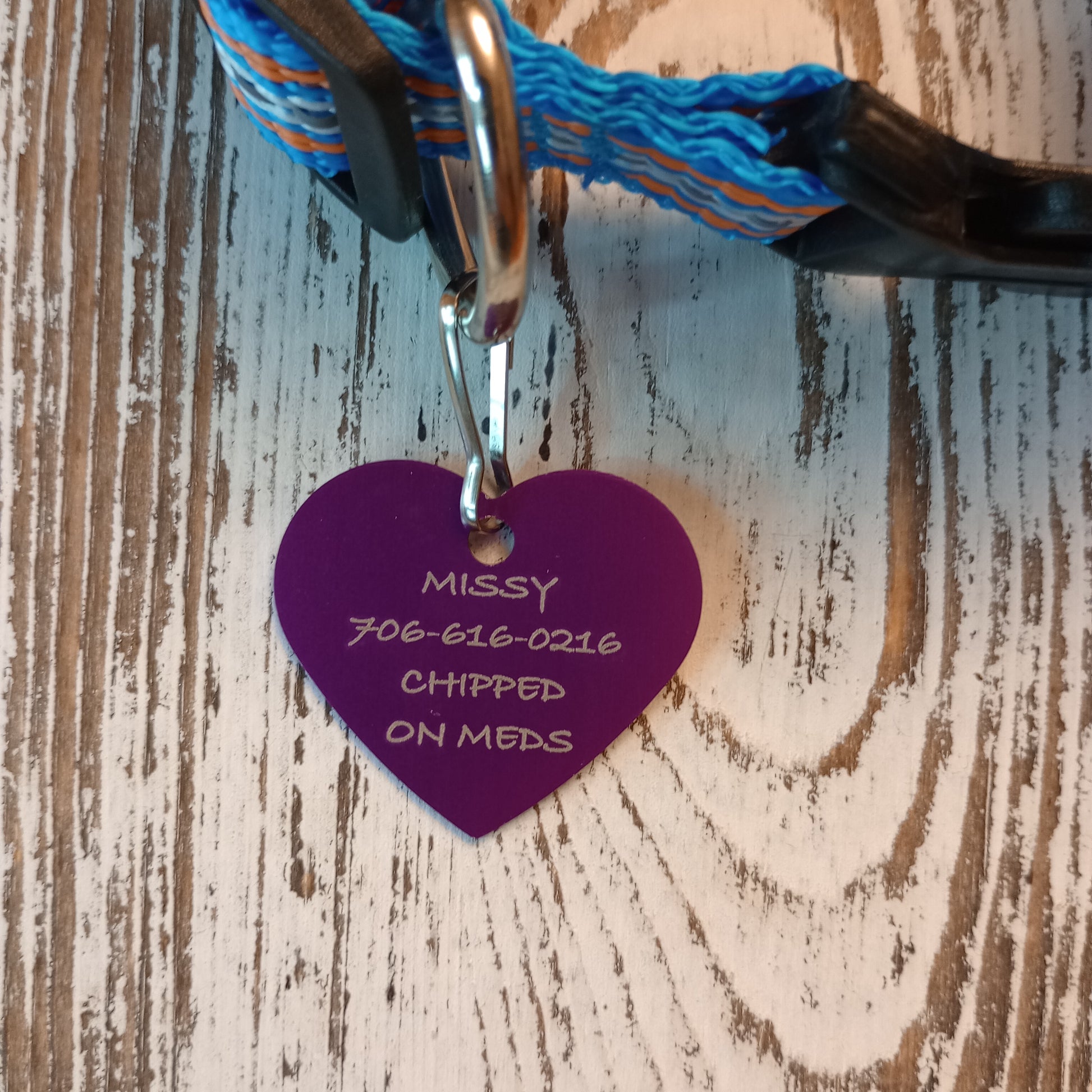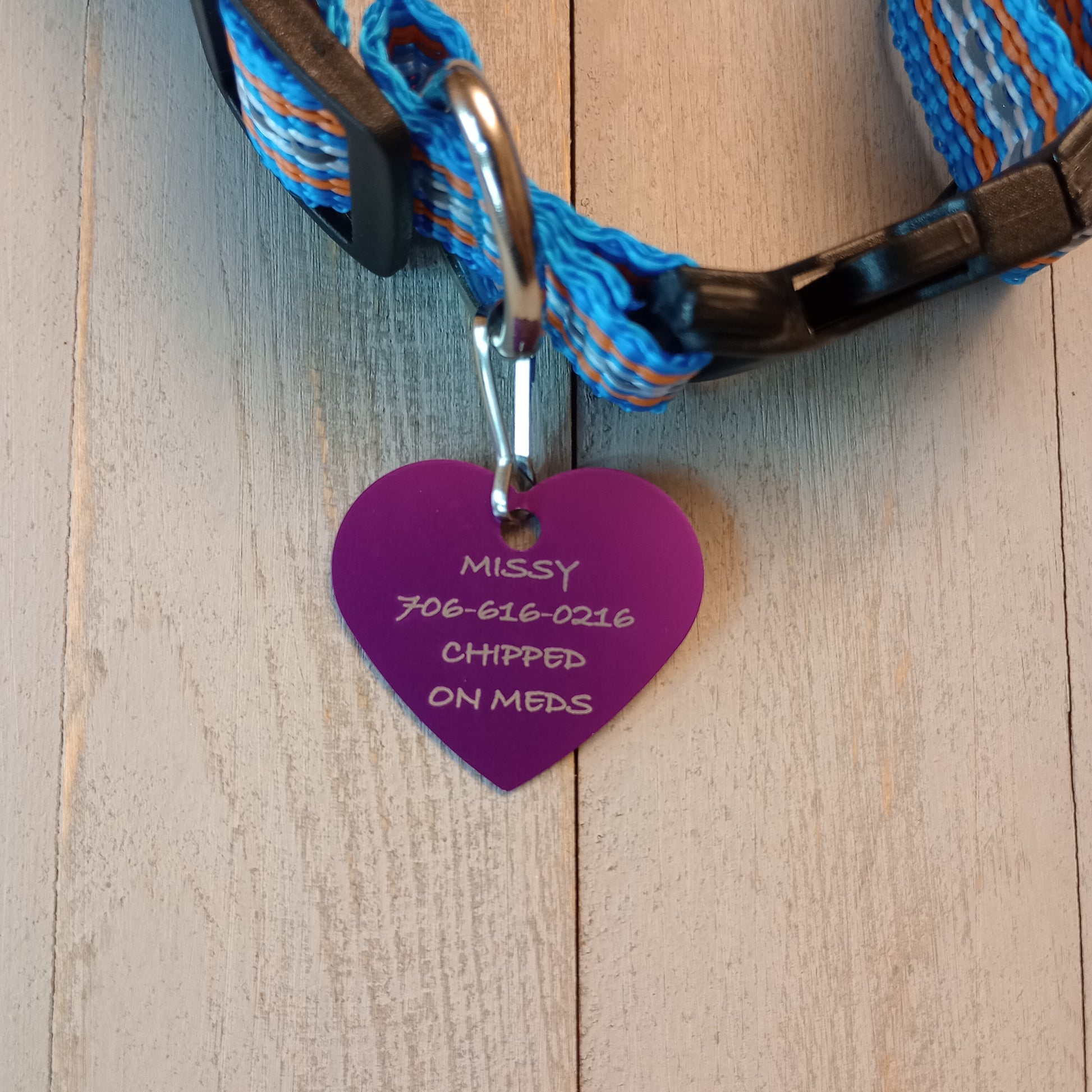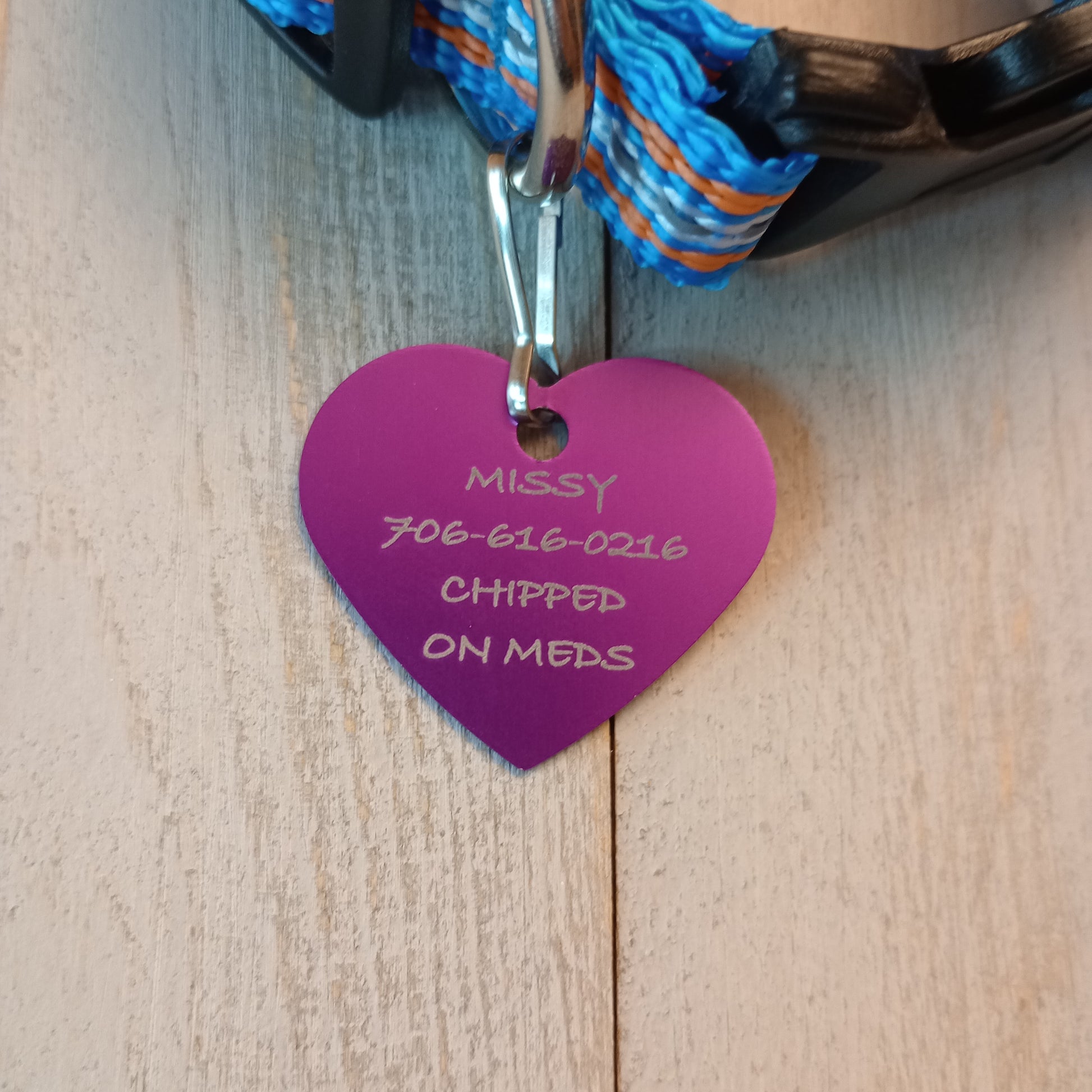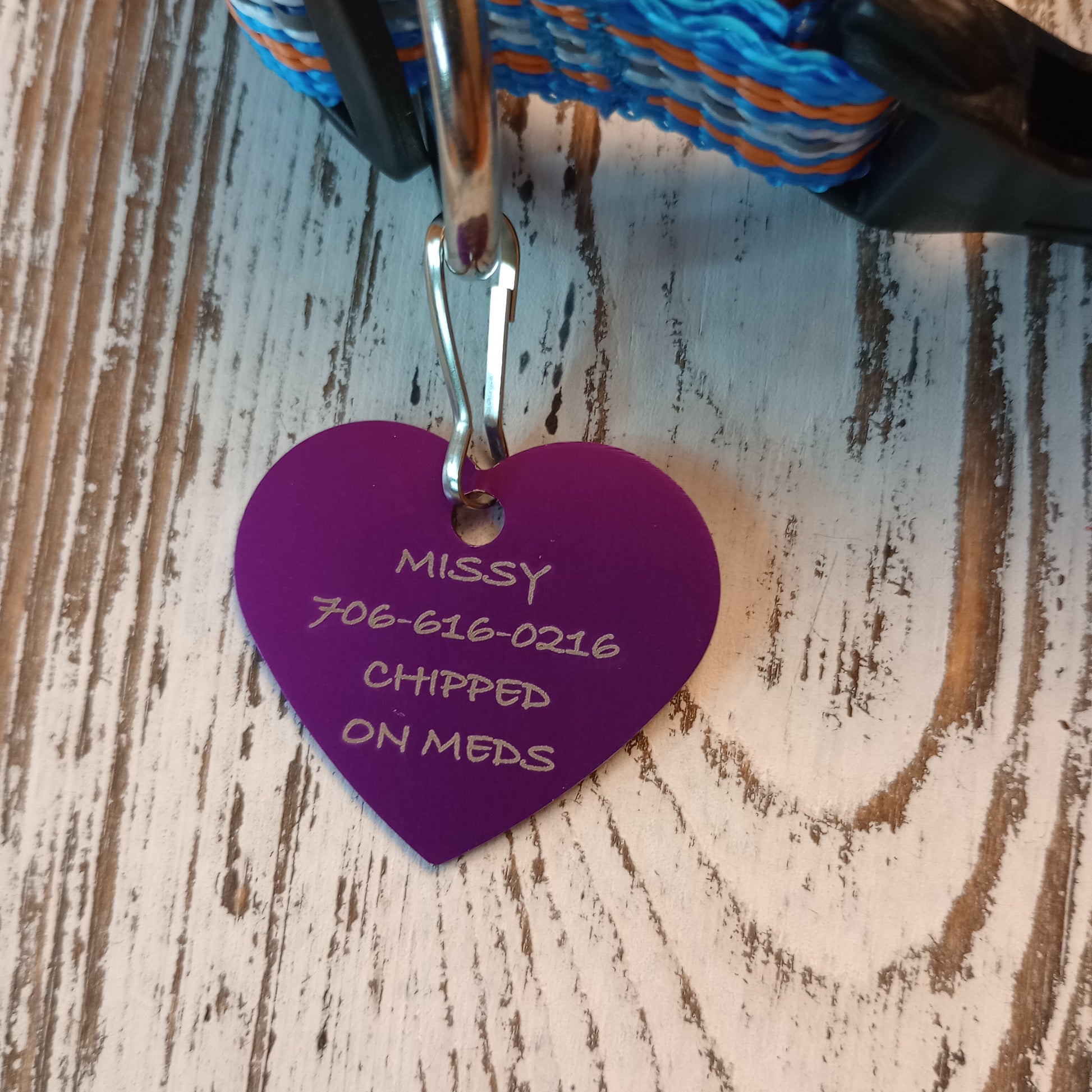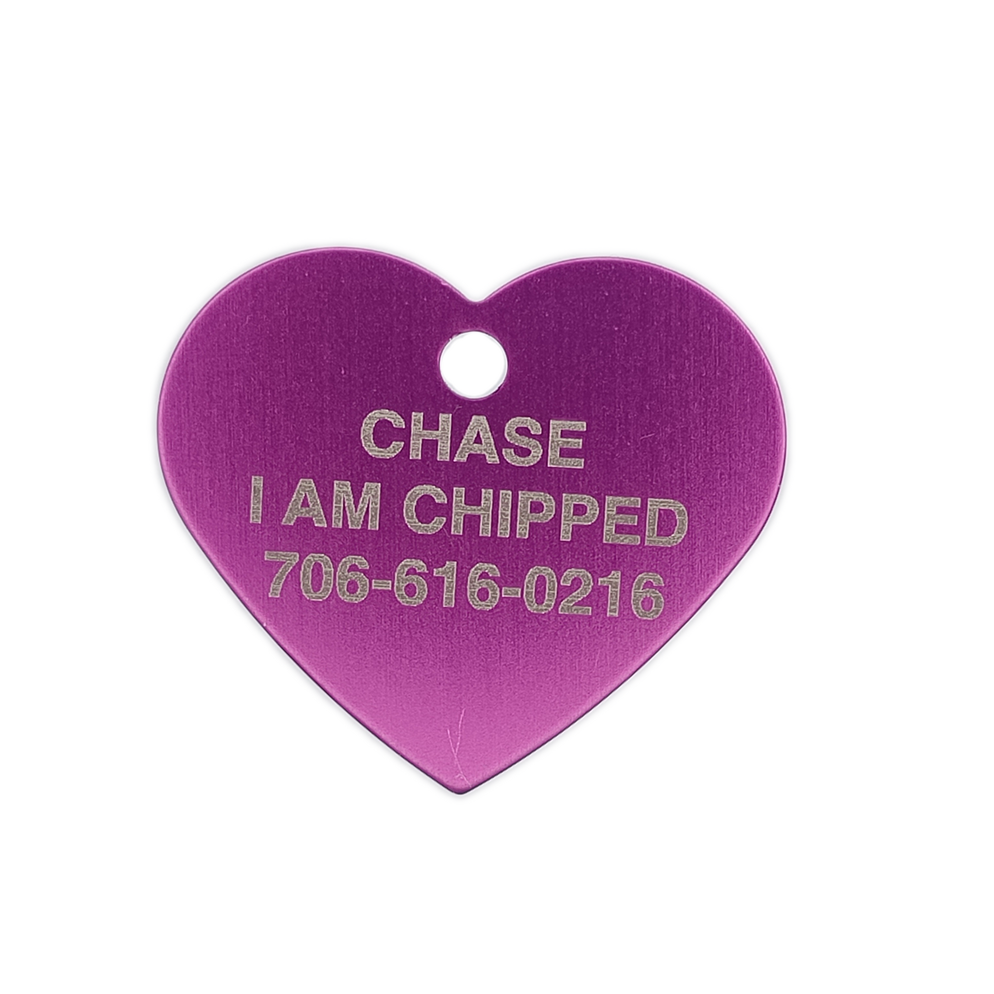 This Purple Heart Shaped Pet Tag is anodized aluminum that allows for 4 lines of text to be engraved on the front and lines of text to be engraved on the back.