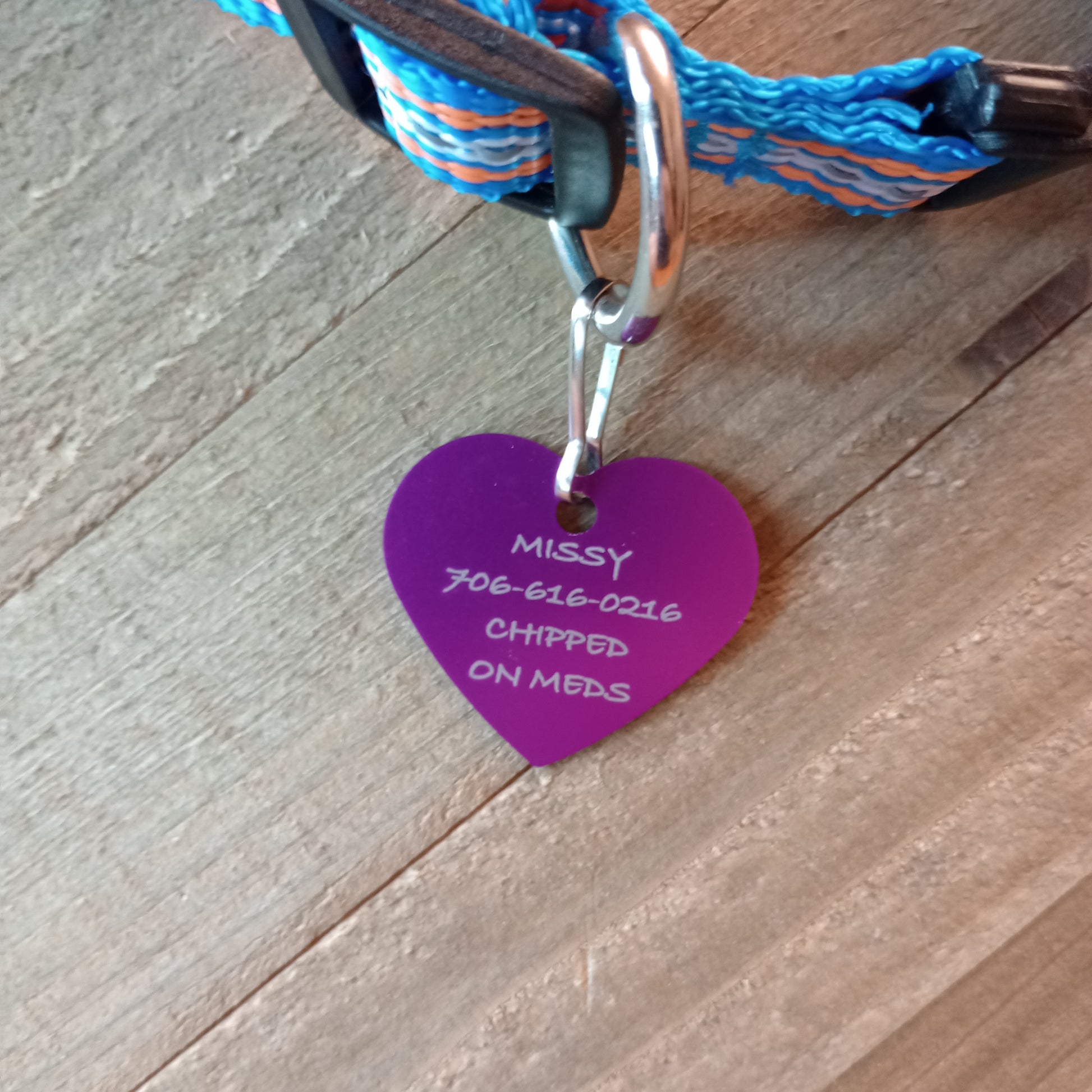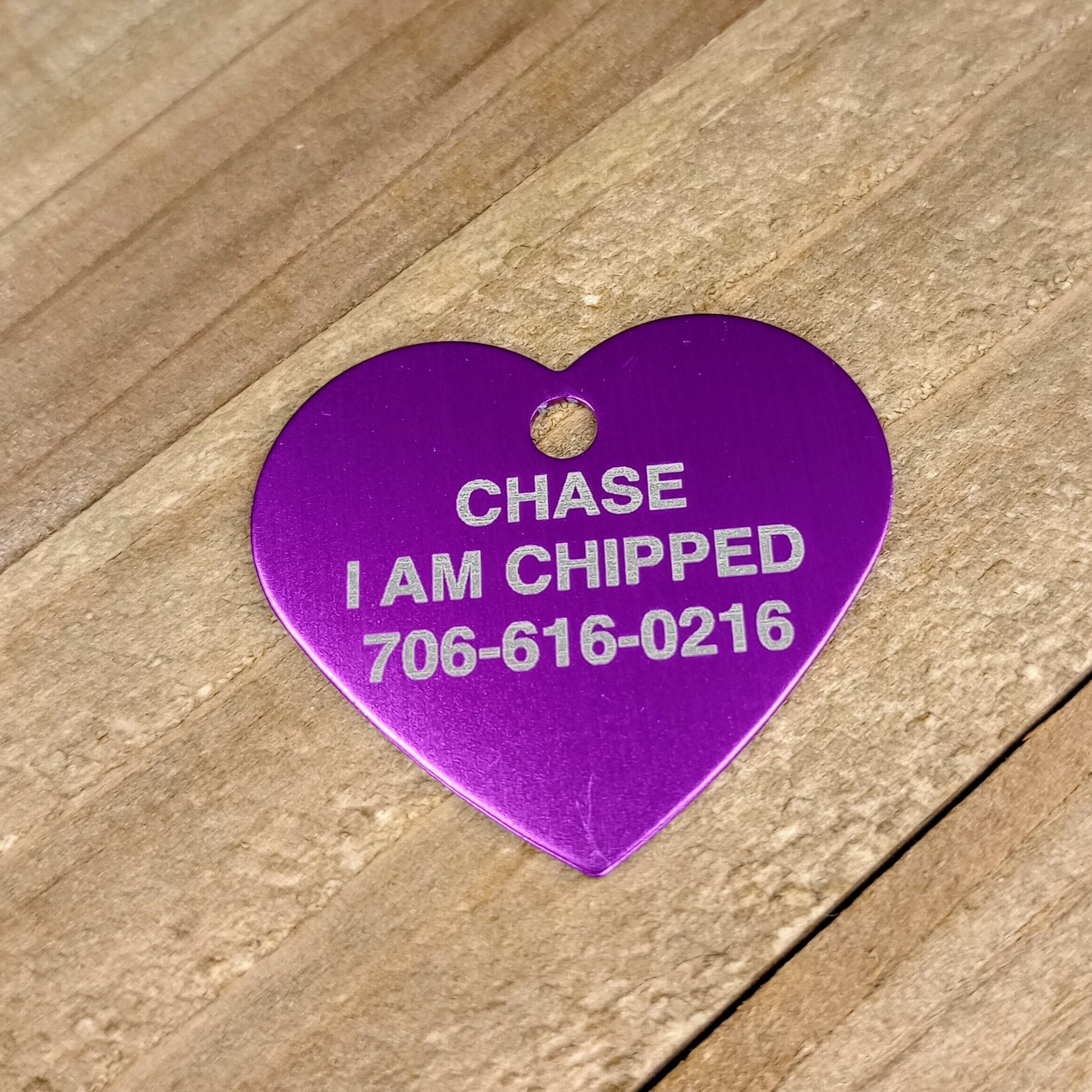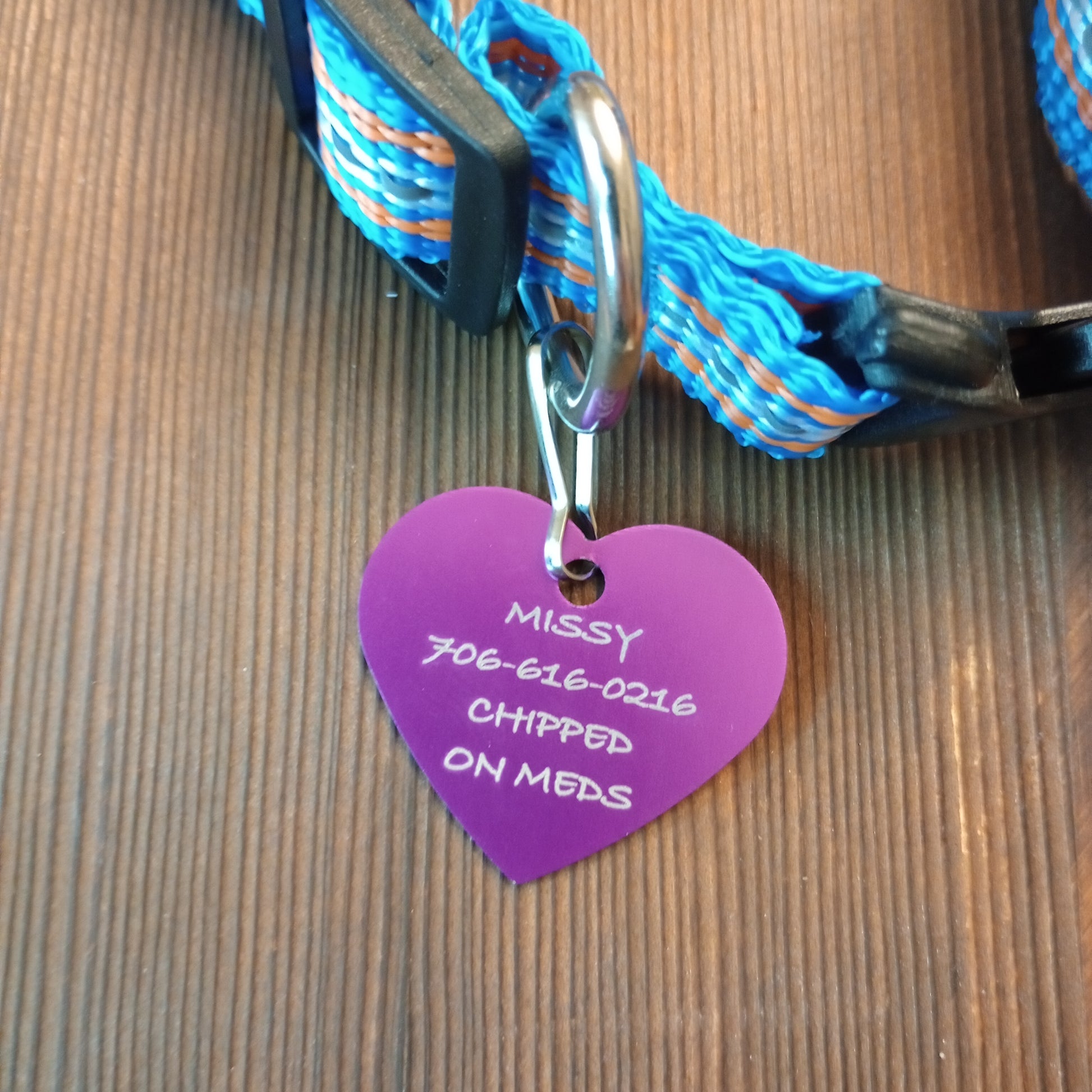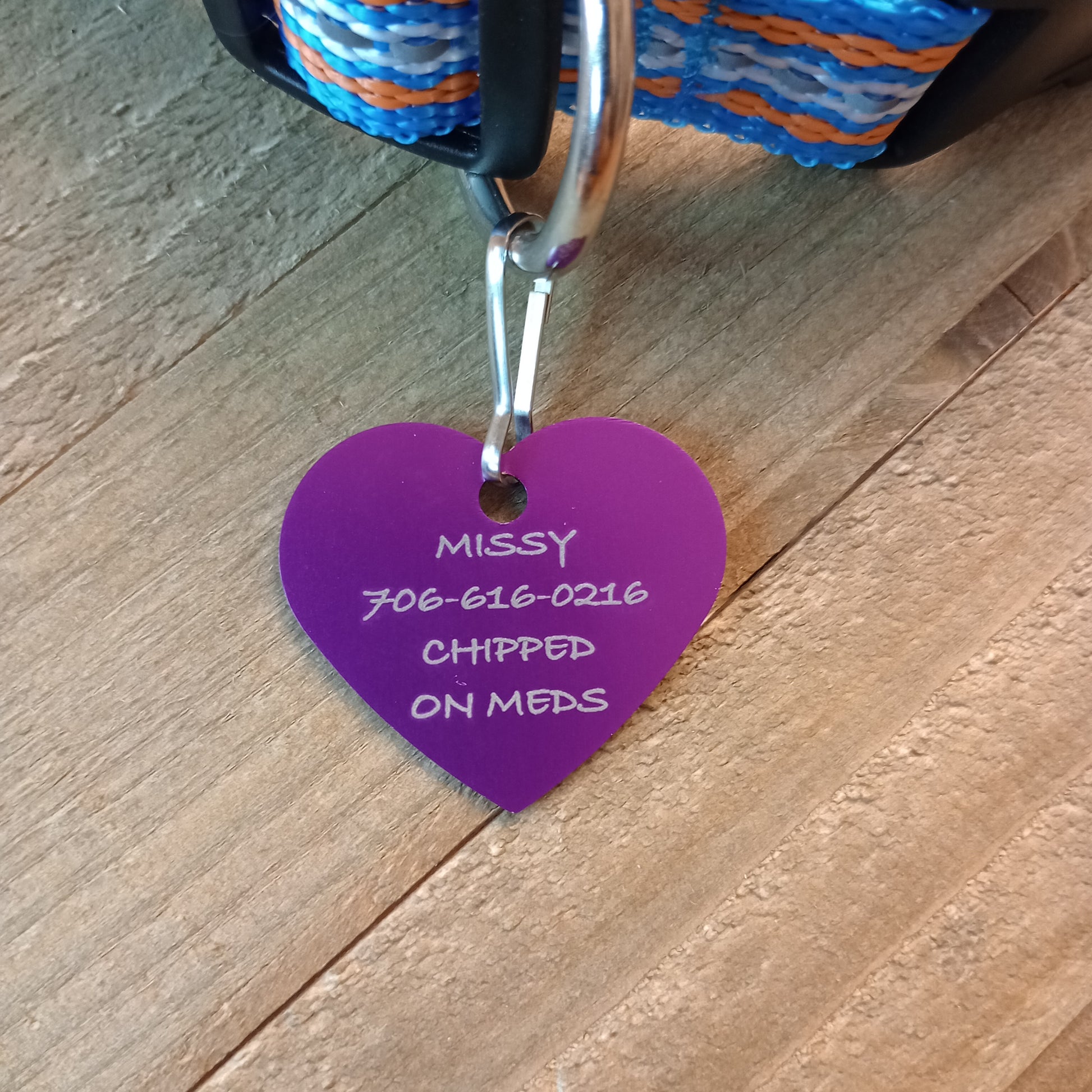 This Purple Heart Shaped Pet Tag is anodized aluminum that allows for 4 lines of text to be engraved on the front and lines of text to be engraved on the back.