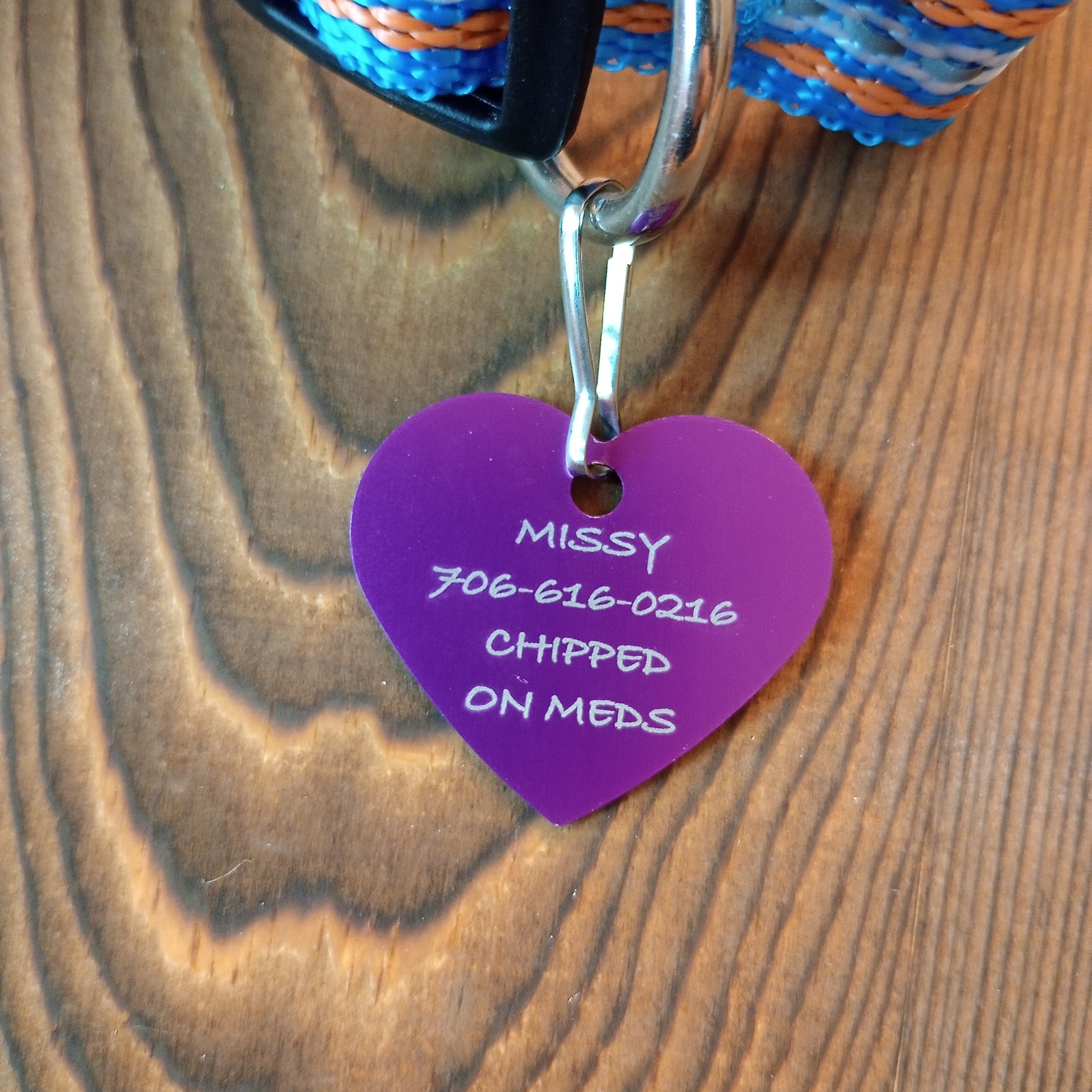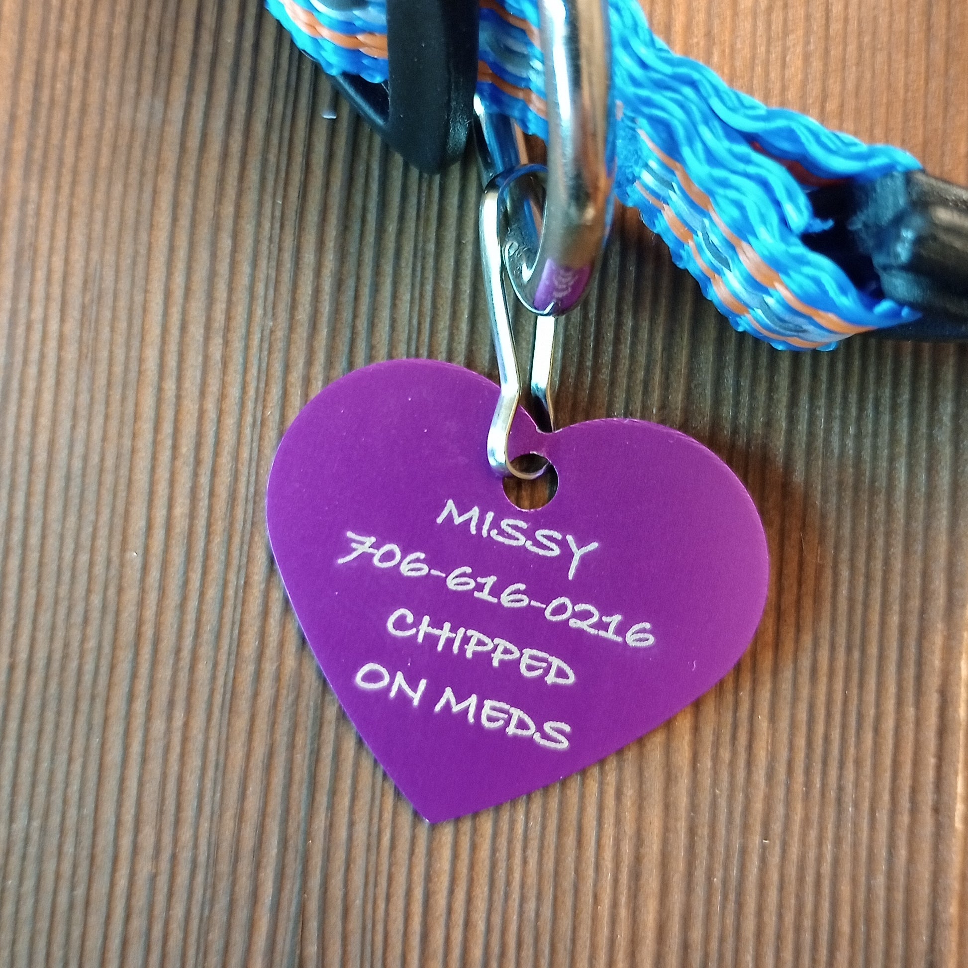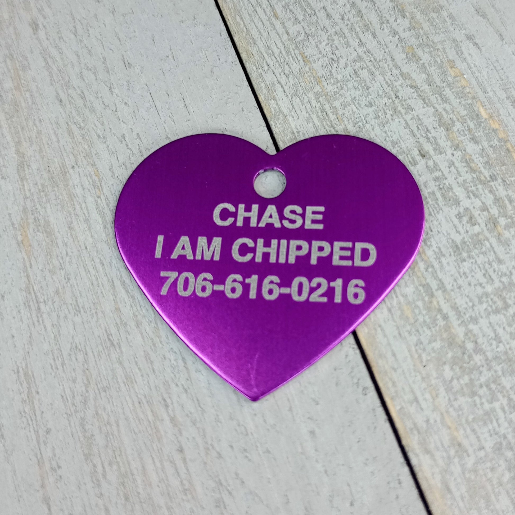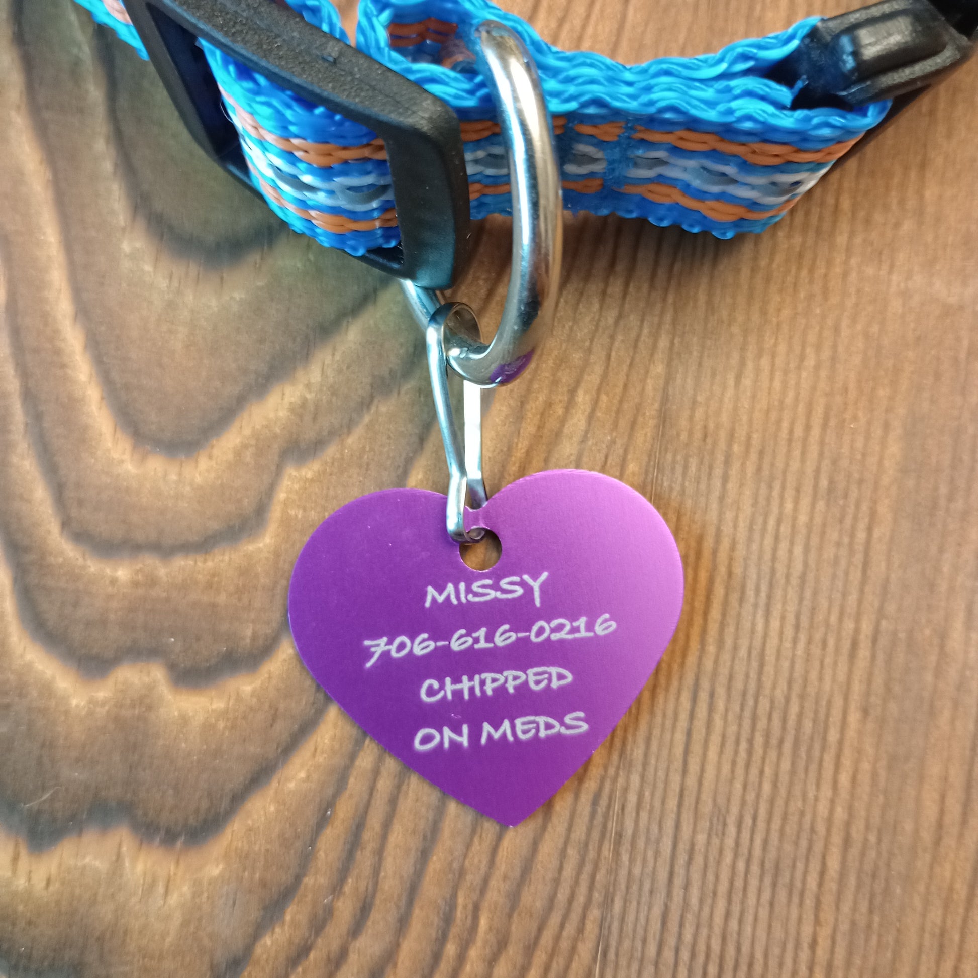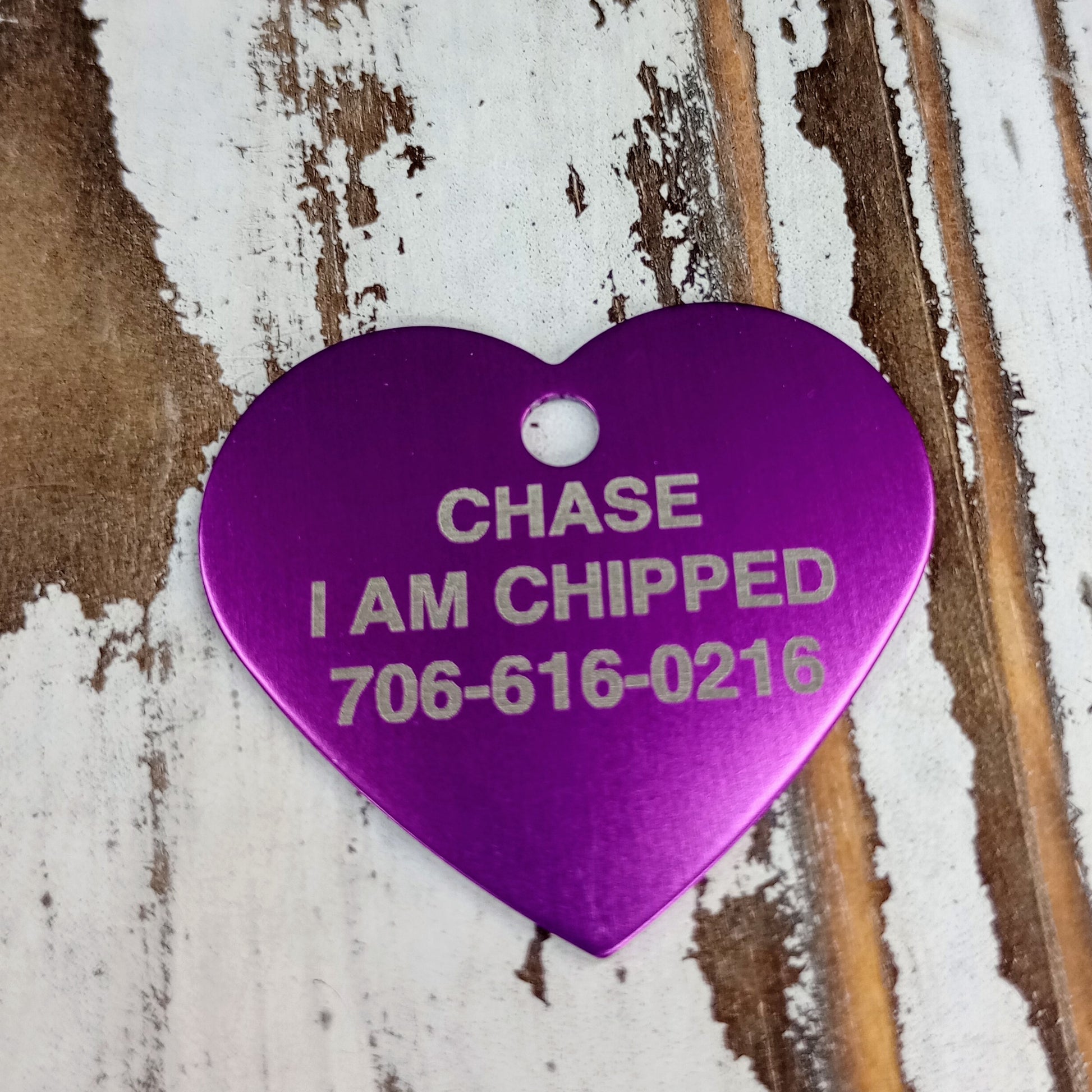 This Purple Heart Shaped Pet Tag is anodized aluminum that allows for 4 lines of text to be engraved on the front and lines of text to be engraved on the back.