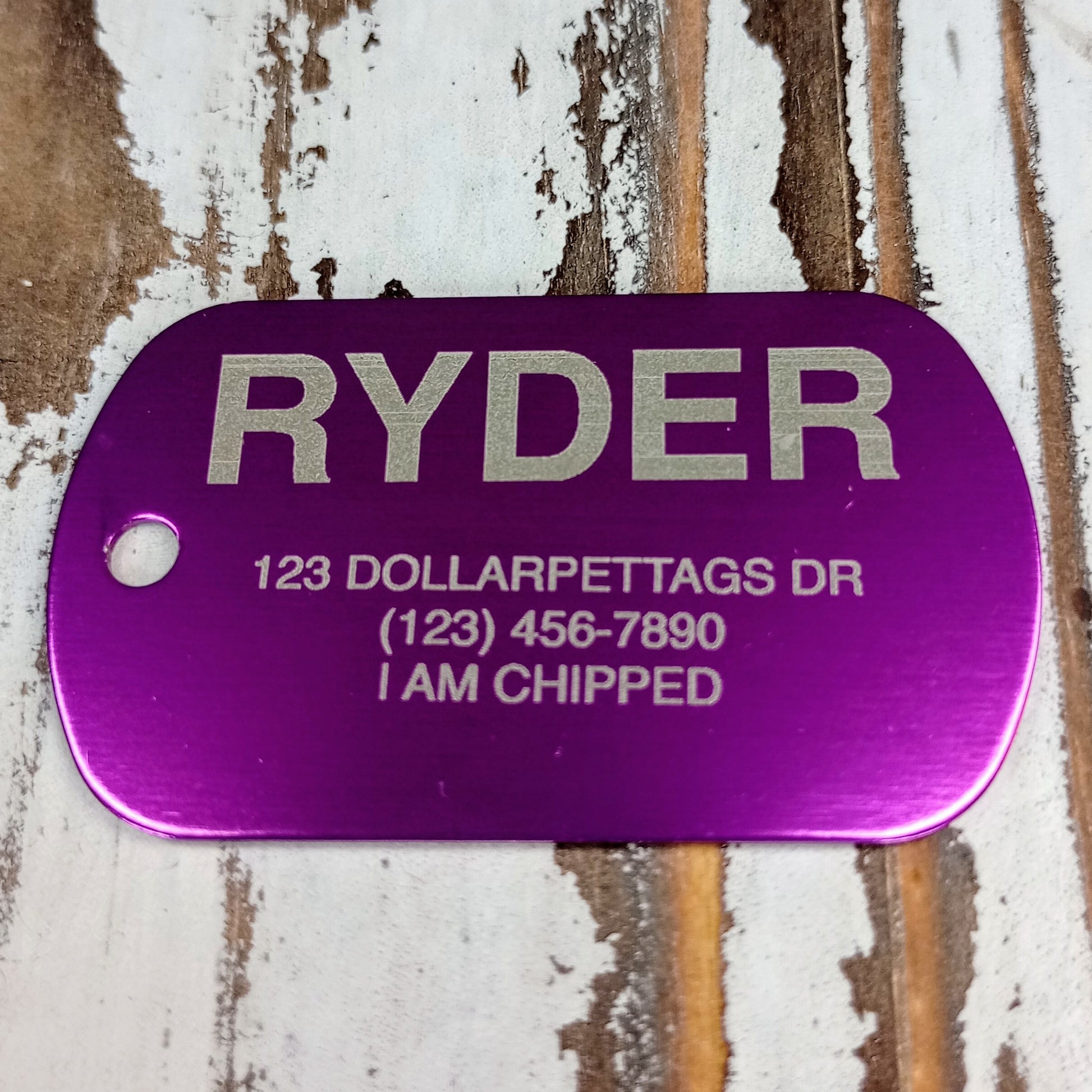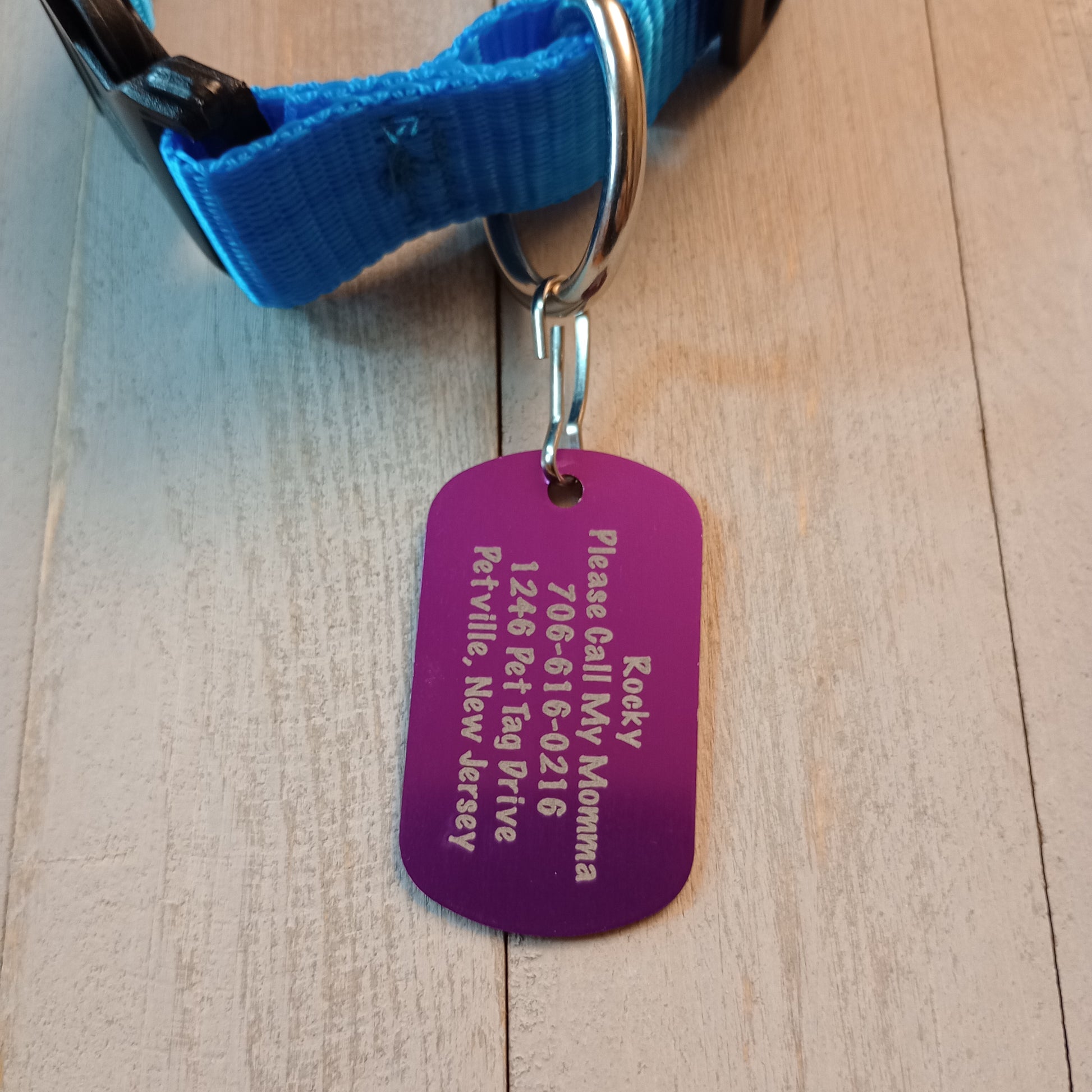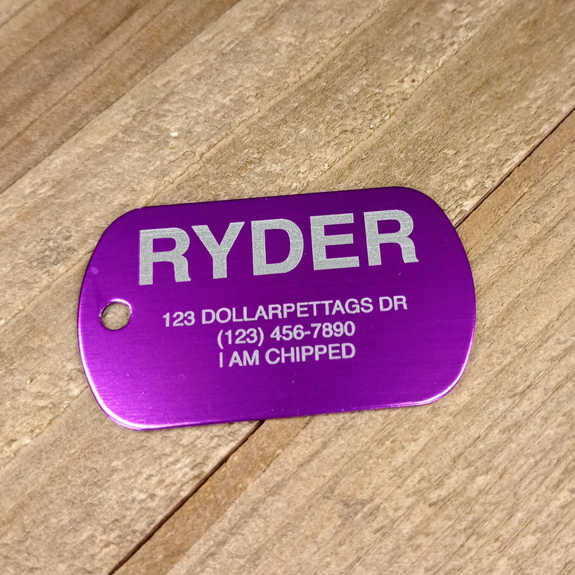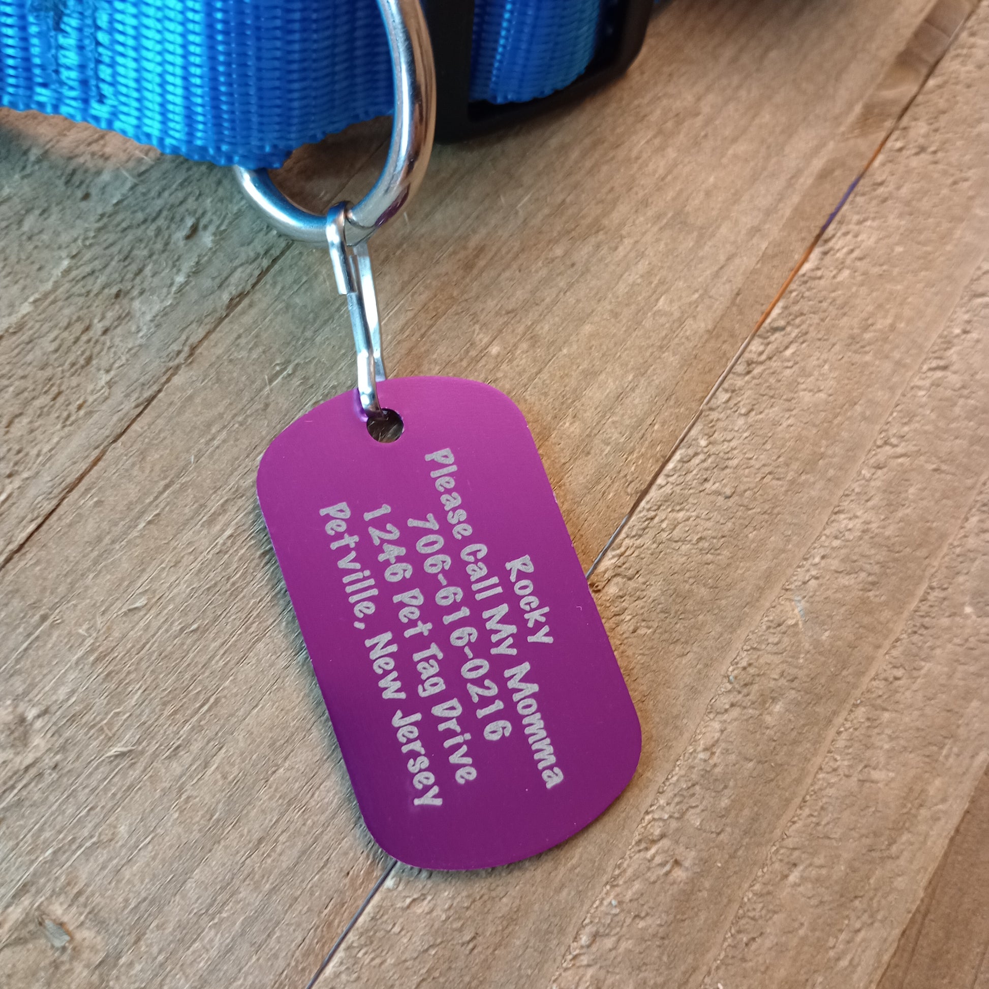 This Purple Military Style Pet Tag is anodized aluminum that allows for 5 lines of text to be engraved lengthwise on the front and 5 lines of text to be engraved lengthwise on the back.