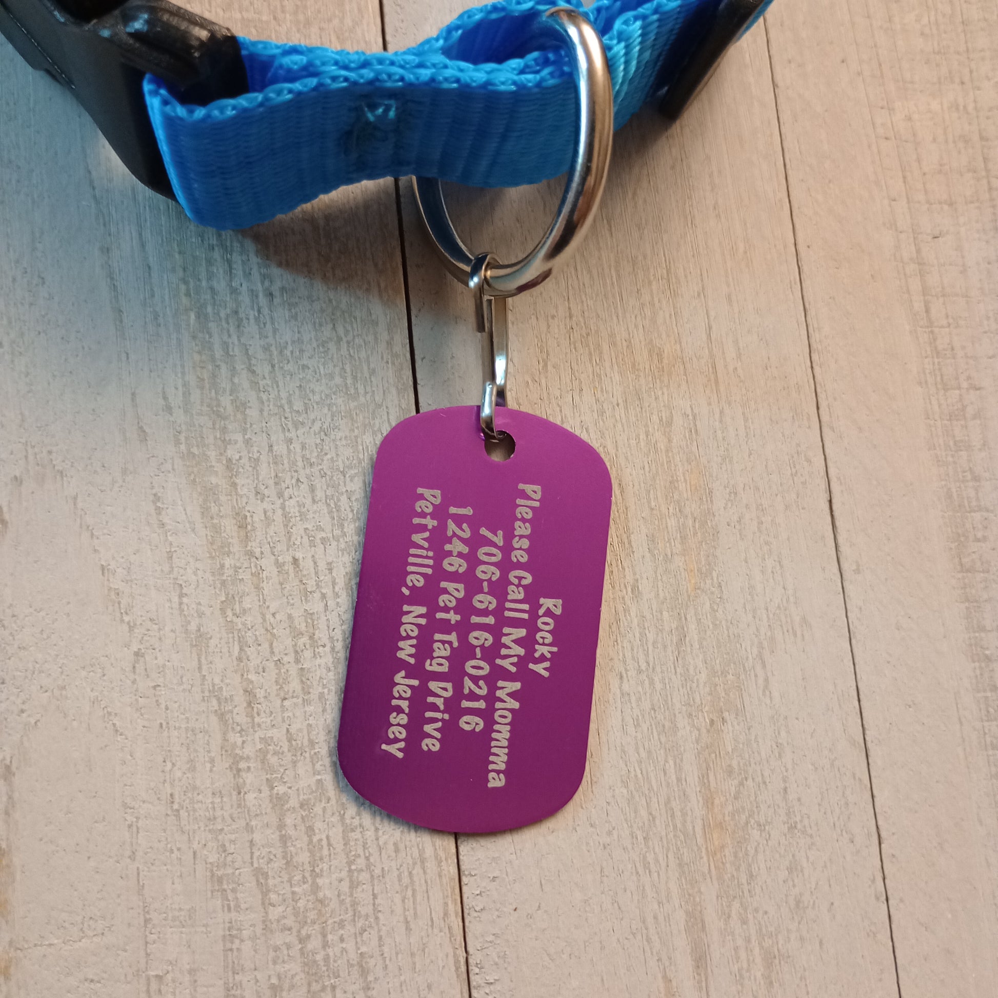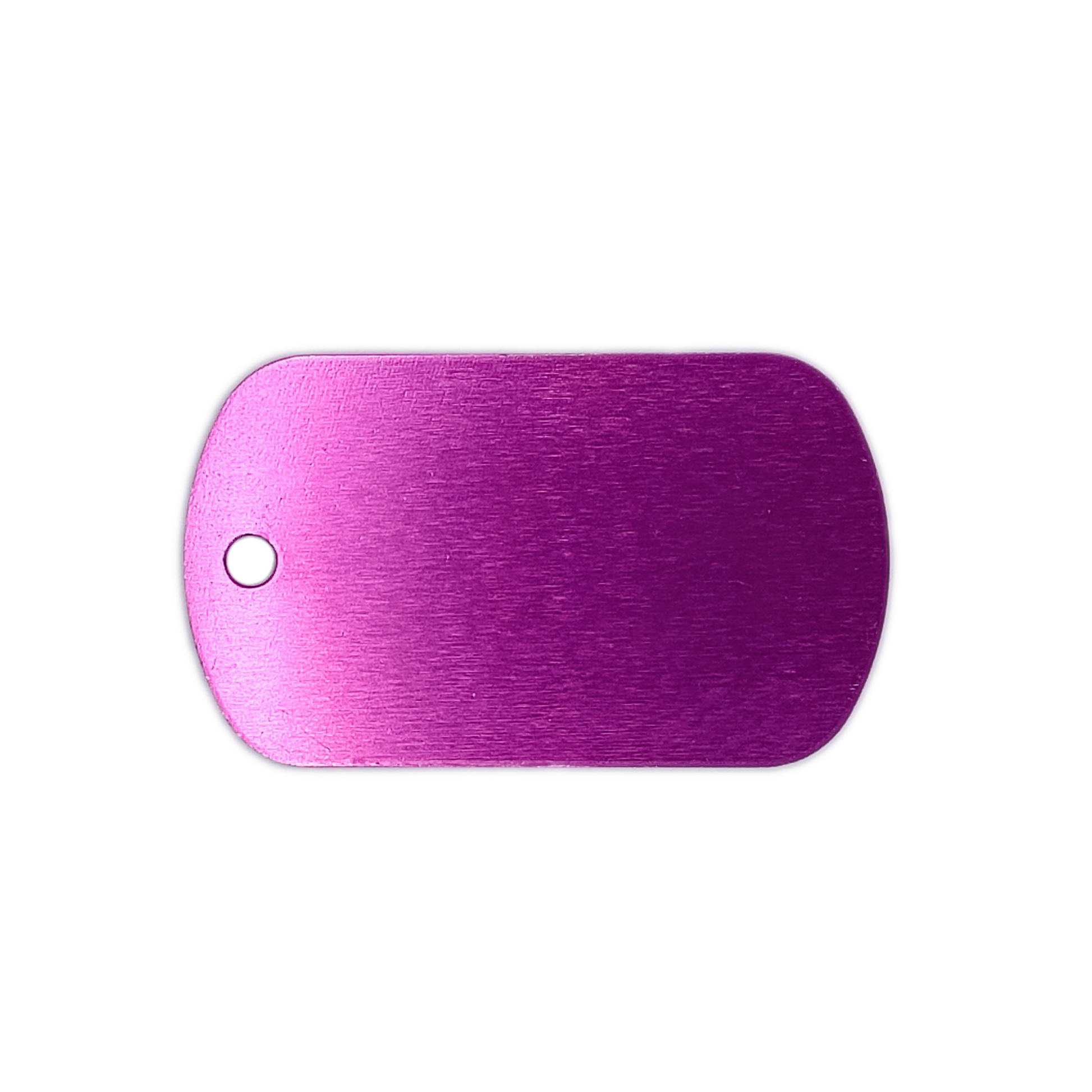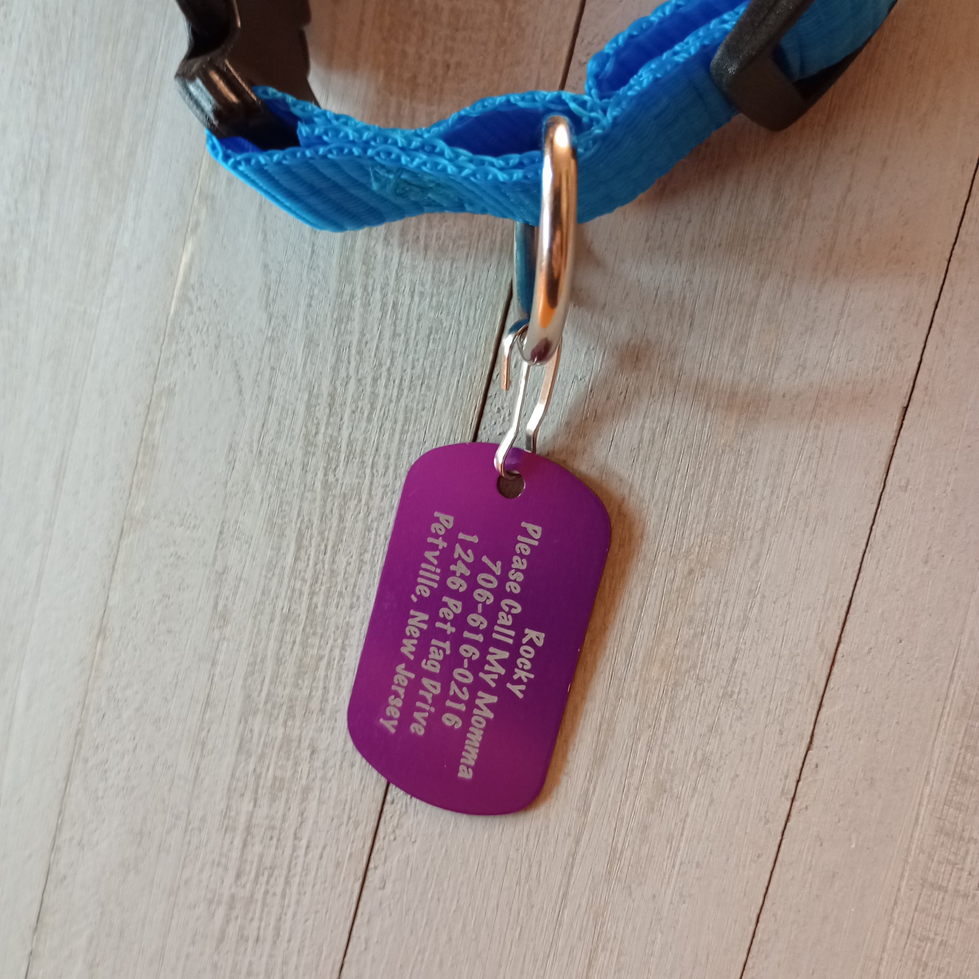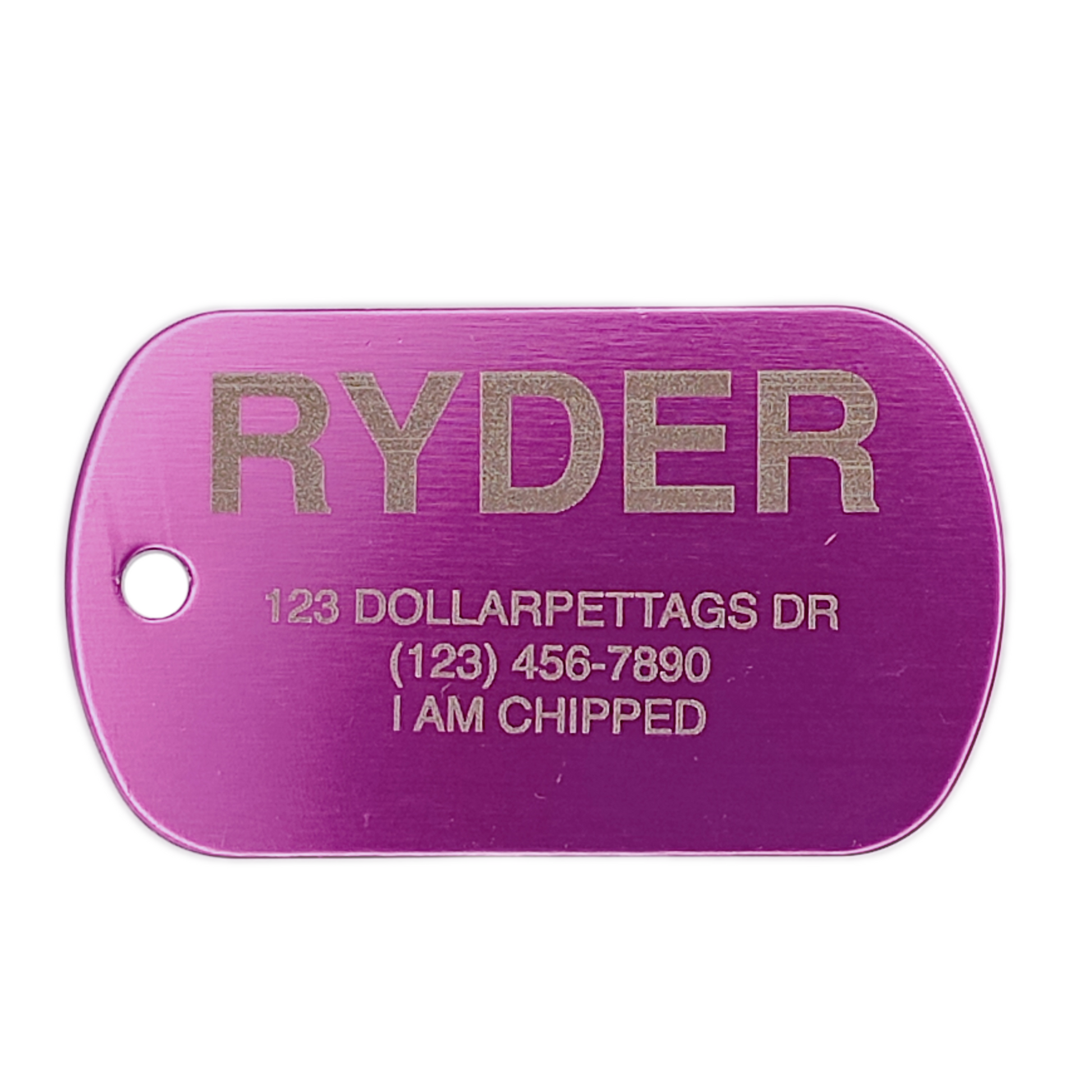 This Purple Military Style Pet Tag is anodized aluminum that allows for 5 lines of text to be engraved lengthwise on the front and 5 lines of text to be engraved lengthwise on the back.
