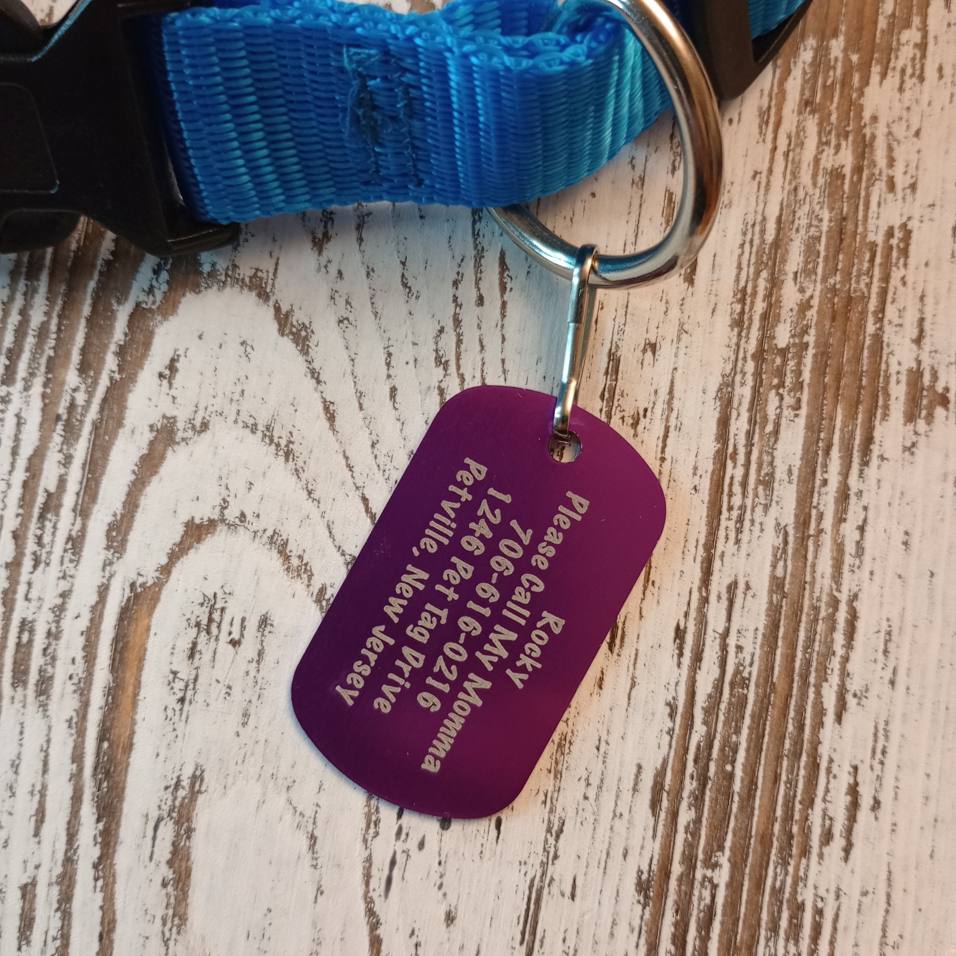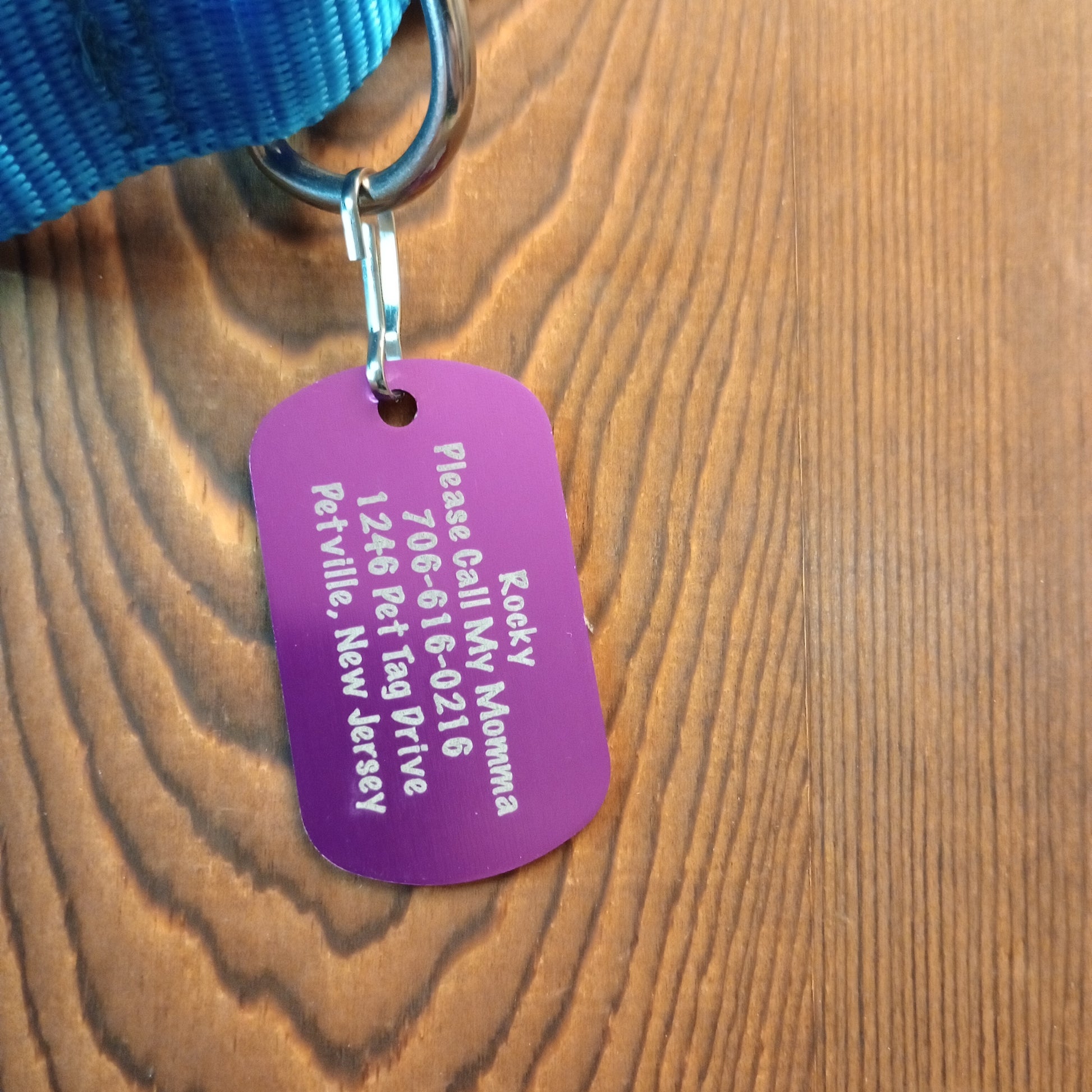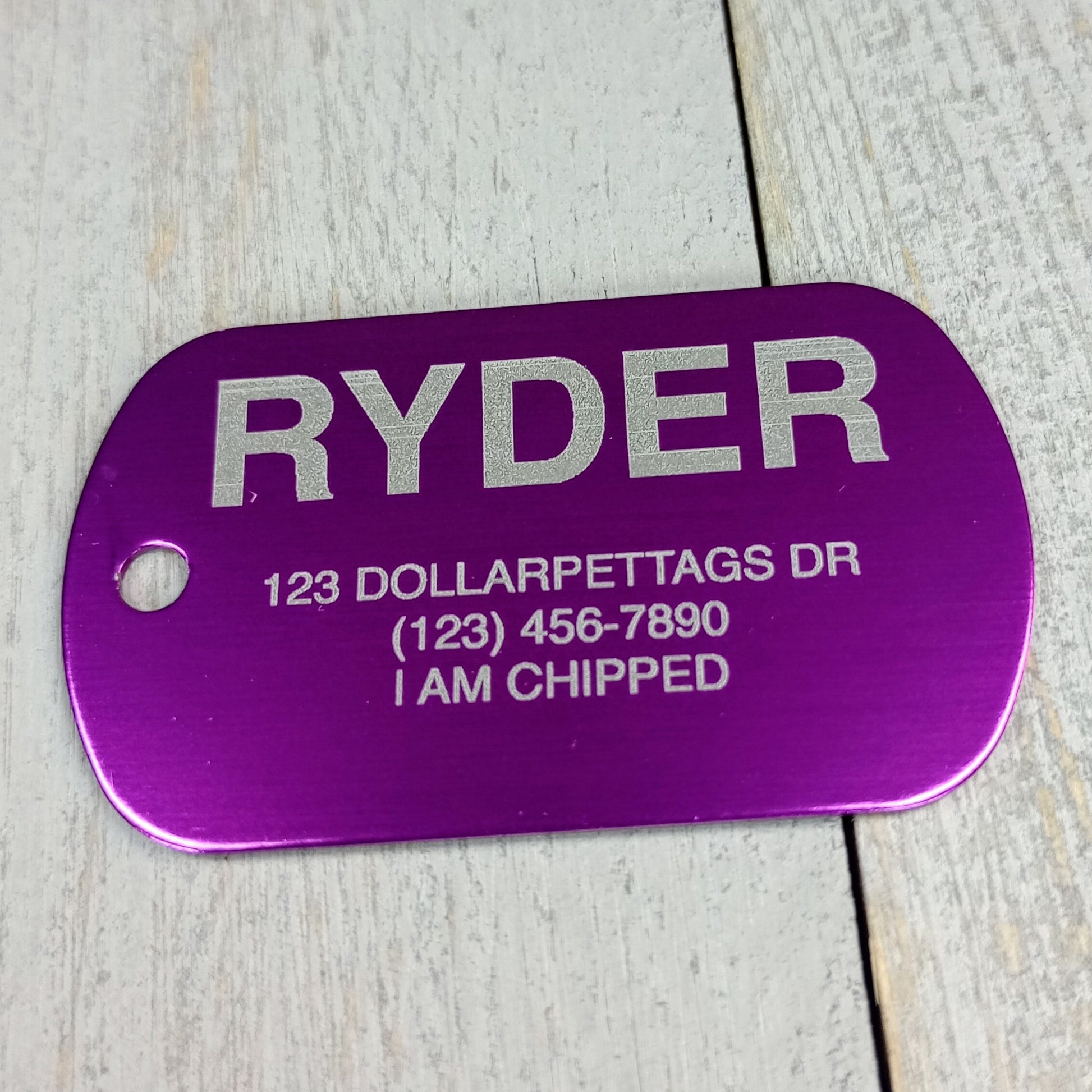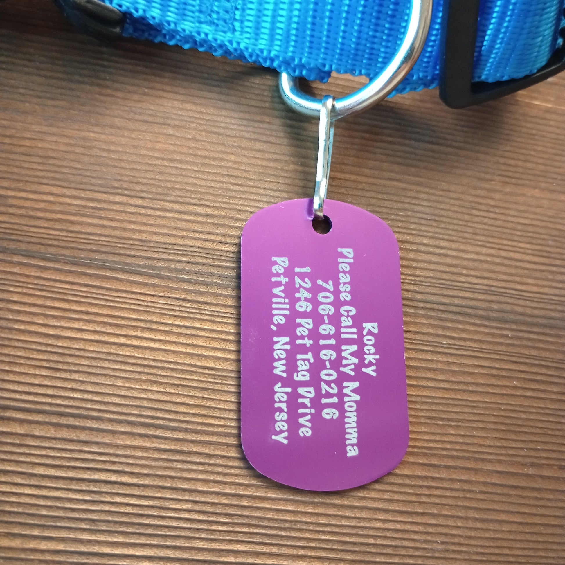 This Purple Military Style Pet Tag is anodized aluminum that allows for 5 lines of text to be engraved lengthwise on the front and 5 lines of text to be engraved lengthwise on the back.